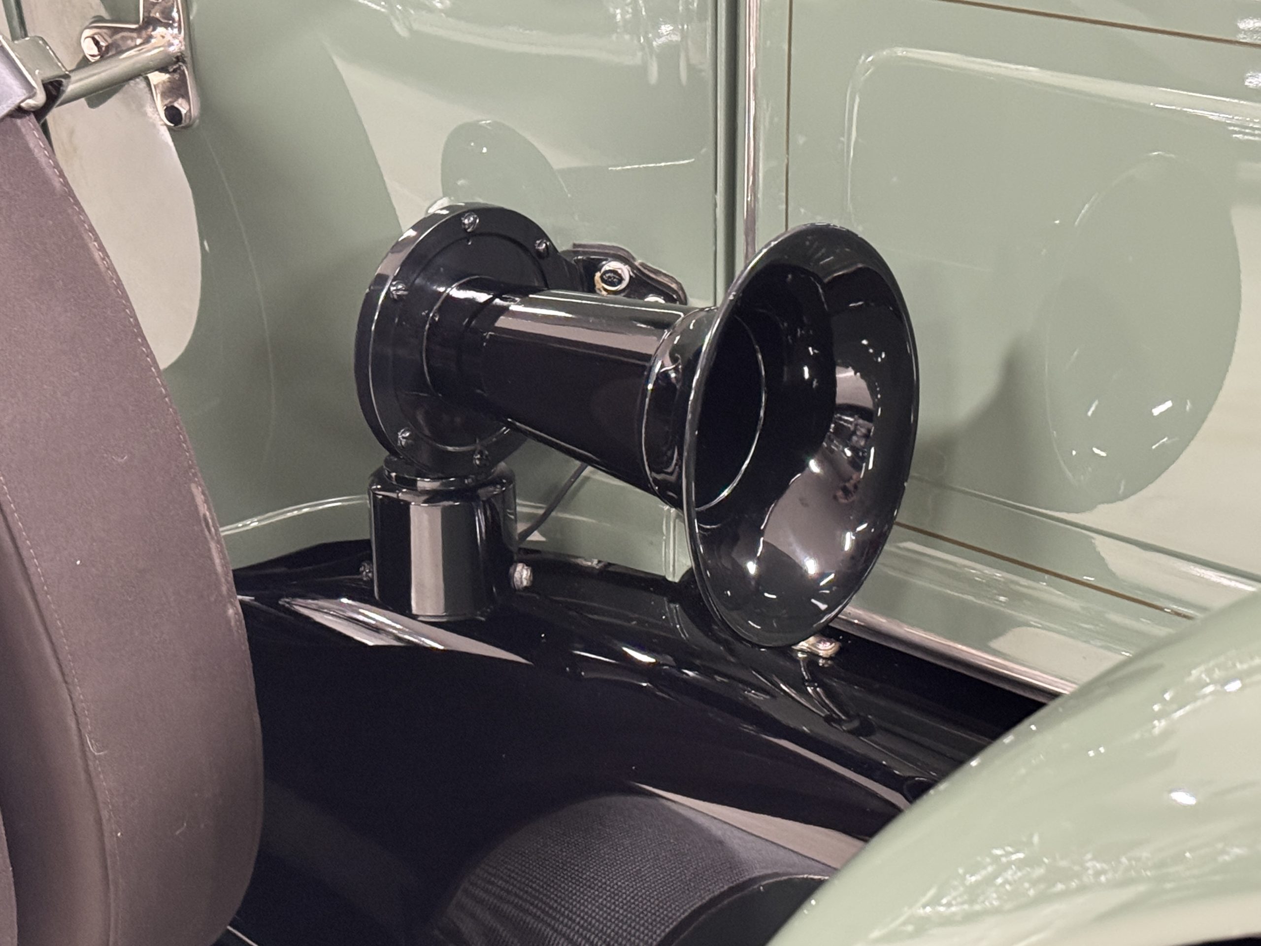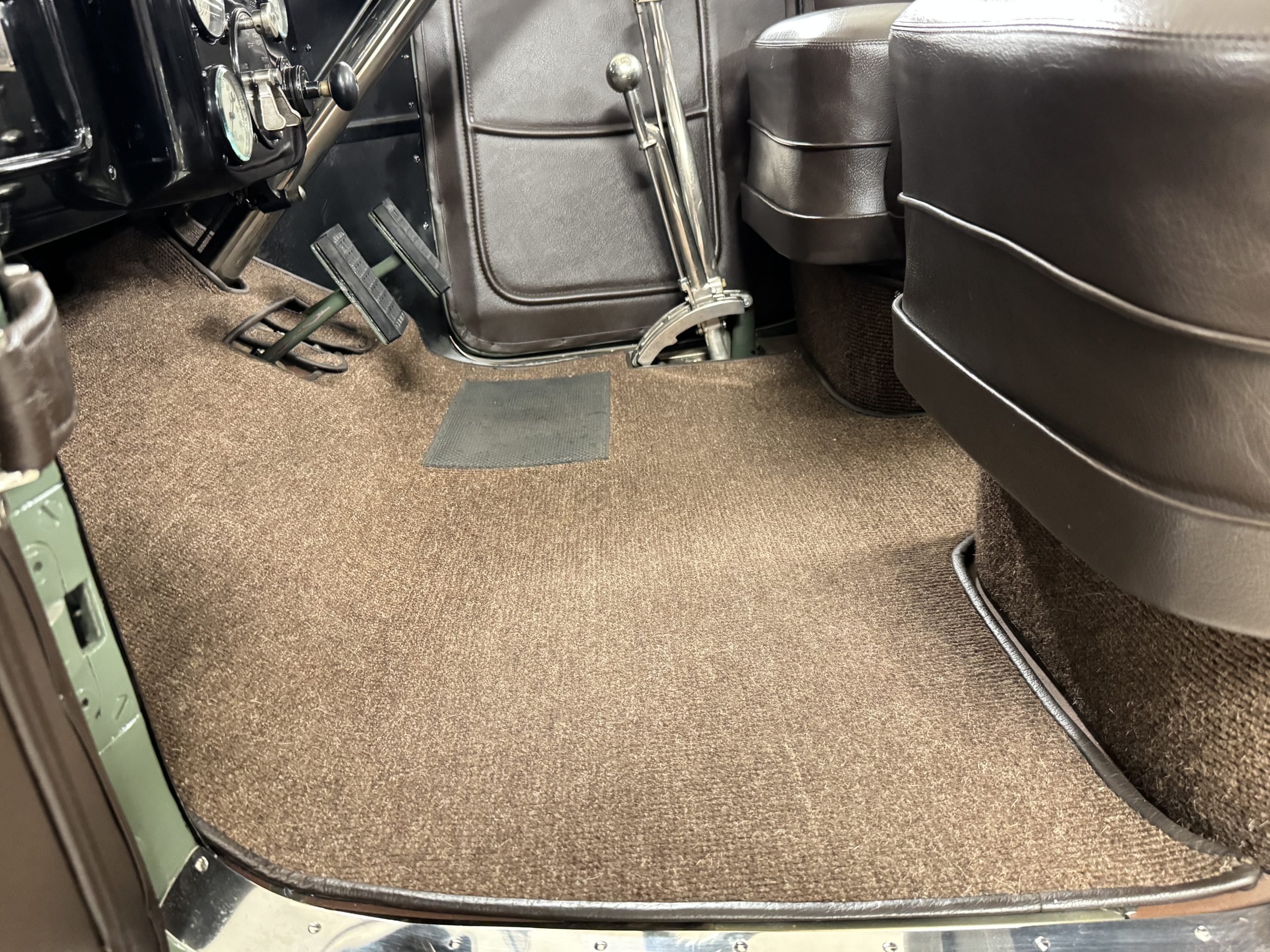 Inside, the Pierce displays superb craftsmanship with front bucket seats and a rear bench finished in brown leather of excellent quality. Matching leather trim extends to side pouches inside the rear doors. Instrumentation includes a Waltham clock and working gauges for mileage, oil, amps, and fuel, framed by a right-hand drive layout with a right-side floor-mounted gear shifter. The interior strikes a balance of authentic period presentation and passenger comfort, further enhanced by the inclusion of “California Side Curtains” for rear seat protection.