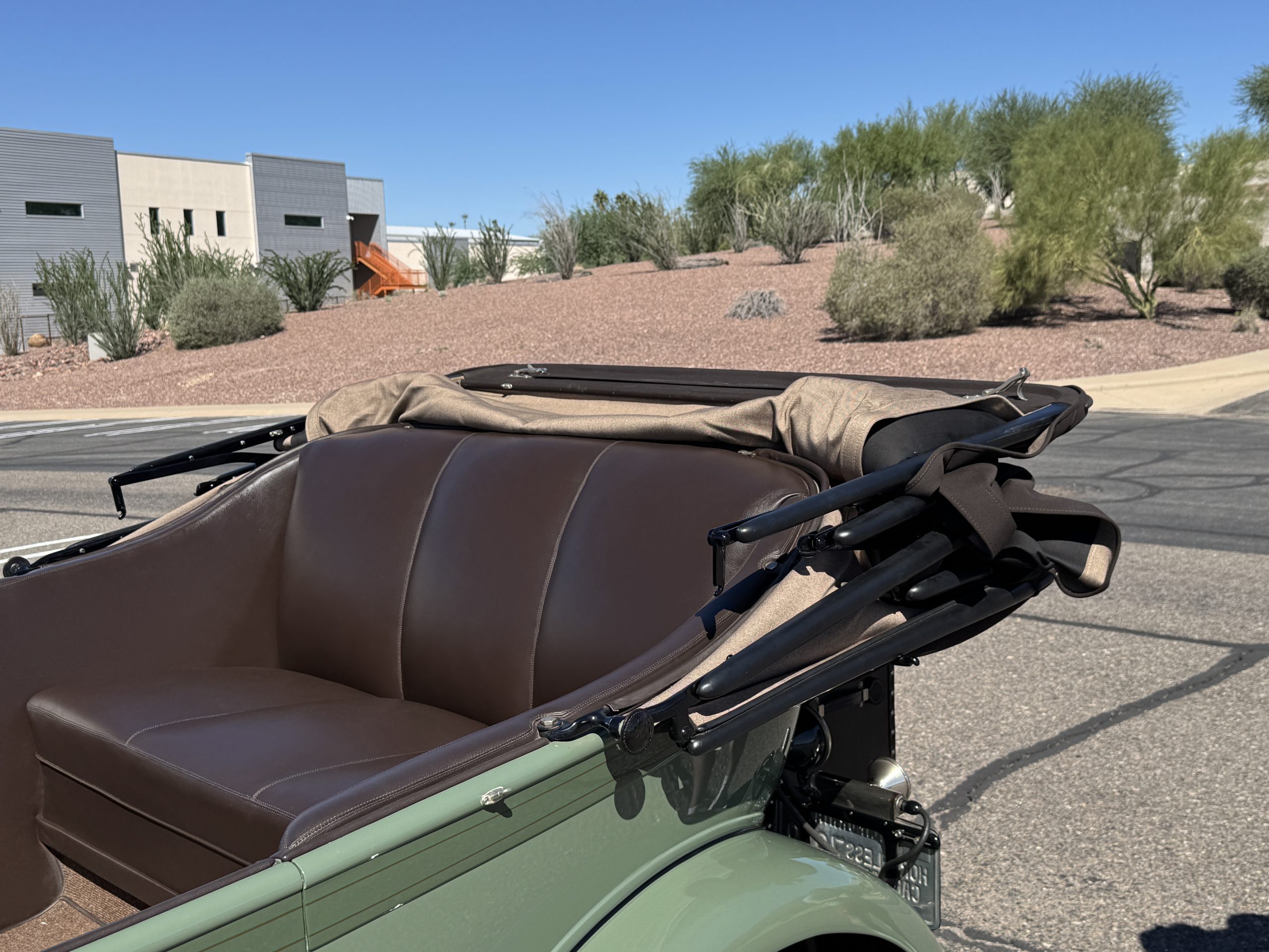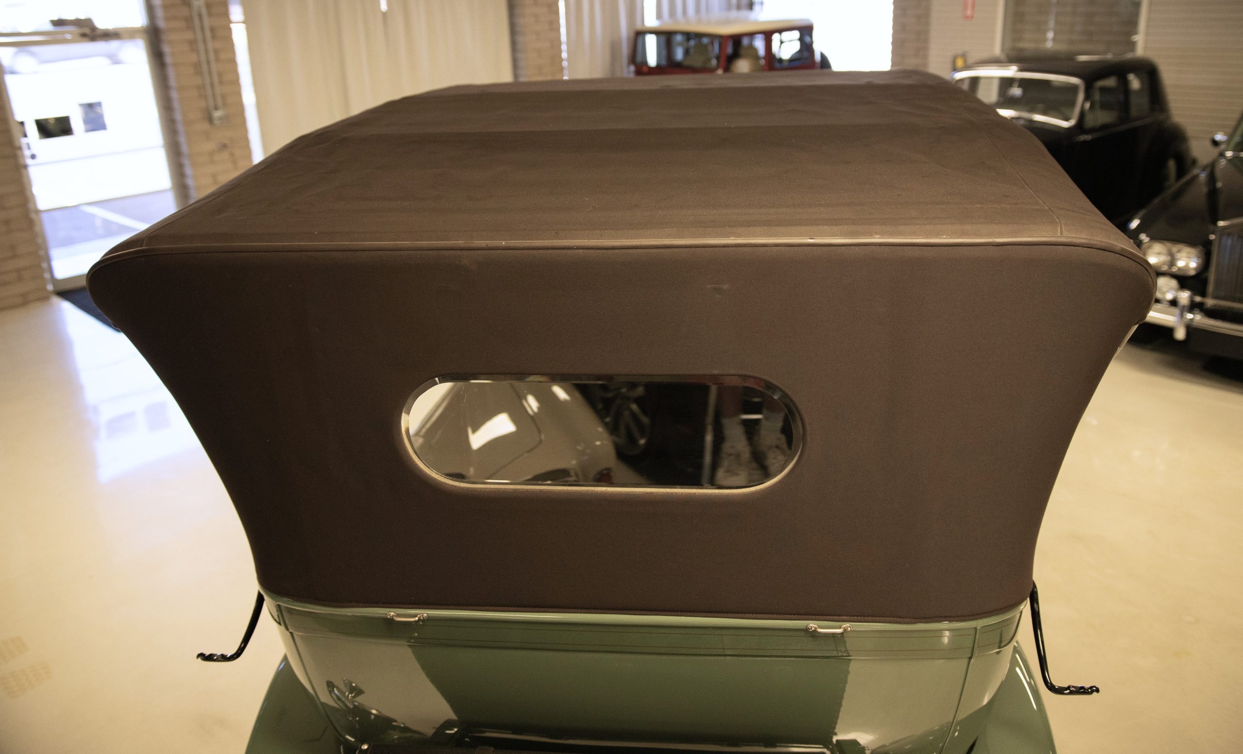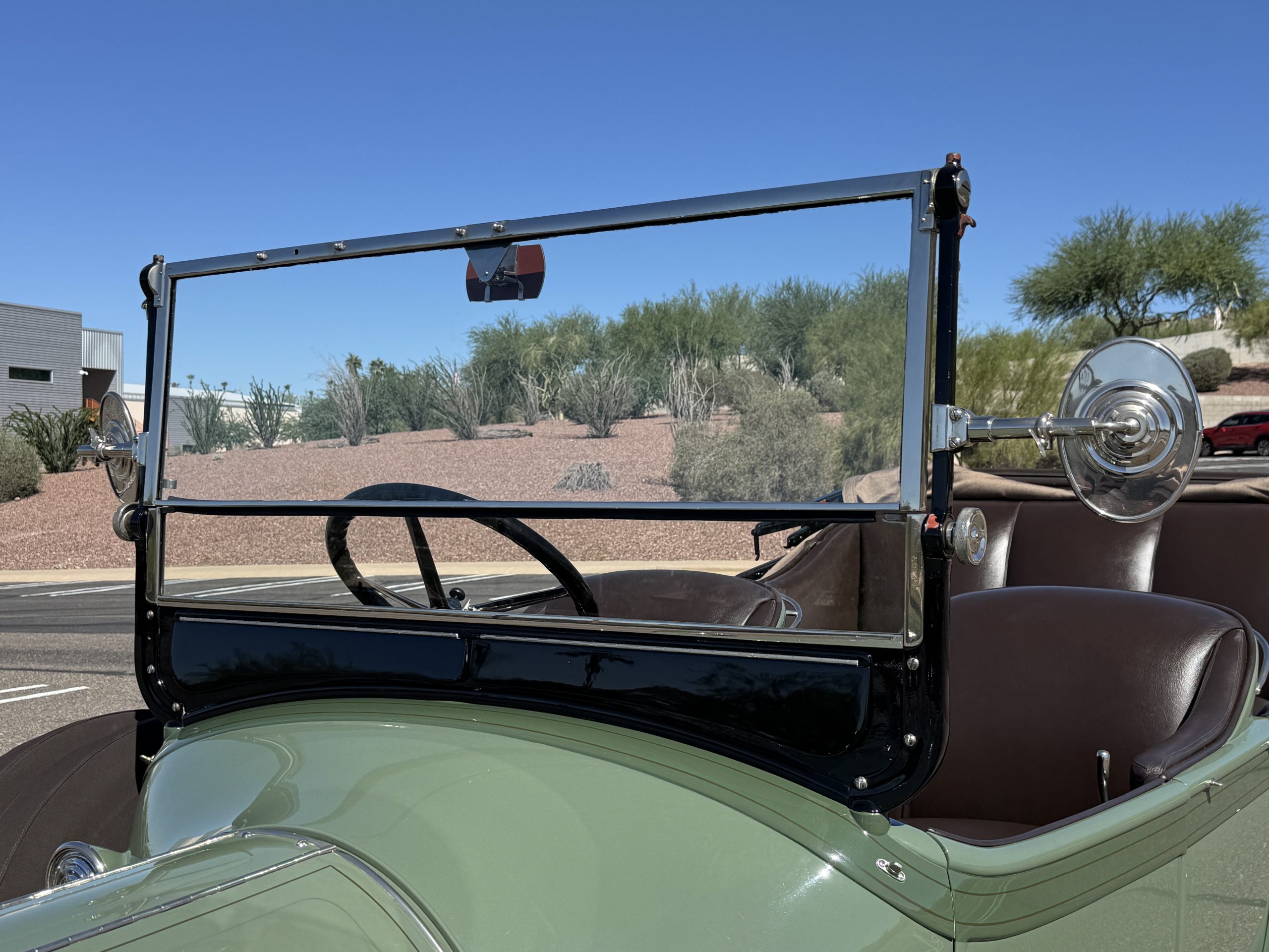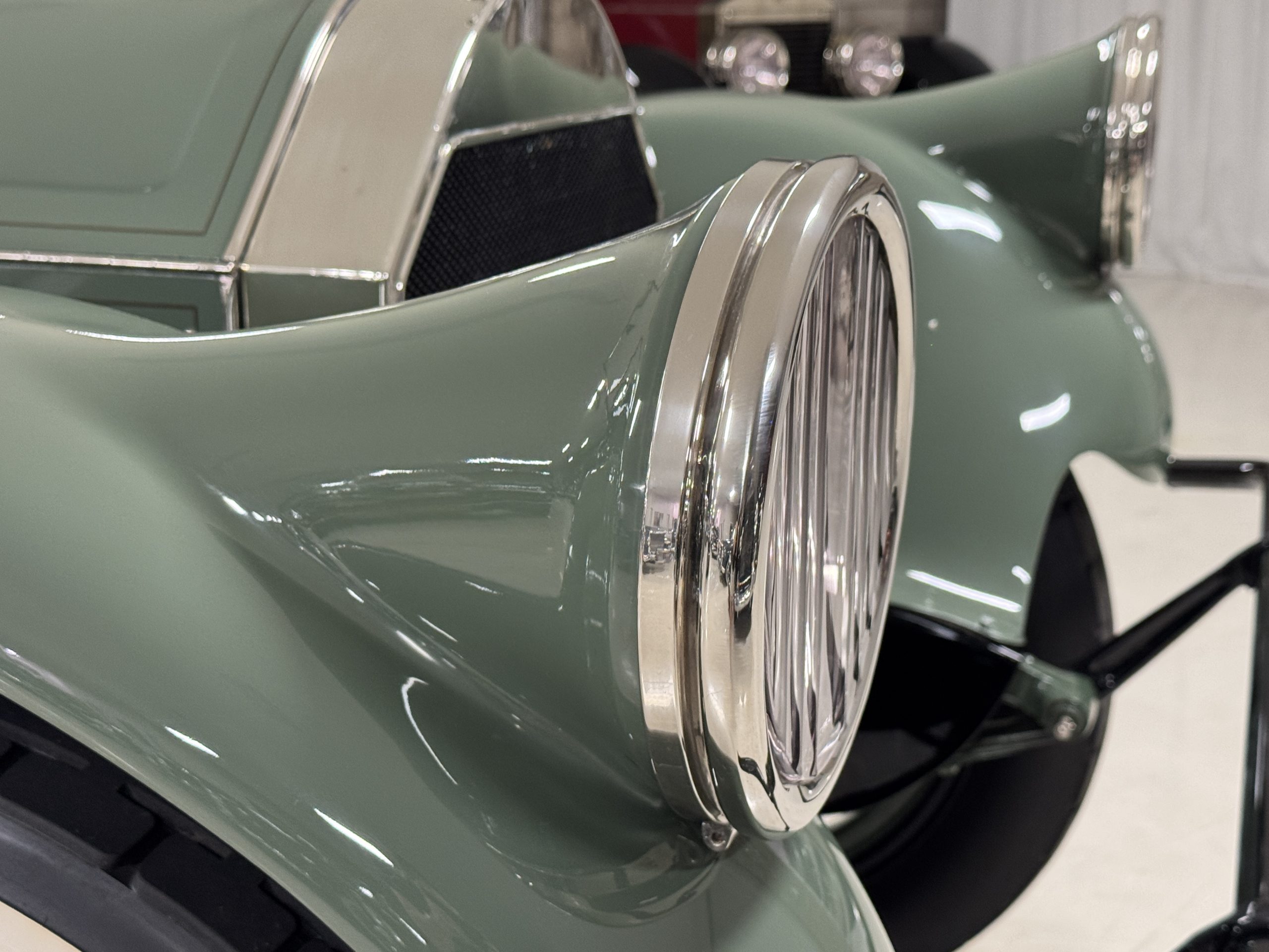 The exterior of the Pierce is striking in its original two-tone Pastel Green (PPG 42672) with brown pinstriping, presenting with a deep luster and excellent finish. The proprietary cast aluminum panel body, riveted for strength and lightness, remains dent-resistant and exceptionally well preserved. The dark brown folding convertible top is in excellent condition, accompanied by a complete set of custom-made brown fabric side curtains. Additional exterior features include patented fender-mounted headlights, ten-spoke open wheels with whitewall tires, and a leather-strap-secured rear trunk. Nickel brightwork has been fully re-plated and retains a mirror finish.
