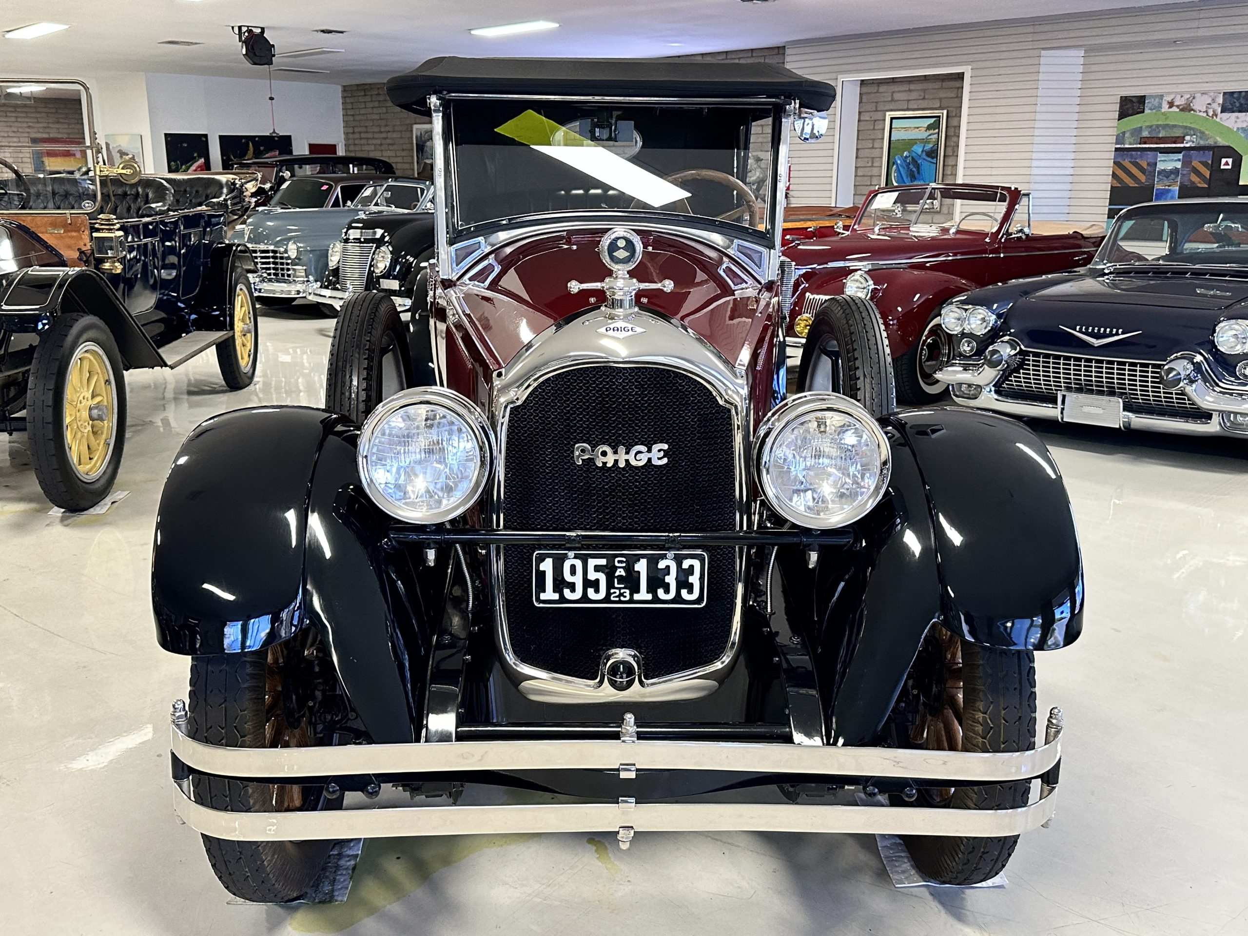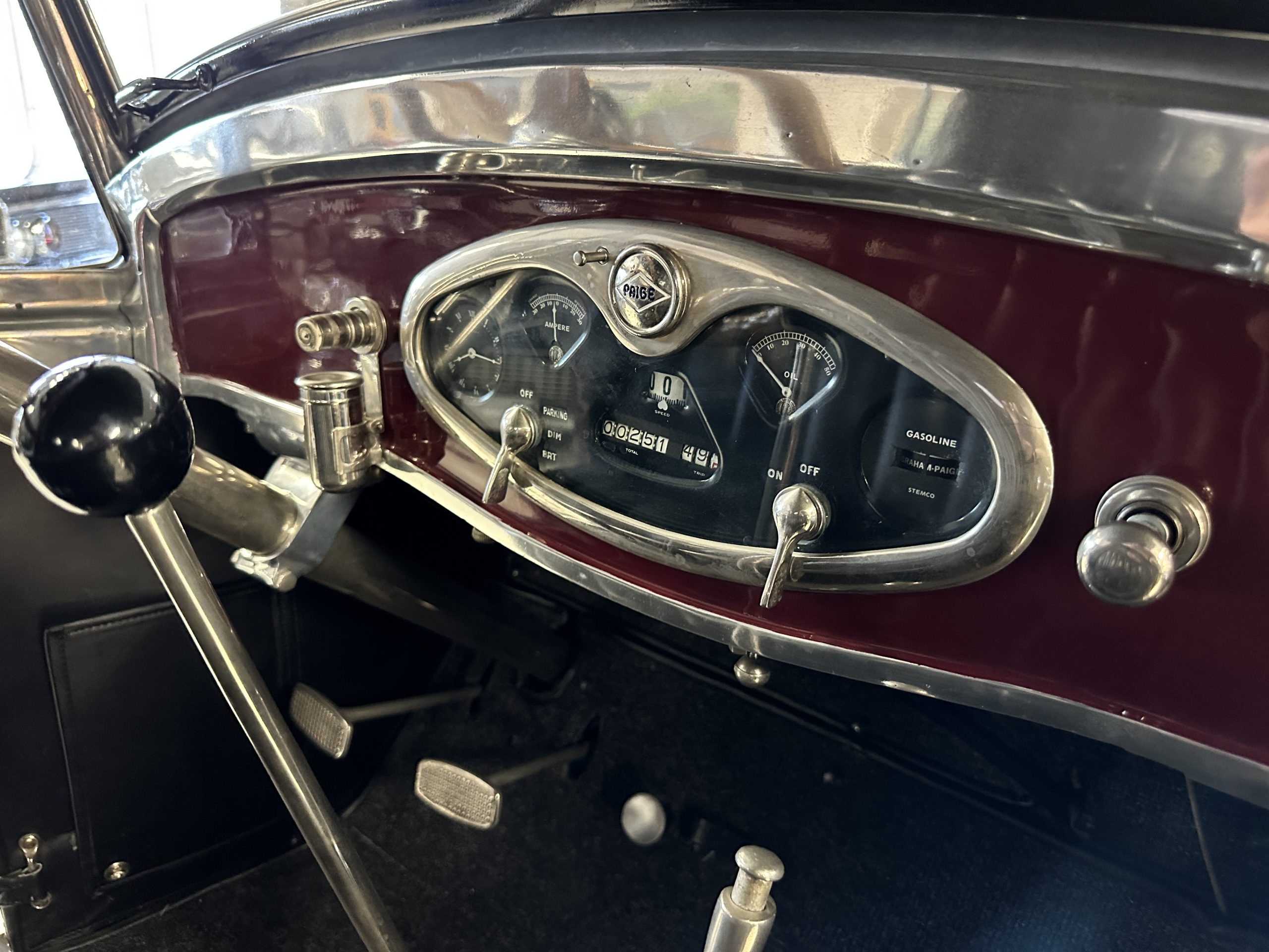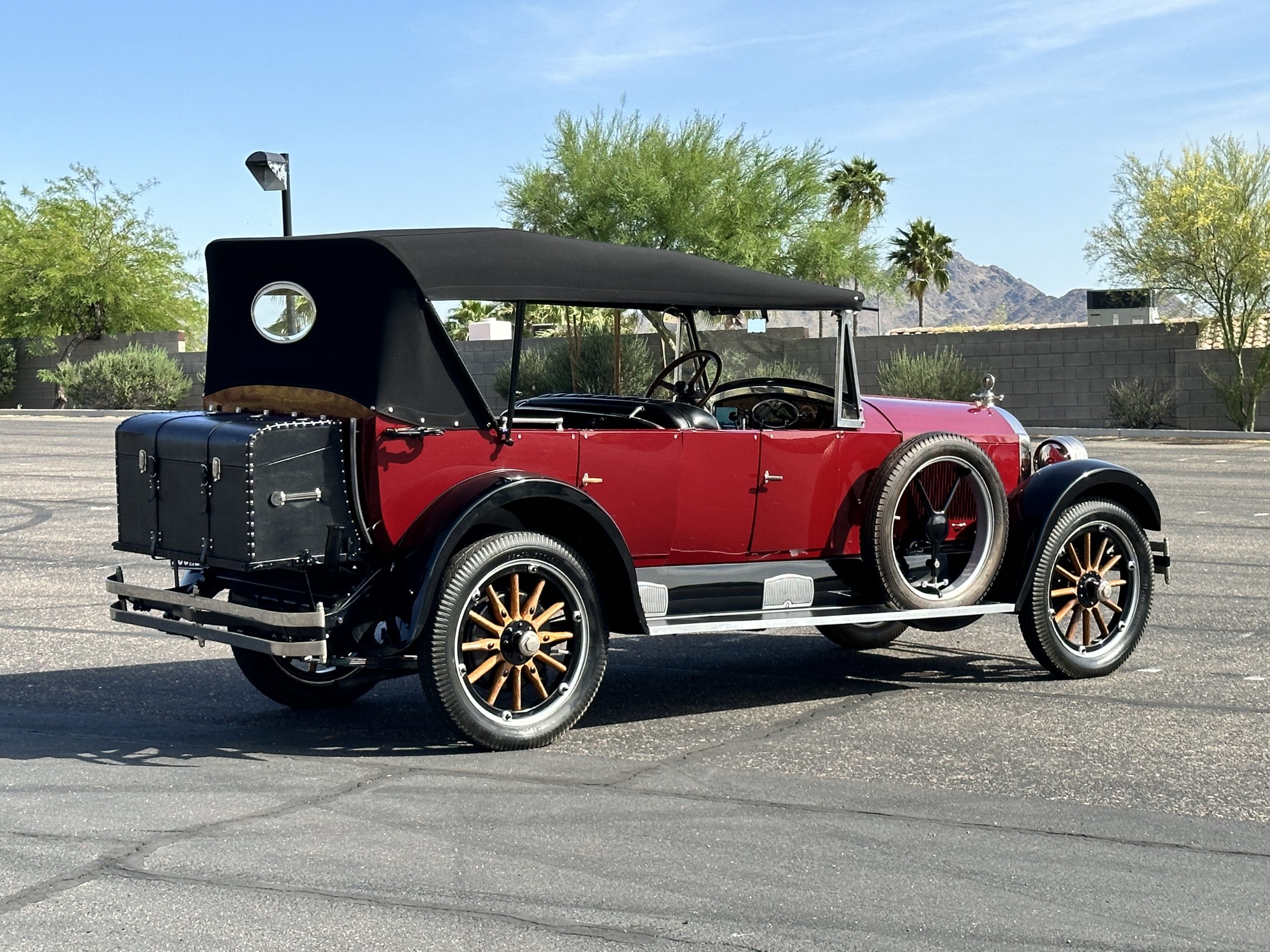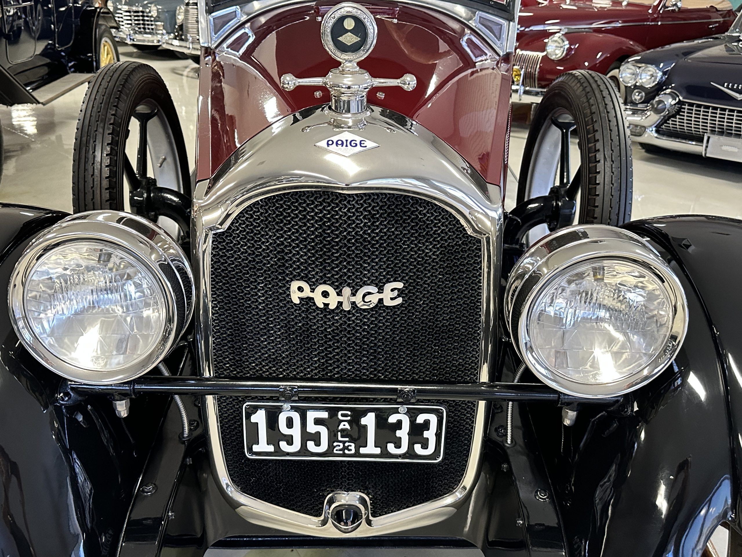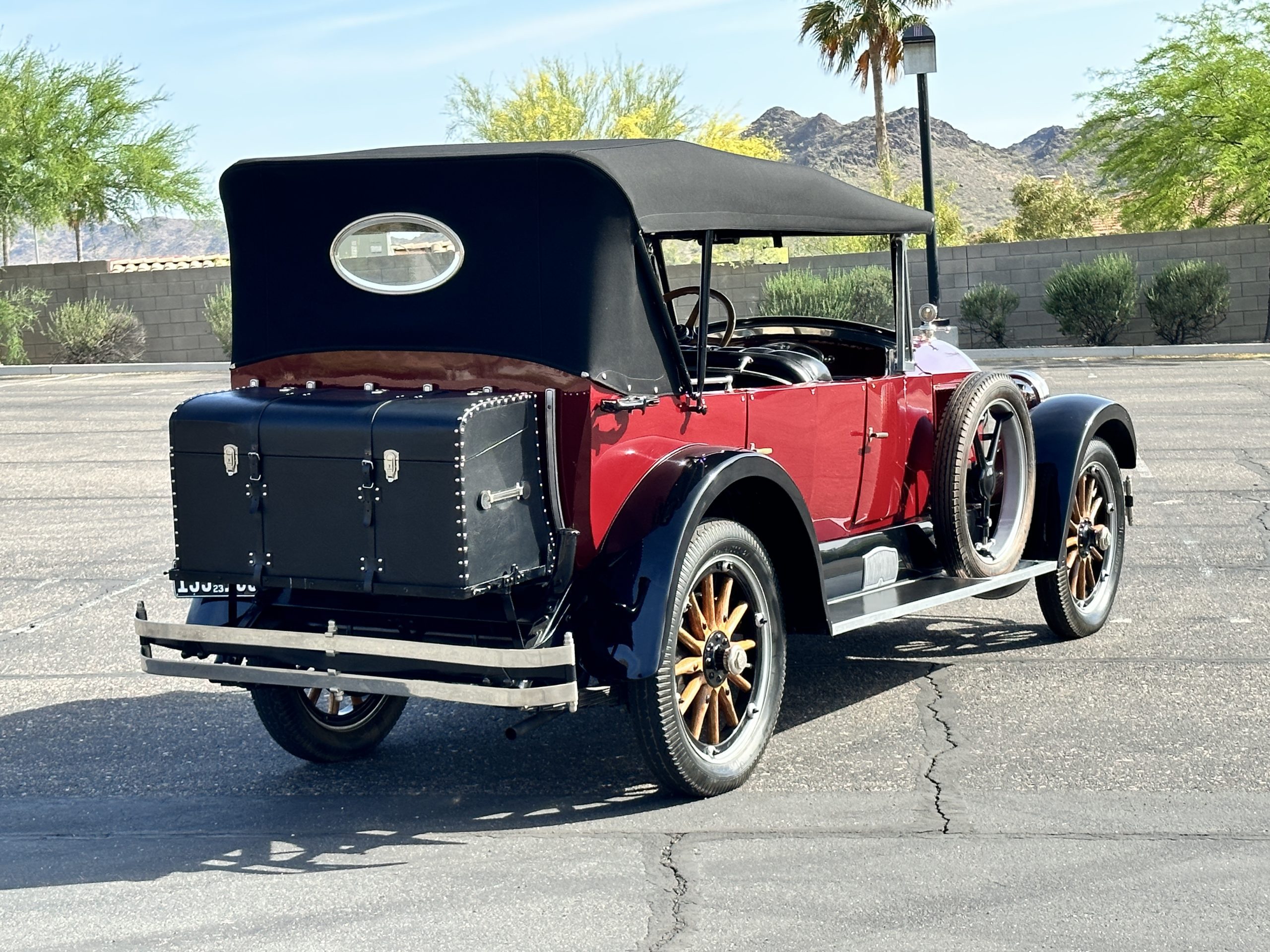 The livery is gorgeous in Burgundy and Black two tone with a black canvas convertible top. The paint is still in very nice show condition consistent with 250 miles added since being restored. The black canvas convertible top is as new and featured a beveled oval rear window. The 24-inch wooden artillery wheels look new. The gorgeous, sculptured chrome grill with its locking Motometer and headlights are in show condition as well. The Paige featured many accessories, such as the double shock absorbing bumpers, cast aluminum windshield frames, dual side mounted spares and a beautifully designed cut curved area for the rear trunk. This Paige has a fully restored trunk that is a showstopper. The tinted external sun visor is a very practical feature that we benefitted from here in the Arizona sun. Overall, this Paige is still quite a show car and is well detailed throughout.