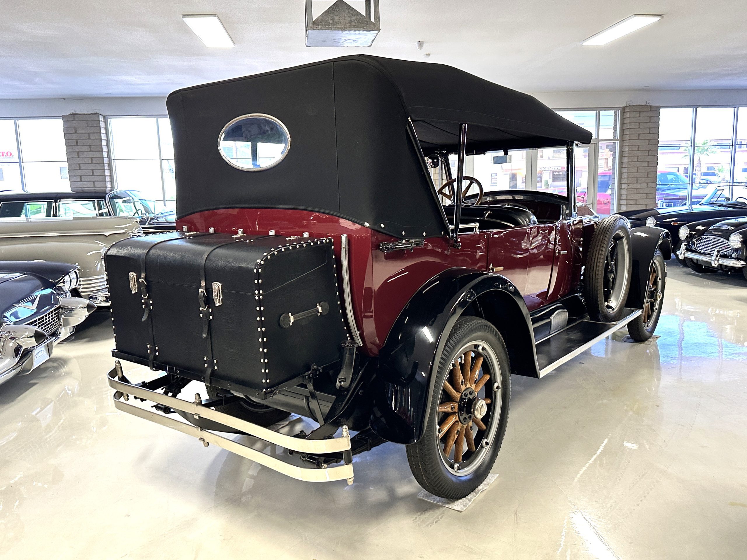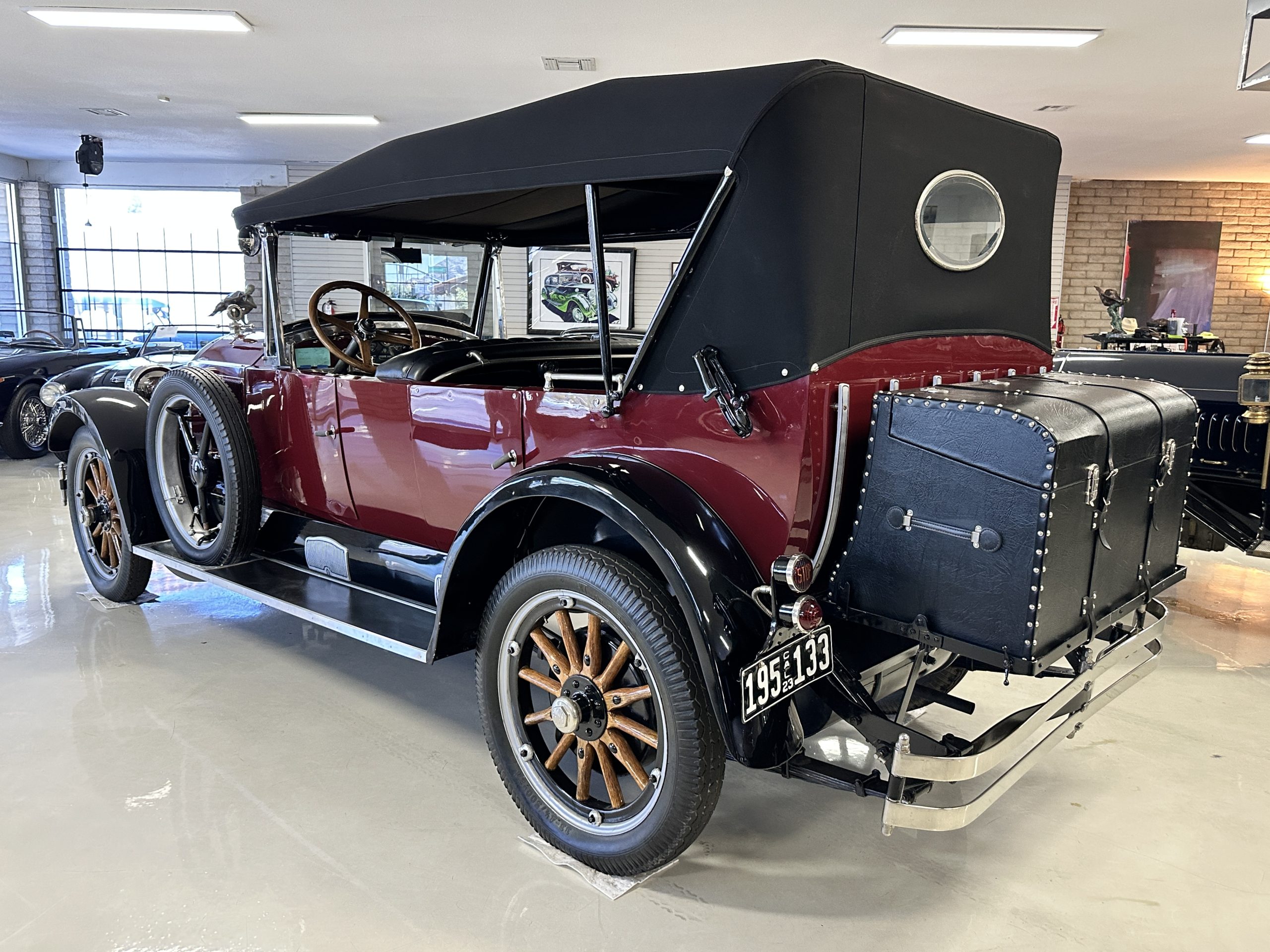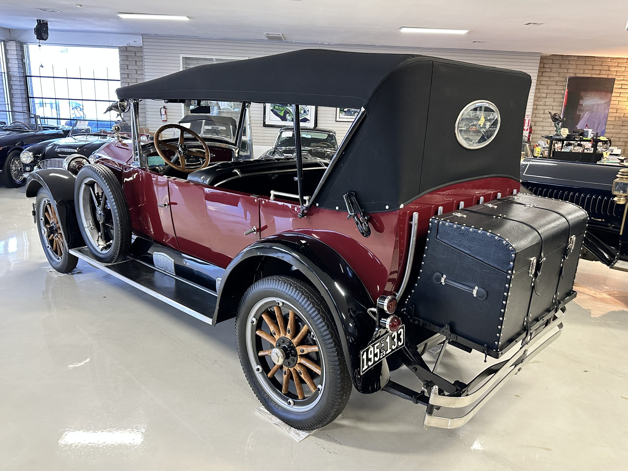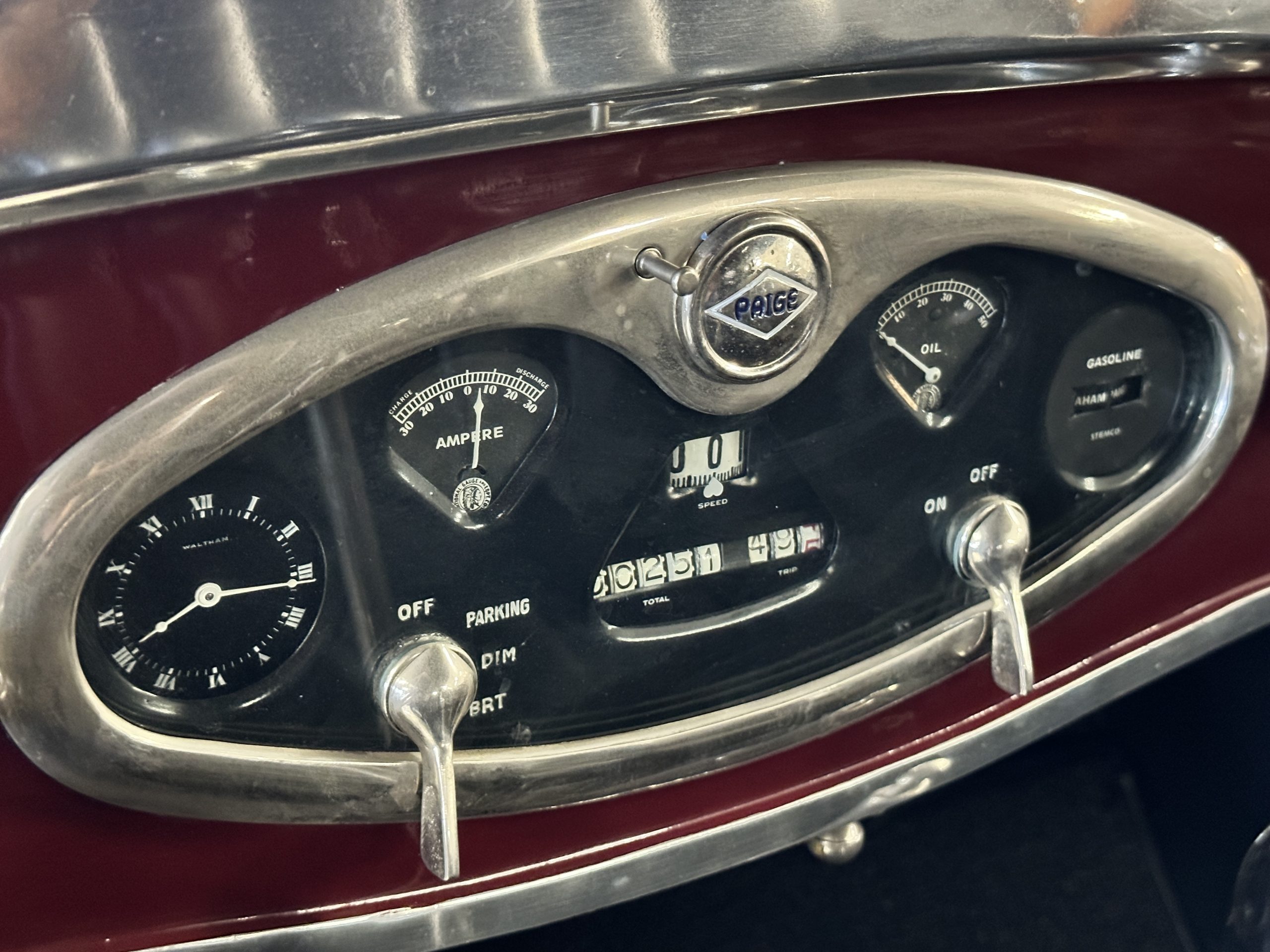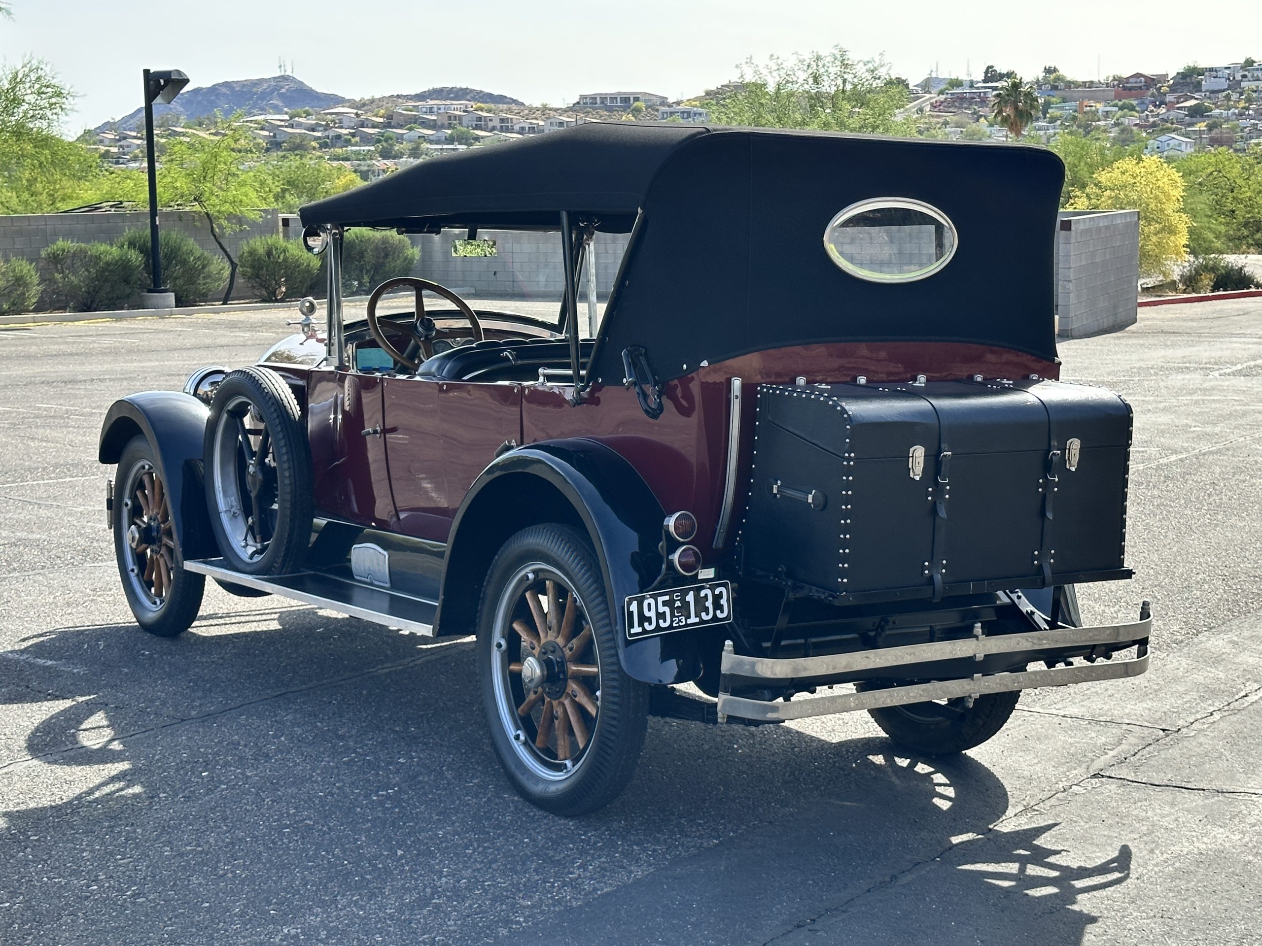 The livery is gorgeous in Burgundy and Black two tone with a black canvas convertible top. The paint is still in very nice show condition consistent with 250 miles added since being restored. The black canvas convertible top is as new and featured a beveled oval rear window. The 24-inch wooden artillery wheels look new. The gorgeous, sculptured chrome grill with its locking Motometer and headlights are in show condition as well. The Paige featured many accessories, such as the double shock absorbing bumpers, cast aluminum windshield frames, dual side mounted spares and a beautifully designed cut curved area for the rear trunk. This Paige has a fully restored trunk that is a showstopper. The tinted external sun visor is a very practical feature that we benefitted from here in the Arizona sun. Overall, this Paige is still quite a show car and is well detailed throughout.