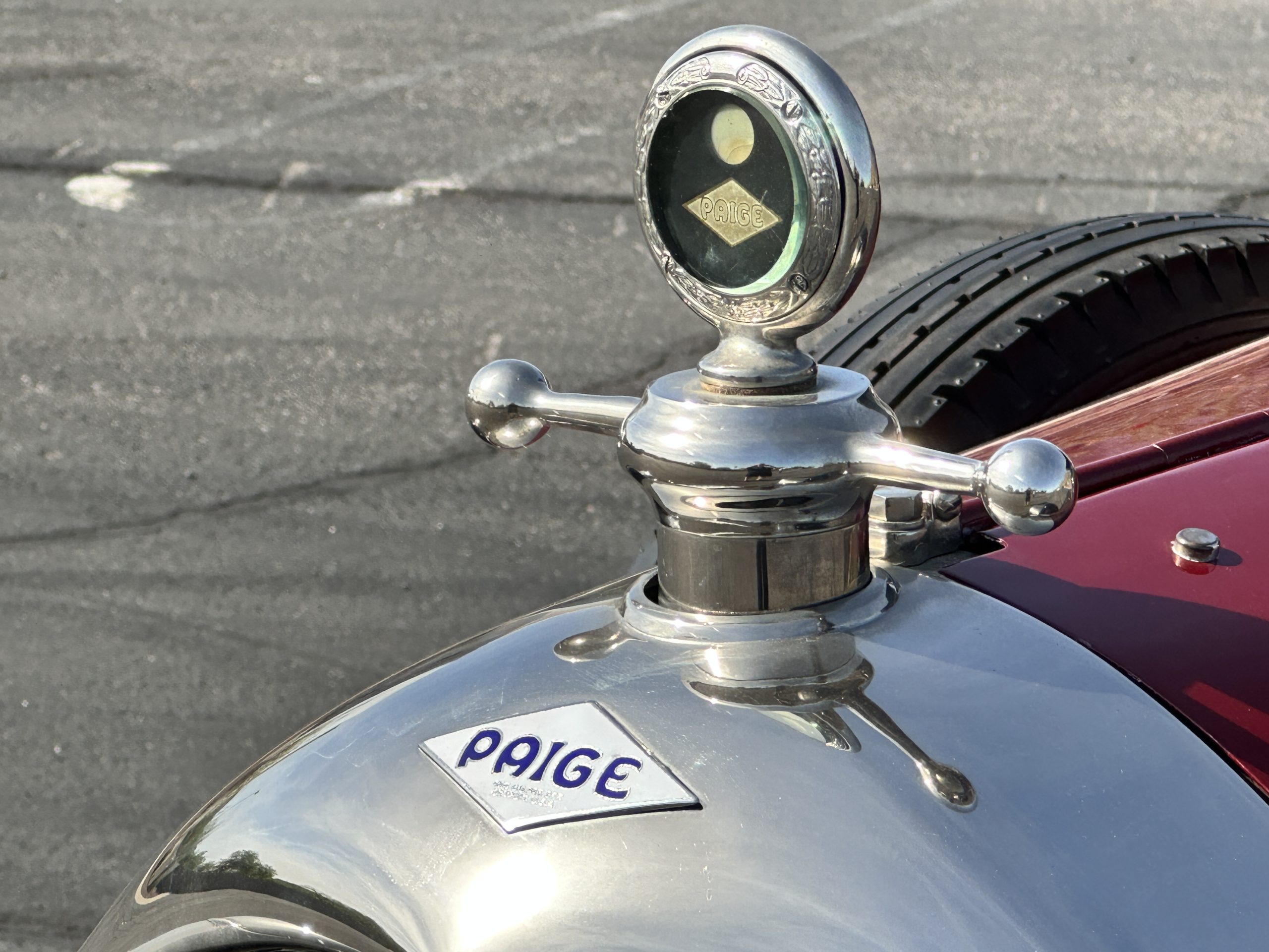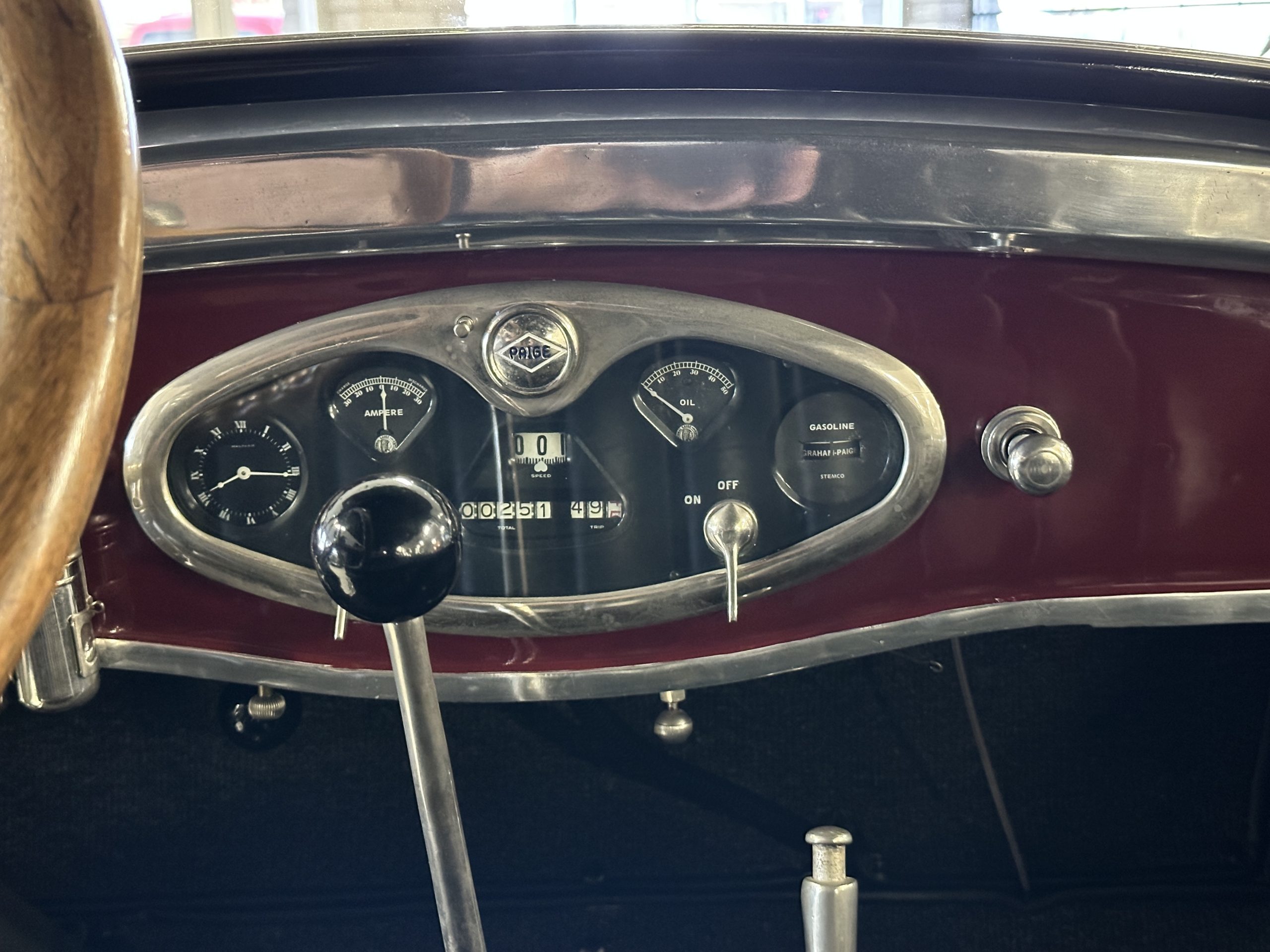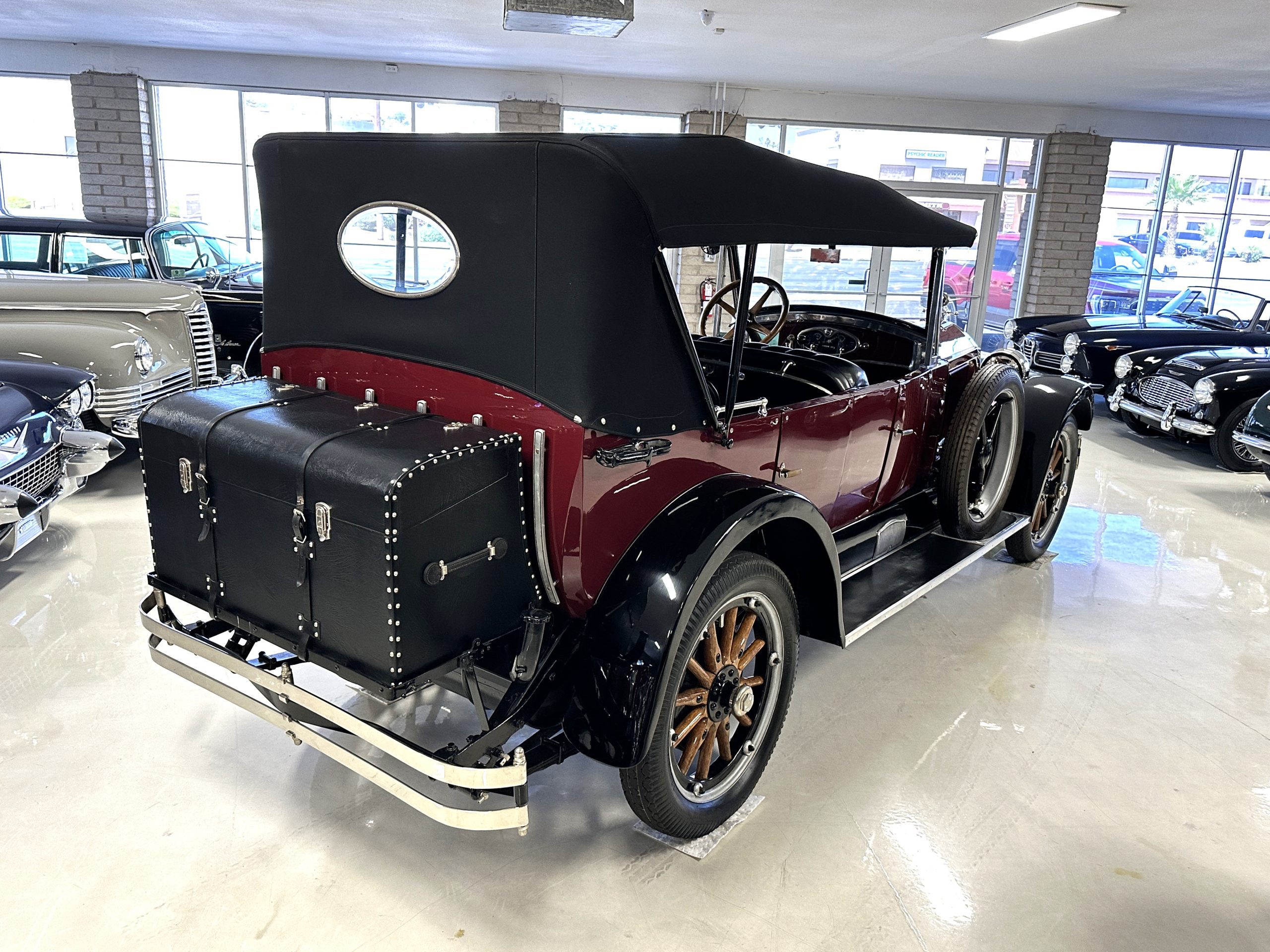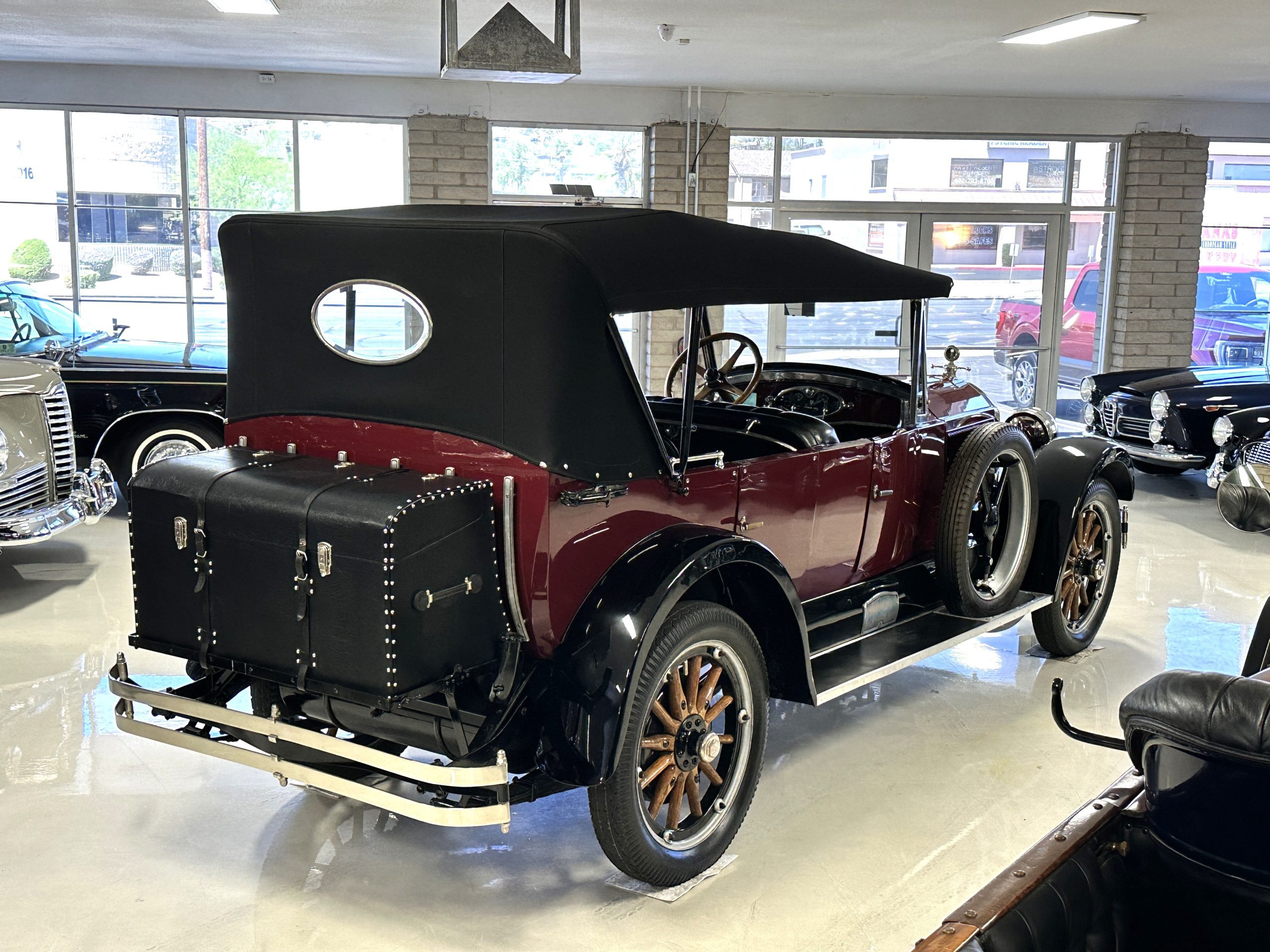The livery is gorgeous in Burgundy and Black two tone with a black canvas convertible top. The paint is still in very nice show condition consistent with 250 miles added since being restored. The black canvas convertible top is as new and featured a beveled oval rear window. The 24-inch wooden artillery wheels look new. The gorgeous, sculptured chrome grill with its locking Motometer and headlights are in show condition as well. The Paige featured many accessories, such as the double shock absorbing bumpers, cast aluminum windshield frames, dual side mounted spares and a beautifully designed cut curved area for the rear trunk. This Paige has a fully restored trunk that is a showstopper. The tinted external sun visor is a very practical feature that we benefitted from here in the Arizona sun. Overall, this Paige is still quite a show car and is well detailed throughout.