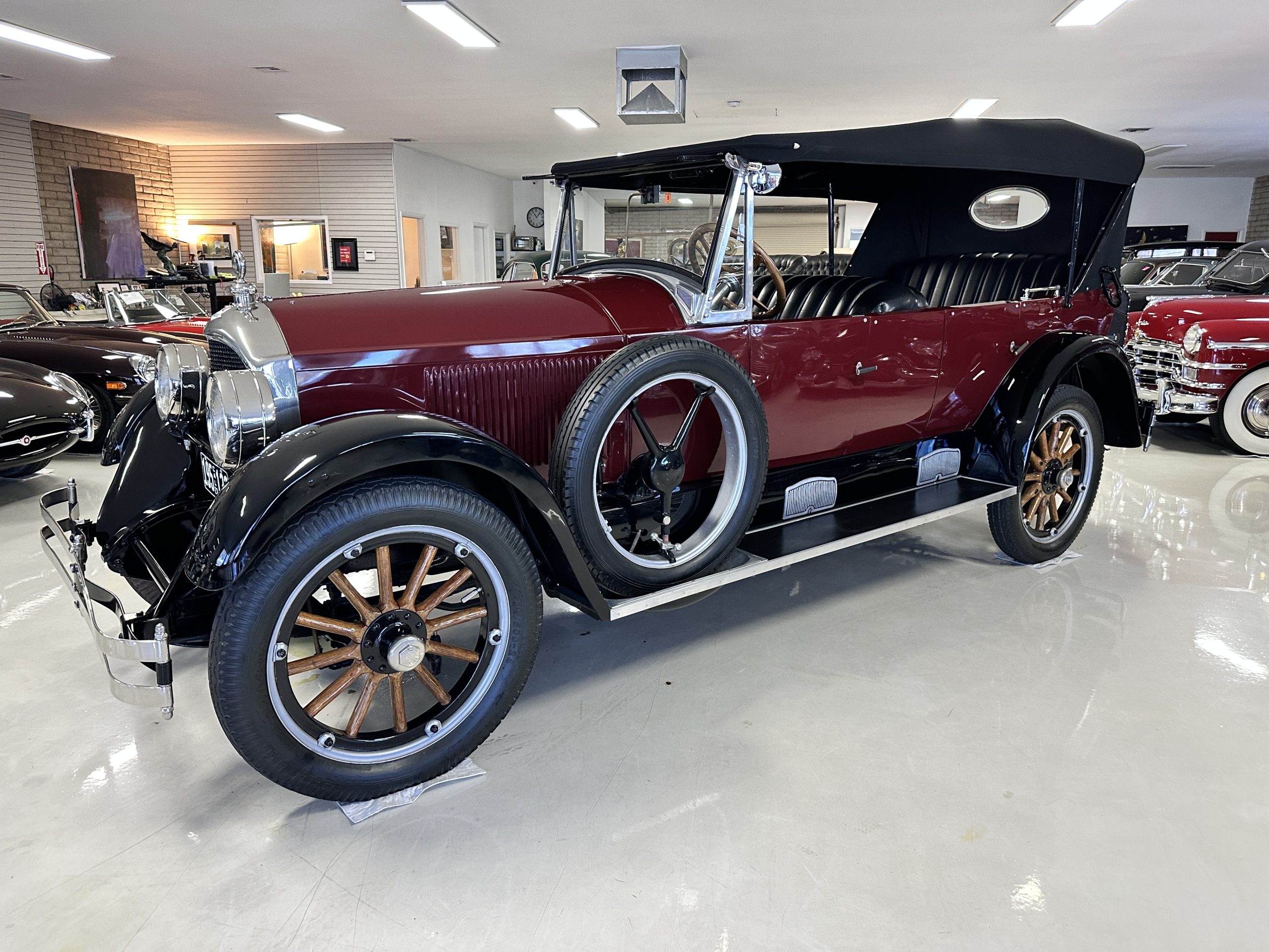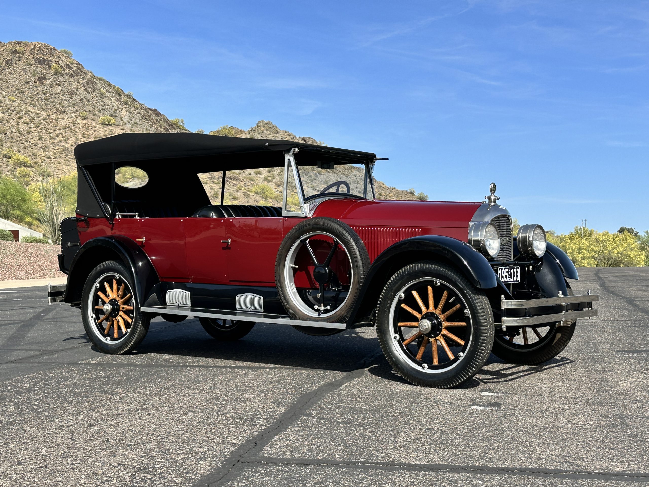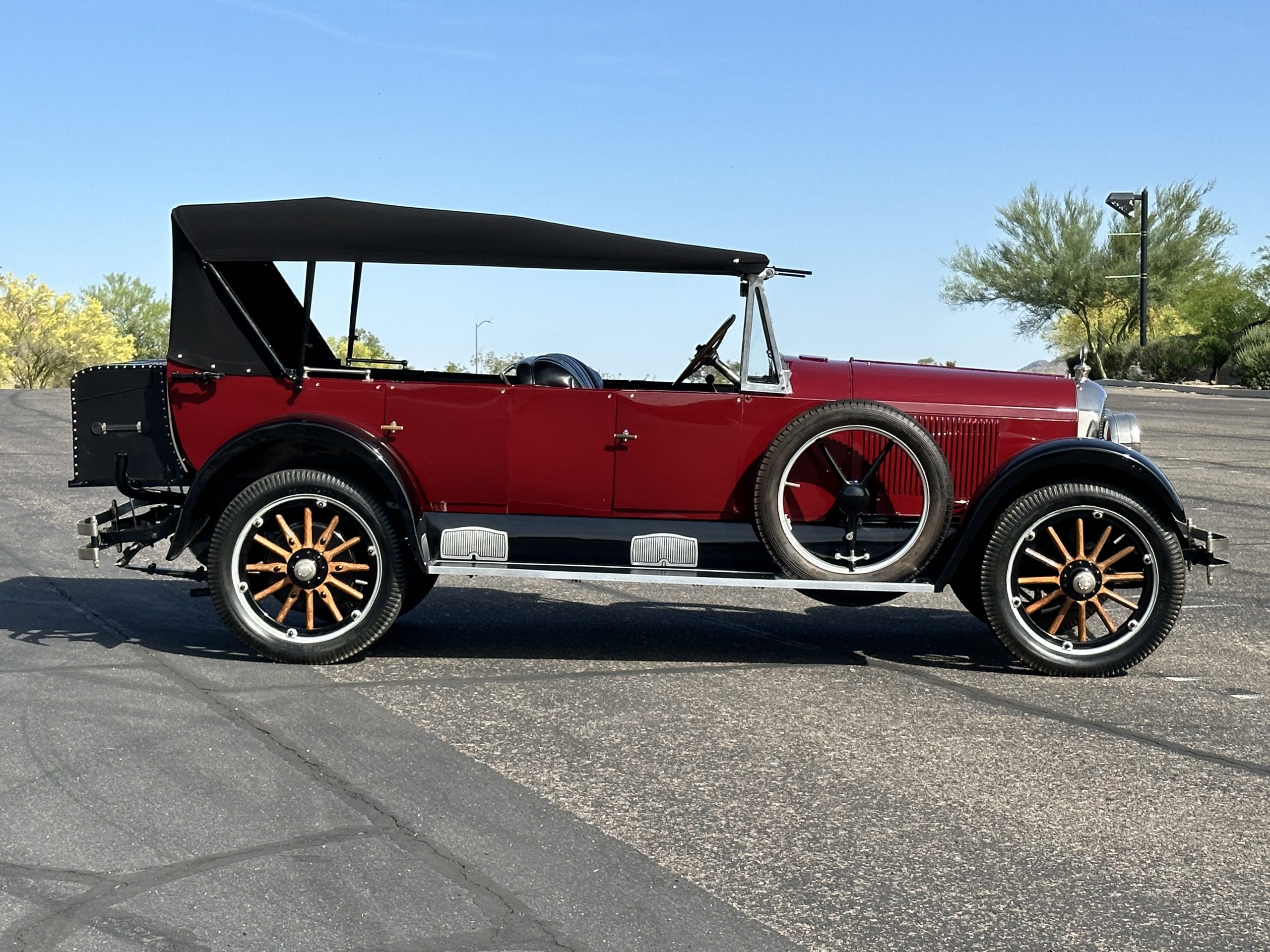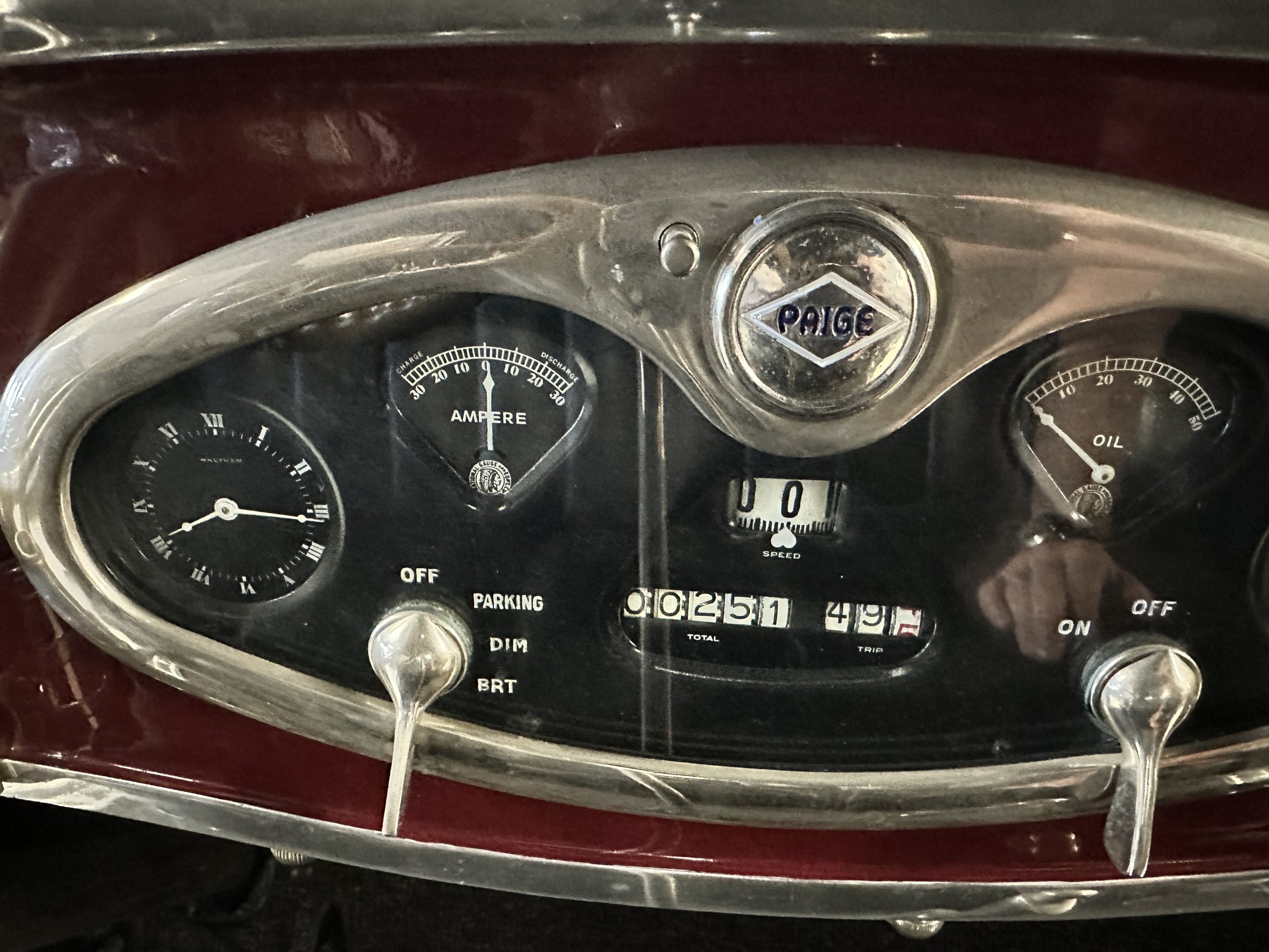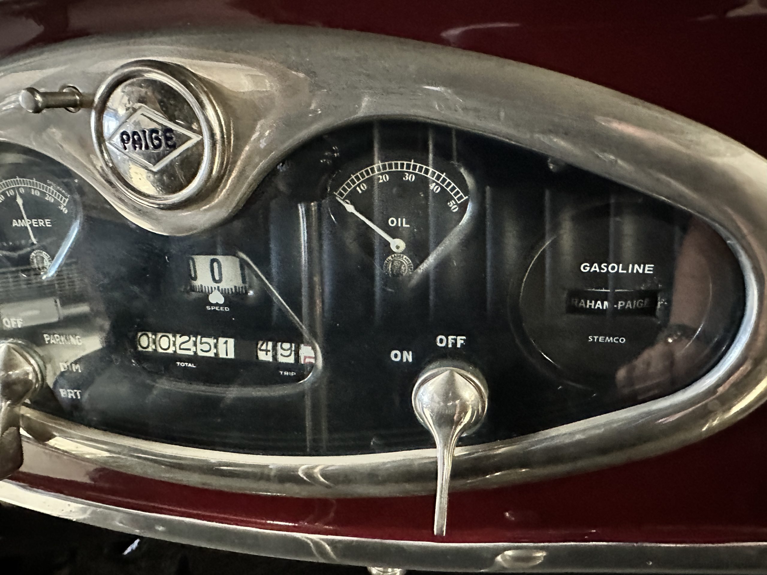 The livery is gorgeous in Burgundy and Black two tone with a black canvas convertible top. The paint is still in very nice show condition consistent with 250 miles added since being restored. The black canvas convertible top is as new and featured a beveled oval rear window. The 24-inch wooden artillery wheels look new. The gorgeous, sculptured chrome grill with its locking Motometer and headlights are in show condition as well. The Paige featured many accessories, such as the double shock absorbing bumpers, cast aluminum windshield frames, dual side mounted spares and a beautifully designed cut curved area for the rear trunk. This Paige has a fully restored trunk that is a showstopper. The tinted external sun visor is a very practical feature that we benefitted from here in the Arizona sun. Overall, this Paige is still quite a show car and is well detailed throughout.