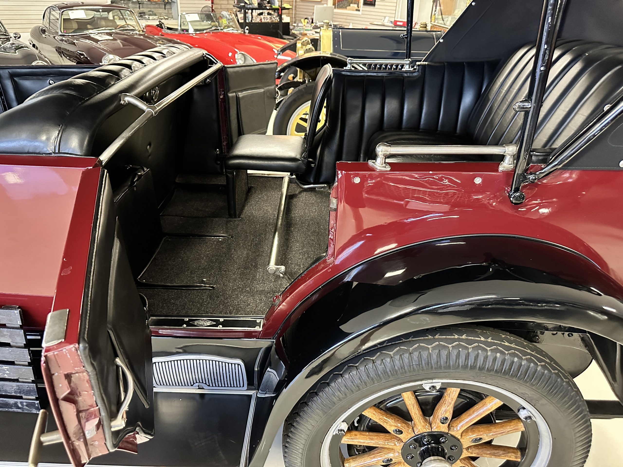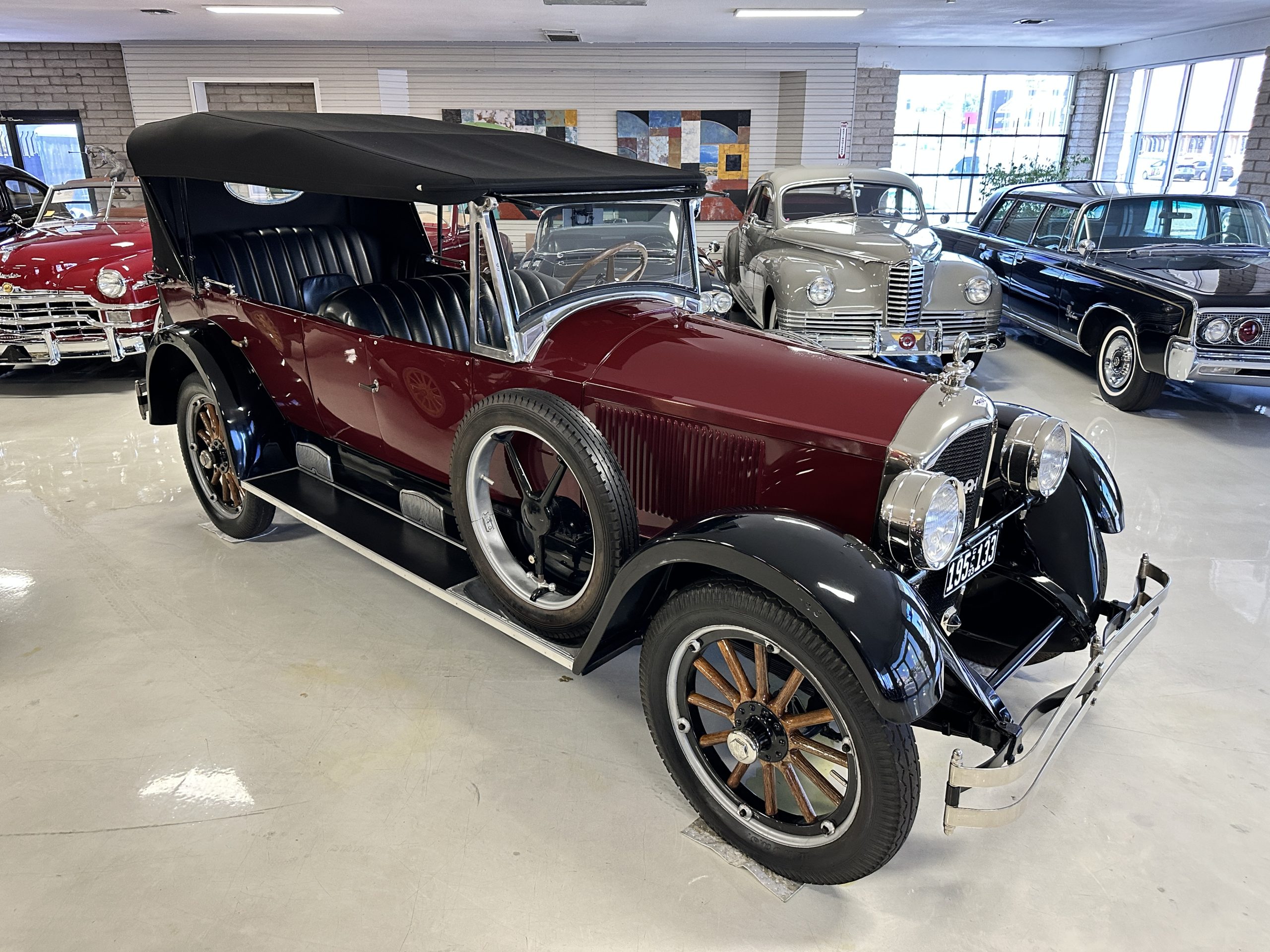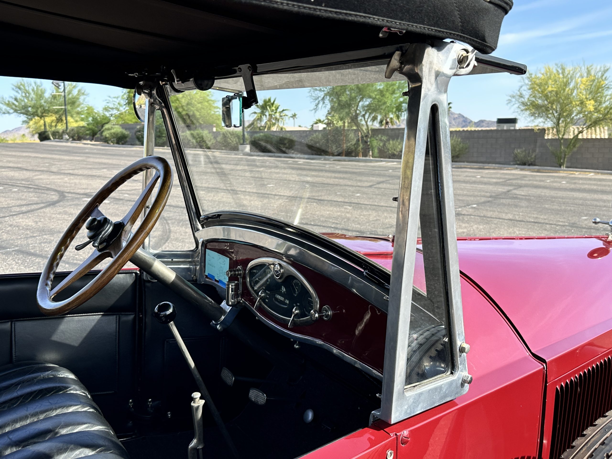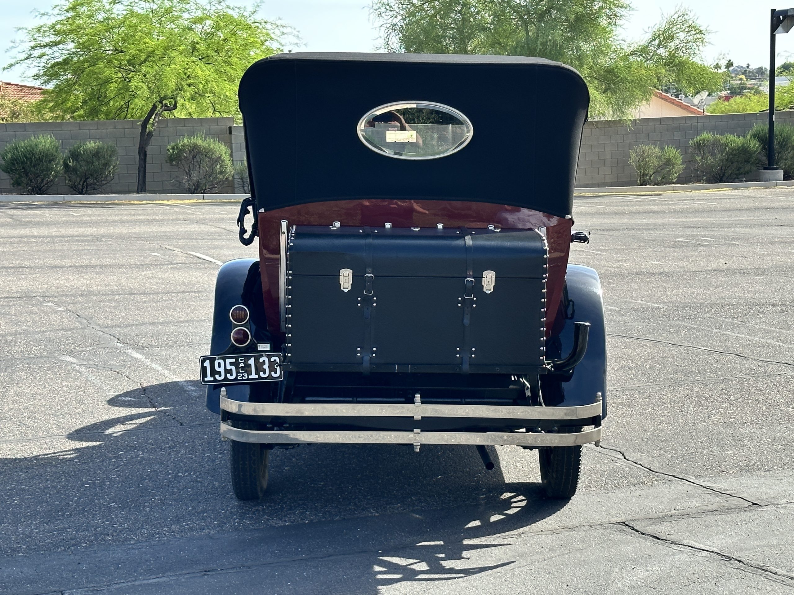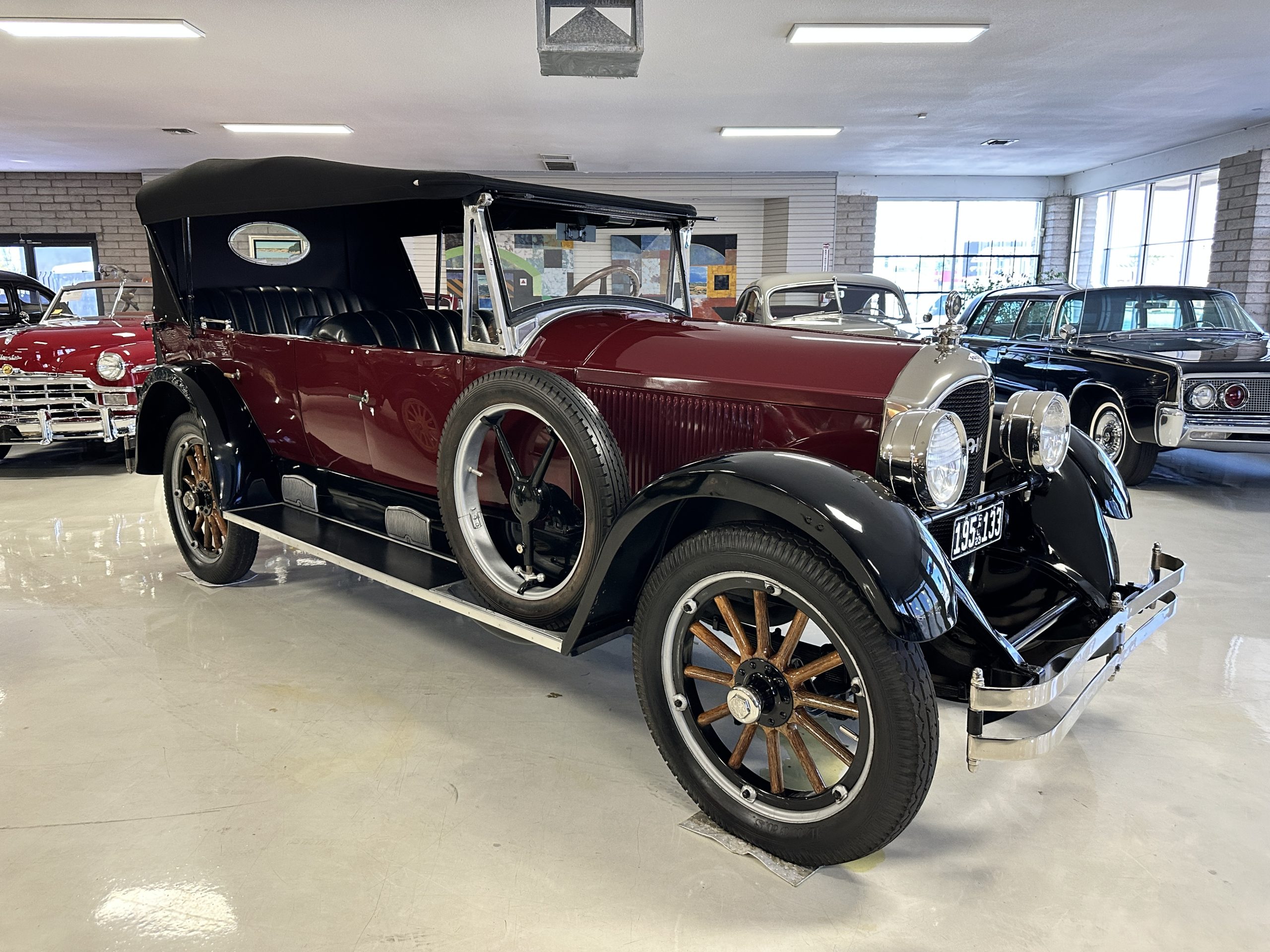 The livery is gorgeous in Burgundy and Black two tone with a black canvas convertible top. The paint is still in very nice show condition consistent with 250 miles added since being restored. The black canvas convertible top is as new and featured a beveled oval rear window. The 24-inch wooden artillery wheels look new. The gorgeous, sculptured chrome grill with its locking Motometer and headlights are in show condition as well. The Paige featured many accessories, such as the double shock absorbing bumpers, cast aluminum windshield frames, dual side mounted spares and a beautifully designed cut curved area for the rear trunk. This Paige has a fully restored trunk that is a showstopper. The tinted external sun visor is a very practical feature that we benefitted from here in the Arizona sun. Overall, this Paige is still quite a show car and is well detailed throughout.