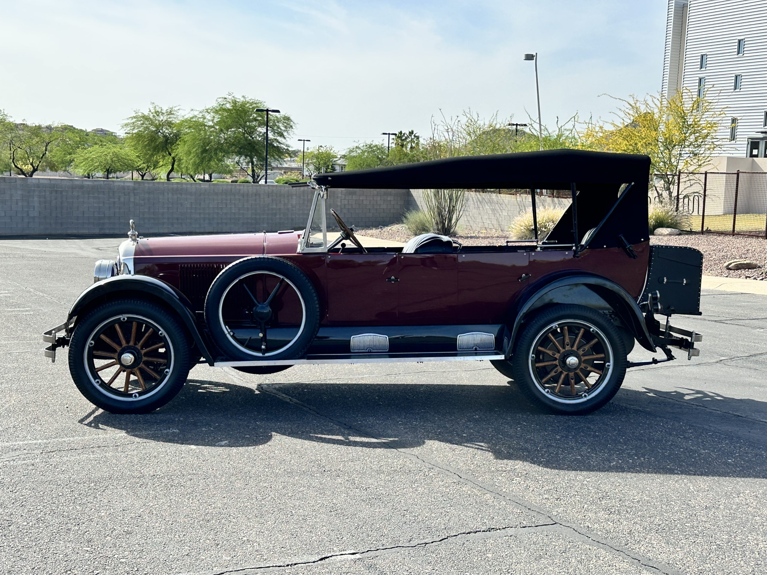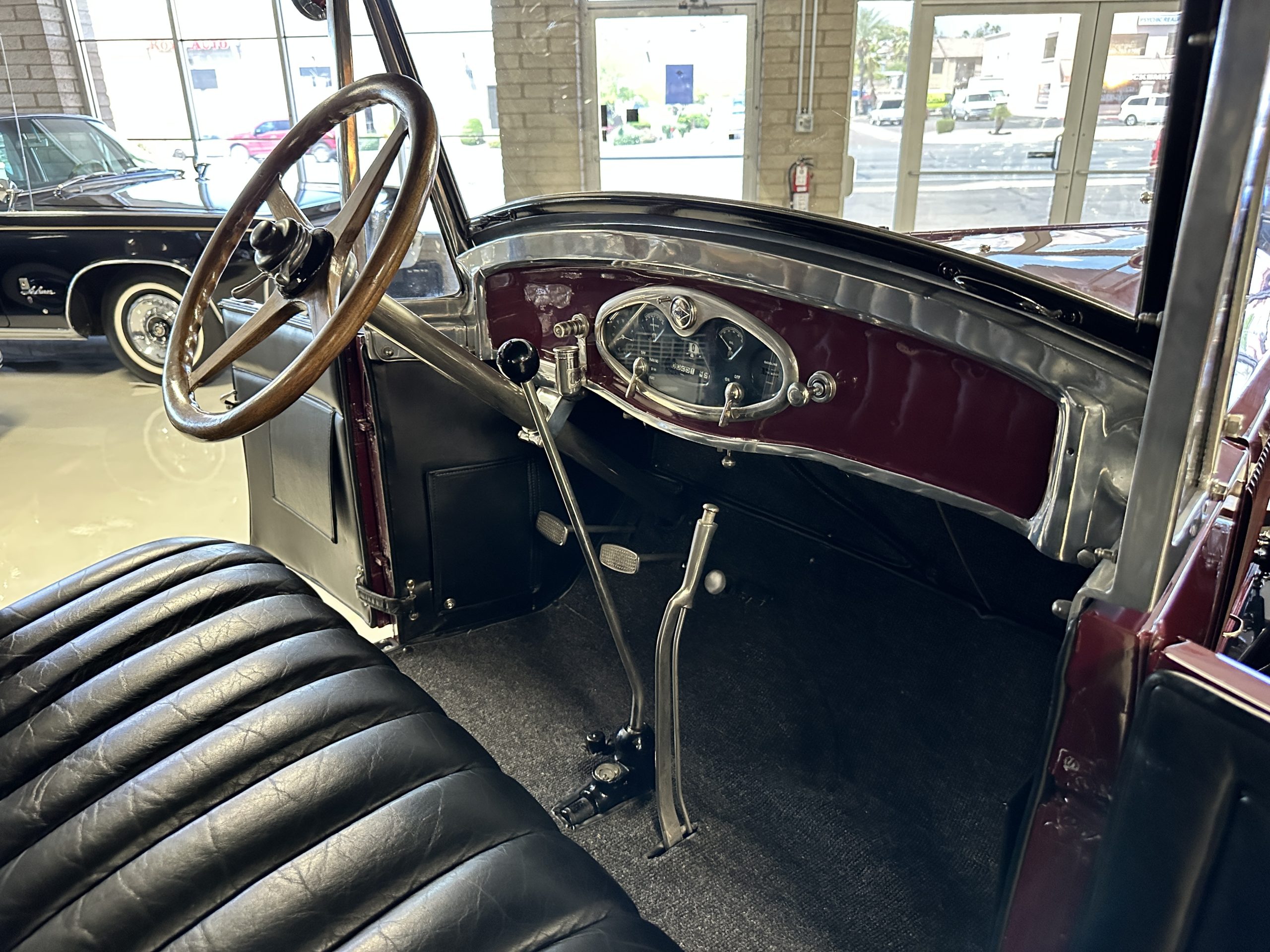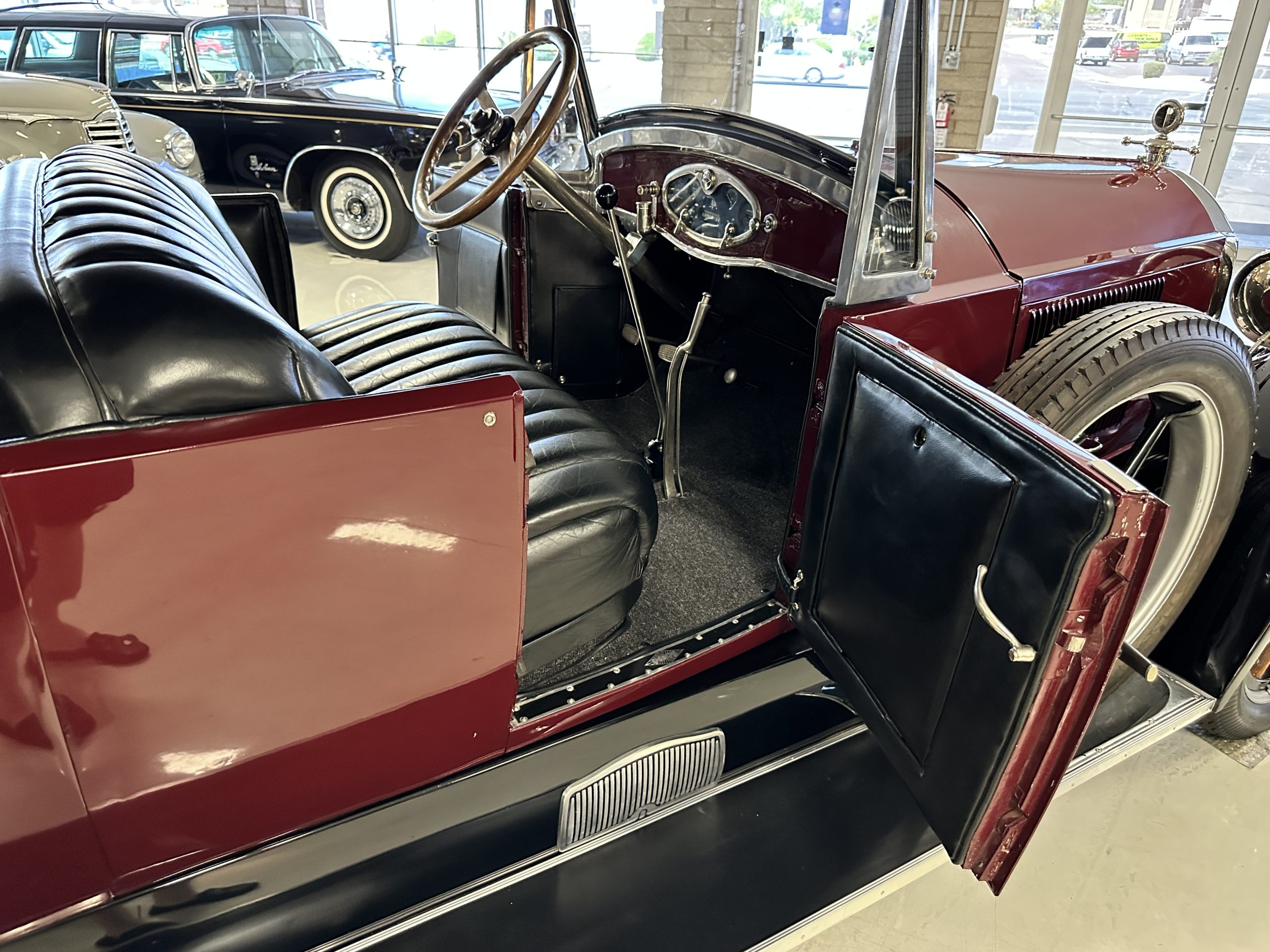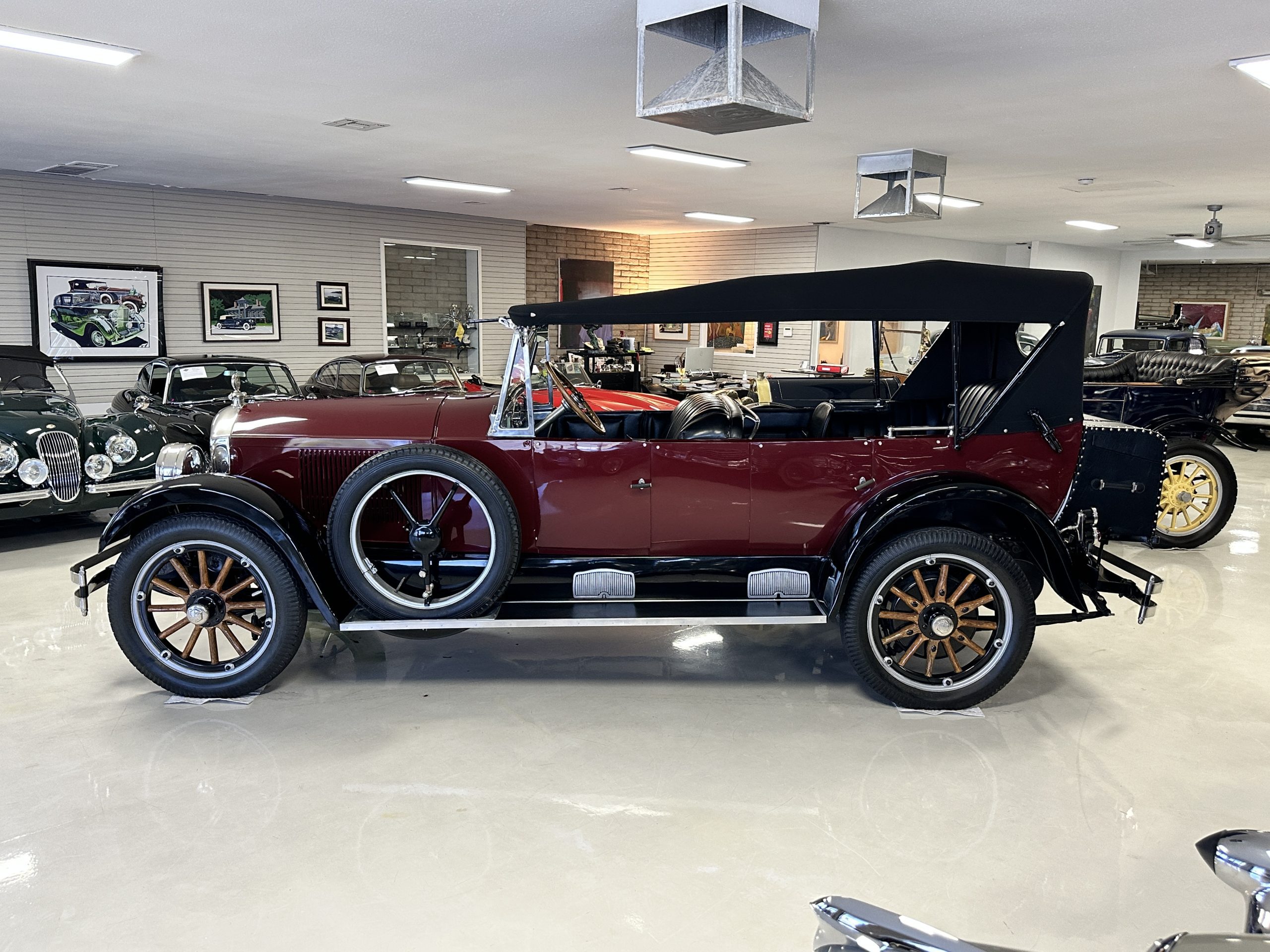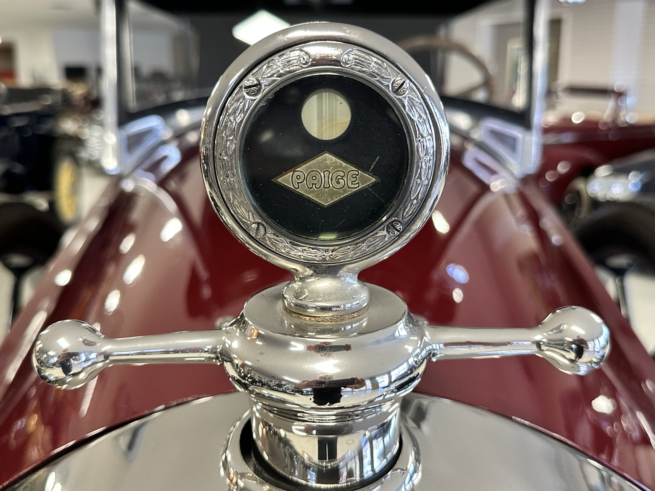 The livery is gorgeous in Burgundy and Black two tone with a black canvas convertible top. The paint is still in very nice show condition consistent with 250 miles added since being restored. The black canvas convertible top is as new and featured a beveled oval rear window. The 24-inch wooden artillery wheels look new. The gorgeous, sculptured chrome grill with its locking Motometer and headlights are in show condition as well. The Paige featured many accessories, such as the double shock absorbing bumpers, cast aluminum windshield frames, dual side mounted spares and a beautifully designed cut curved area for the rear trunk. This Paige has a fully restored trunk that is a showstopper. The tinted external sun visor is a very practical feature that we benefitted from here in the Arizona sun. Overall, this Paige is still quite a show car and is well detailed throughout.