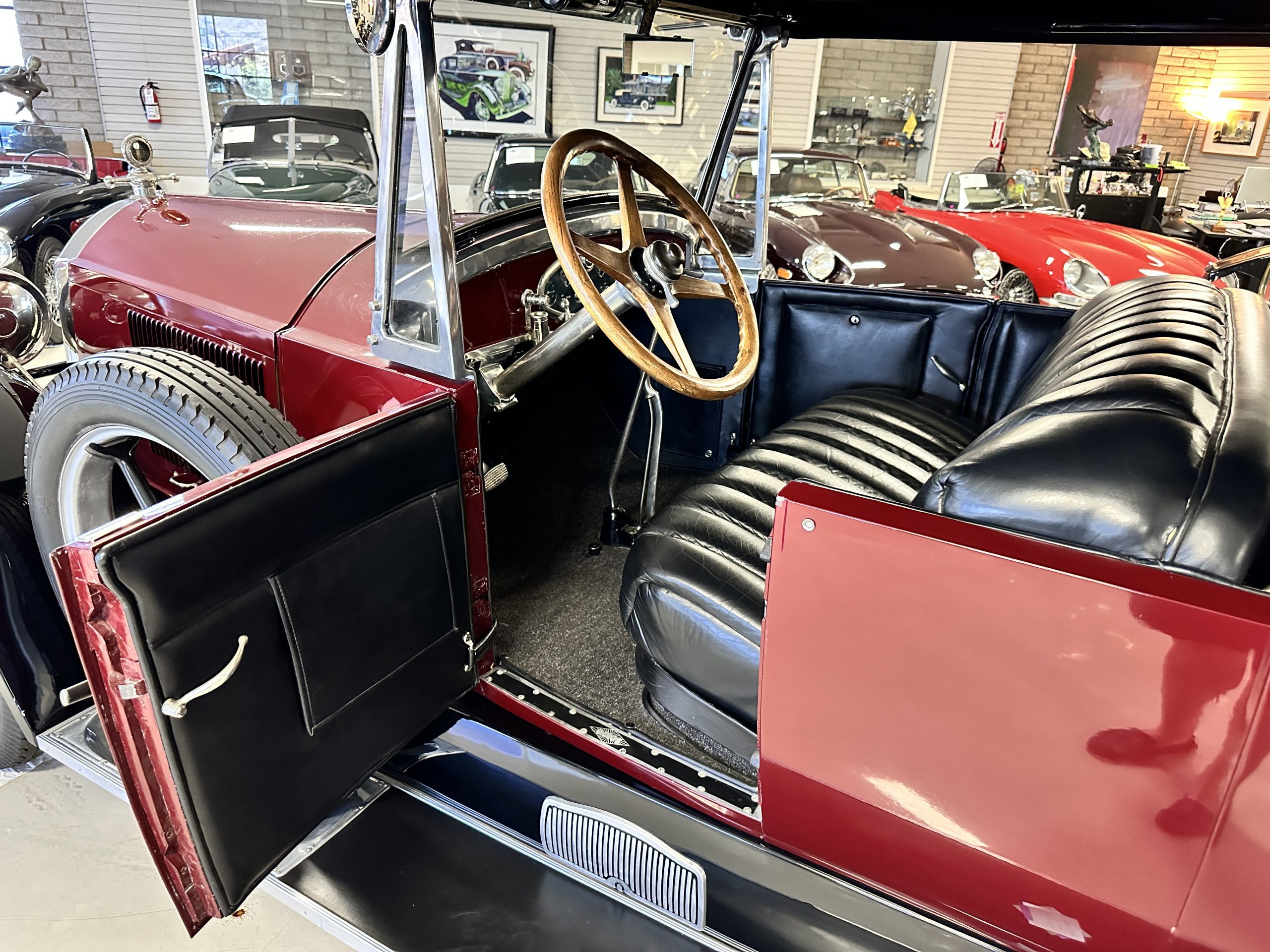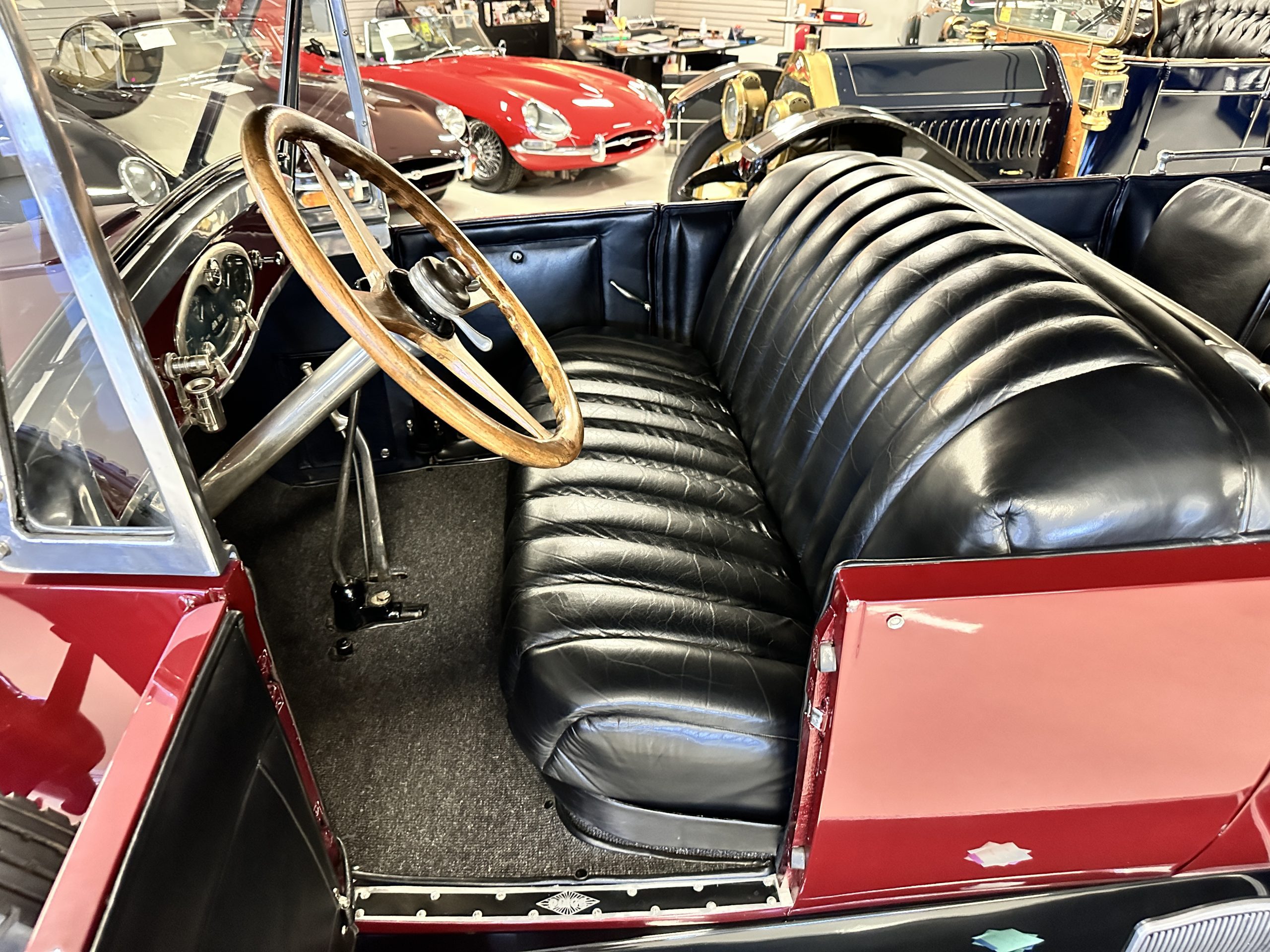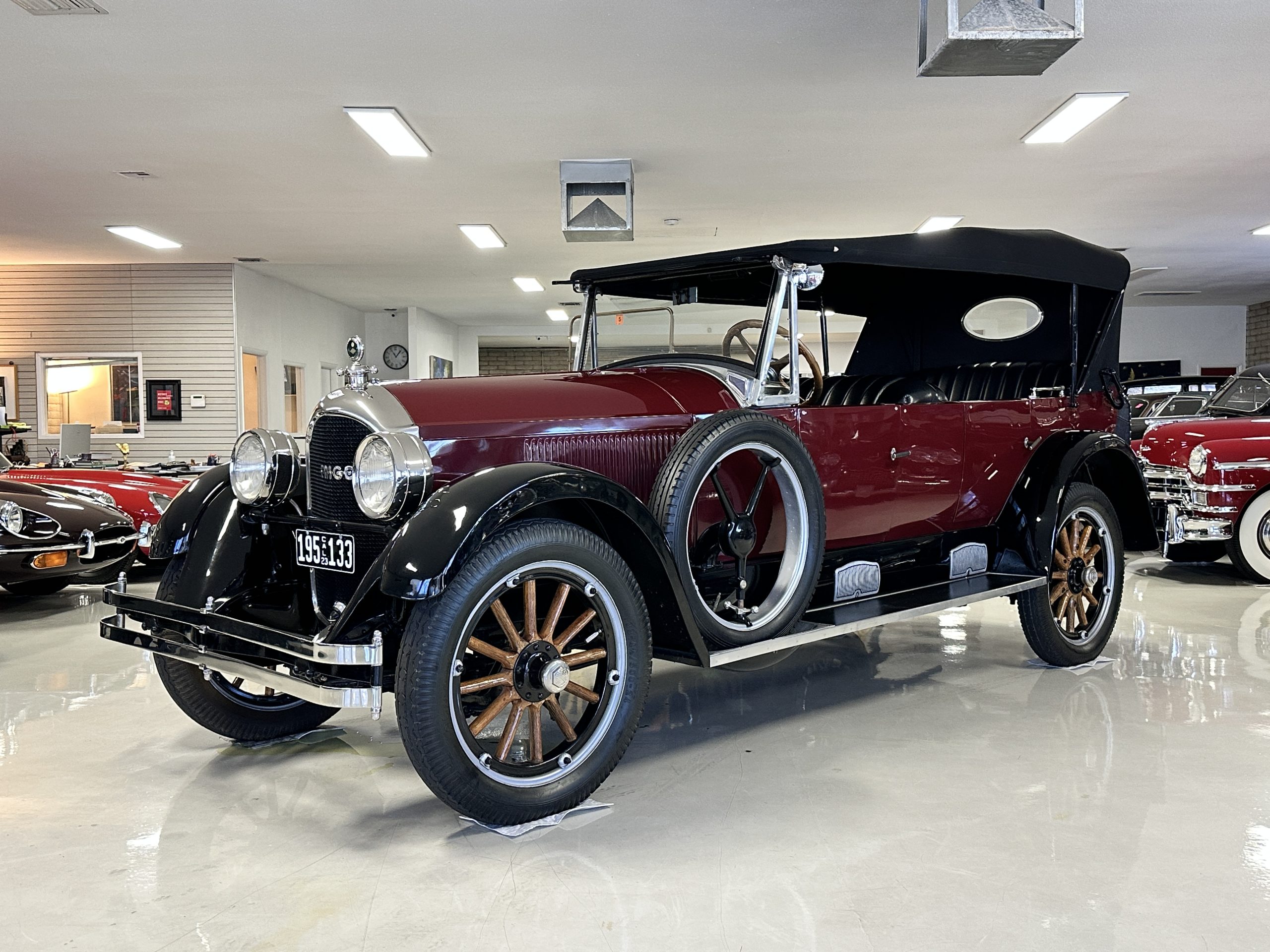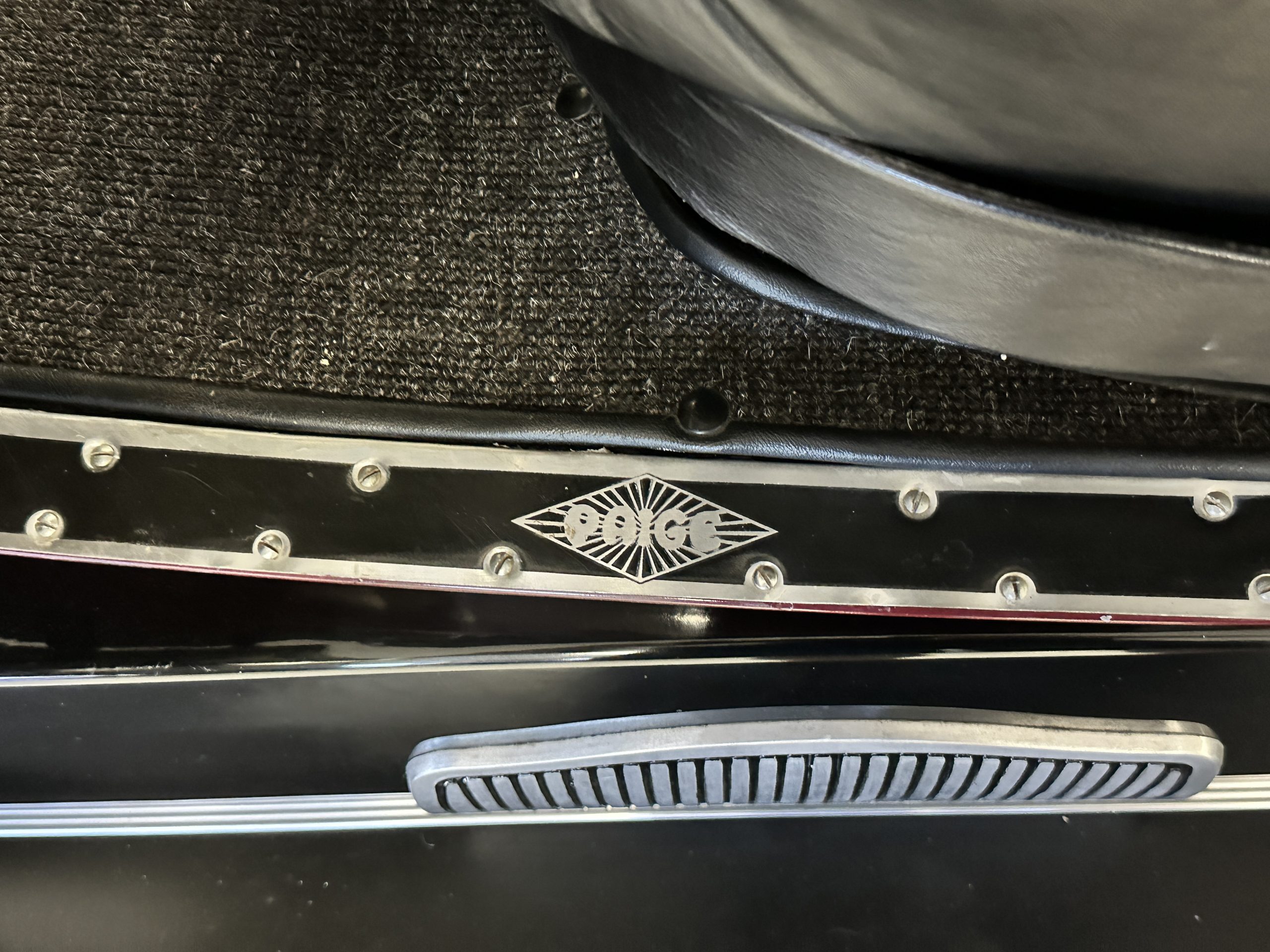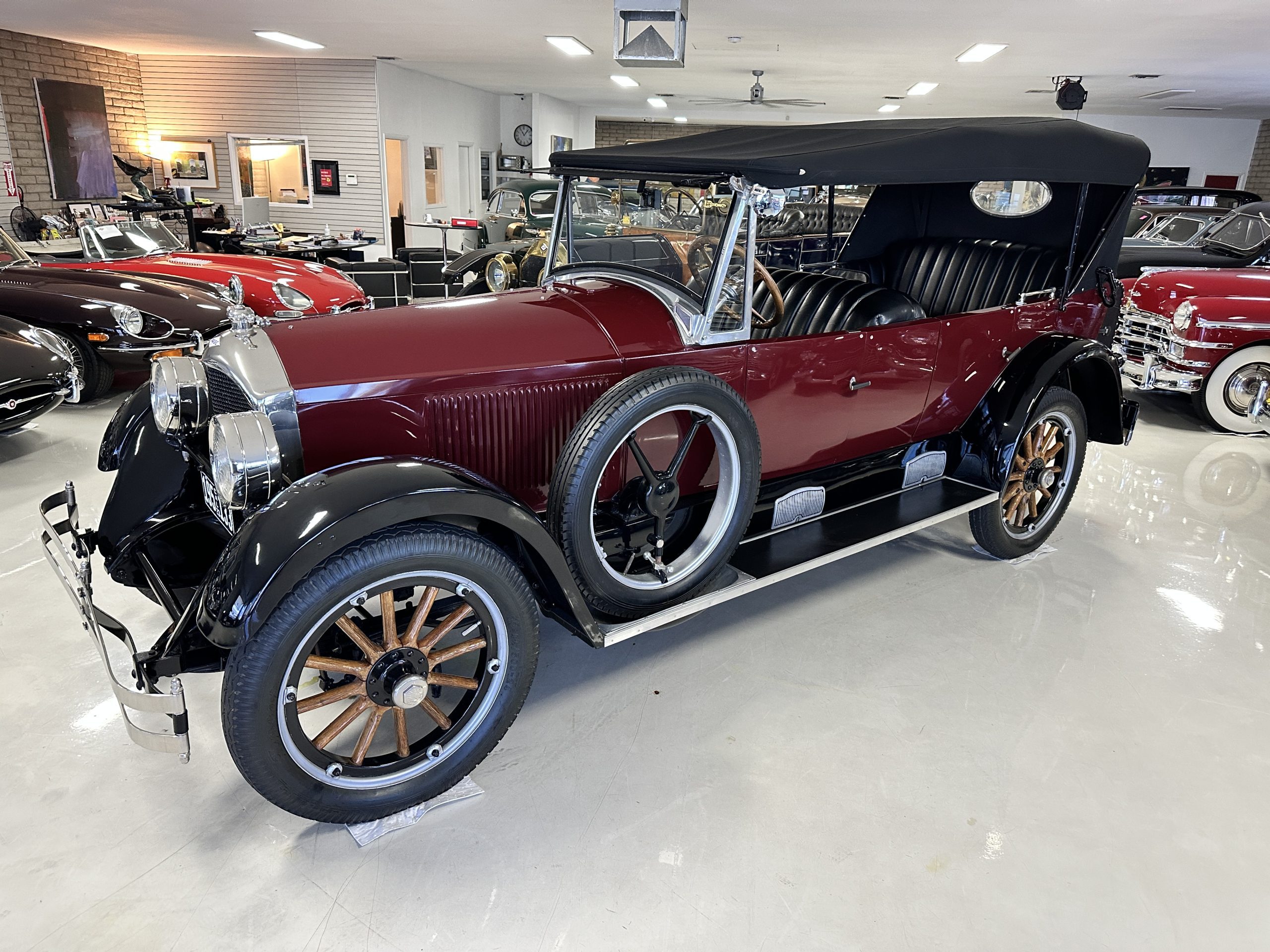 The livery is gorgeous in Burgundy and Black two tone with a black canvas convertible top. The paint is still in very nice show condition consistent with 250 miles added since being restored. The black canvas convertible top is as new and featured a beveled oval rear window. The 24-inch wooden artillery wheels look new. The gorgeous, sculptured chrome grill with its locking Motometer and headlights are in show condition as well. The Paige featured many accessories, such as the double shock absorbing bumpers, cast aluminum windshield frames, dual side mounted spares and a beautifully designed cut curved area for the rear trunk. This Paige has a fully restored trunk that is a showstopper. The tinted external sun visor is a very practical feature that we benefitted from here in the Arizona sun. Overall, this Paige is still quite a show car and is well detailed throughout.