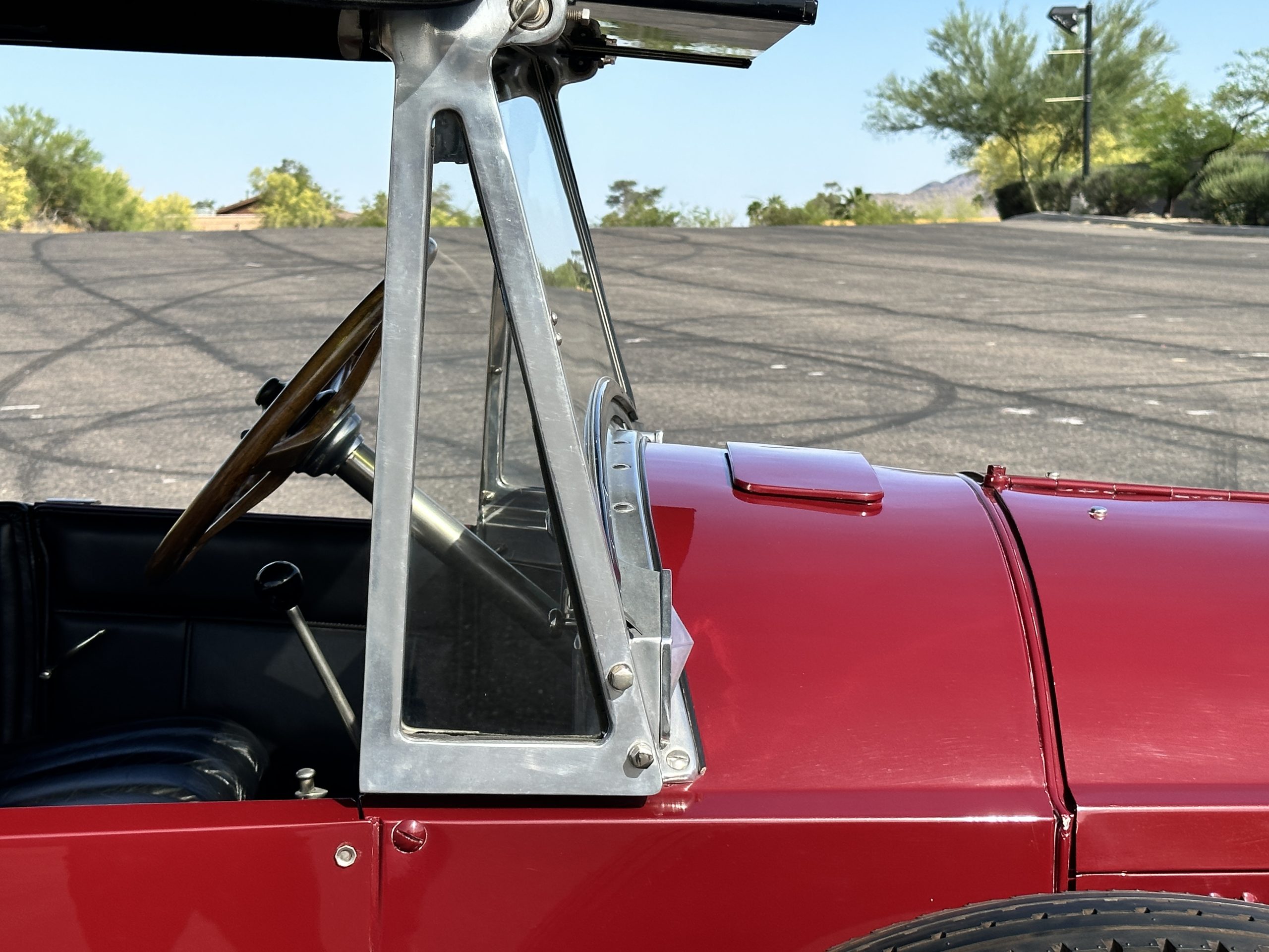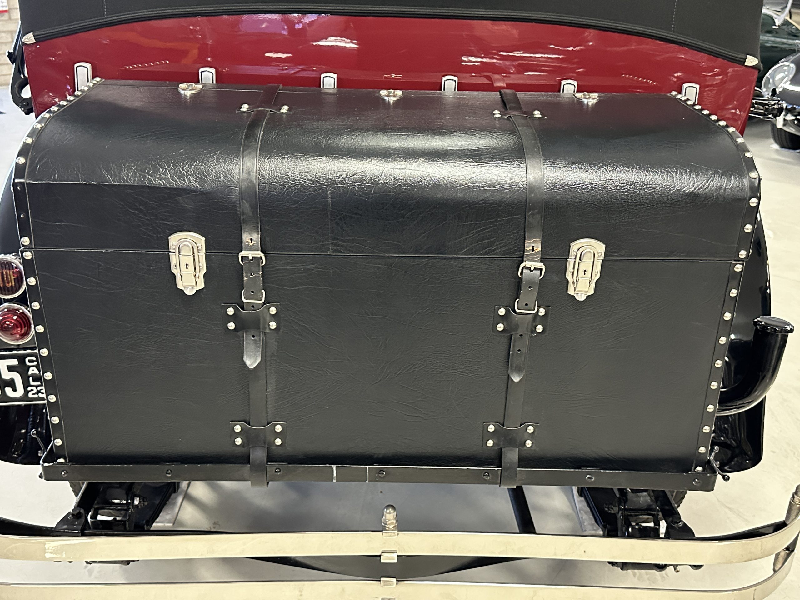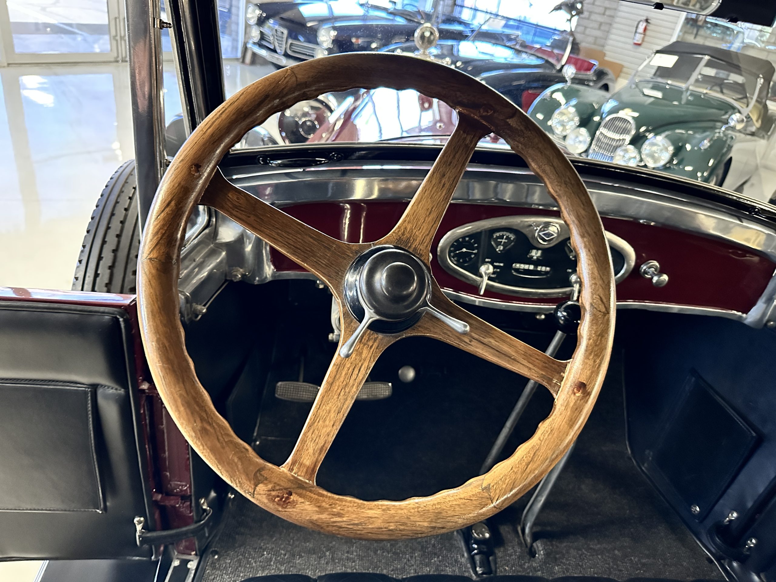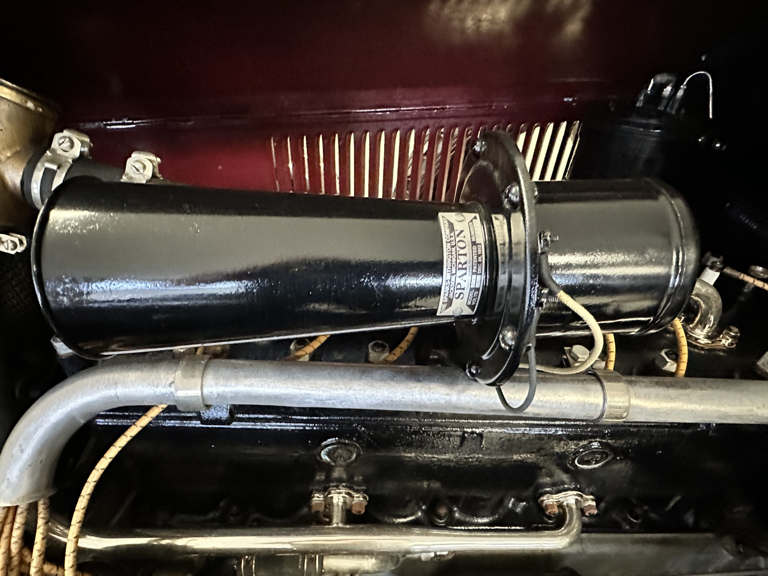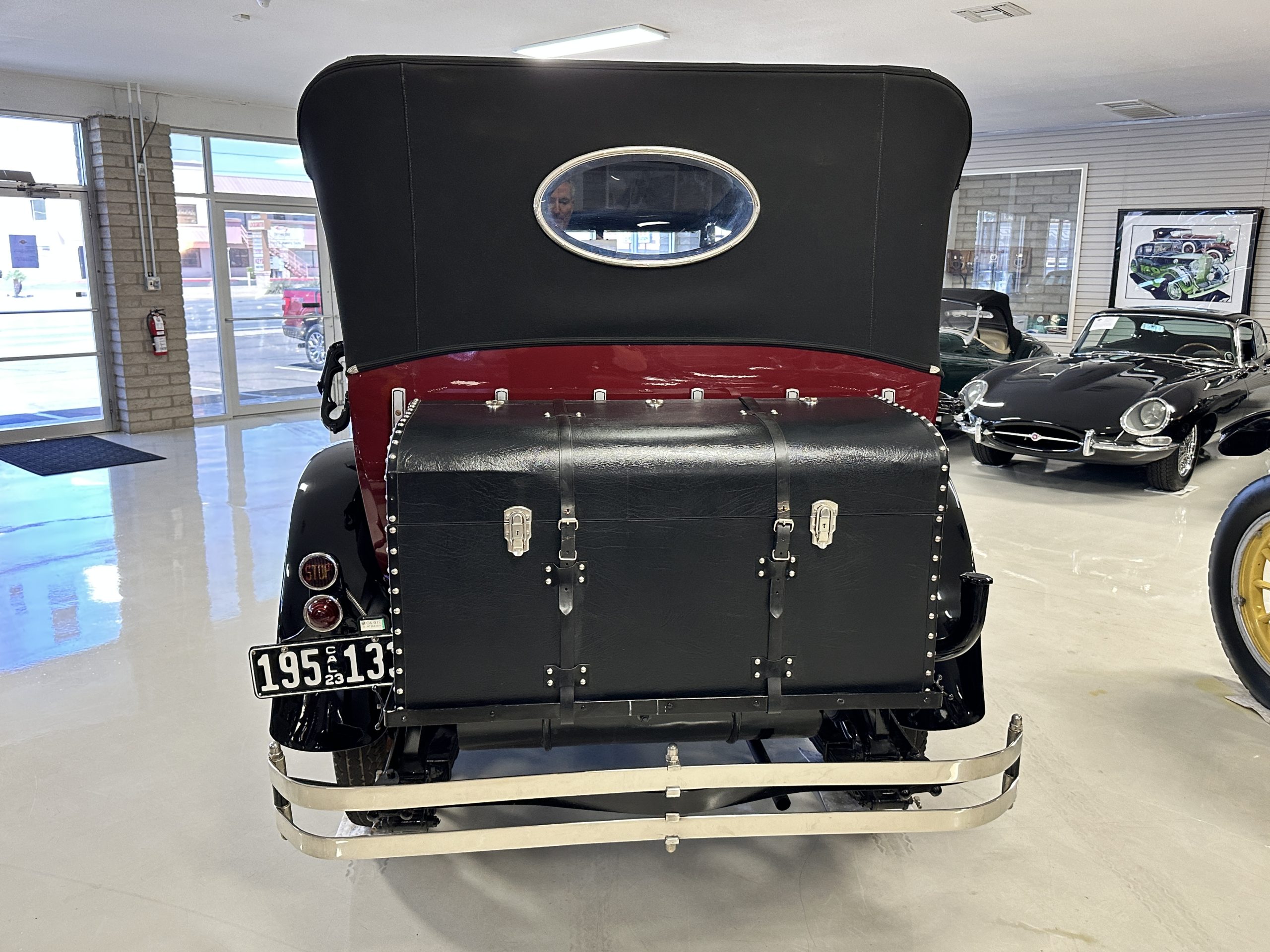 The livery is gorgeous in Burgundy and Black two tone with a black canvas convertible top. The paint is still in very nice show condition consistent with 250 miles added since being restored. The black canvas convertible top is as new and featured a beveled oval rear window. The 24-inch wooden artillery wheels look new. The gorgeous, sculptured chrome grill with its locking Motometer and headlights are in show condition as well. The Paige featured many accessories, such as the double shock absorbing bumpers, cast aluminum windshield frames, dual side mounted spares and a beautifully designed cut curved area for the rear trunk. This Paige has a fully restored trunk that is a showstopper. The tinted external sun visor is a very practical feature that we benefitted from here in the Arizona sun. Overall, this Paige is still quite a show car and is well detailed throughout.