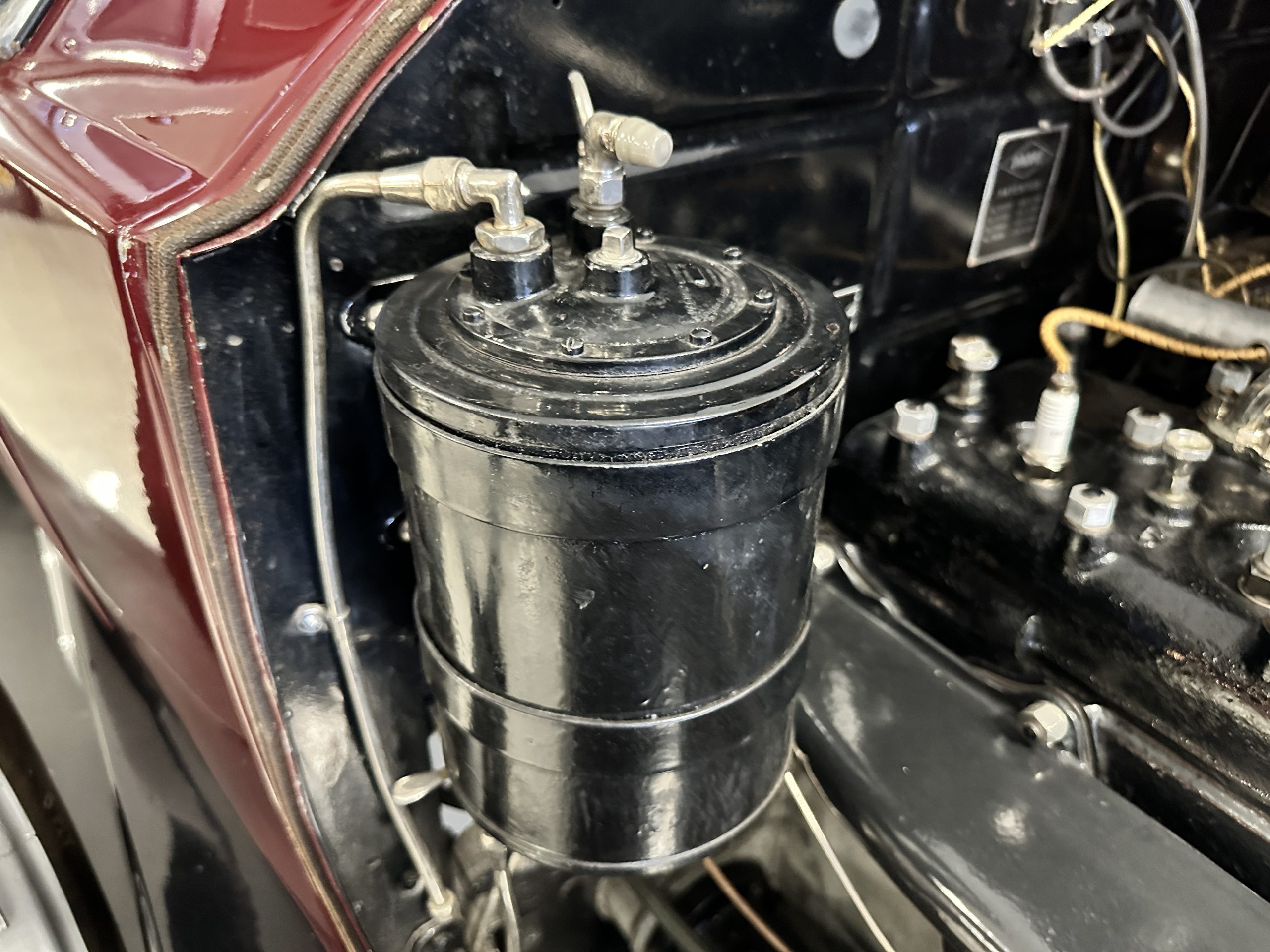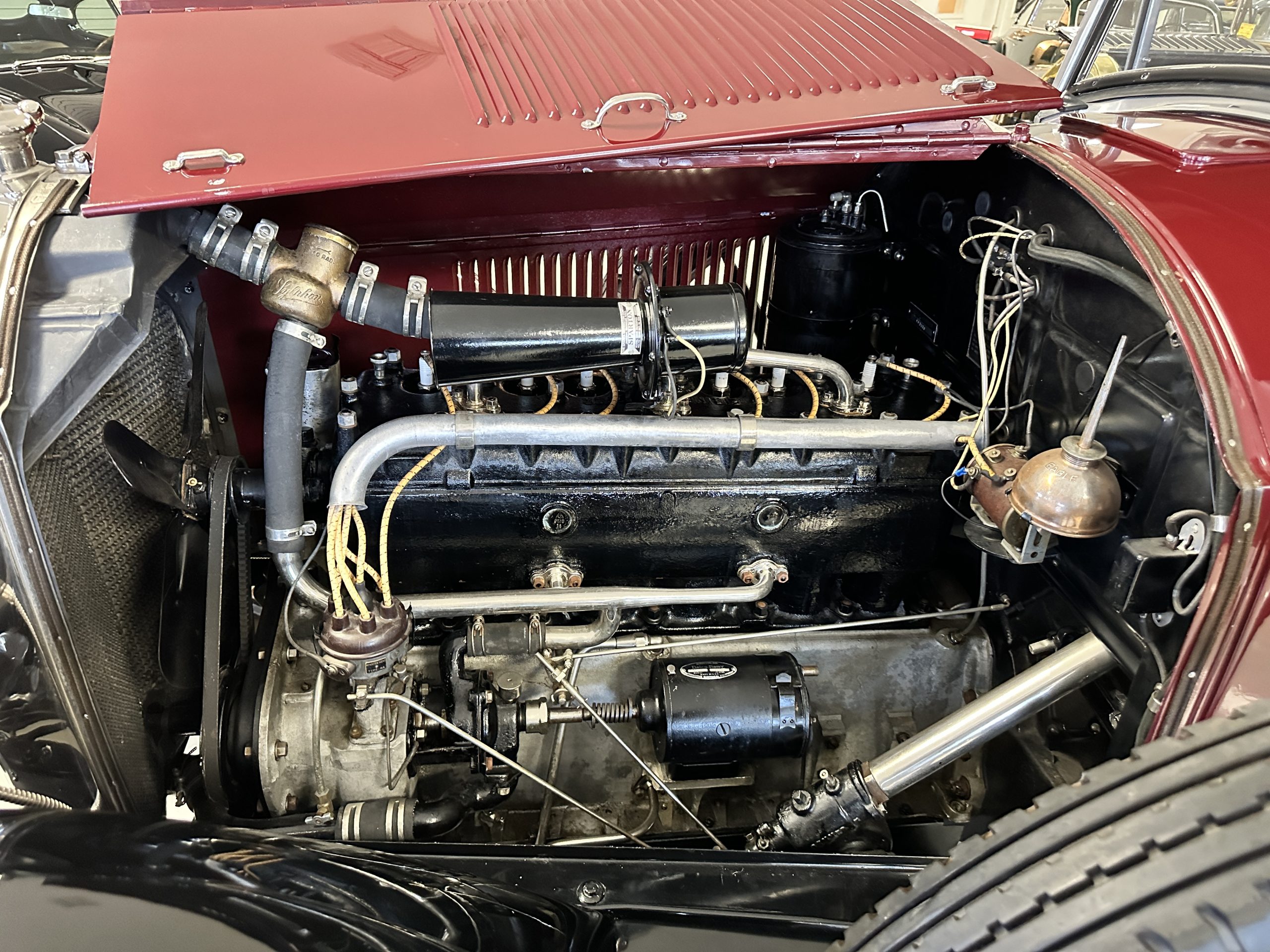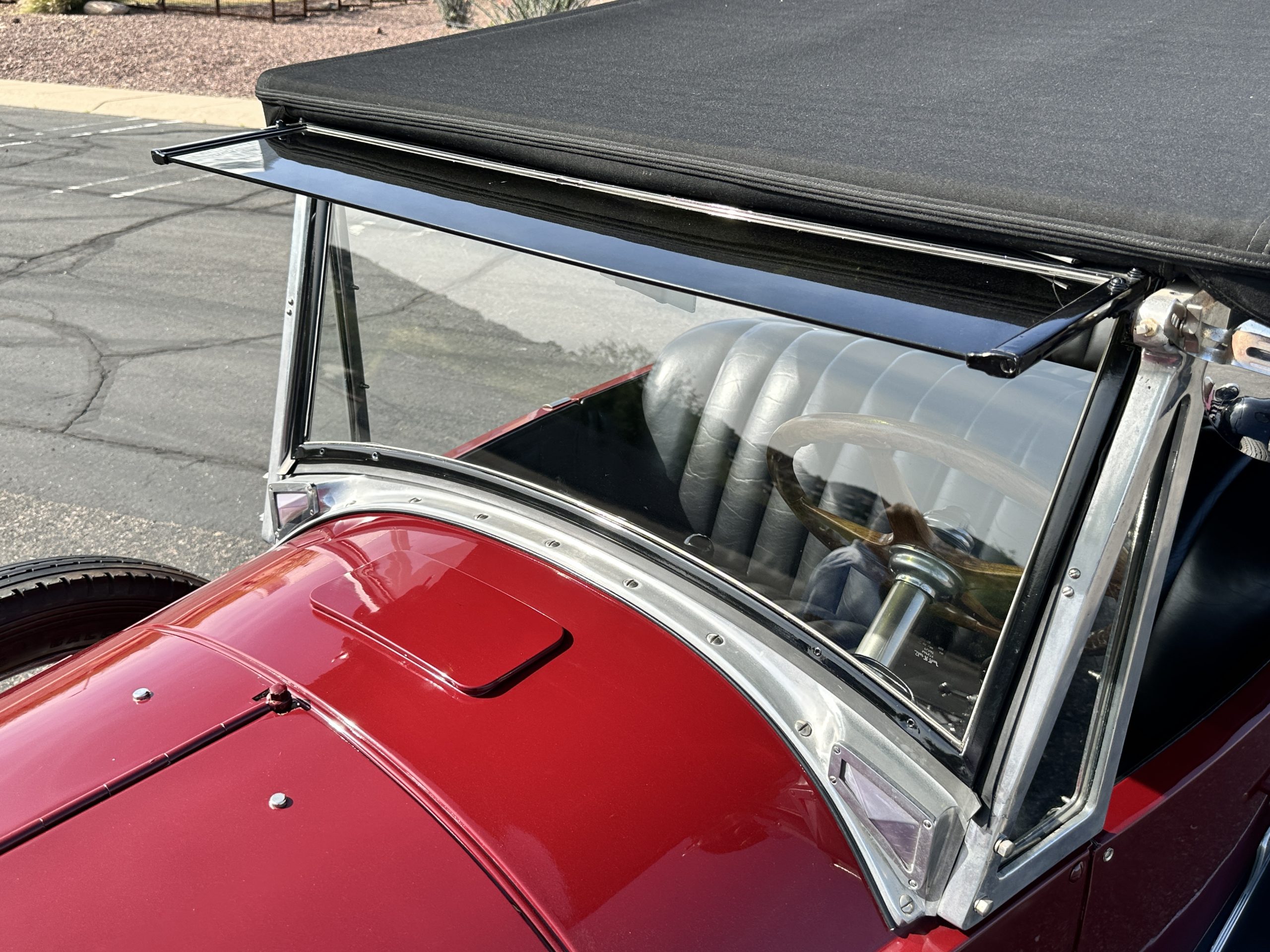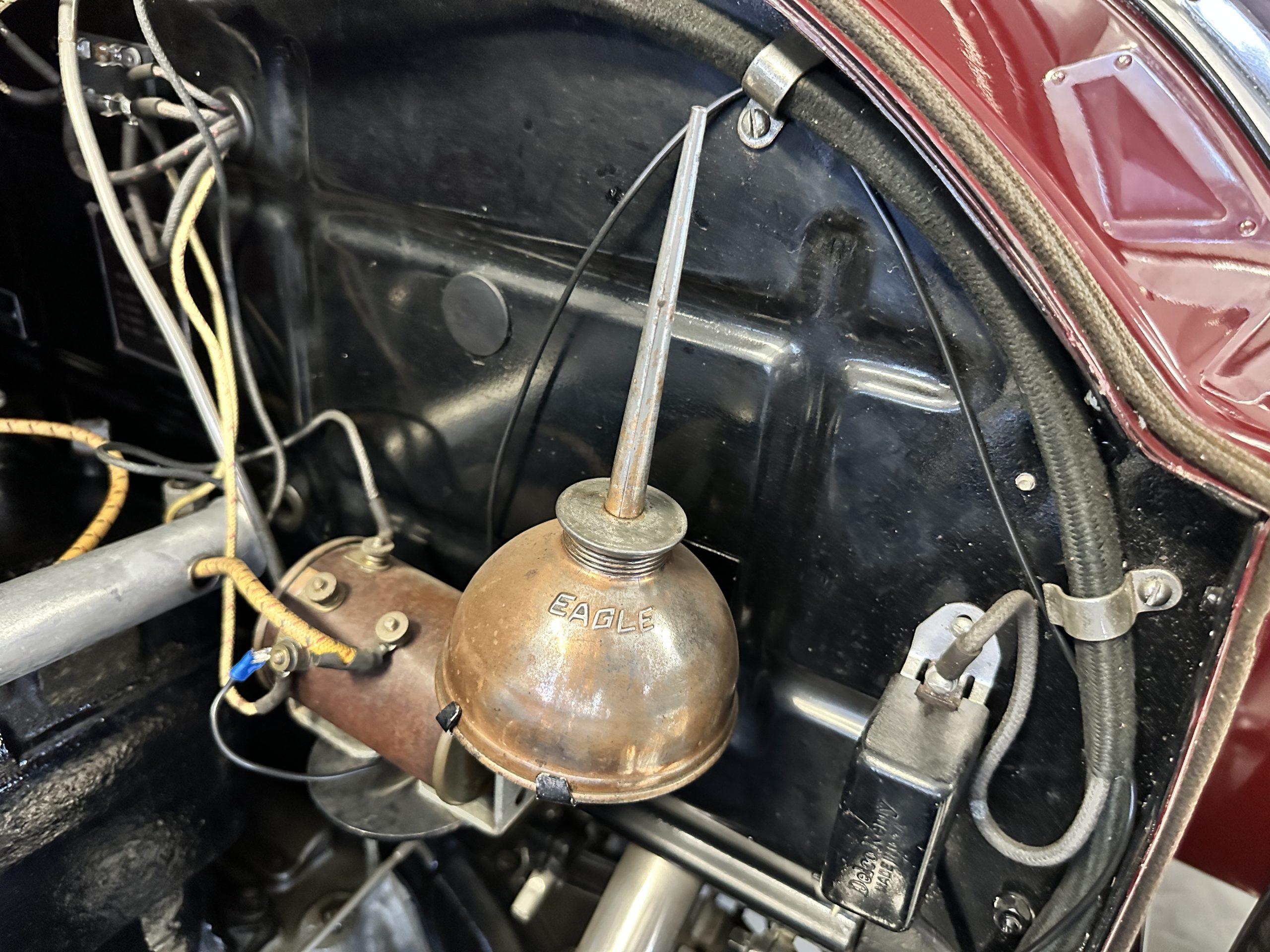 The livery is gorgeous in Burgundy and Black two tone with a black canvas convertible top. The paint is still in very nice show condition consistent with 250 miles added since being restored. The black canvas convertible top is as new and featured a beveled oval rear window. The 24-inch wooden artillery wheels look new. The gorgeous, sculptured chrome grill with its locking Motometer and headlights are in show condition as well. The Paige featured many accessories, such as the double shock absorbing bumpers, cast aluminum windshield frames, dual side mounted spares and a beautifully designed cut curved area for the rear trunk. This Paige has a fully restored trunk that is a showstopper. The tinted external sun visor is a very practical feature that we benefitted from here in the Arizona sun. Overall, this Paige is still quite a show car and is well detailed throughout.