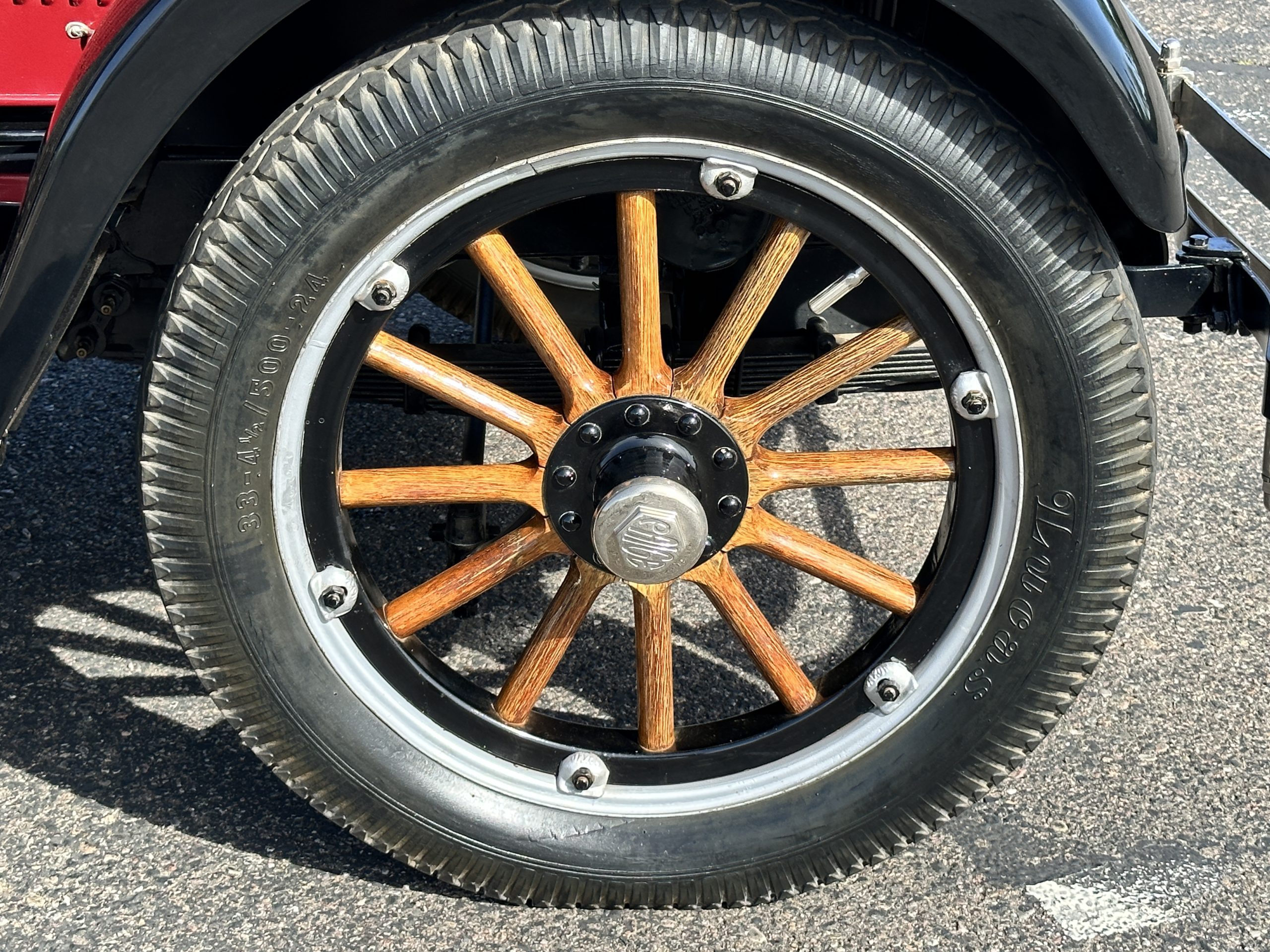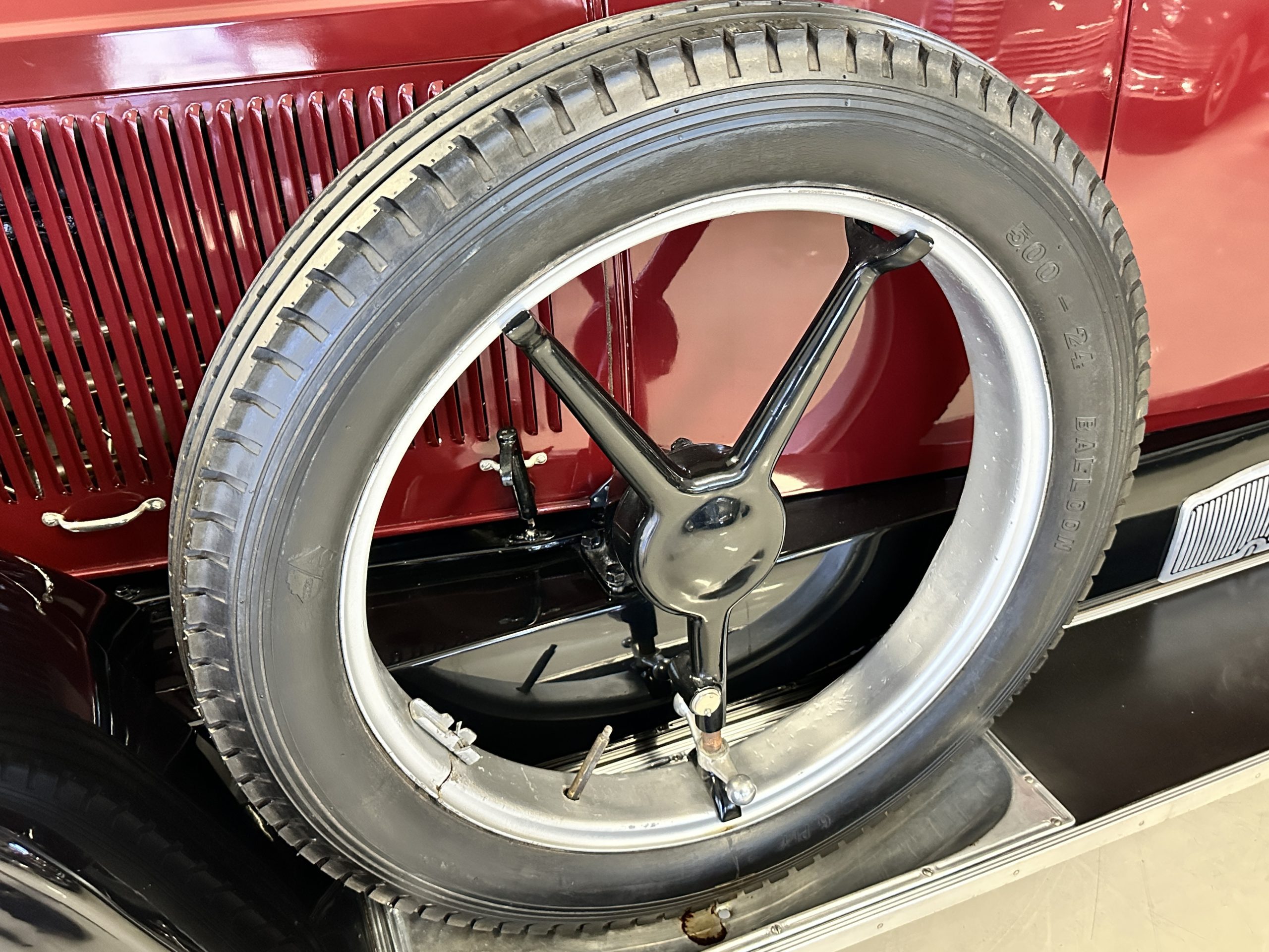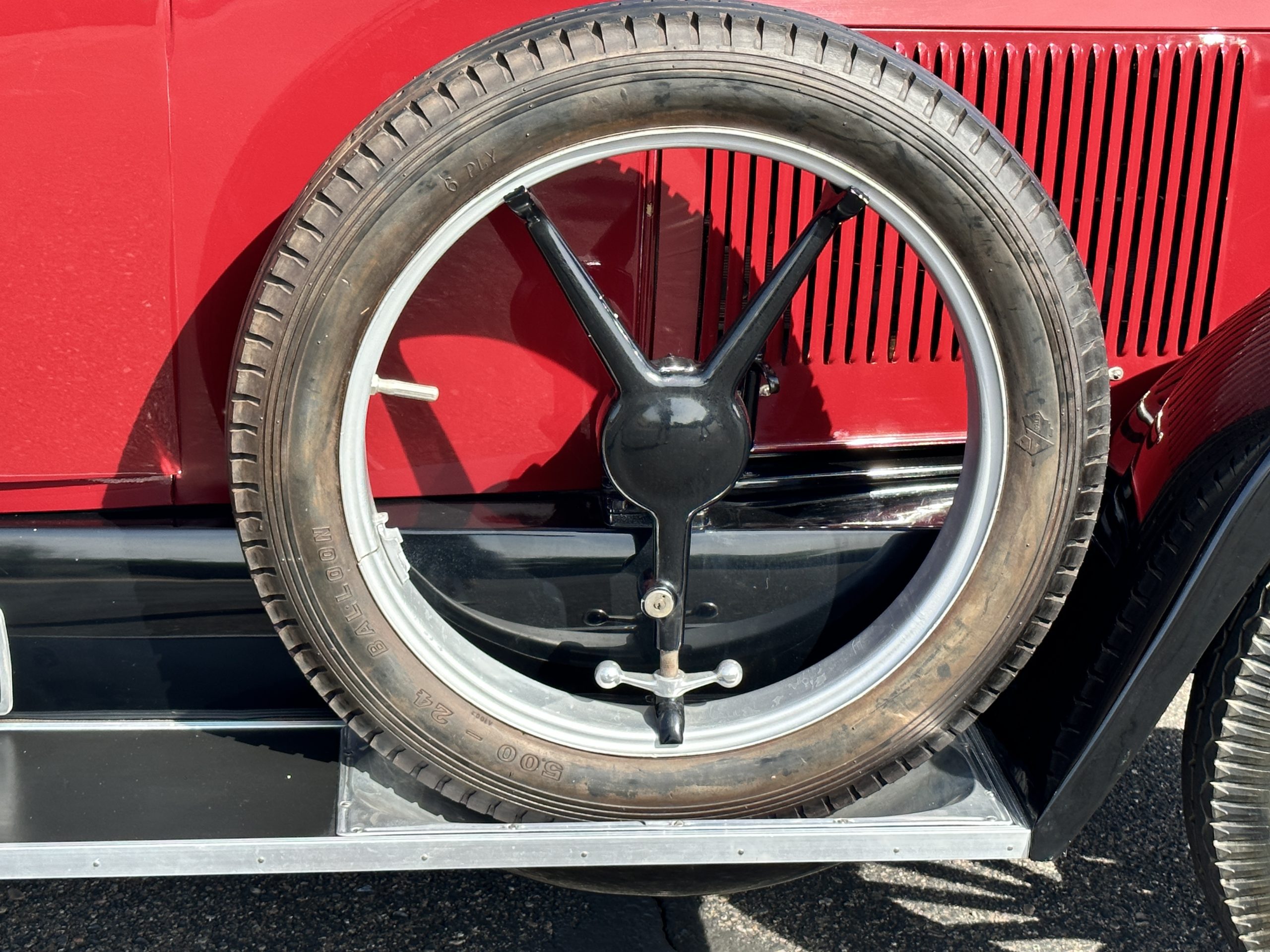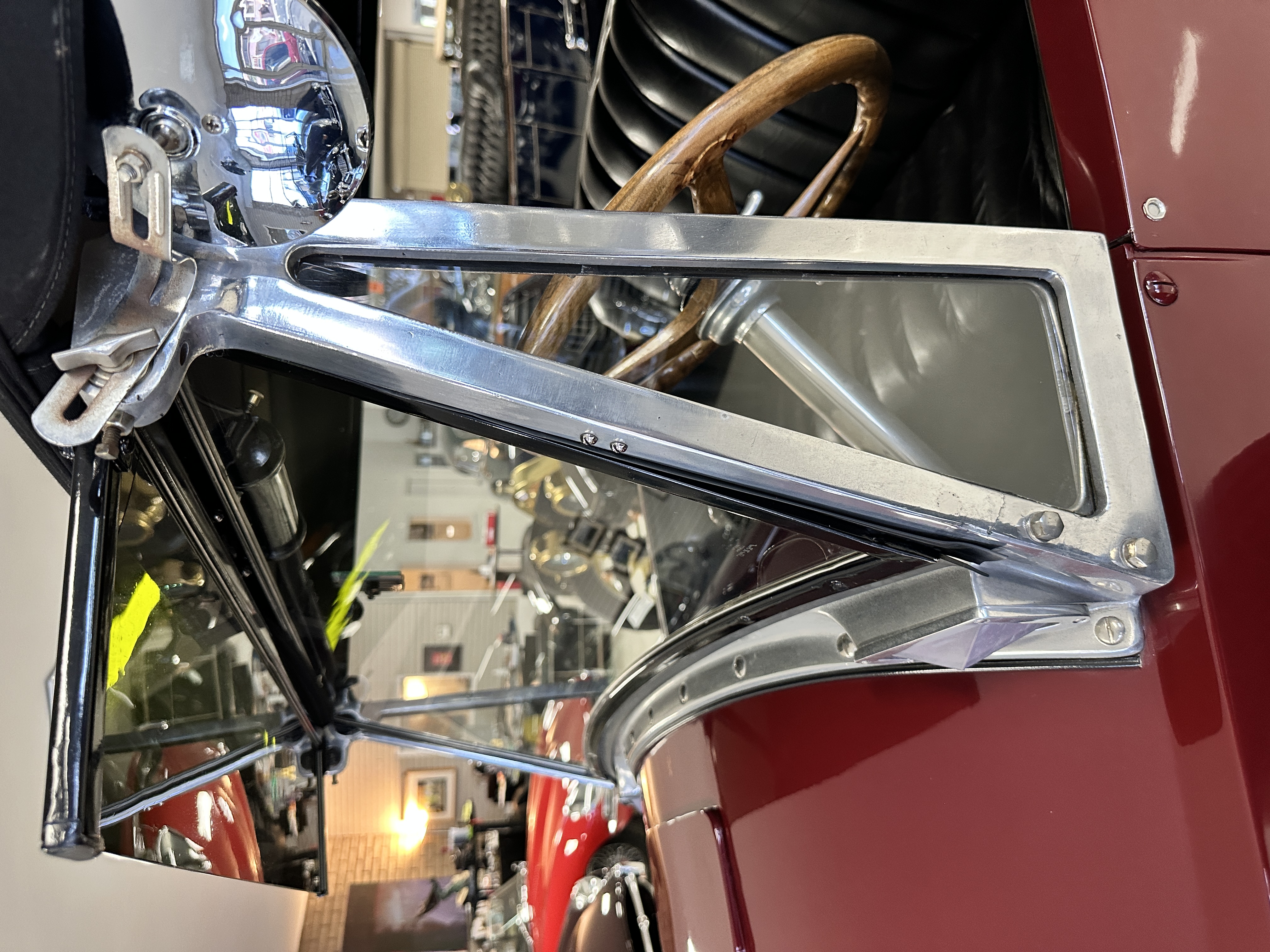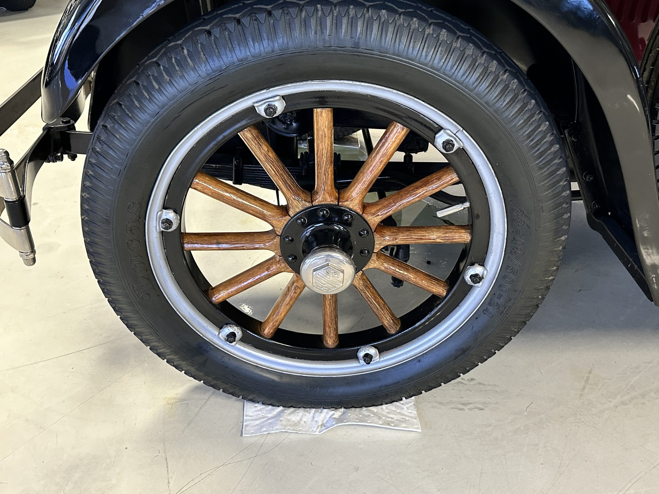 The livery is gorgeous in Burgundy and Black two tone with a black canvas convertible top. The paint is still in very nice show condition consistent with 250 miles added since being restored. The black canvas convertible top is as new and featured a beveled oval rear window. The 24-inch wooden artillery wheels look new. The gorgeous, sculptured chrome grill with its locking Motometer and headlights are in show condition as well. The Paige featured many accessories, such as the double shock absorbing bumpers, cast aluminum windshield frames, dual side mounted spares and a beautifully designed cut curved area for the rear trunk. This Paige has a fully restored trunk that is a showstopper. The tinted external sun visor is a very practical feature that we benefitted from here in the Arizona sun. Overall, this Paige is still quite a show car and is well detailed throughout.