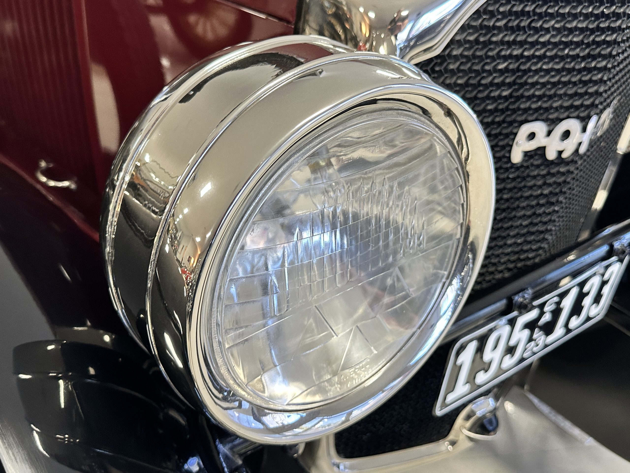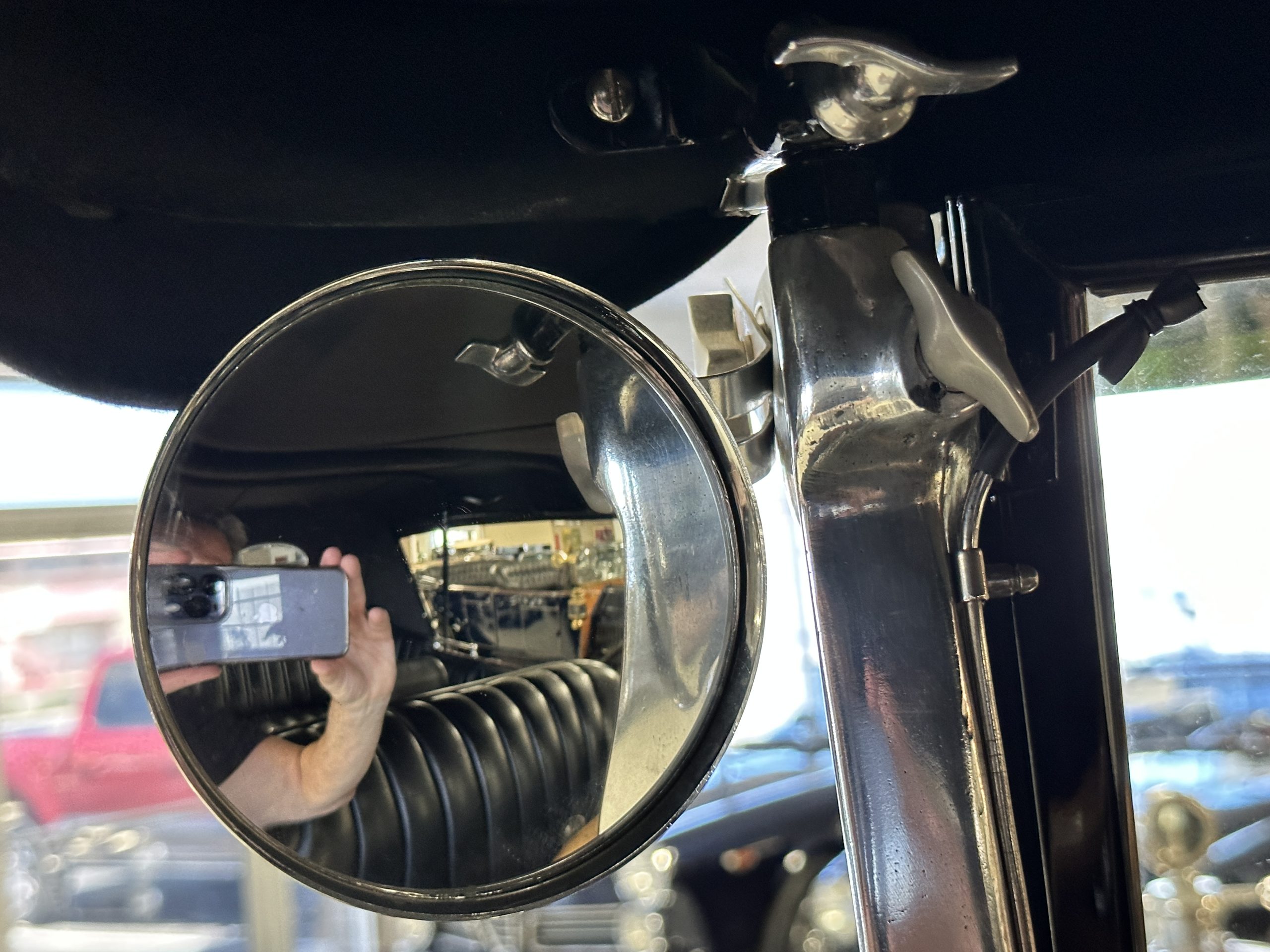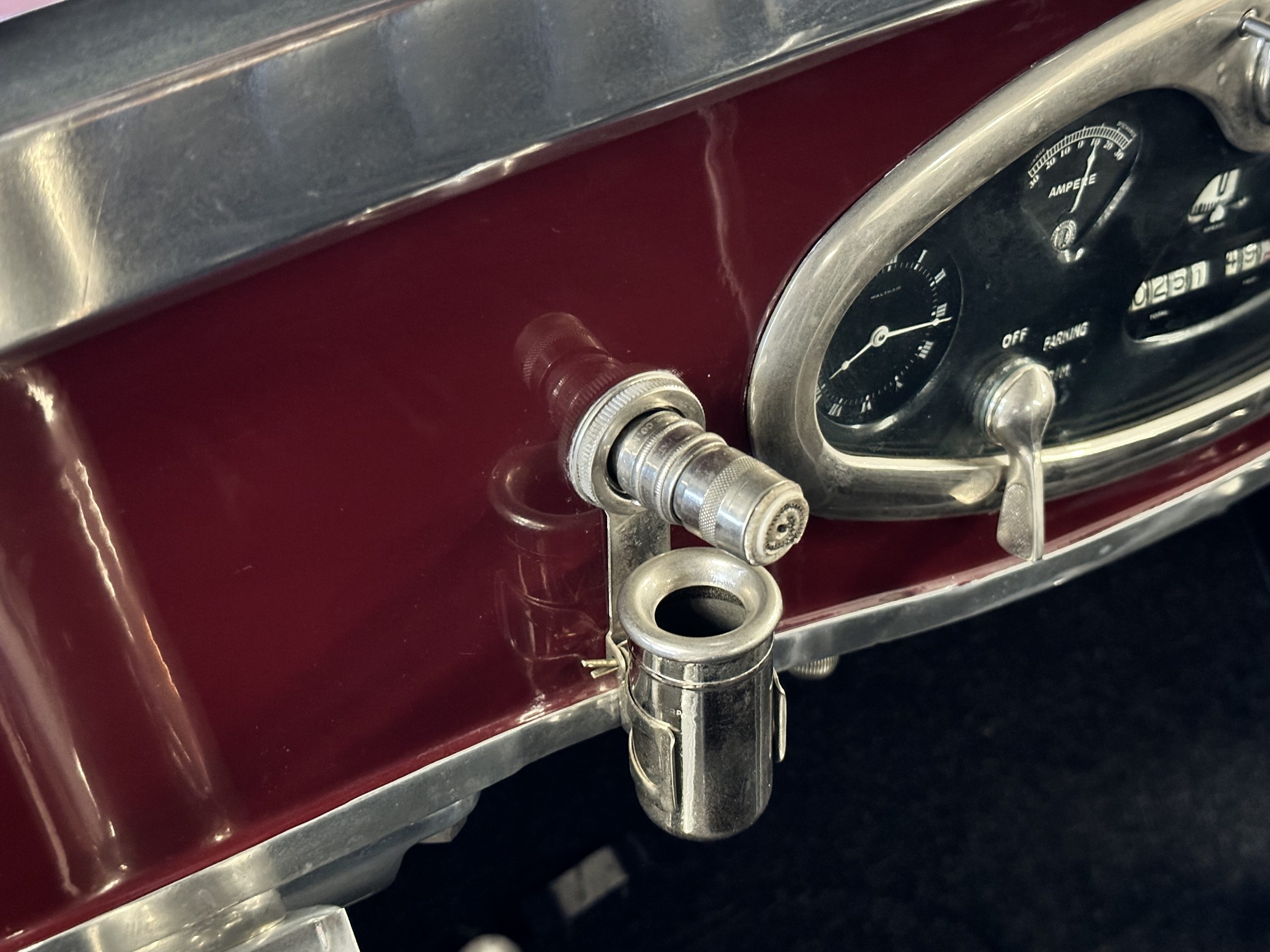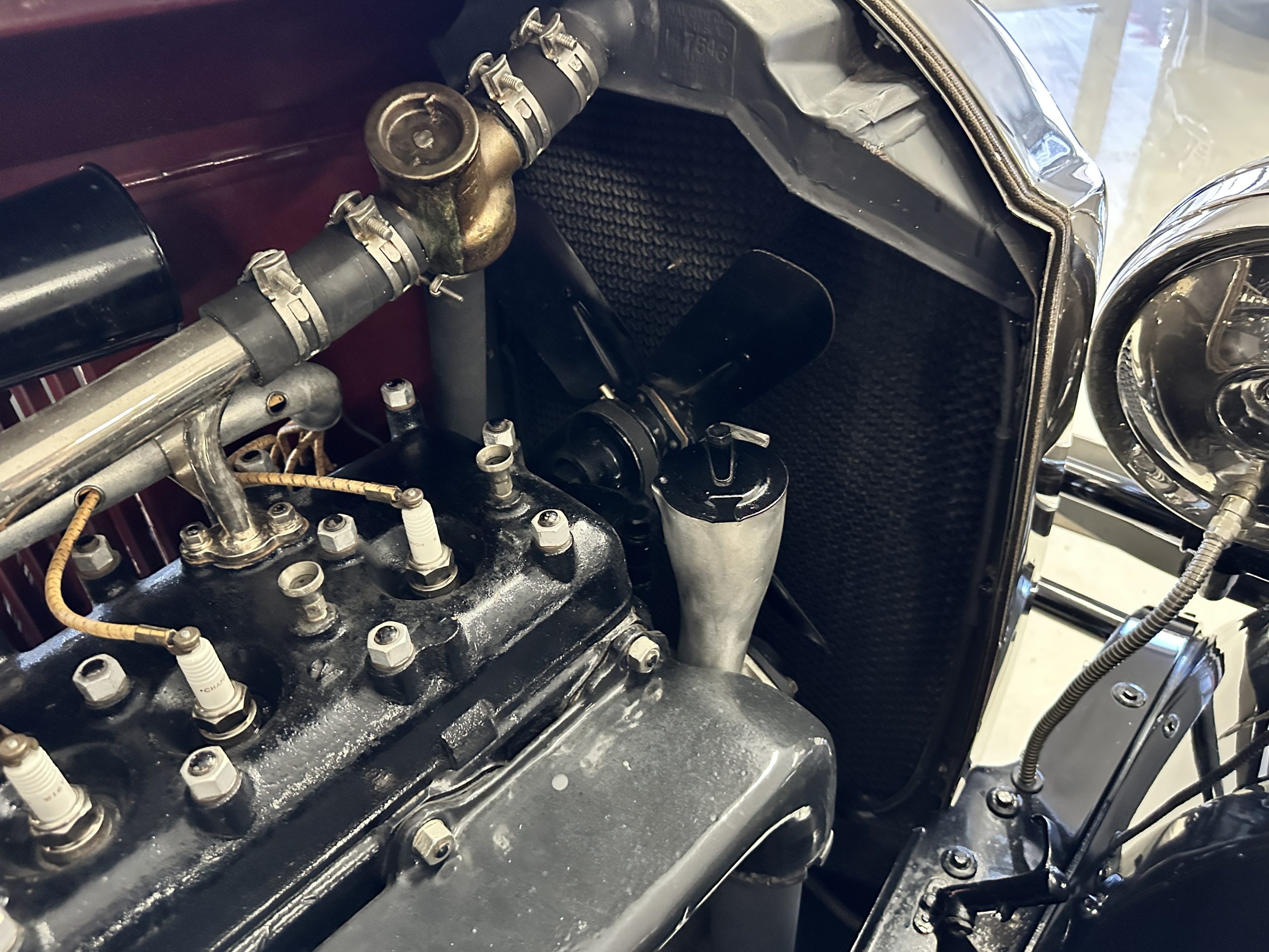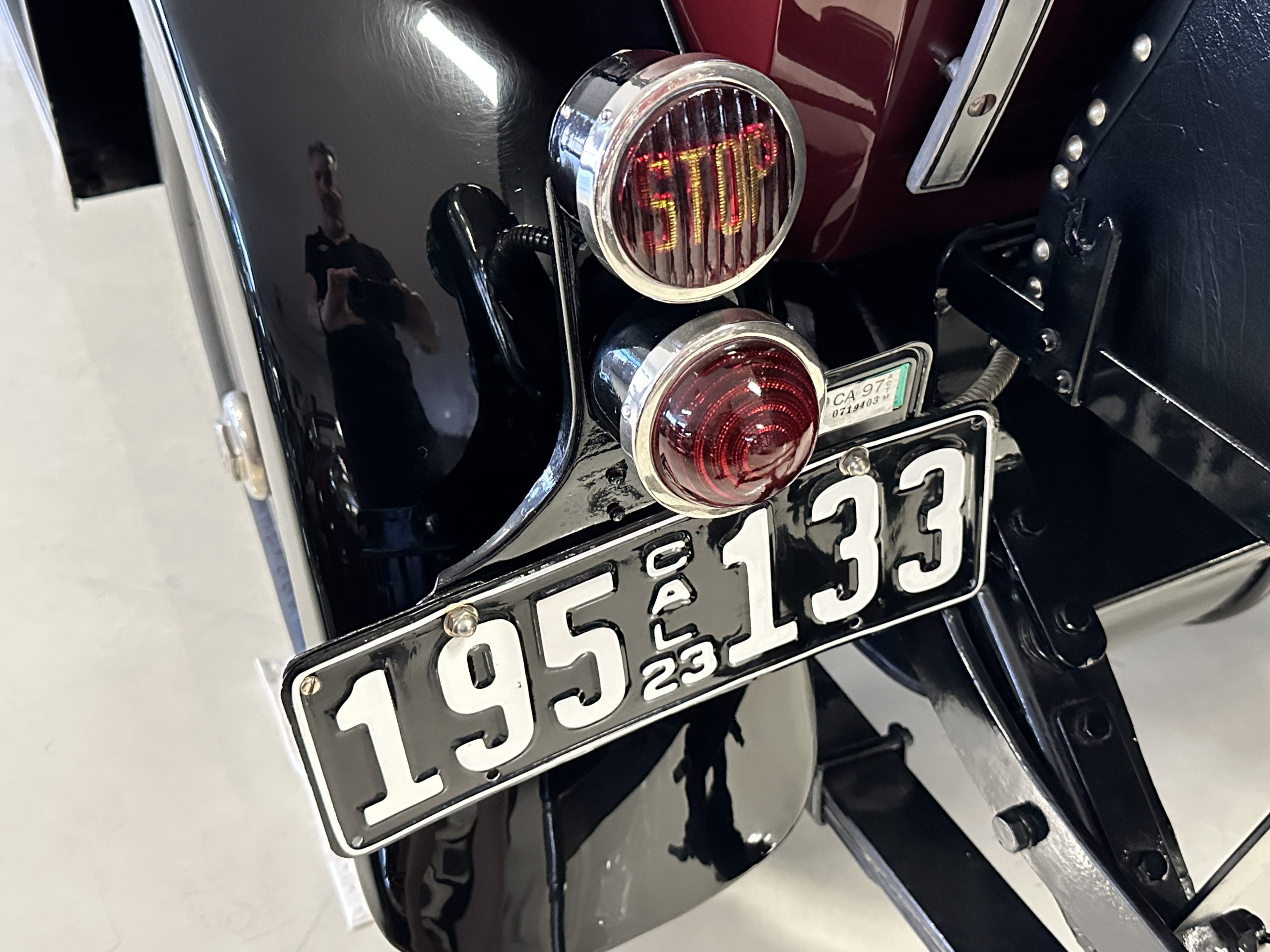 The livery is gorgeous in Burgundy and Black two tone with a black canvas convertible top. The paint is still in very nice show condition consistent with 250 miles added since being restored. The black canvas convertible top is as new and featured a beveled oval rear window. The 24-inch wooden artillery wheels look new. The gorgeous, sculptured chrome grill with its locking Motometer and headlights are in show condition as well. The Paige featured many accessories, such as the double shock absorbing bumpers, cast aluminum windshield frames, dual side mounted spares and a beautifully designed cut curved area for the rear trunk. This Paige has a fully restored trunk that is a showstopper. The tinted external sun visor is a very practical feature that we benefitted from here in the Arizona sun. Overall, this Paige is still quite a show car and is well detailed throughout.