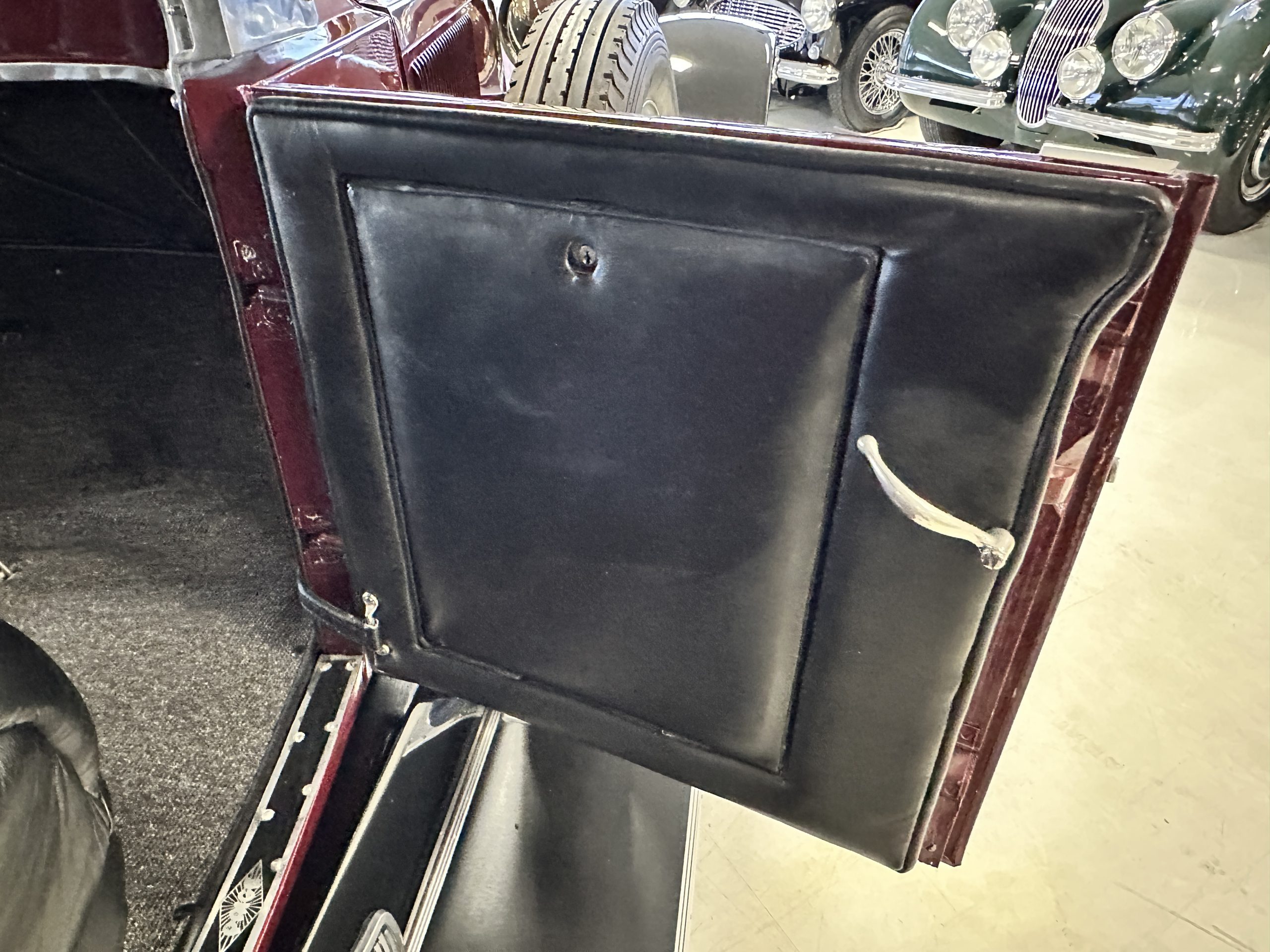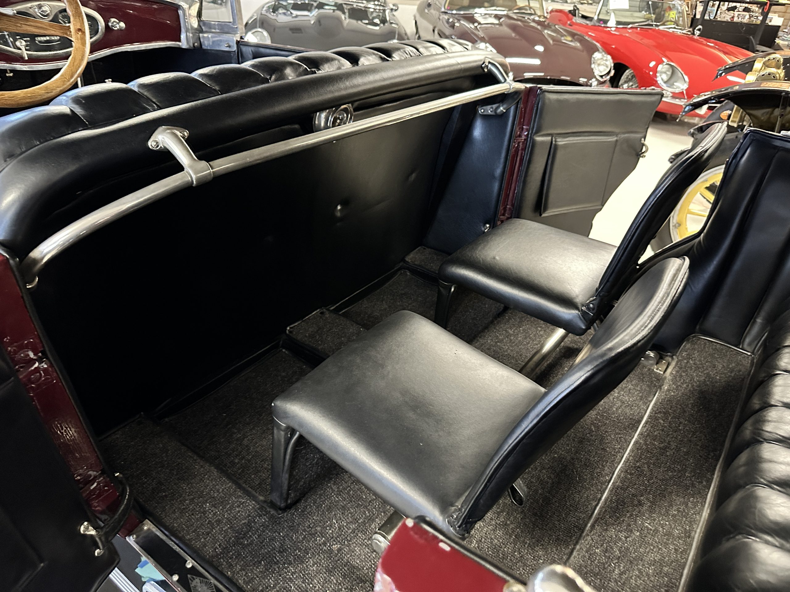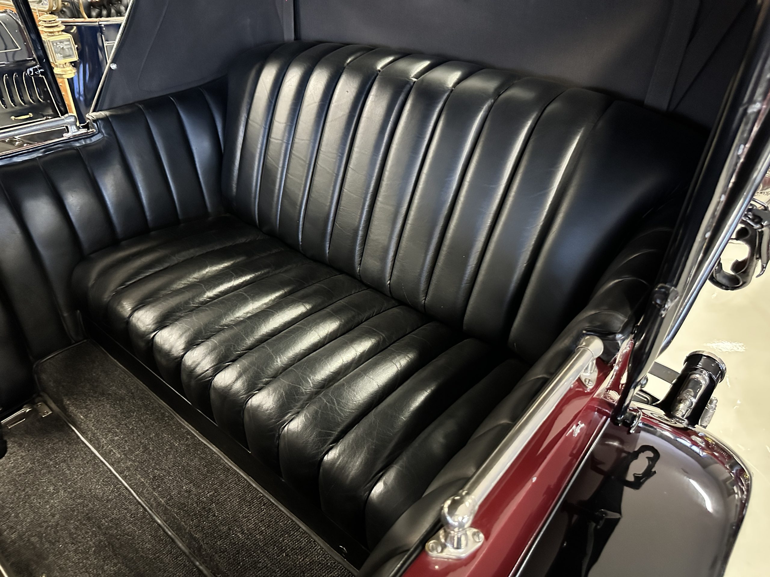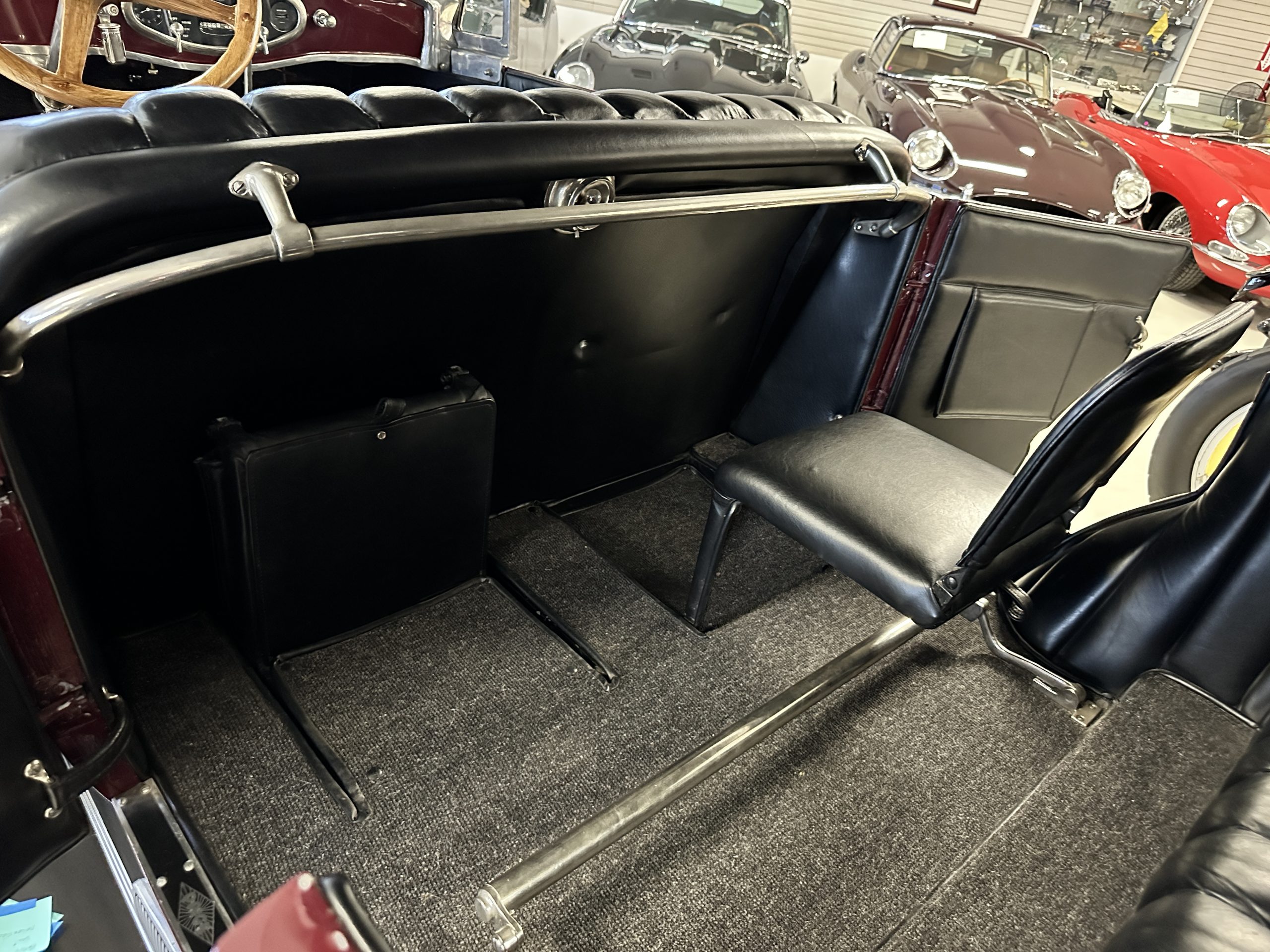 The Black pleated leather interior is excellent and shows as new. The leather is soft and supple. The two jump seats in the rear compartment allow for a total of seven adults to ride in comfort. The dashboard is also cast aluminum that is painted, and all of the instruments are integrated into the center of the dash under one glass unit, an advanced design. The steering wheel is the correct all wood wheel that feels nice in your hands. The dark gray wool carpeting is also as new and looks terrific. All of the lighting and instruments function well.