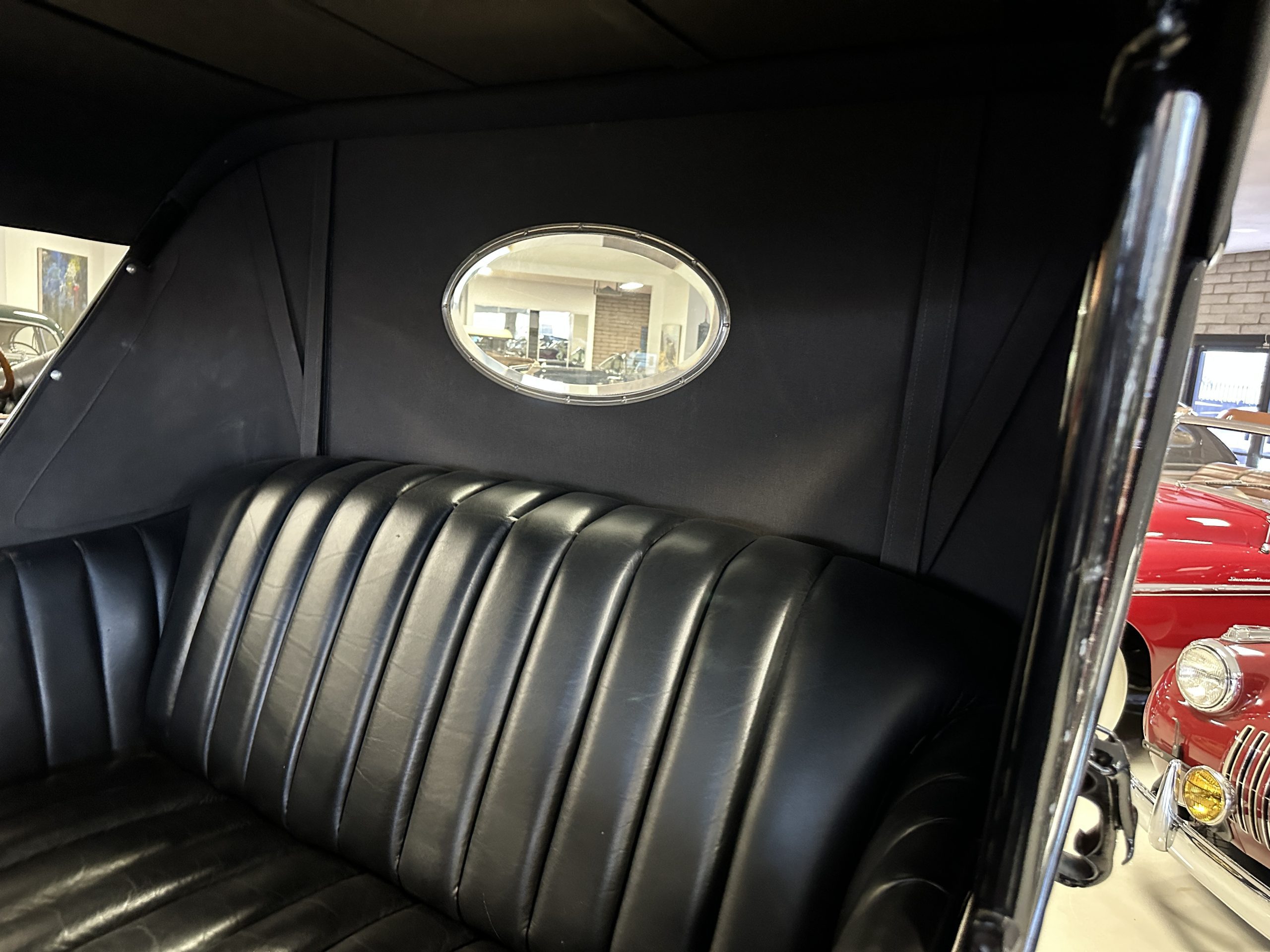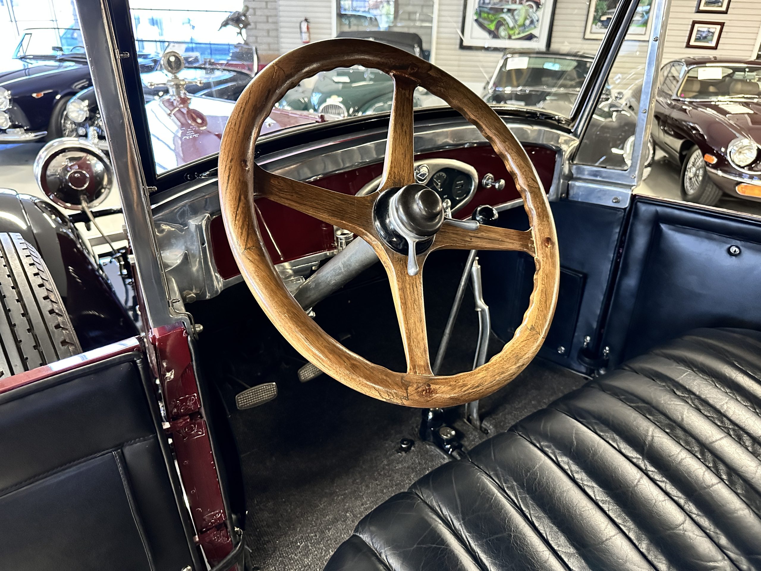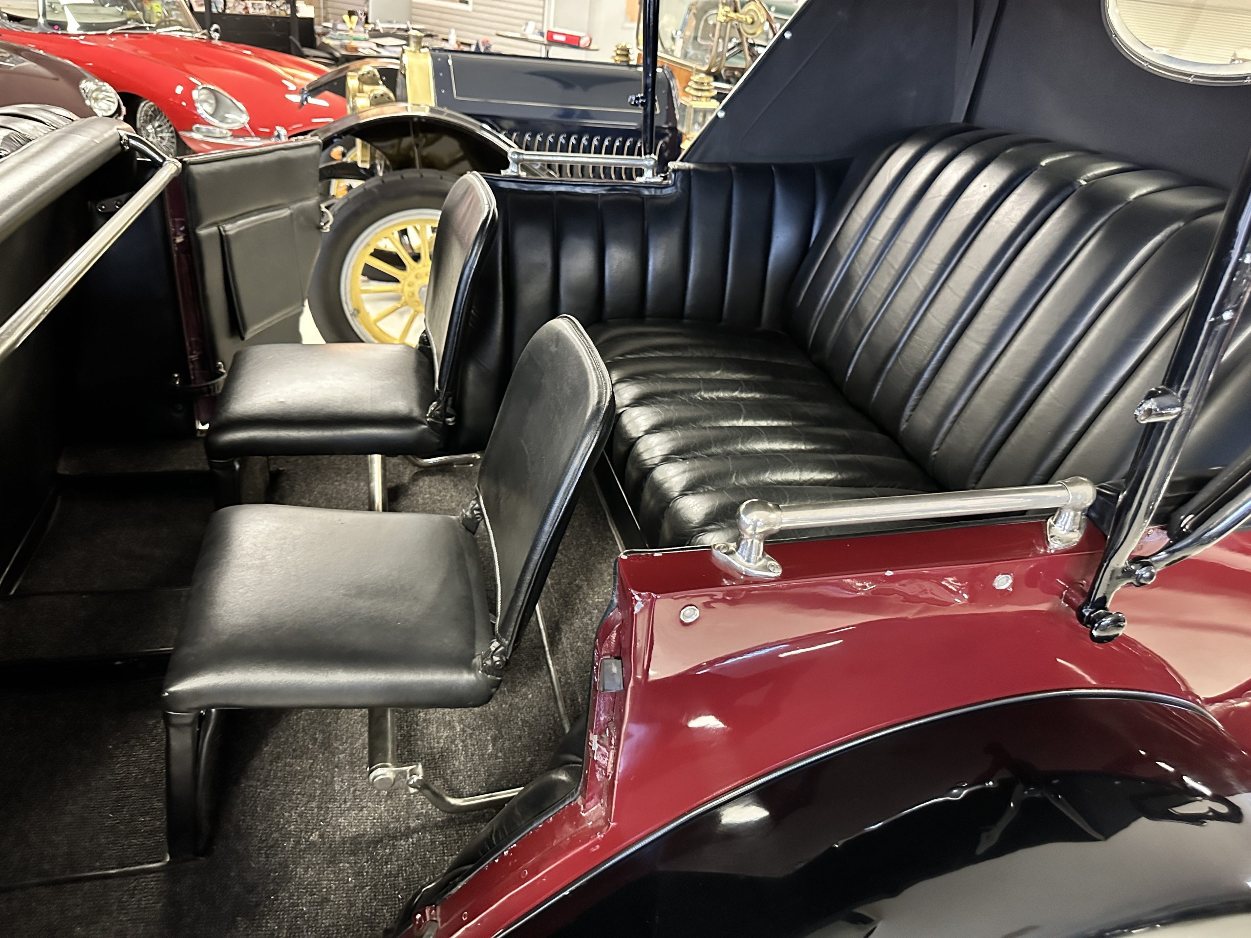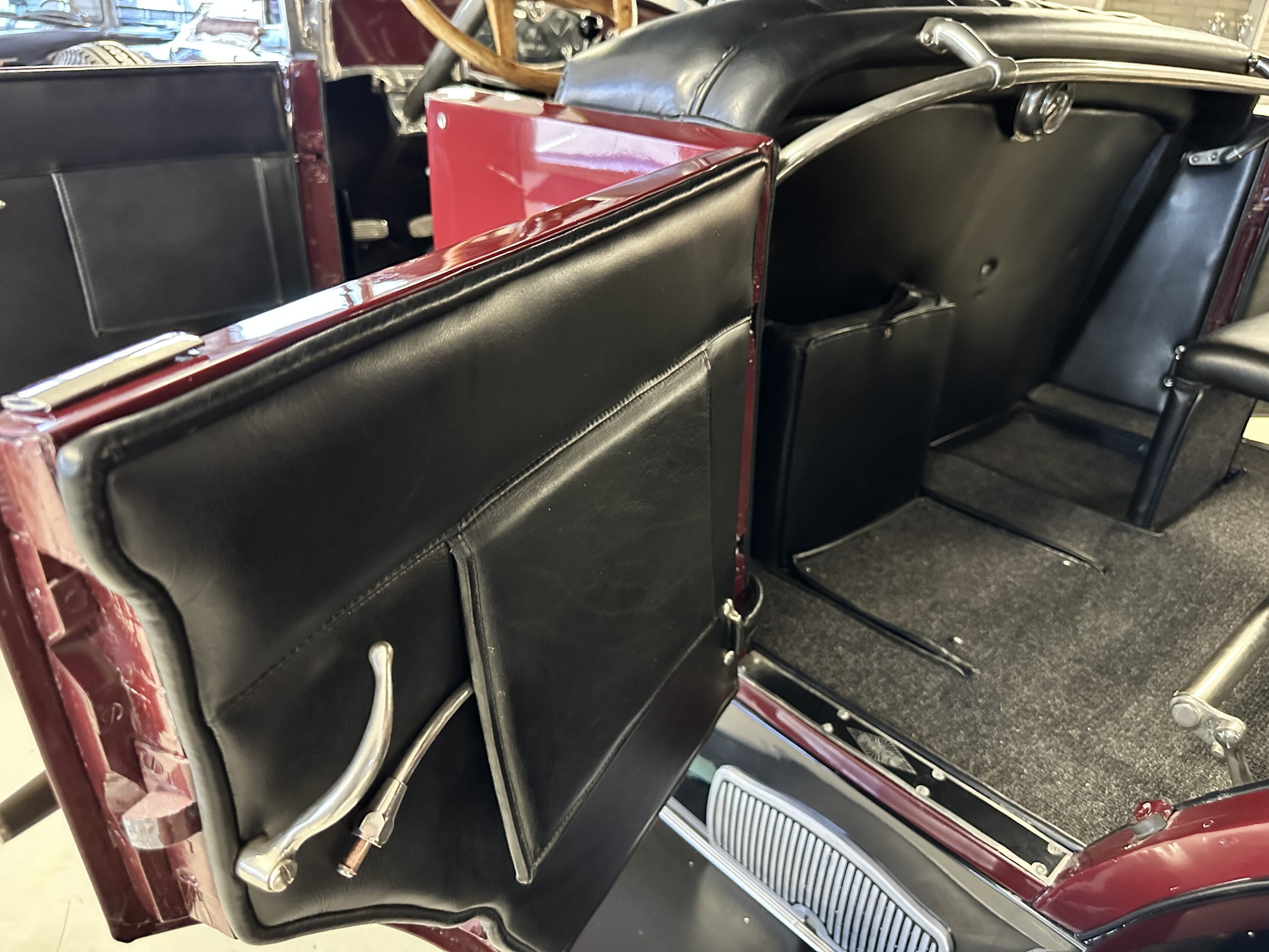The Black pleated leather interior is excellent and shows as new. The leather is soft and supple. The two jump seats in the rear compartment allow for a total of seven adults to ride in comfort. The dashboard is also cast aluminum that is painted, and all of the instruments are integrated into the center of the dash under one glass unit, an advanced design. The steering wheel is the correct all wood wheel that feels nice in your hands. The dark gray wool carpeting is also as new and looks terrific. All of the lighting and instruments function well.