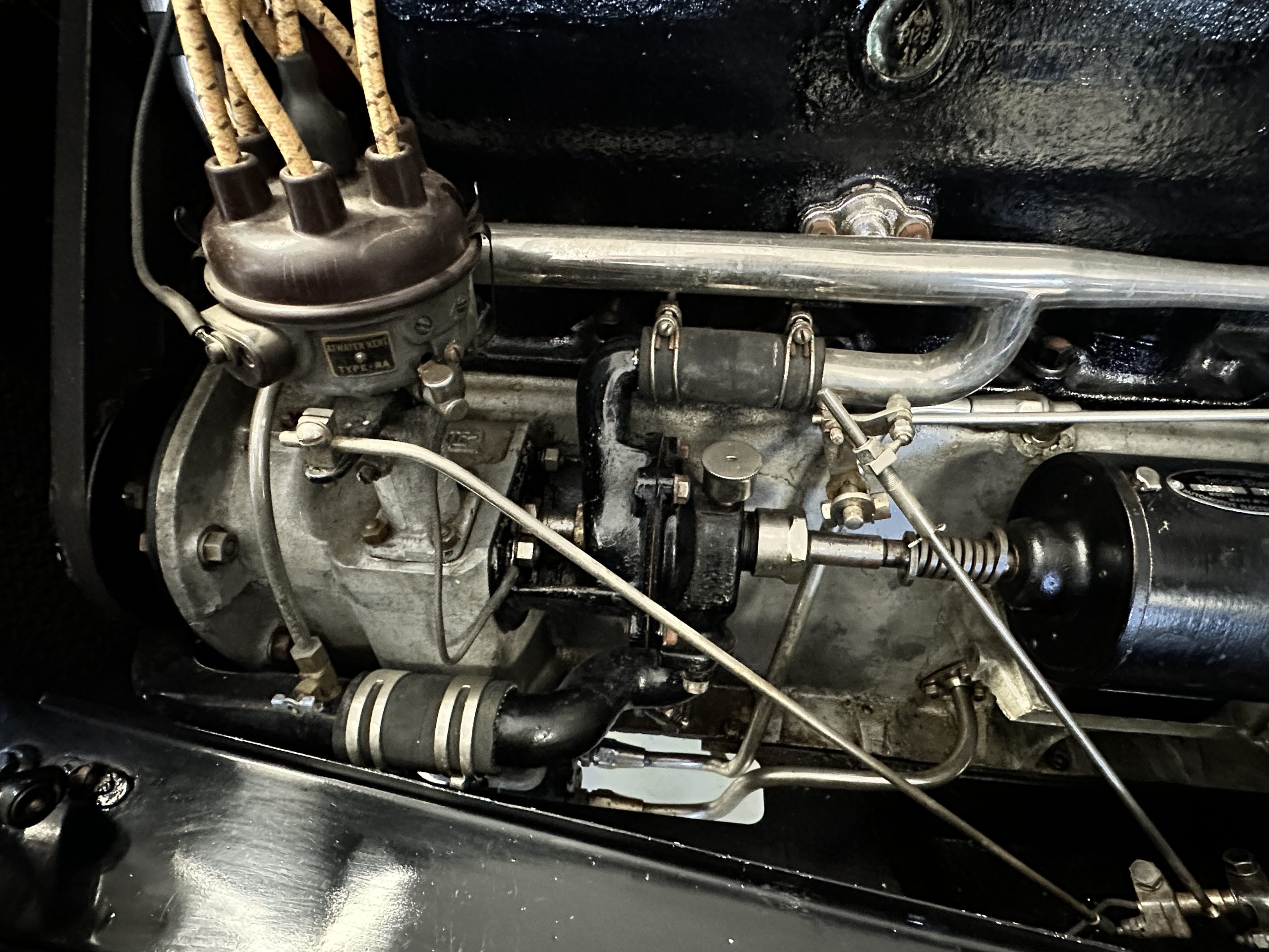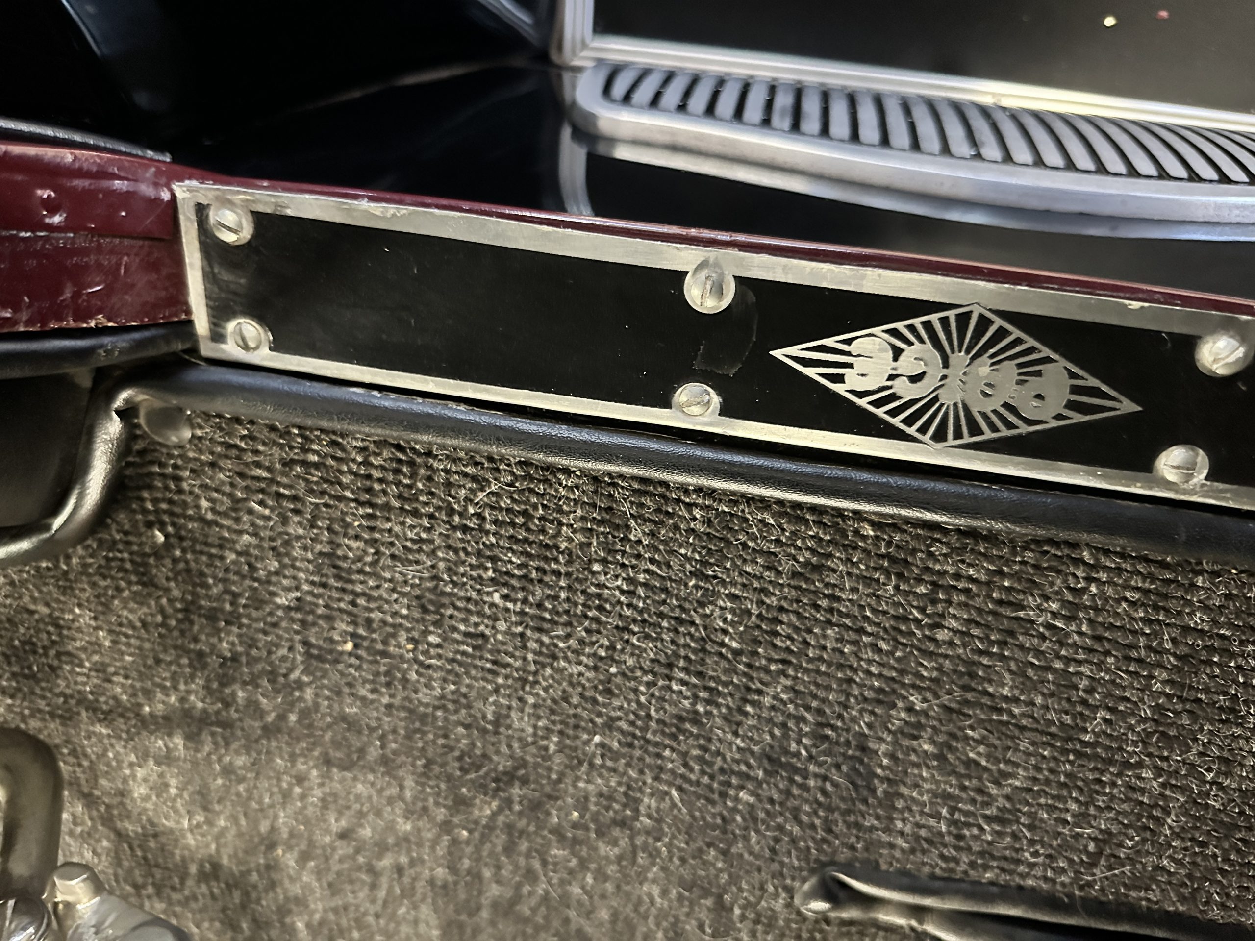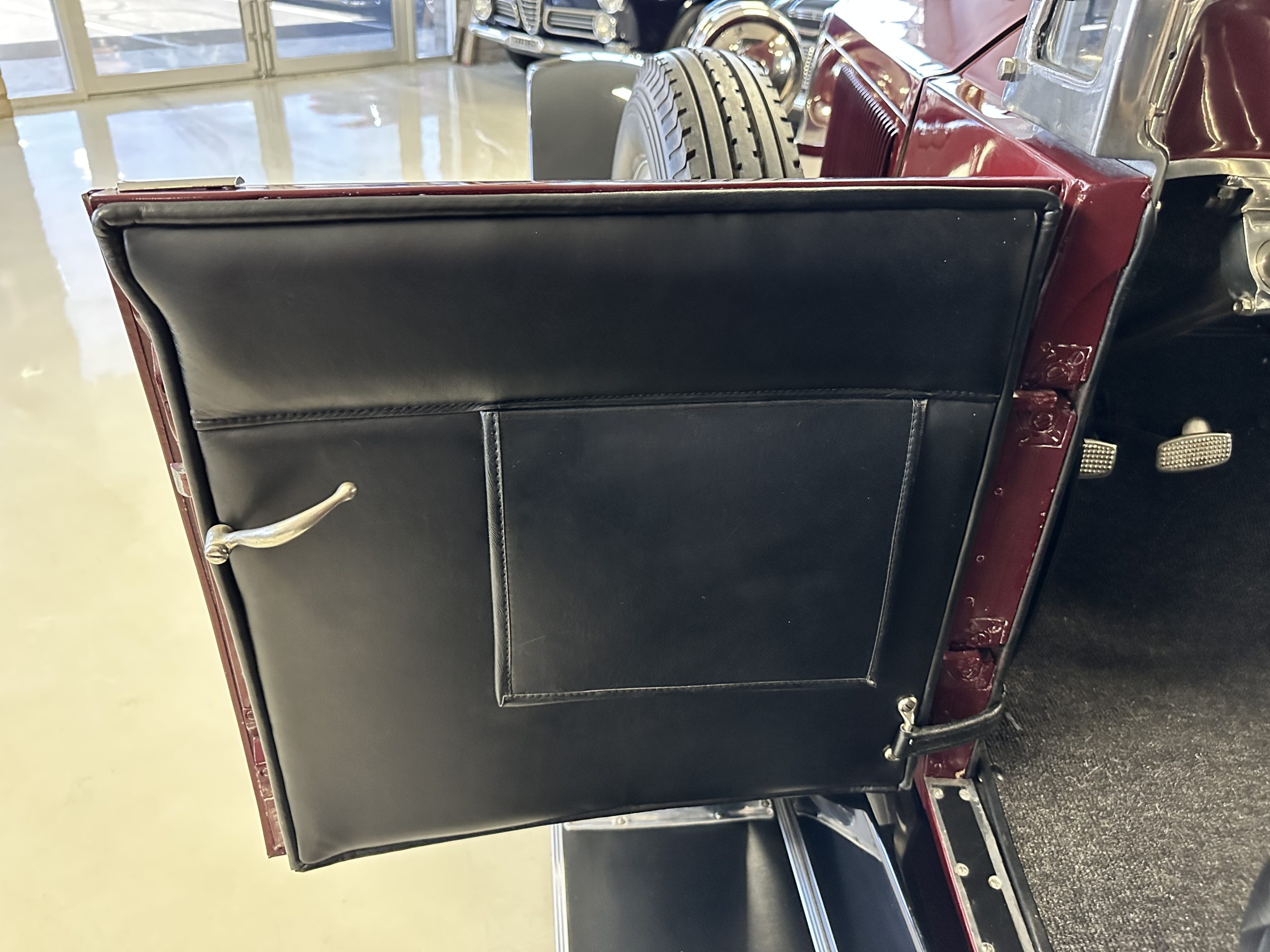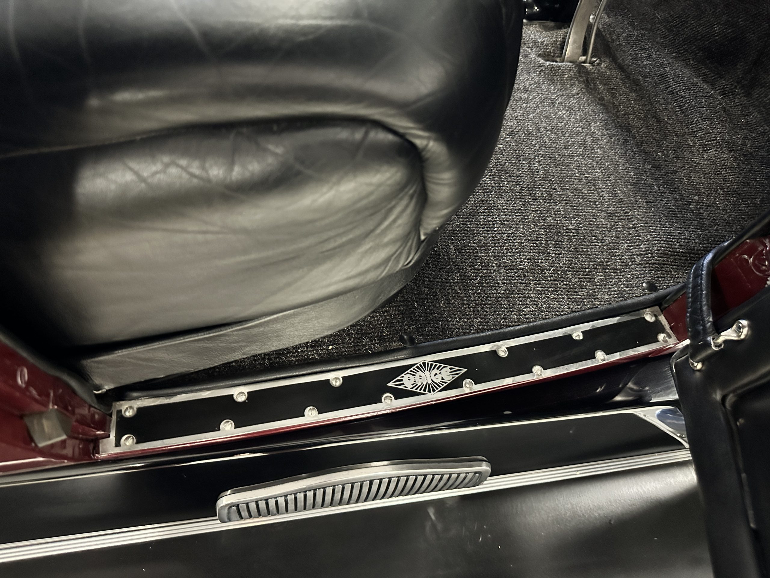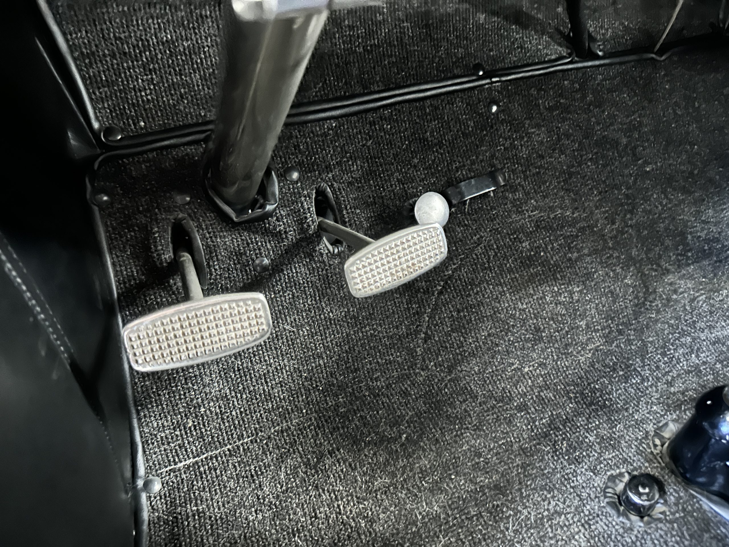 The Black pleated leather interior is excellent and shows as new. The leather is soft and supple. The two jump seats in the rear compartment allow for a total of seven adults to ride in comfort. The dashboard is also cast aluminum that is painted, and all of the instruments are integrated into the center of the dash under one glass unit, an advanced design. The steering wheel is the correct all wood wheel that feels nice in your hands. The dark gray wool carpeting is also as new and looks terrific. All of the lighting and instruments function well.