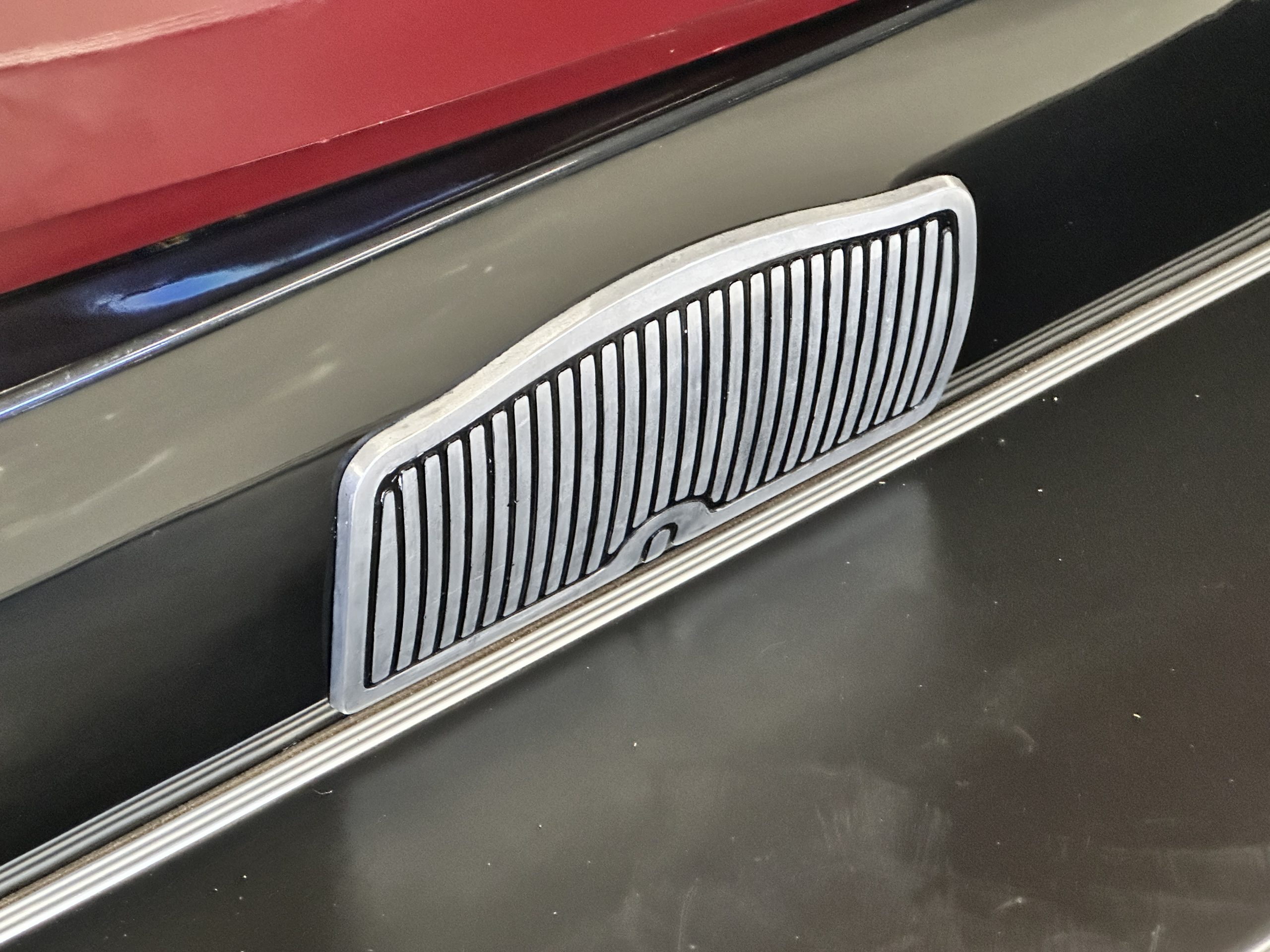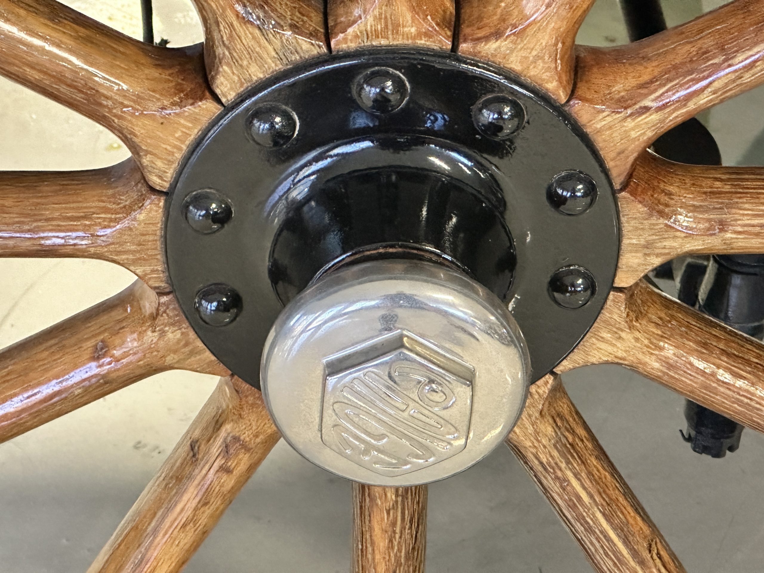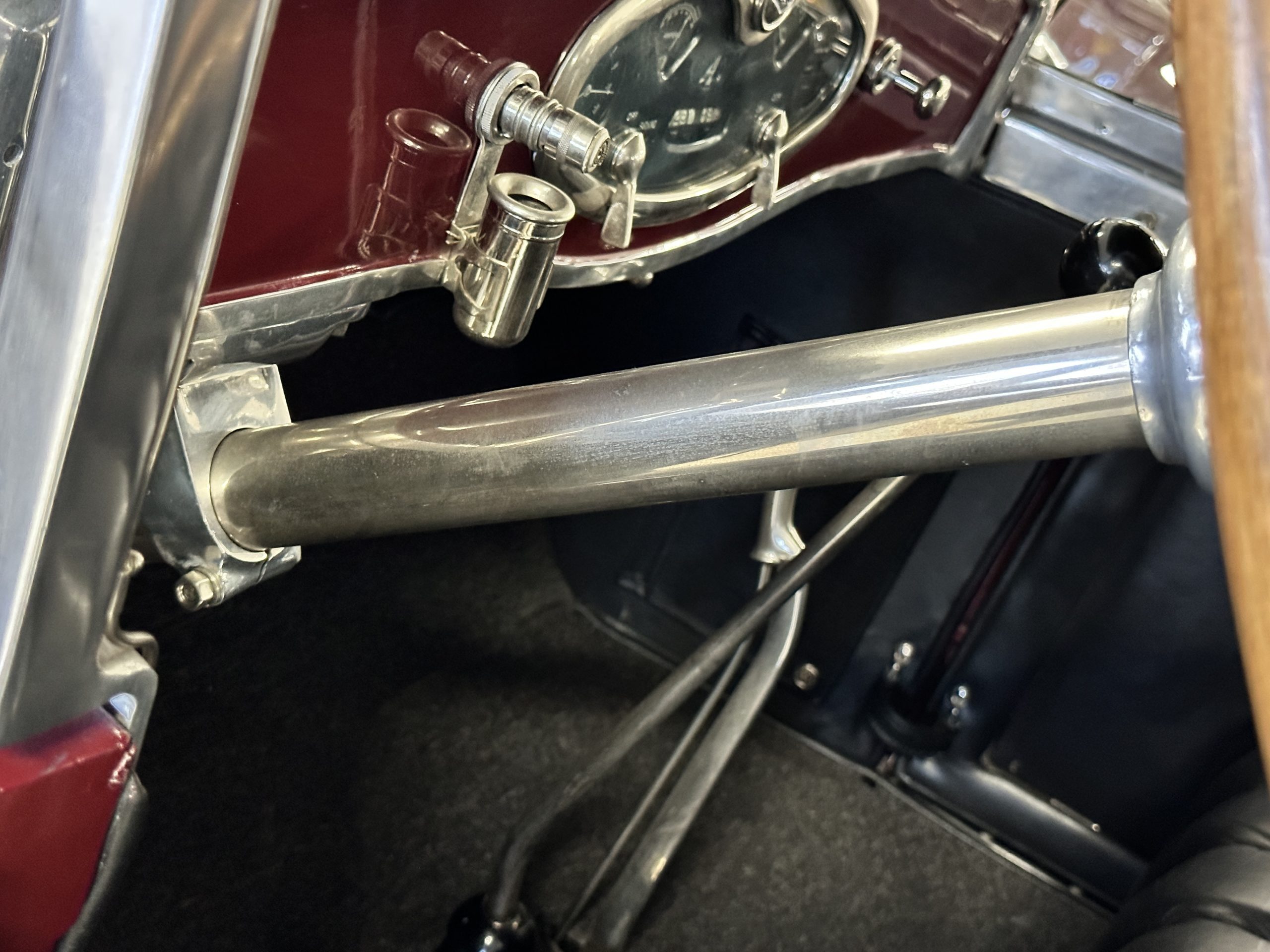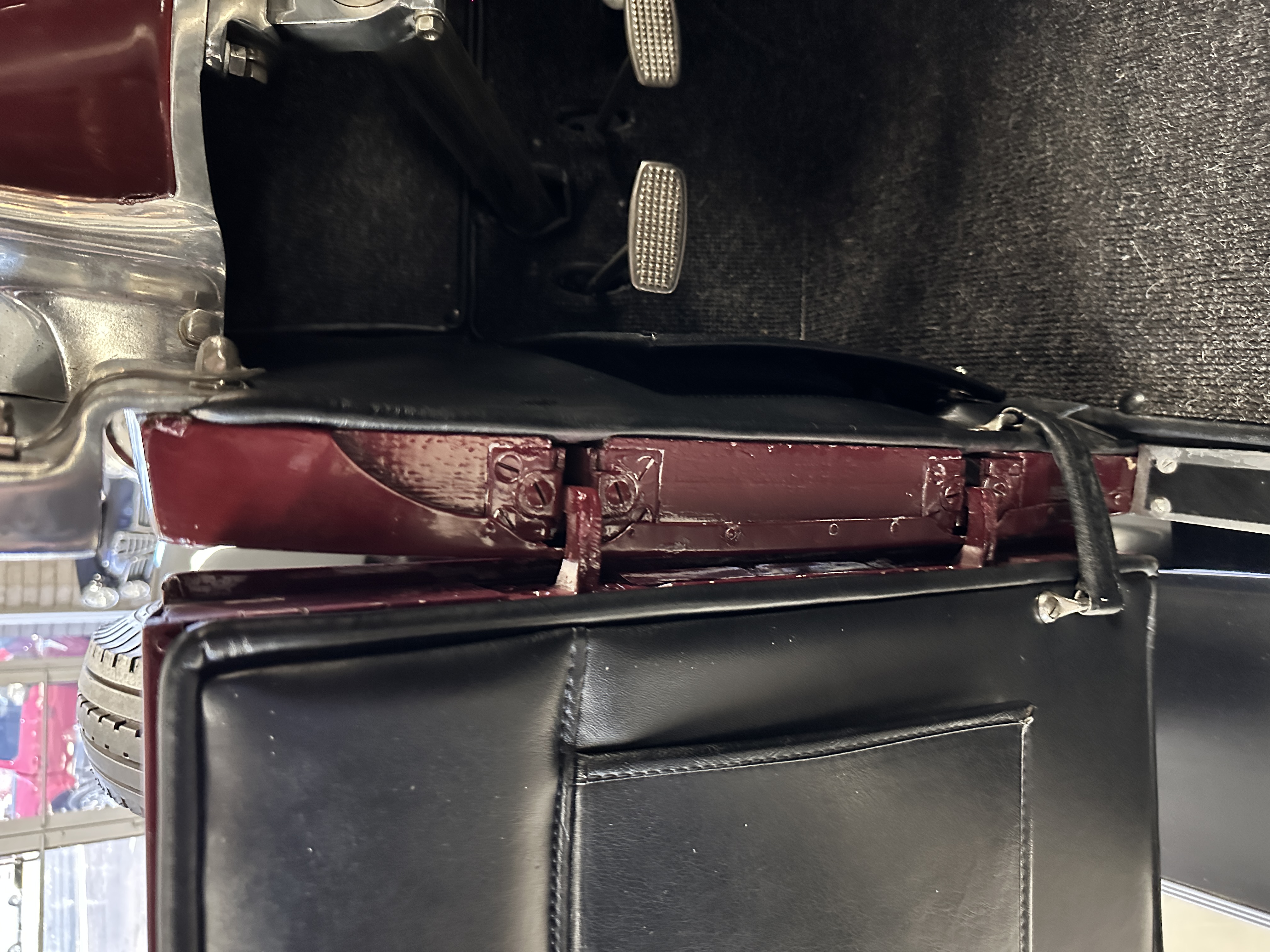 The Black pleated leather interior is excellent and shows as new. The leather is soft and supple. The two jump seats in the rear compartment allow for a total of seven adults to ride in comfort. The dashboard is also cast aluminum that is painted, and all of the instruments are integrated into the center of the dash under one glass unit, an advanced design. The steering wheel is the correct all wood wheel that feels nice in your hands. The dark gray wool carpeting is also as new and looks terrific. All of the lighting and instruments function well.