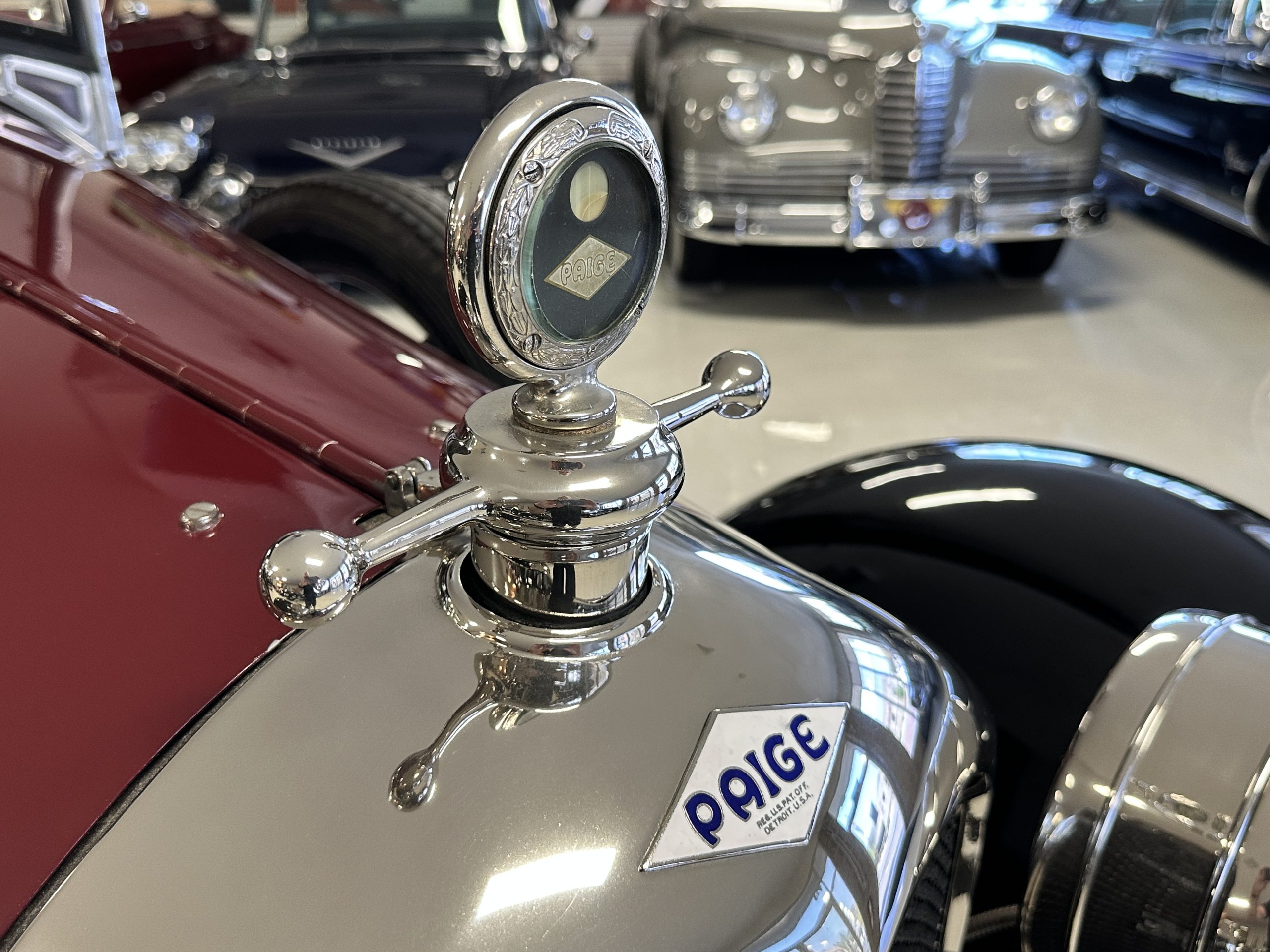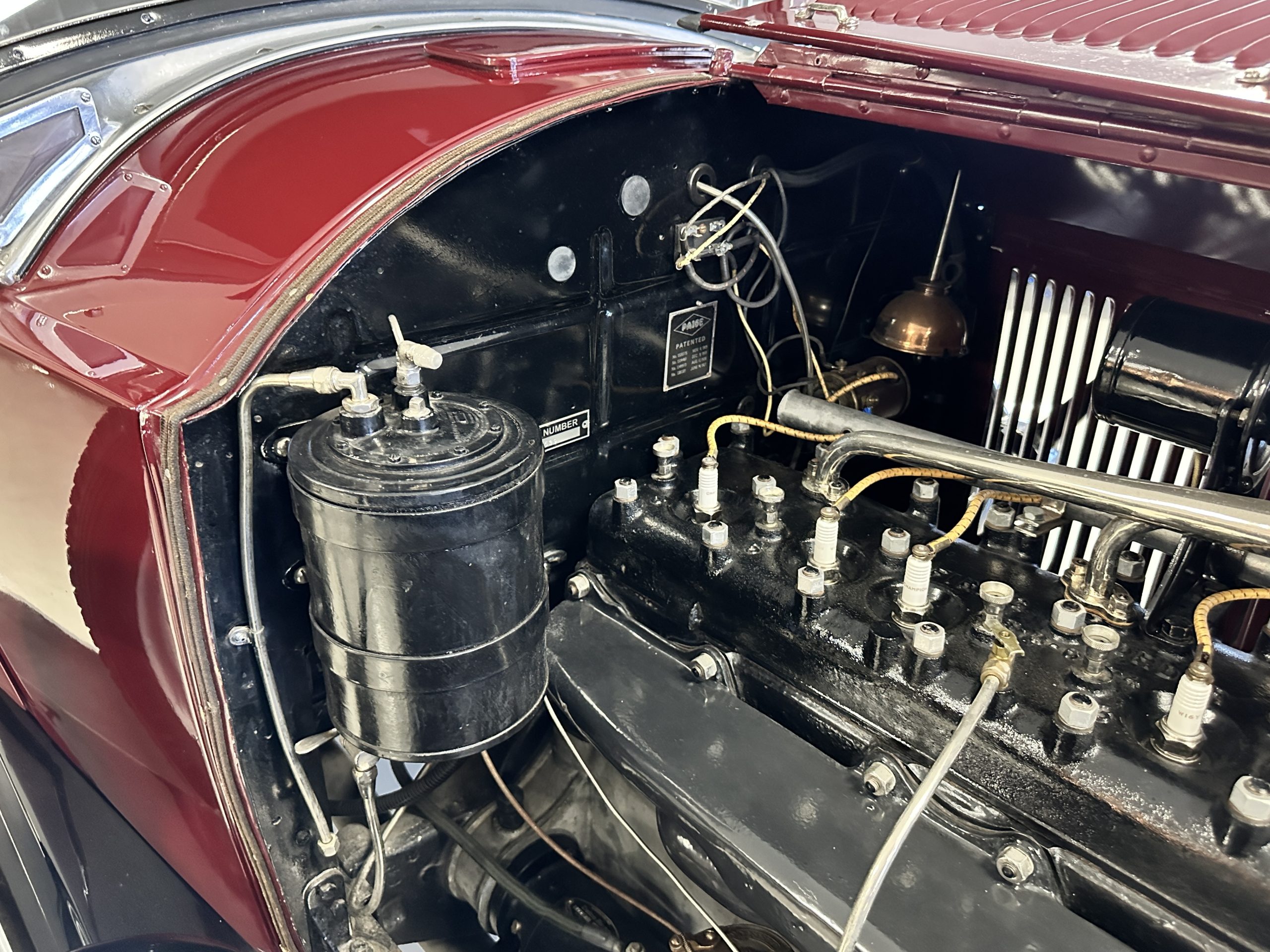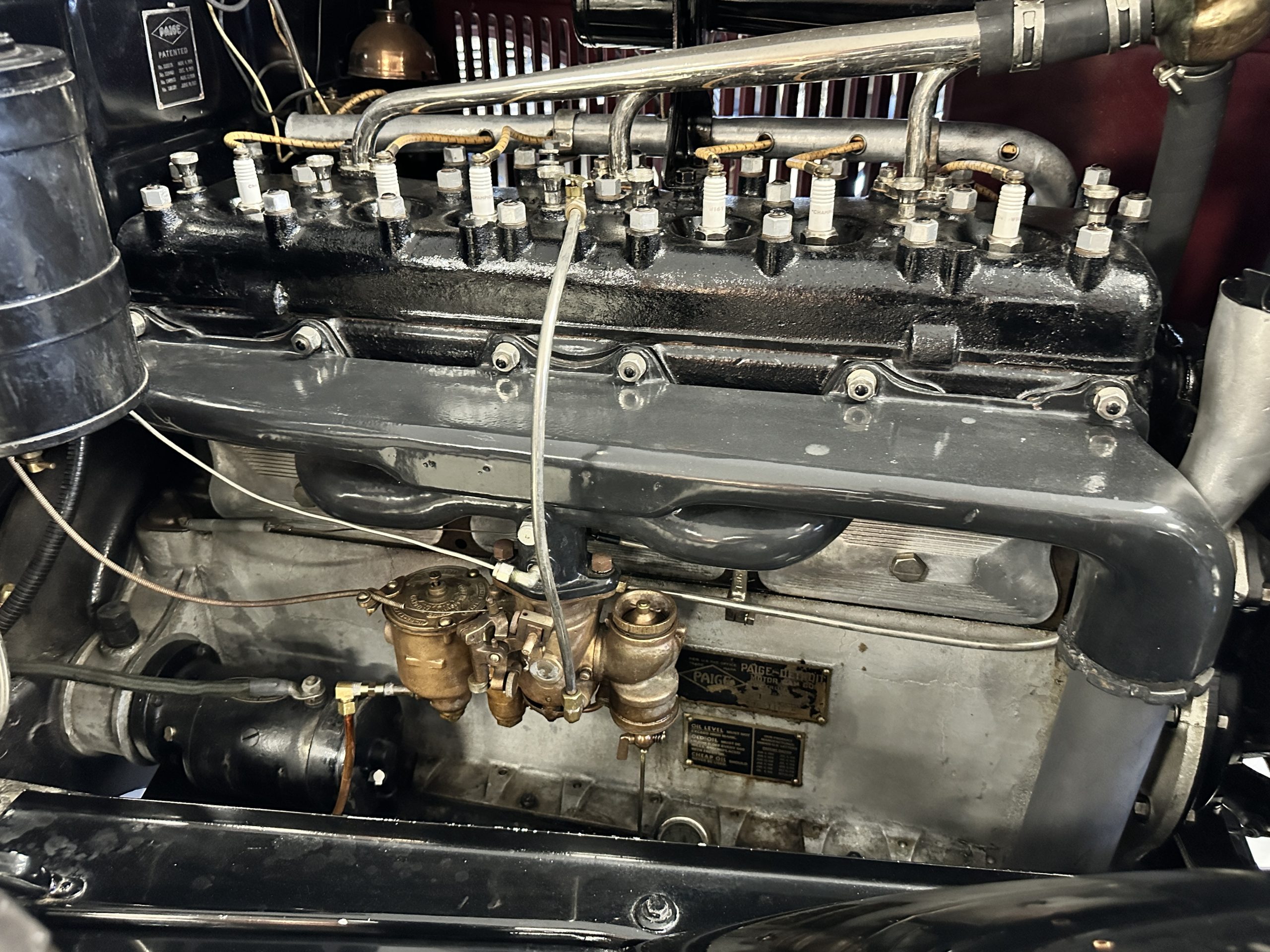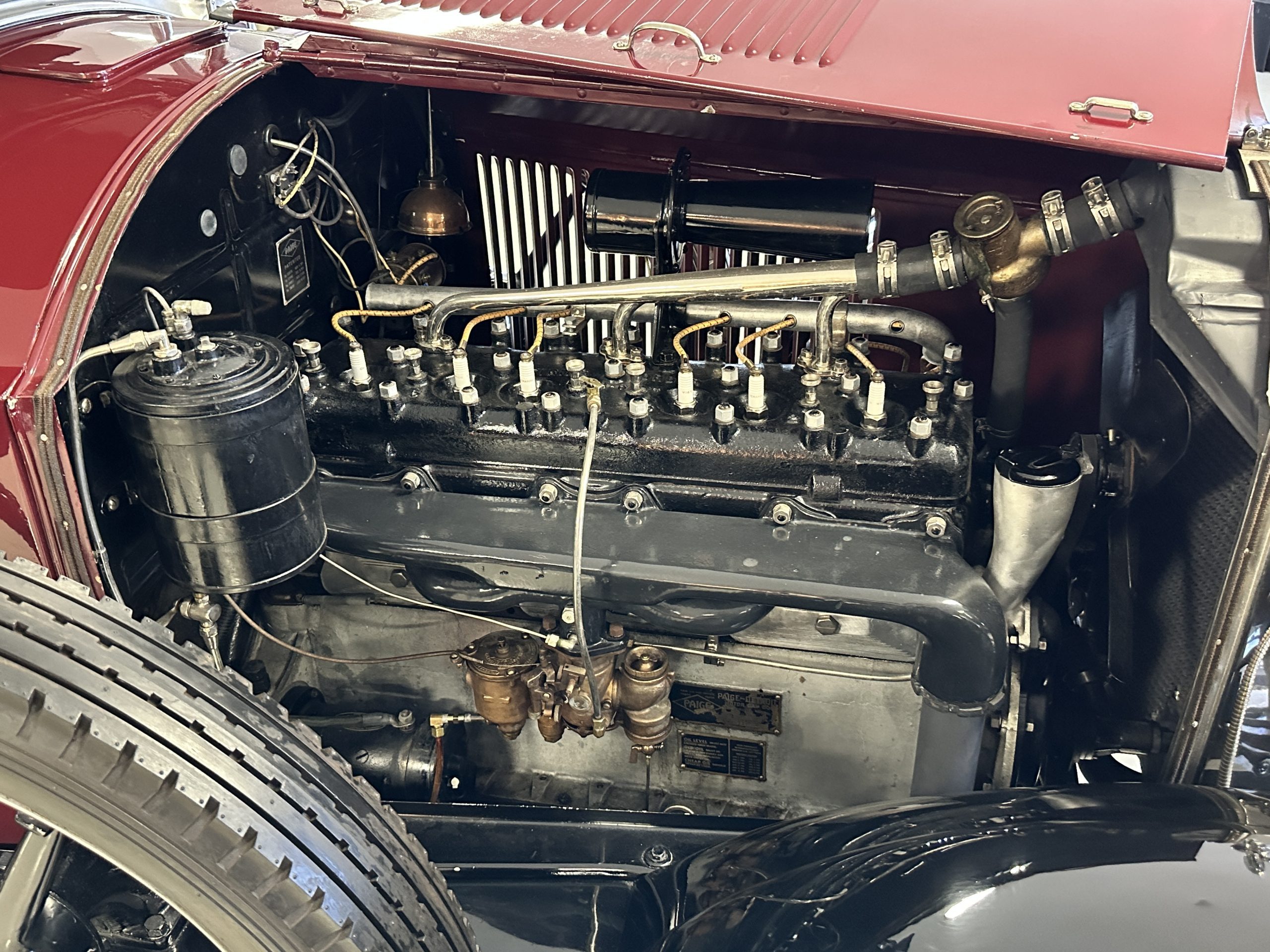 The engine compartment is well detailed and is easily readied for show. Paige was known for setting world speed records and building high performance cars. The matching numbers 331 cid six-cylinder L-head design engine used for the Model 6-70 has an aluminum crankcase and three-speed transmission that shifts easily and smoothly on its 131-inch wheelbase. Paige advertised that there was so much low-end torque that it would allow you to travel from 2mph to 60 mph in top gear. This Paige cruises comfortably at 50 to 60 mph. As with the rest of this Paige, this chassis, suspension and drivetrain have all been completely restored and are in outstanding condition. A result of the 250 miles since restoration, this Paige should be thoroughly lubricated and readied before touring, as it has been shown and held in collections rather than toured in.