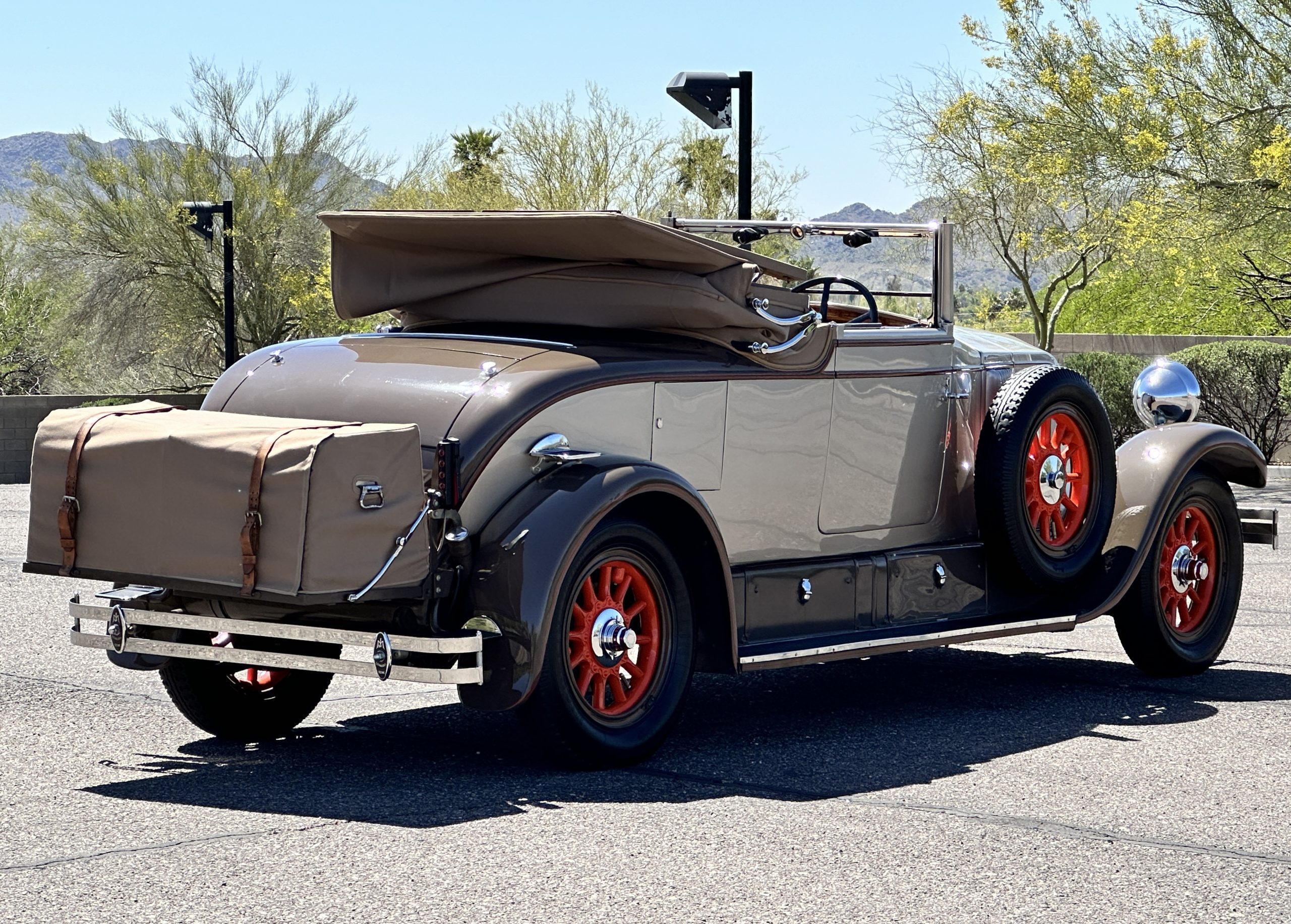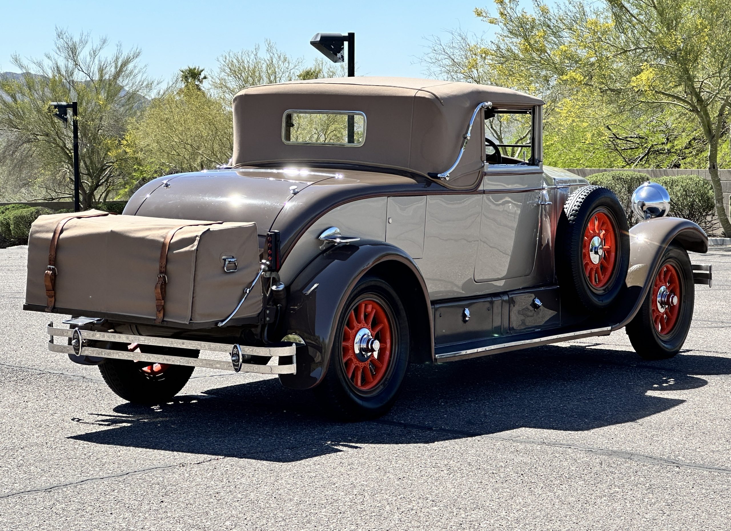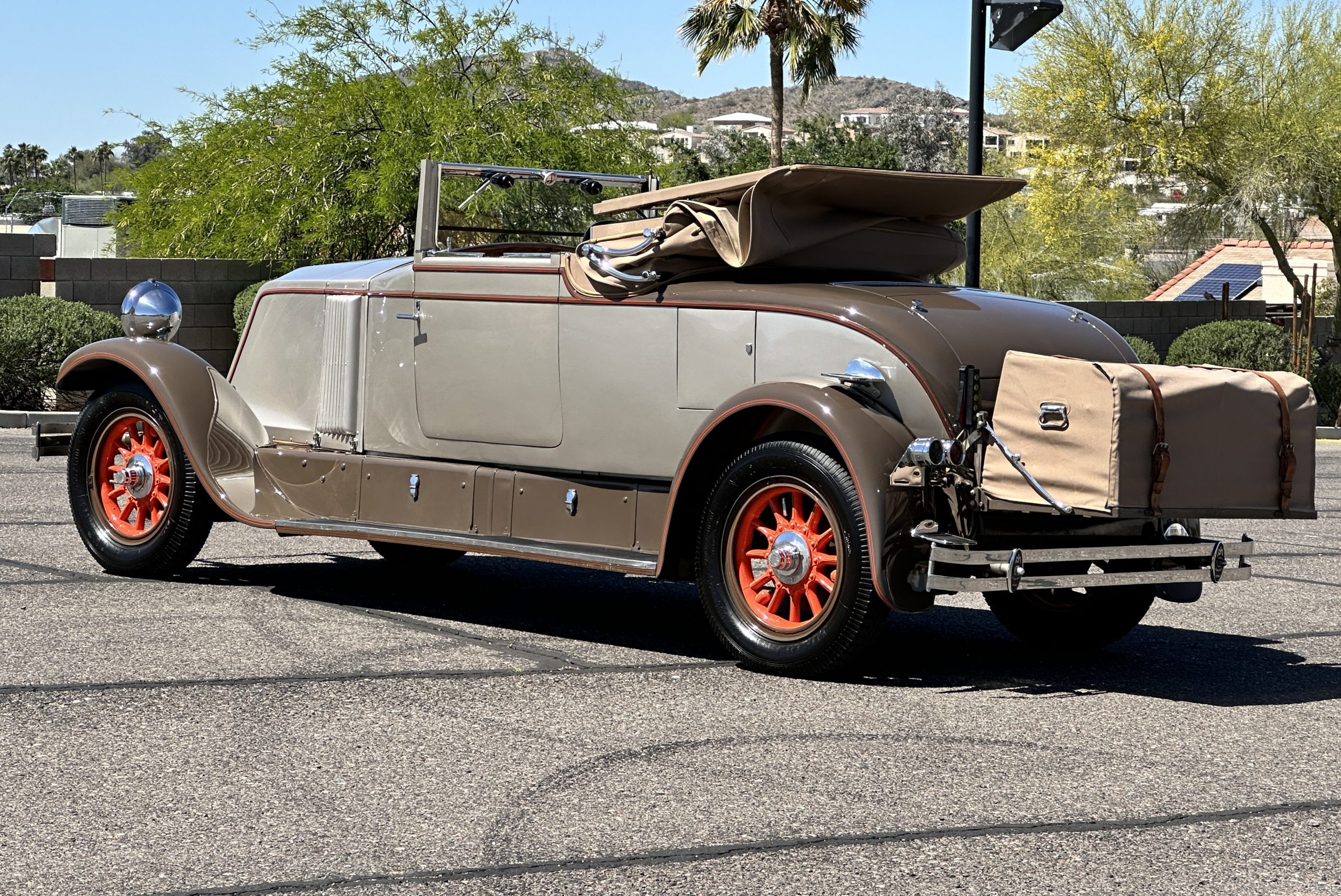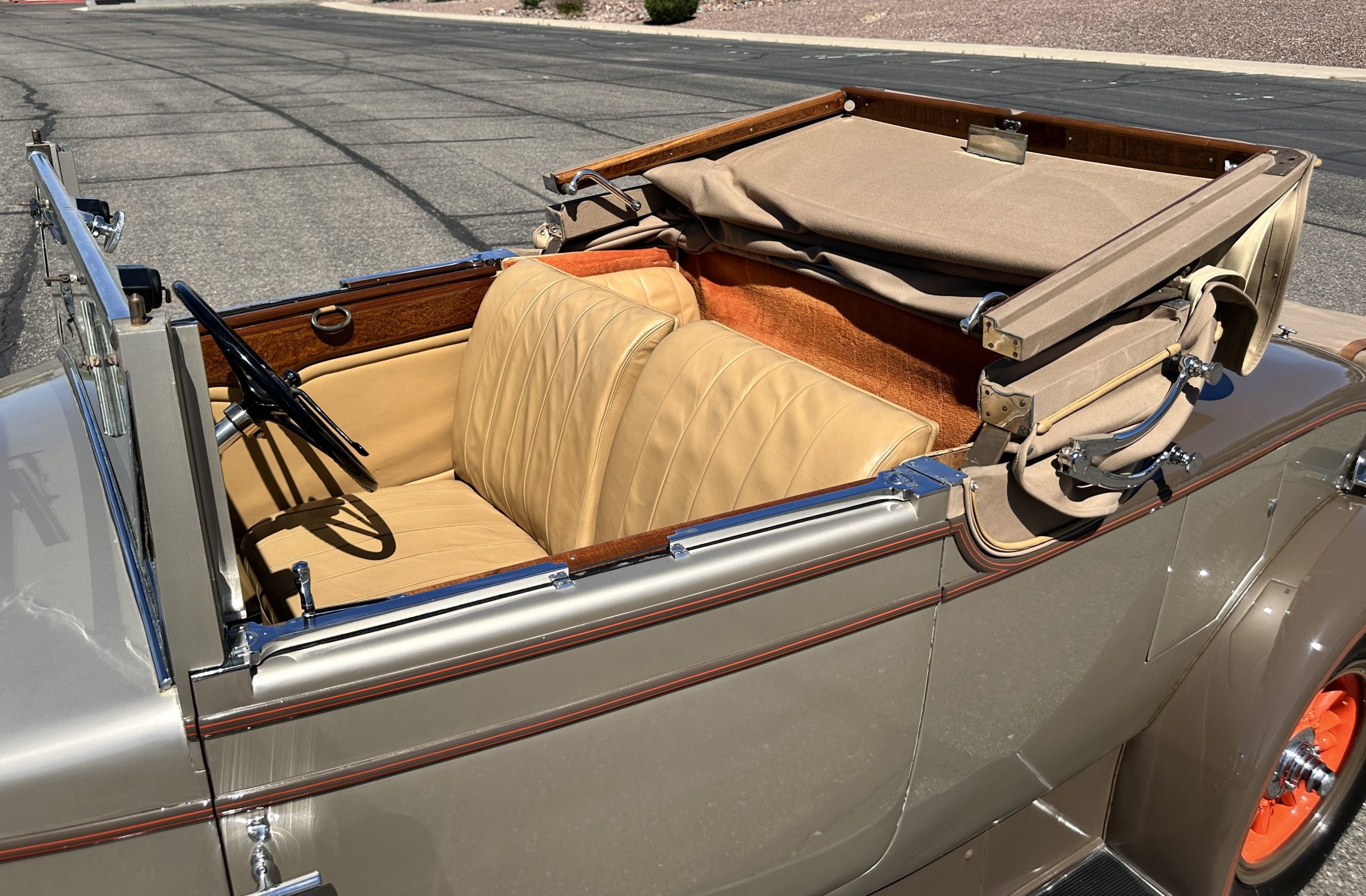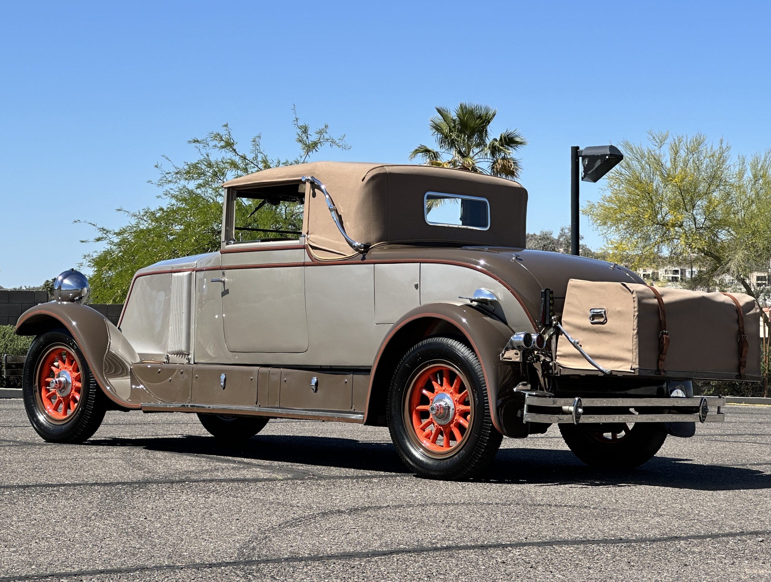 Finished in champagne and brown with orange accents, the car is powered by a 3,181cc L-head inline-six that features a single updraft carburetor, distributor and coil ignition, and a radiator mounted rearward of the engine. Additional features include a four-speed manual transmission, mechanically actuated four-wheel drum brakes with servo assistance, hydraulic shock absorbers, orange-painted wood-spoke wheels, JM bumper shocks, a beige convertible top, tan leather upholstery over three-place seating and a rumble seat, and a rear-mounted luggage trunk with fitted luggage.