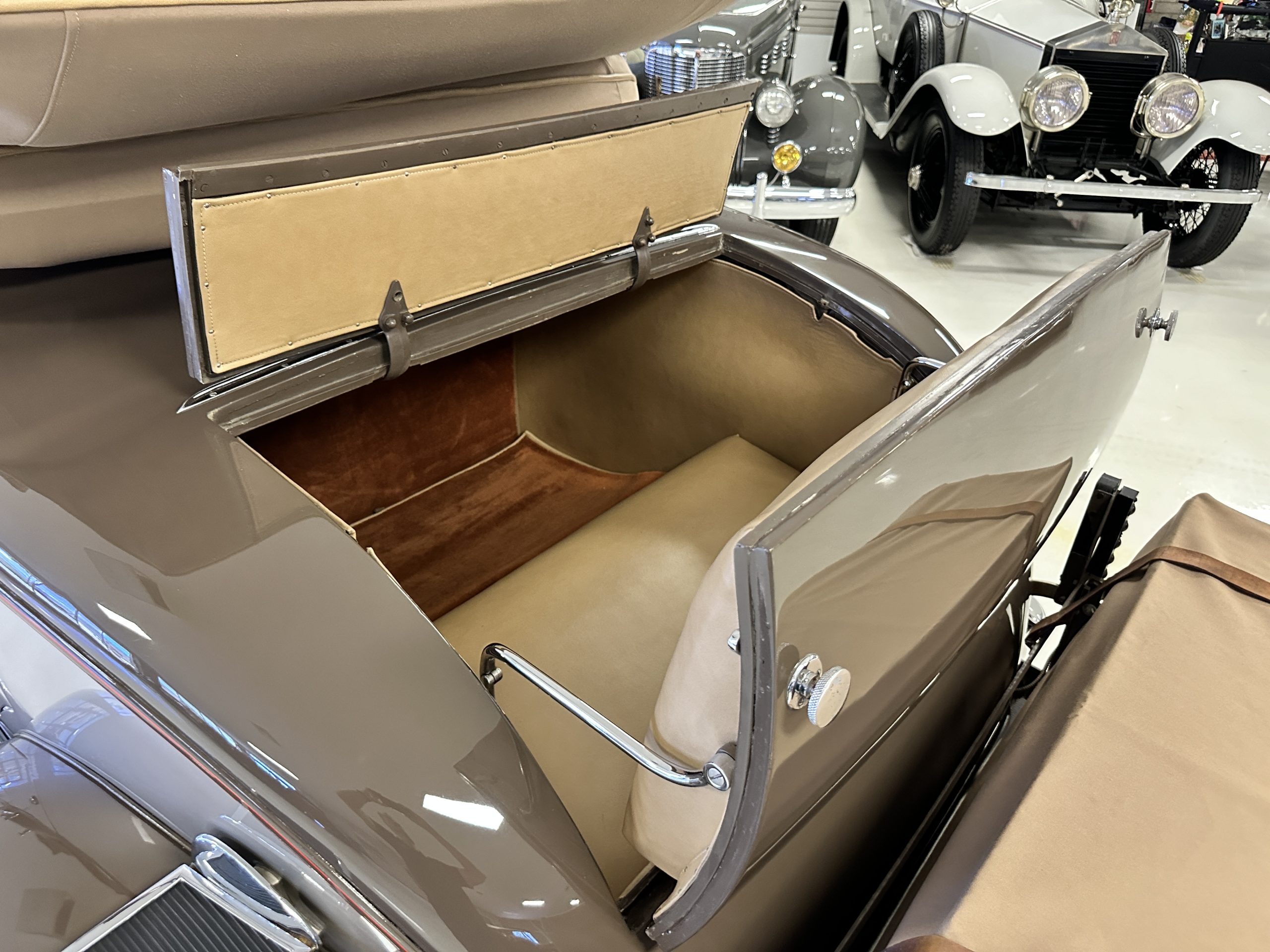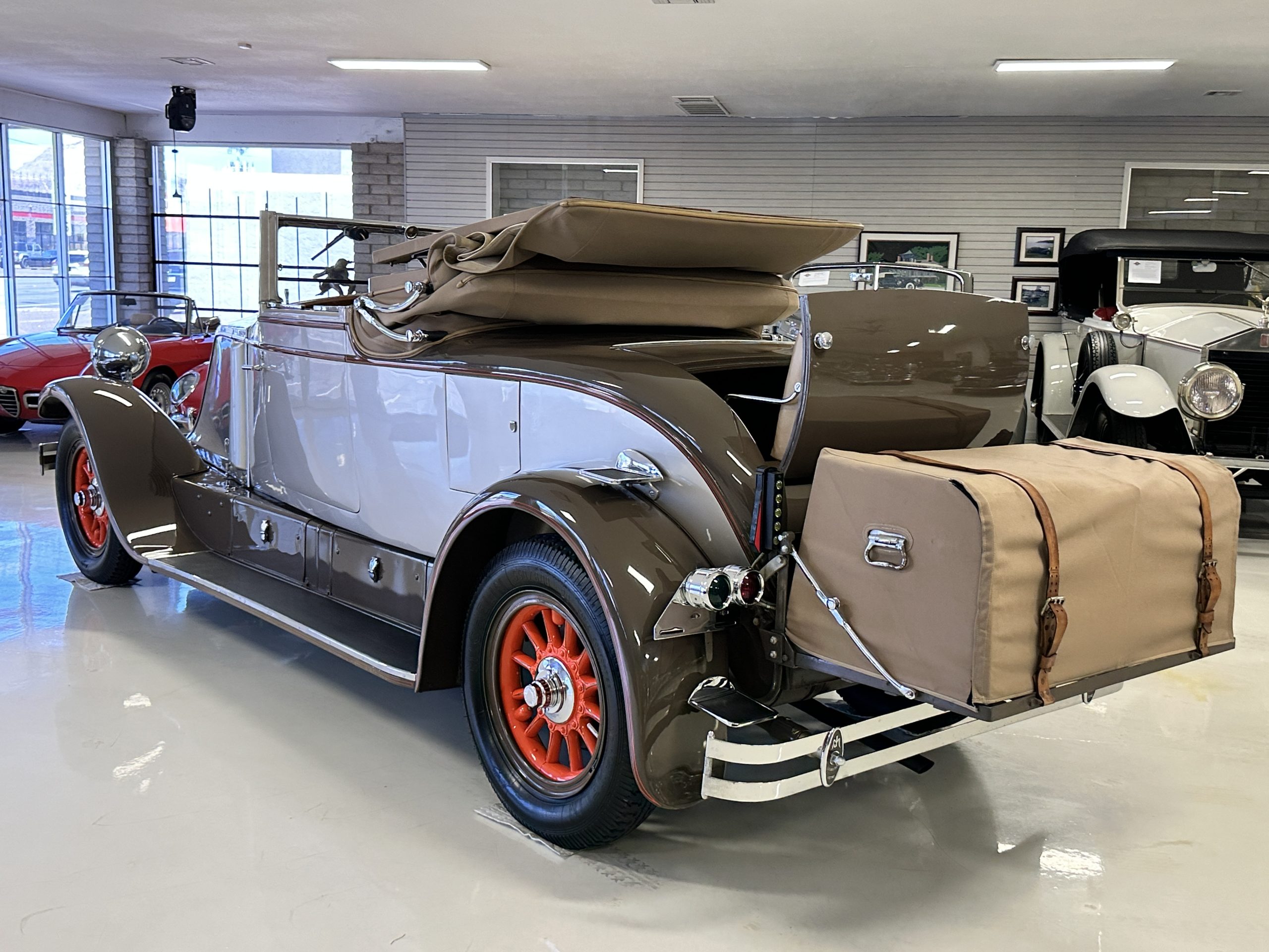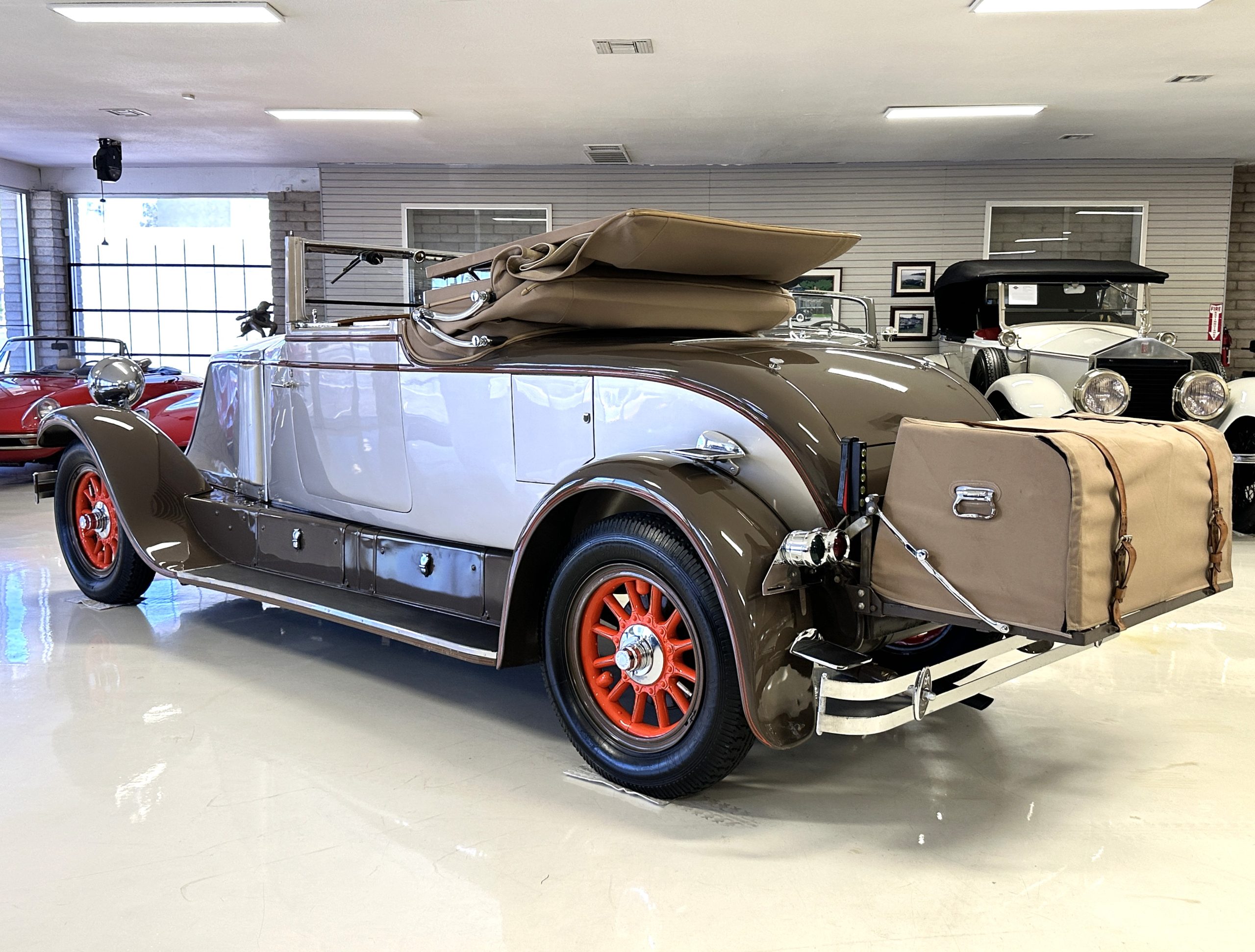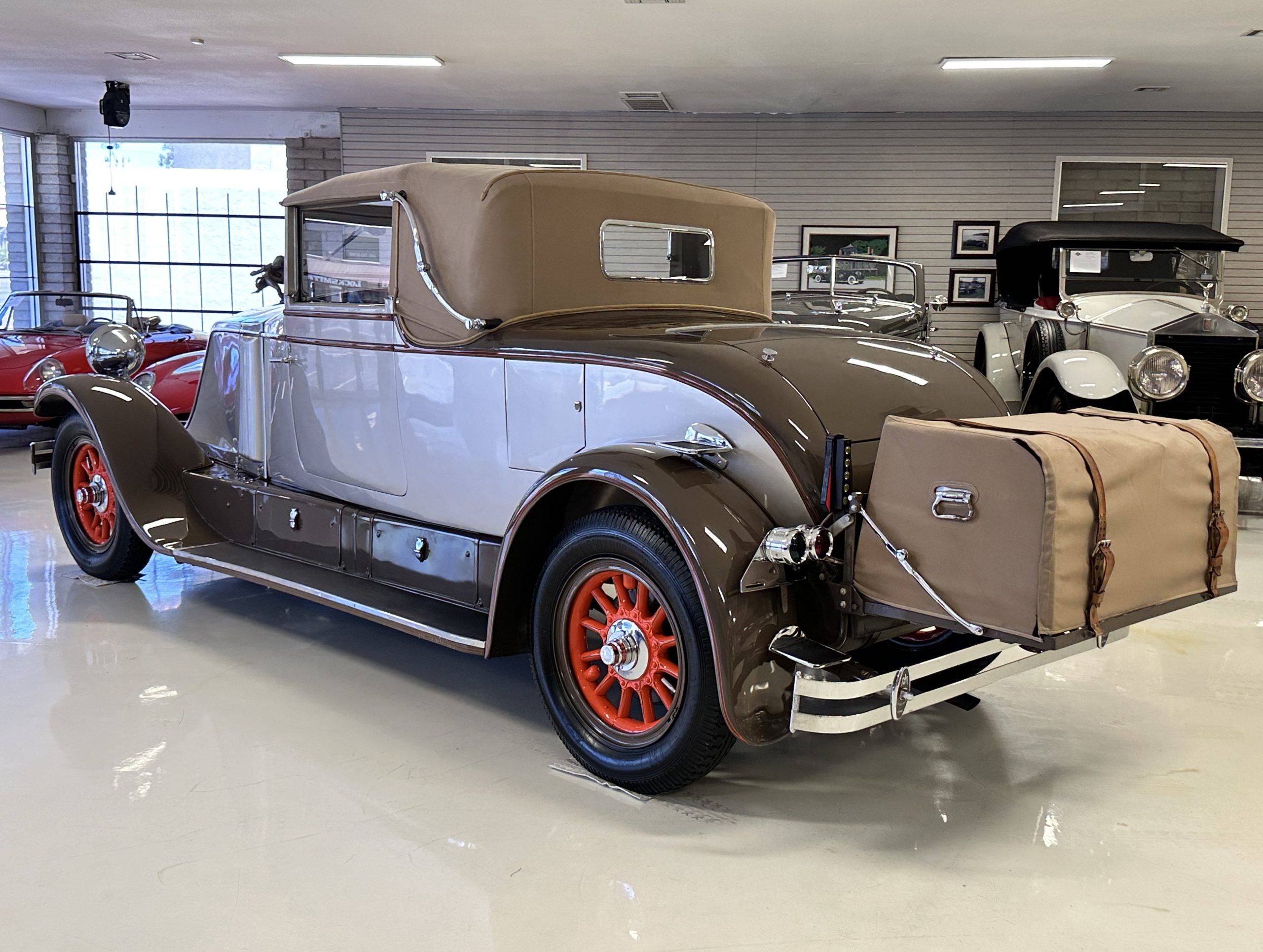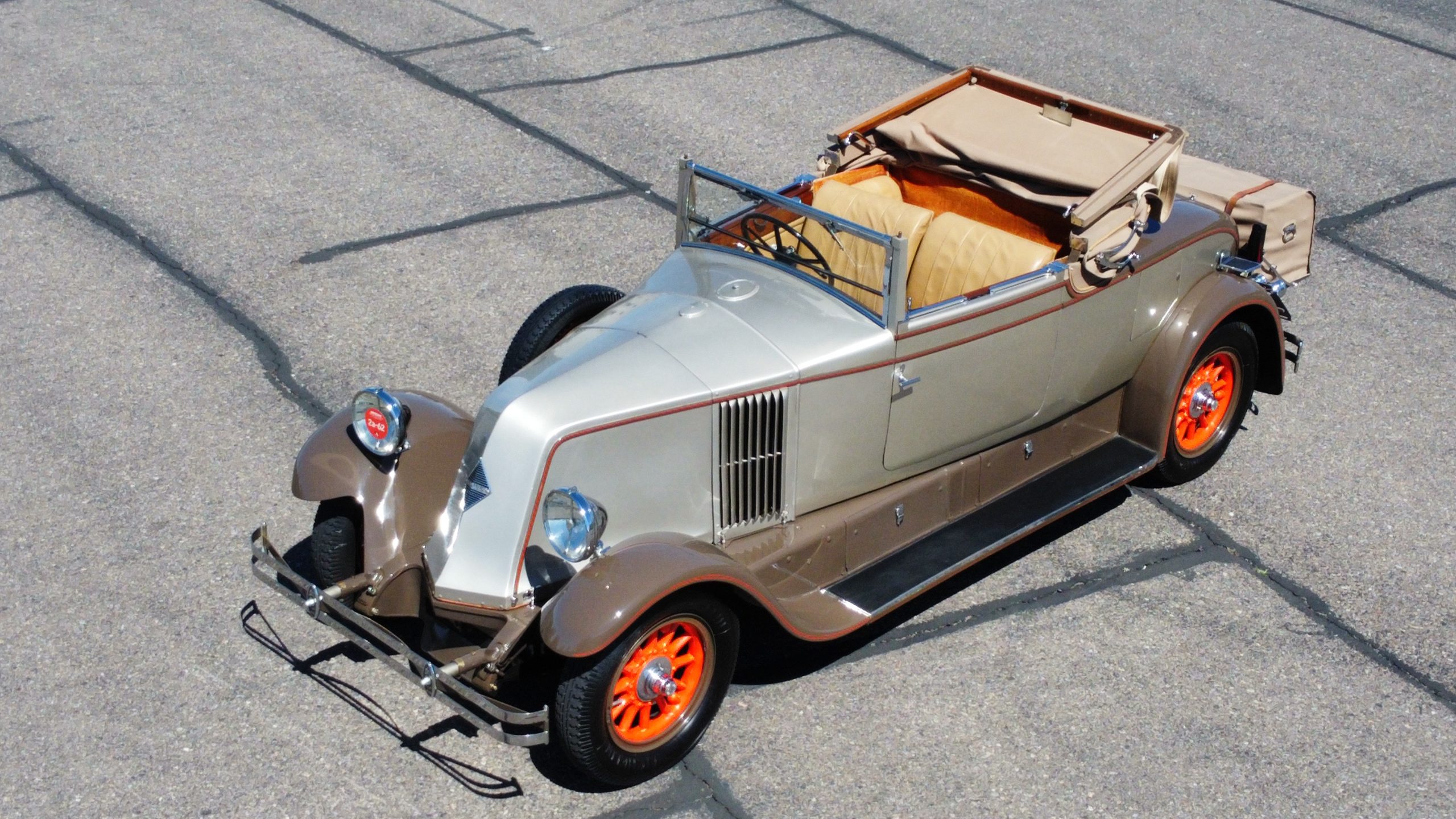 Finished in champagne and brown with orange accents, the car is powered by a 3,181cc L-head inline-six that features a single updraft carburetor, distributor and coil ignition, and a radiator mounted rearward of the engine. Additional features include a four-speed manual transmission, mechanically actuated four-wheel drum brakes with servo assistance, hydraulic shock absorbers, orange-painted wood-spoke wheels, JM bumper shocks, a beige convertible top, tan leather upholstery over three-place seating and a rumble seat, and a rear-mounted luggage trunk with fitted luggage.