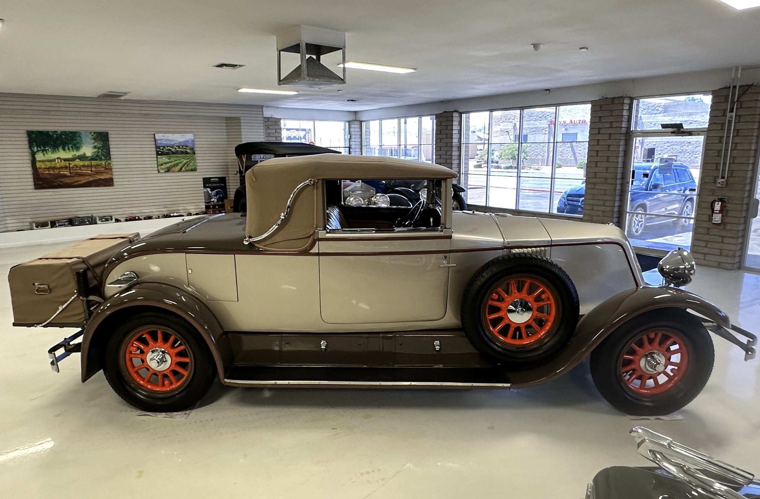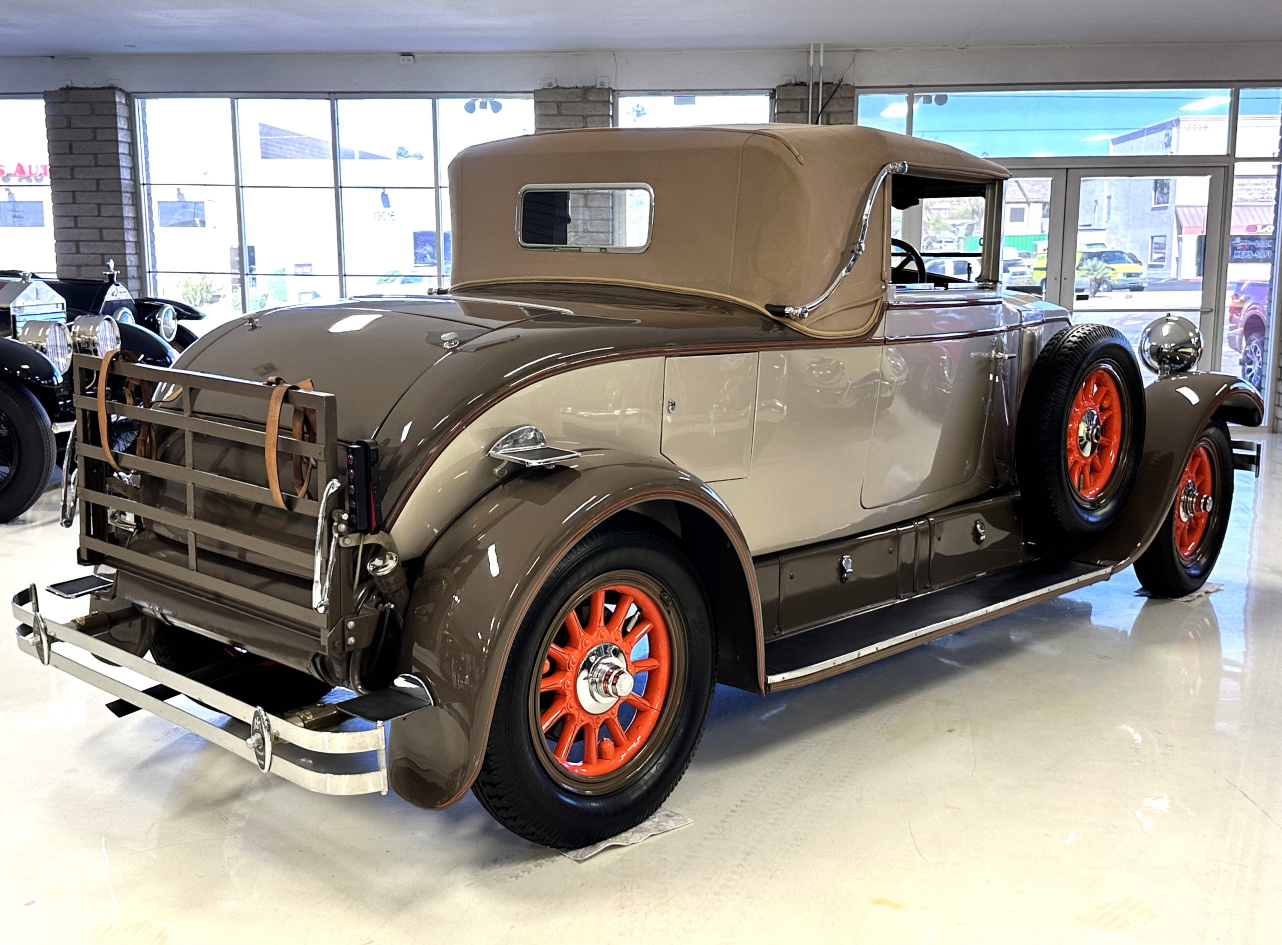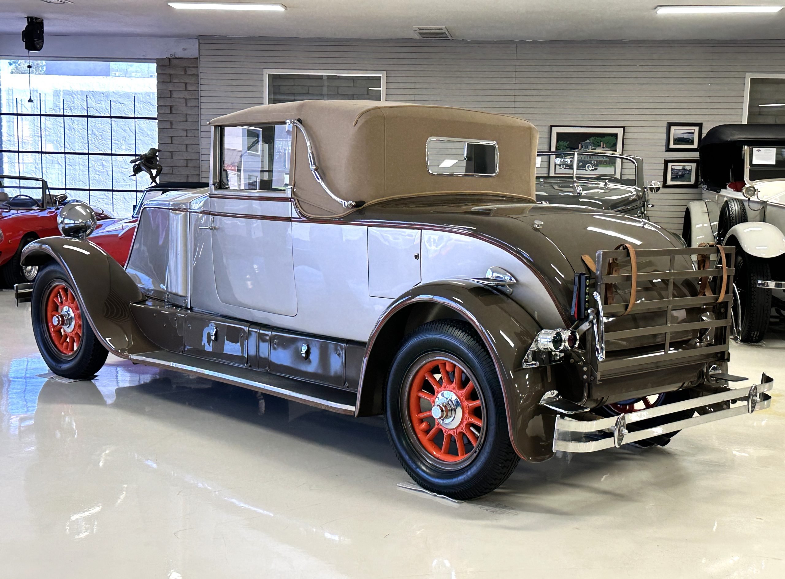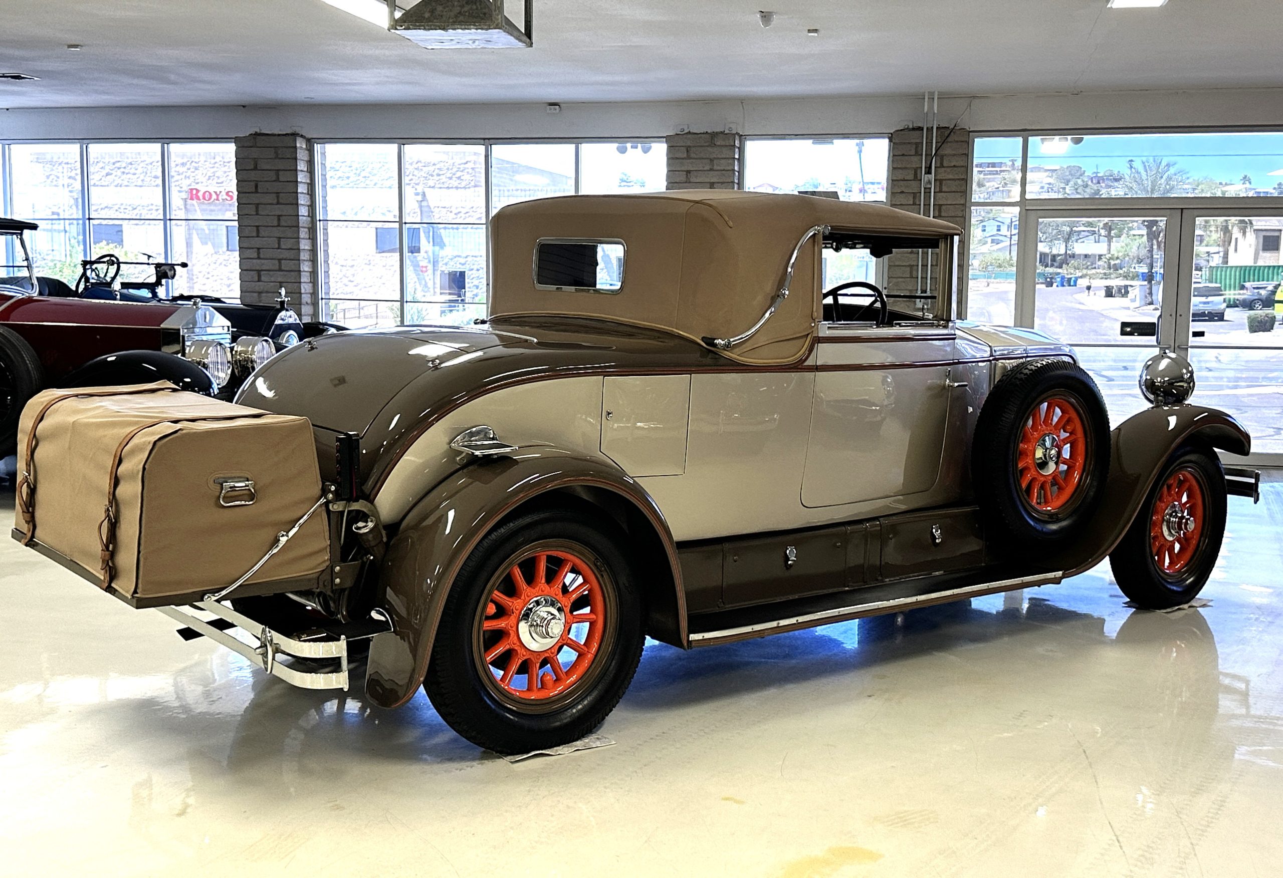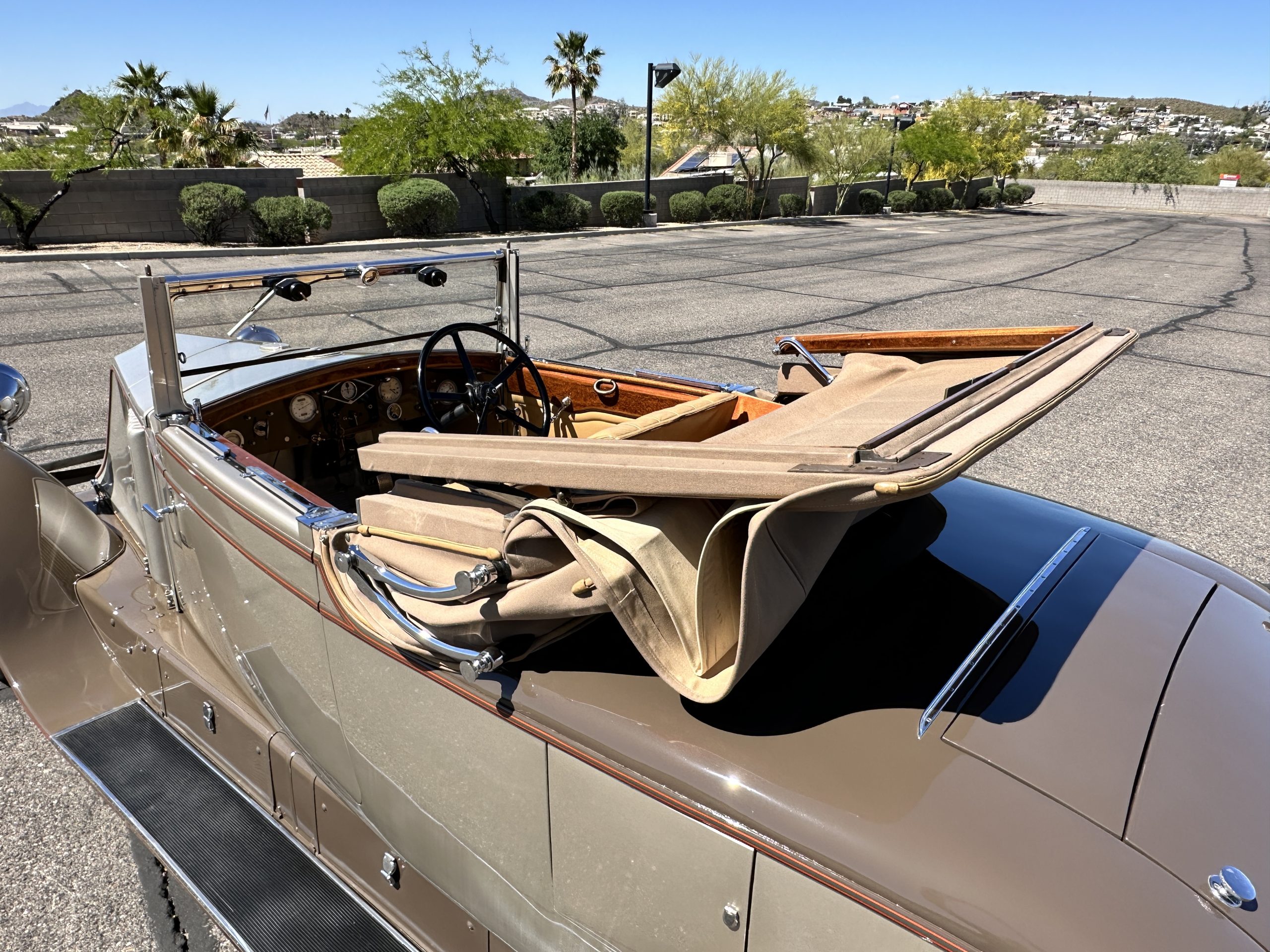 Finished in champagne and brown with orange accents, the car is powered by a 3,181cc L-head inline-six that features a single updraft carburetor, distributor and coil ignition, and a radiator mounted rearward of the engine. Additional features include a four-speed manual transmission, mechanically actuated four-wheel drum brakes with servo assistance, hydraulic shock absorbers, orange-painted wood-spoke wheels, JM bumper shocks, a beige convertible top, tan leather upholstery over three-place seating and a rumble seat, and a rear-mounted luggage trunk with fitted luggage.