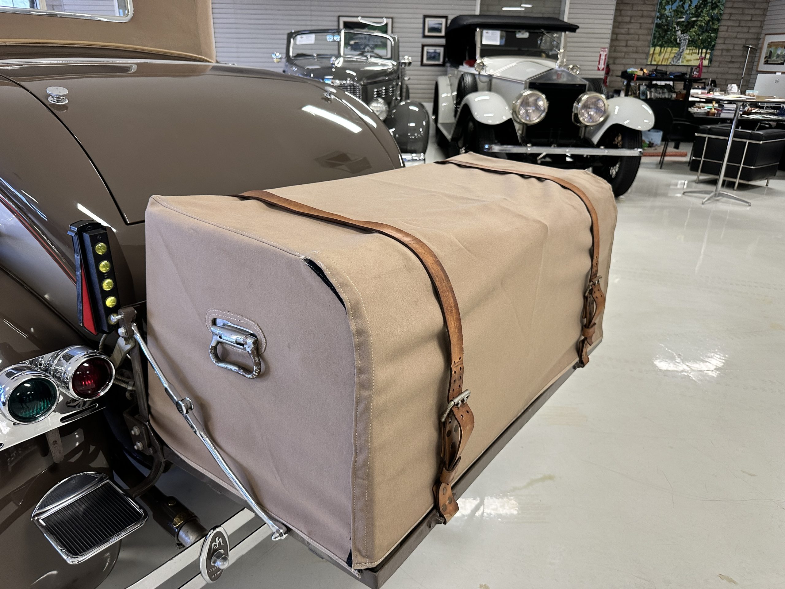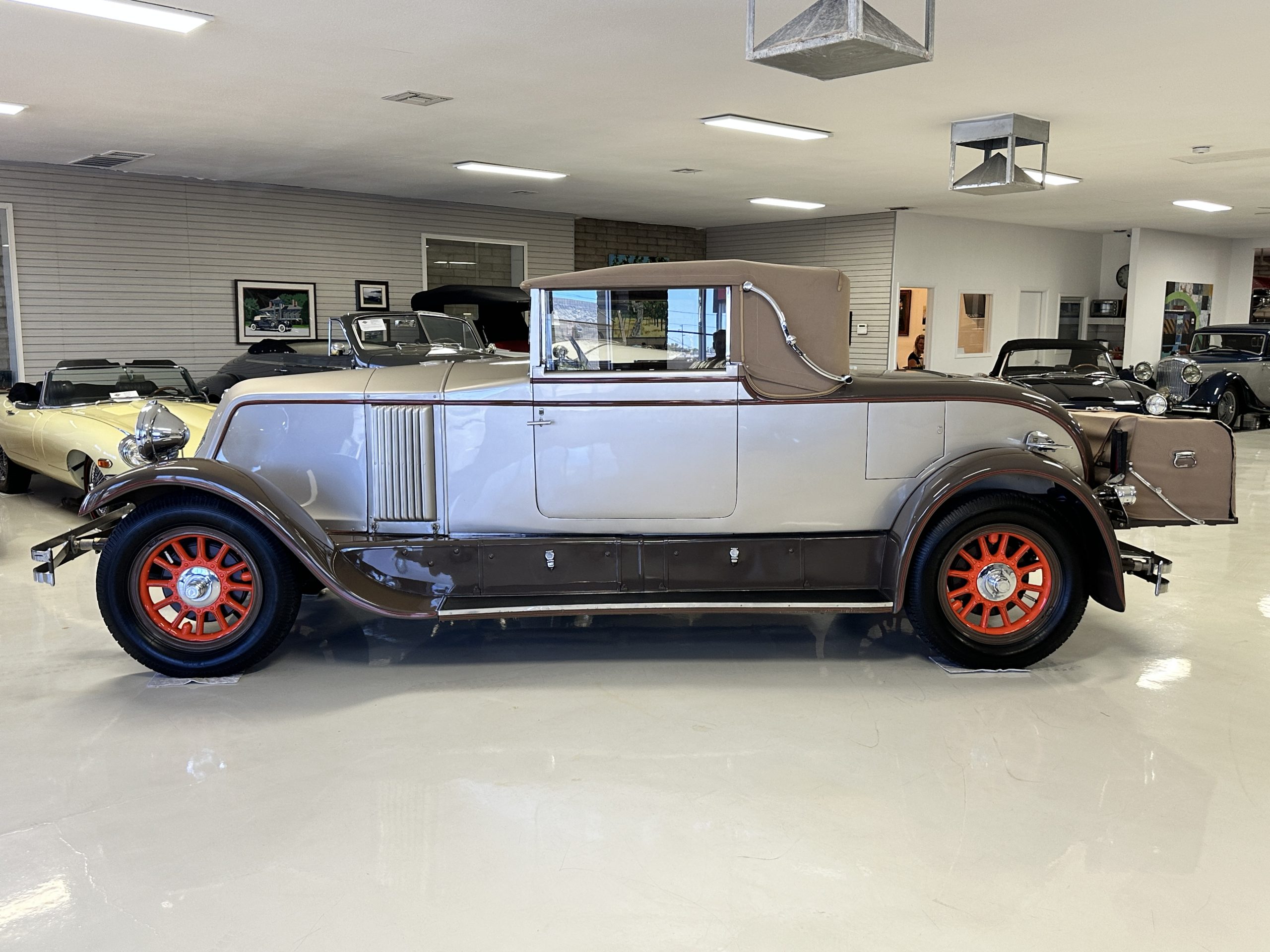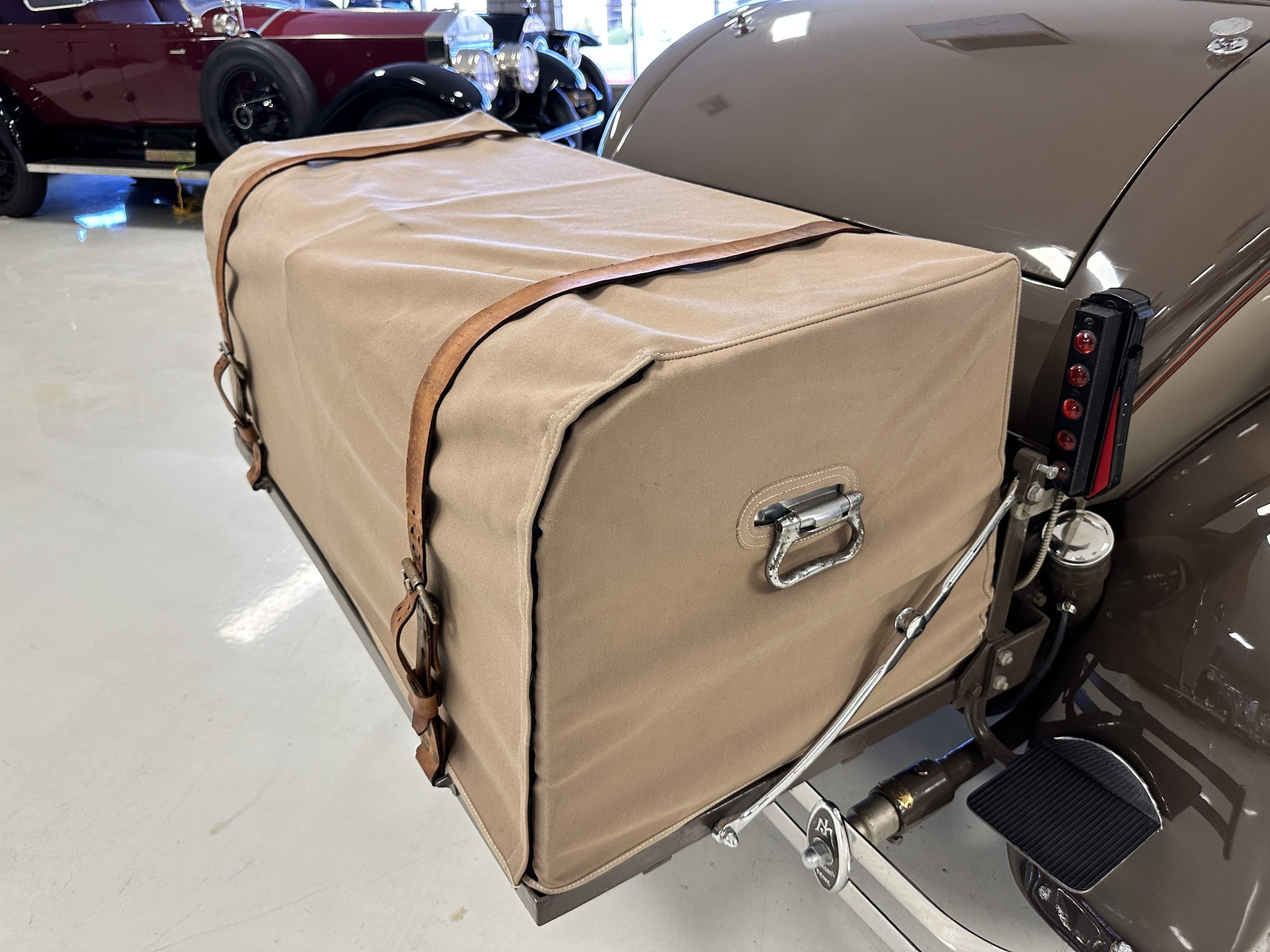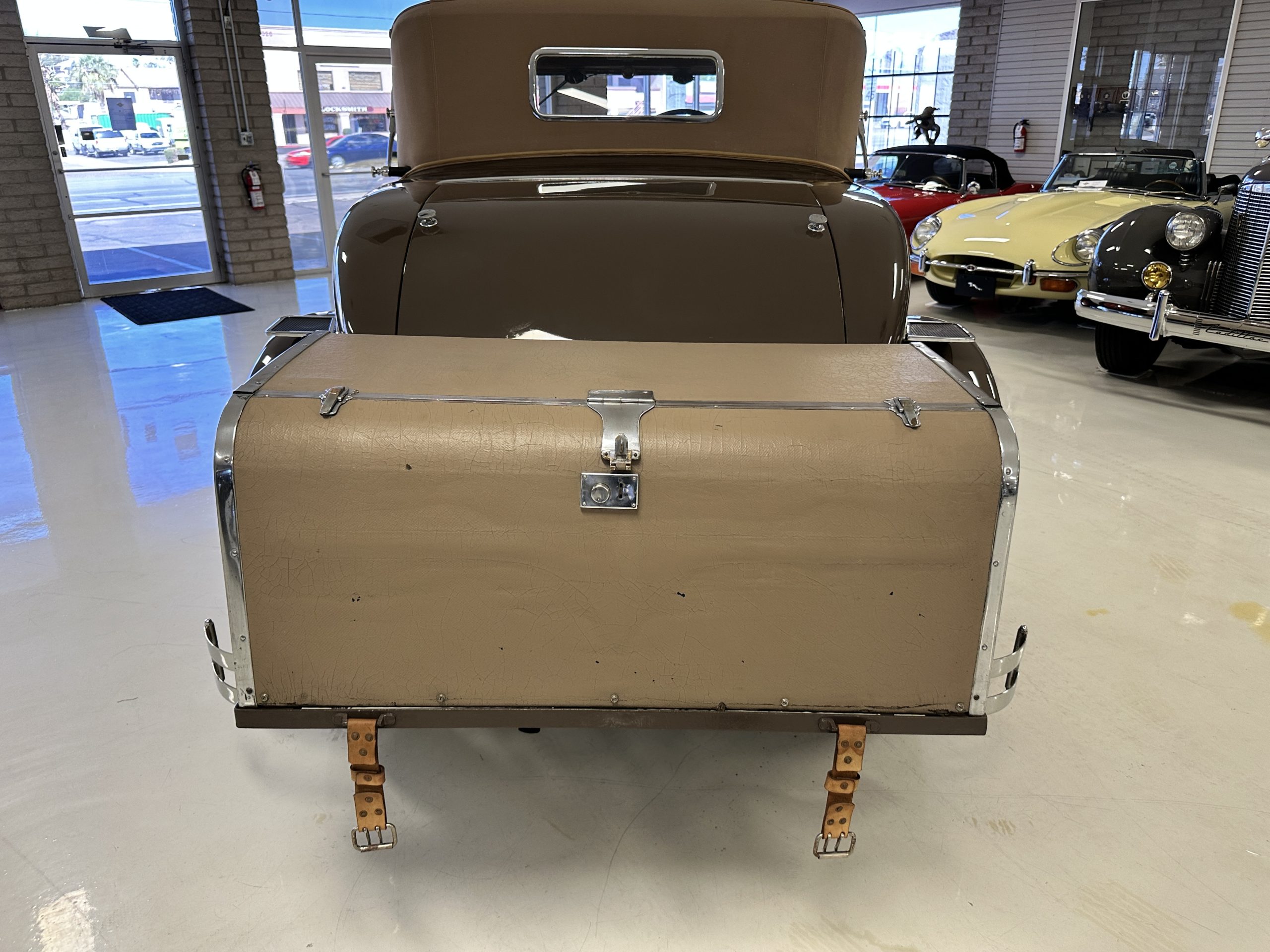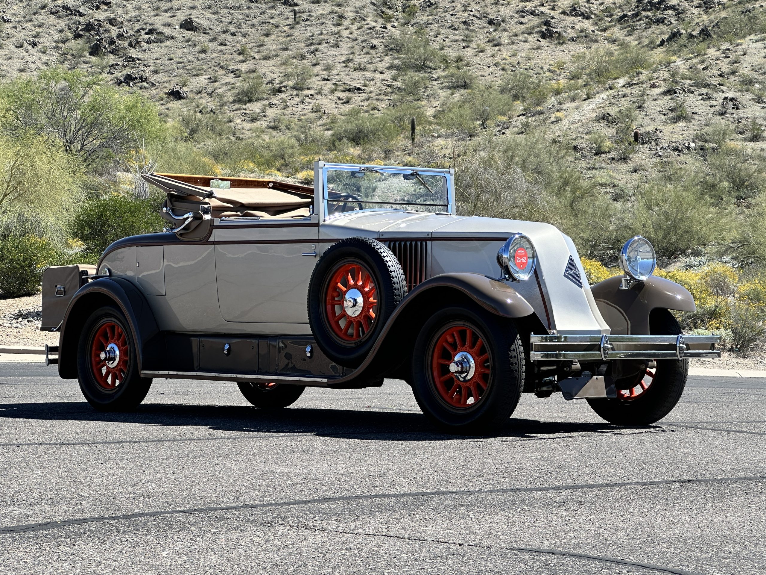 Finished in champagne and brown with orange accents, the car is powered by a 3,181cc L-head inline-six that features a single updraft carburetor, distributor and coil ignition, and a radiator mounted rearward of the engine. Additional features include a four-speed manual transmission, mechanically actuated four-wheel drum brakes with servo assistance, hydraulic shock absorbers, orange-painted wood-spoke wheels, JM bumper shocks, a beige convertible top, tan leather upholstery over three-place seating and a rumble seat, and a rear-mounted luggage trunk with fitted luggage.