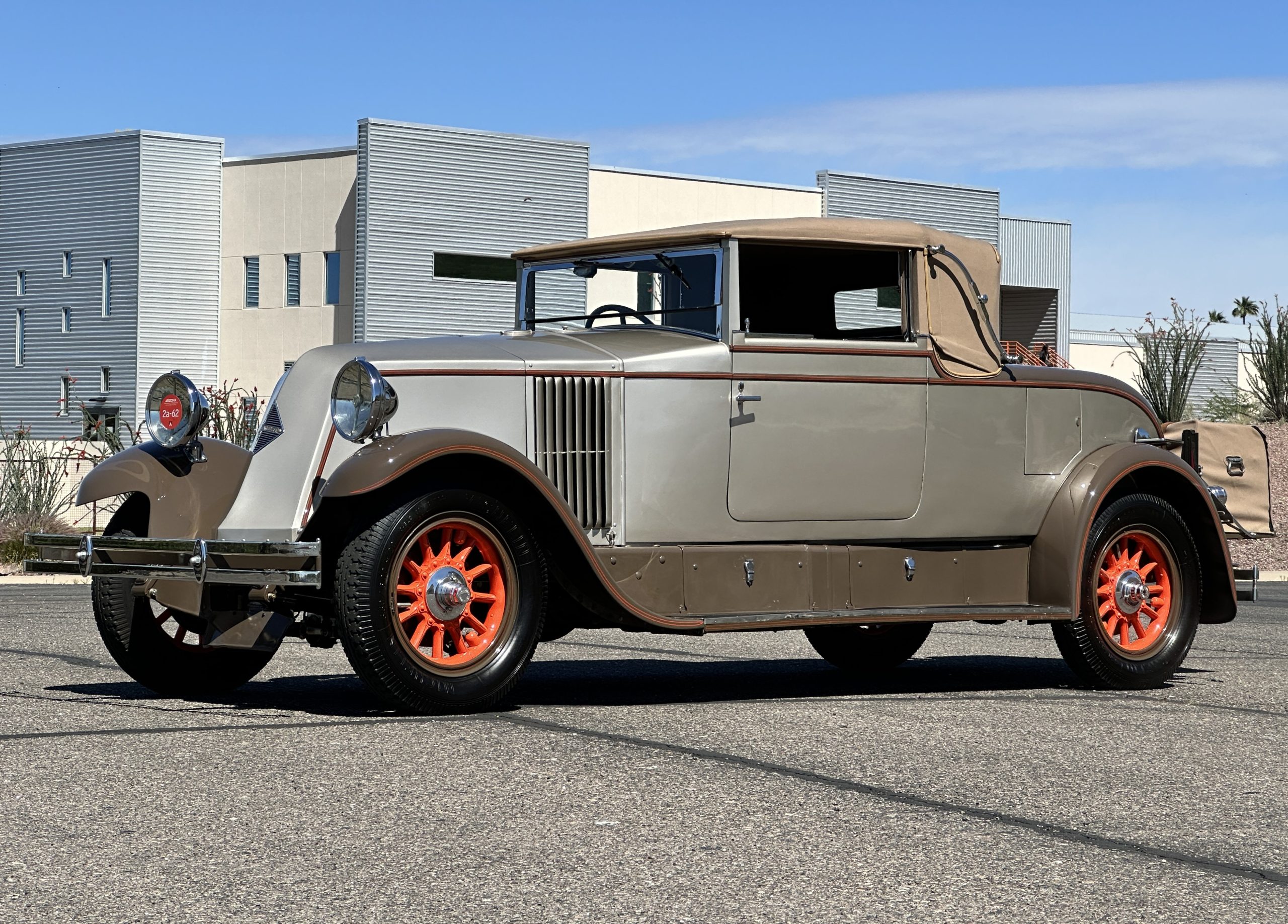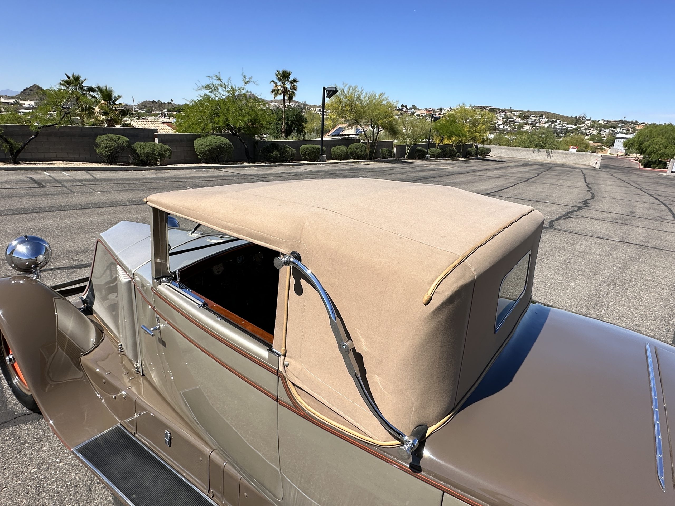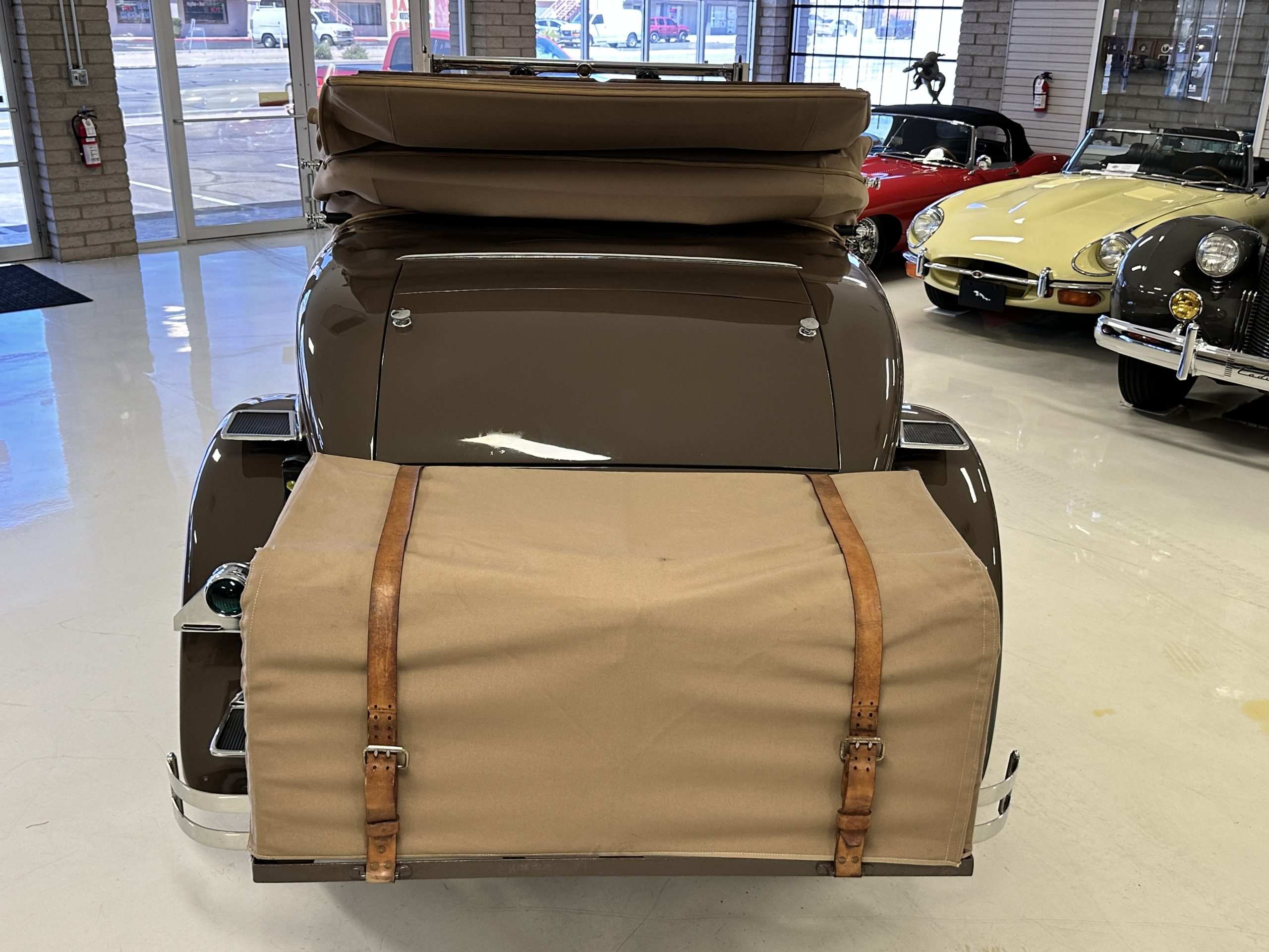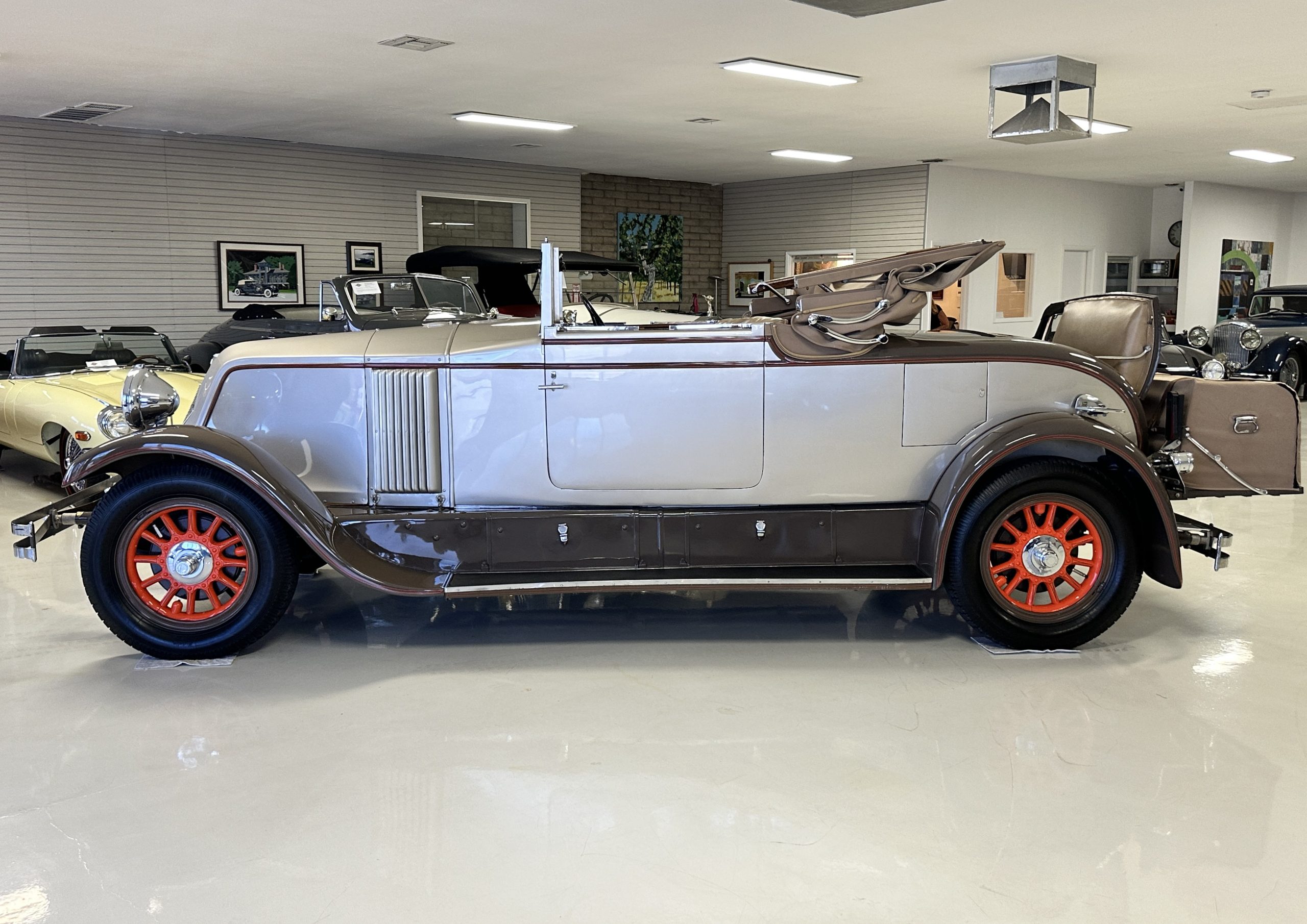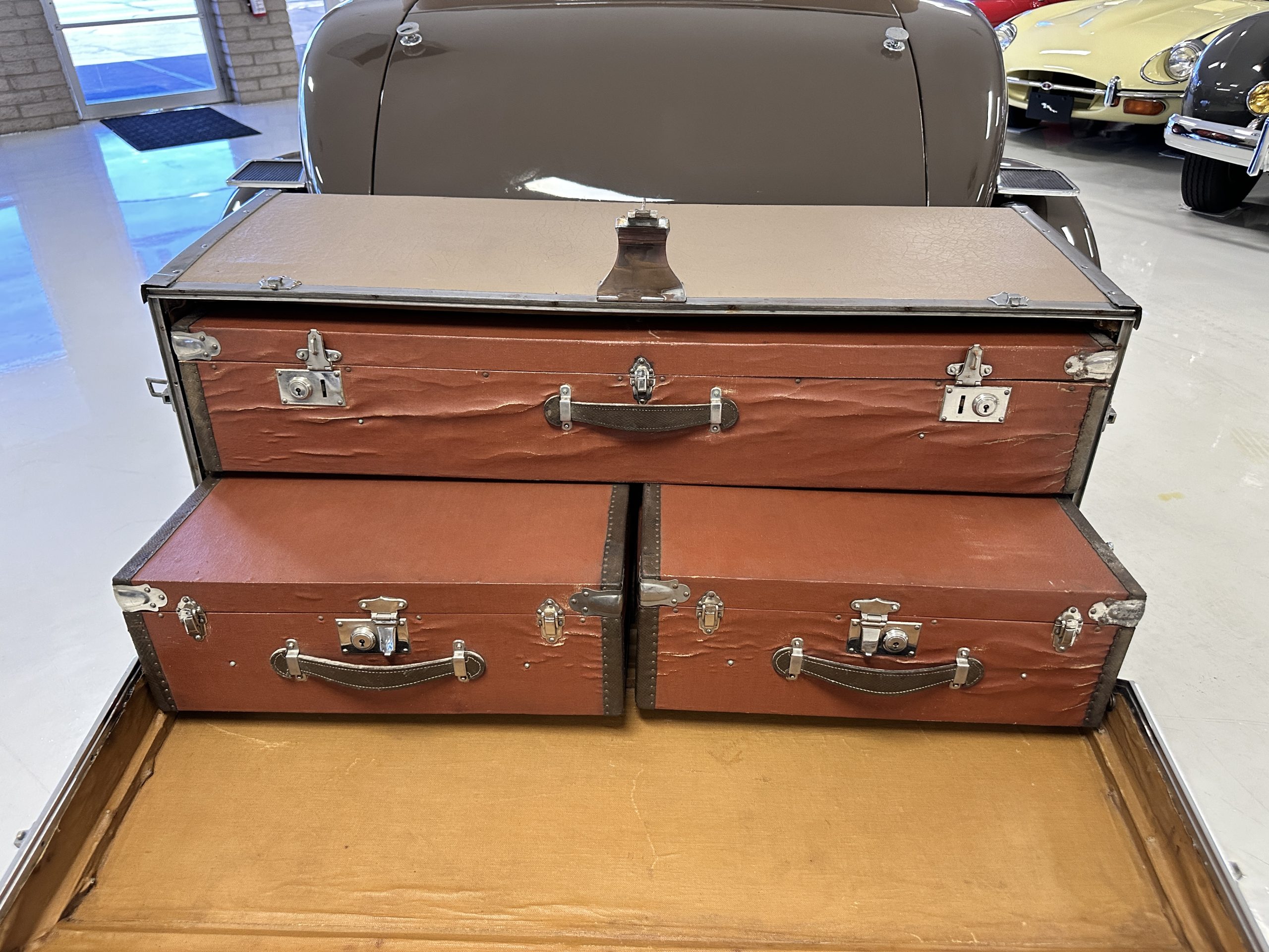 Finished in champagne and brown with orange accents, the car is powered by a 3,181cc L-head inline-six that features a single updraft carburetor, distributor and coil ignition, and a radiator mounted rearward of the engine. Additional features include a four-speed manual transmission, mechanically actuated four-wheel drum brakes with servo assistance, hydraulic shock absorbers, orange-painted wood-spoke wheels, JM bumper shocks, a beige convertible top, tan leather upholstery over three-place seating and a rumble seat, and a rear-mounted luggage trunk with fitted luggage.