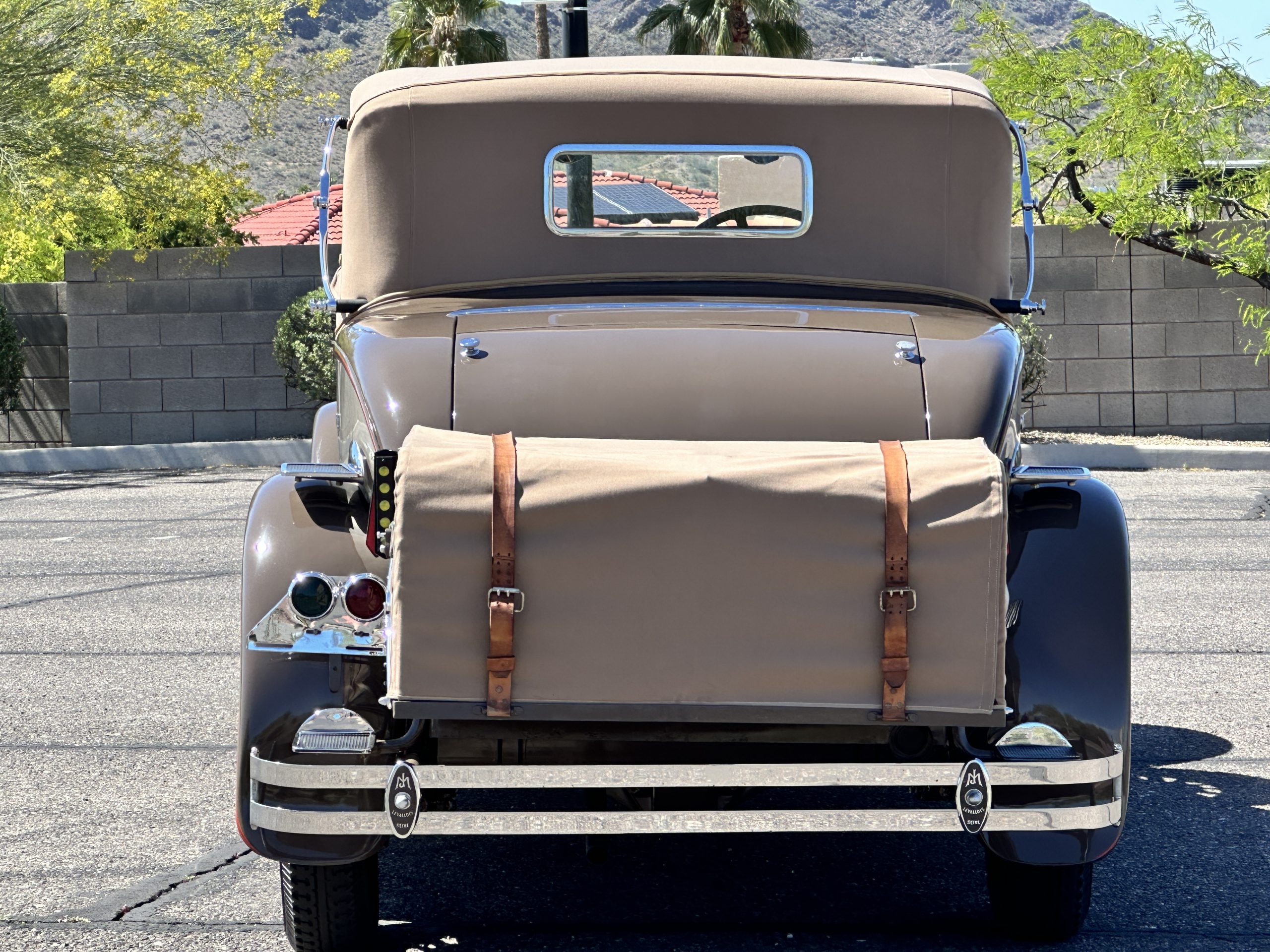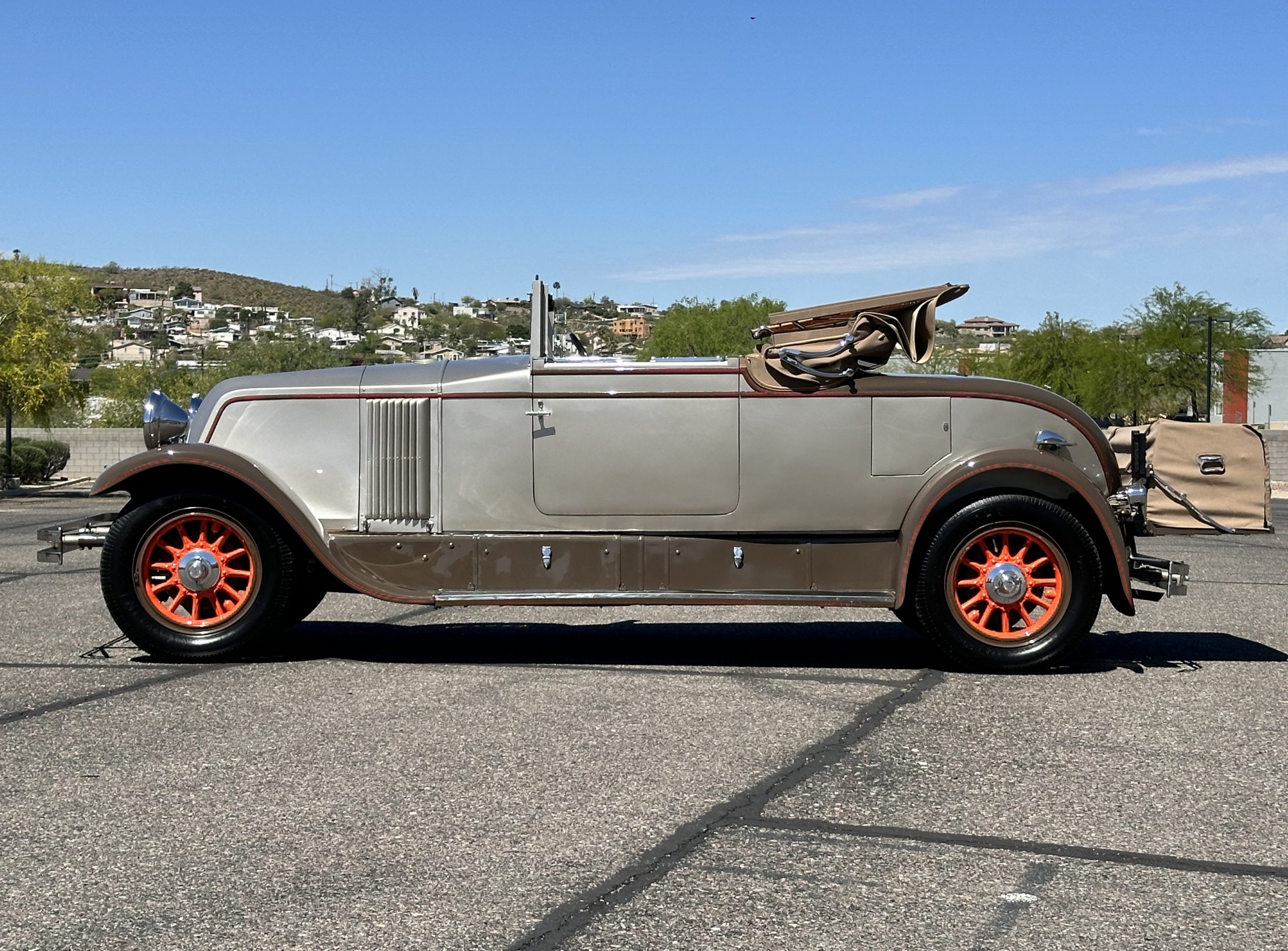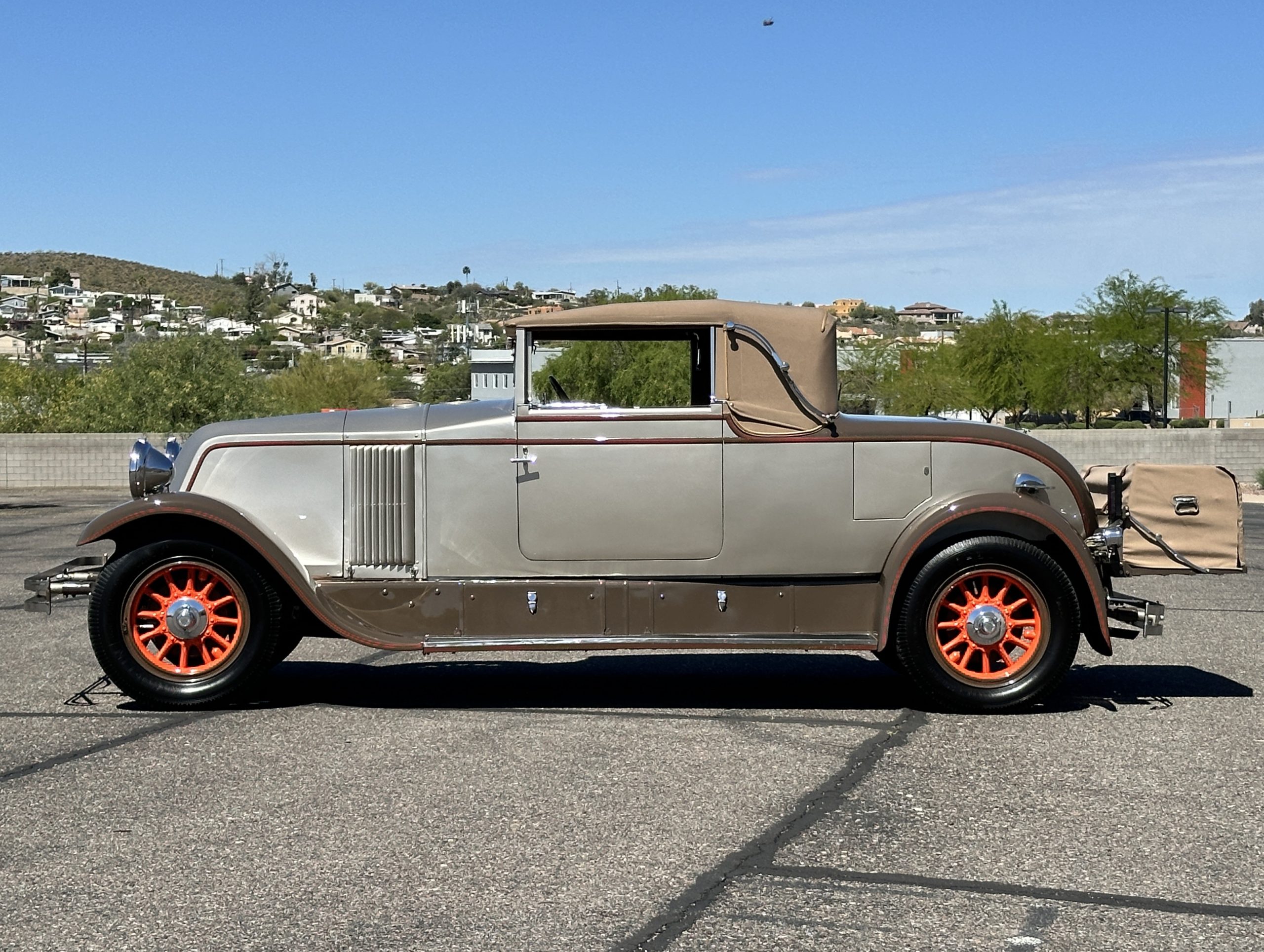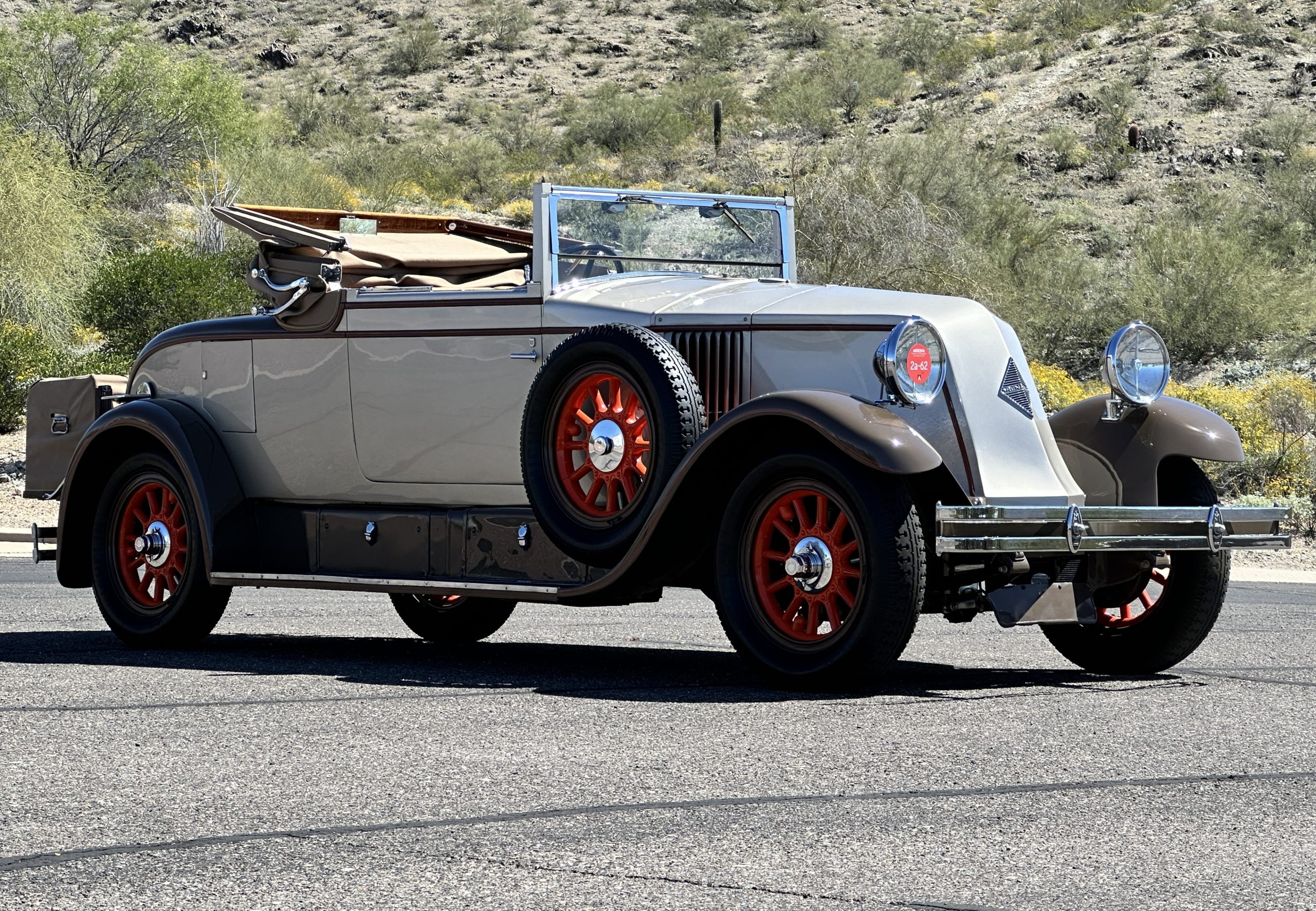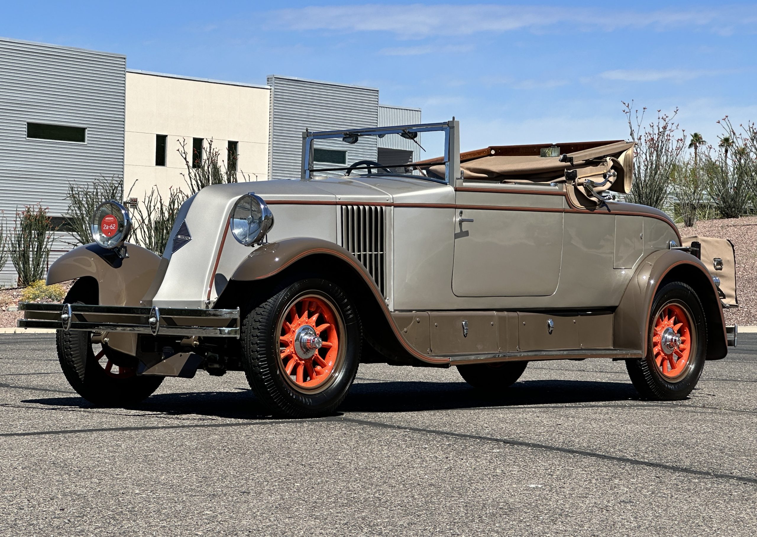 Finished in champagne and brown with orange accents, the car is powered by a 3,181cc L-head inline-six that features a single updraft carburetor, distributor and coil ignition, and a radiator mounted rearward of the engine. Additional features include a four-speed manual transmission, mechanically actuated four-wheel drum brakes with servo assistance, hydraulic shock absorbers, orange-painted wood-spoke wheels, JM bumper shocks, a beige convertible top, tan leather upholstery over three-place seating and a rumble seat, and a rear-mounted luggage trunk with fitted luggage.