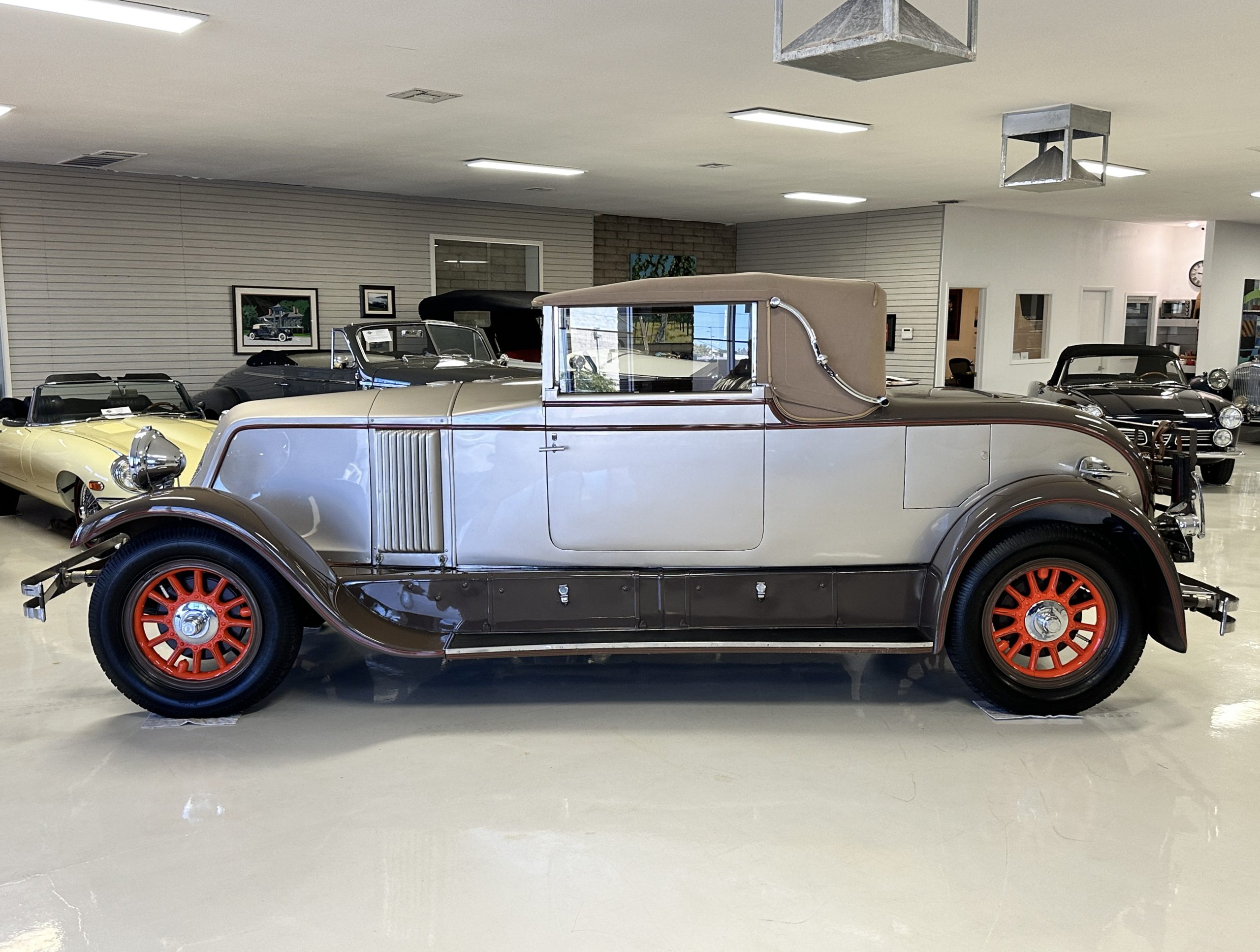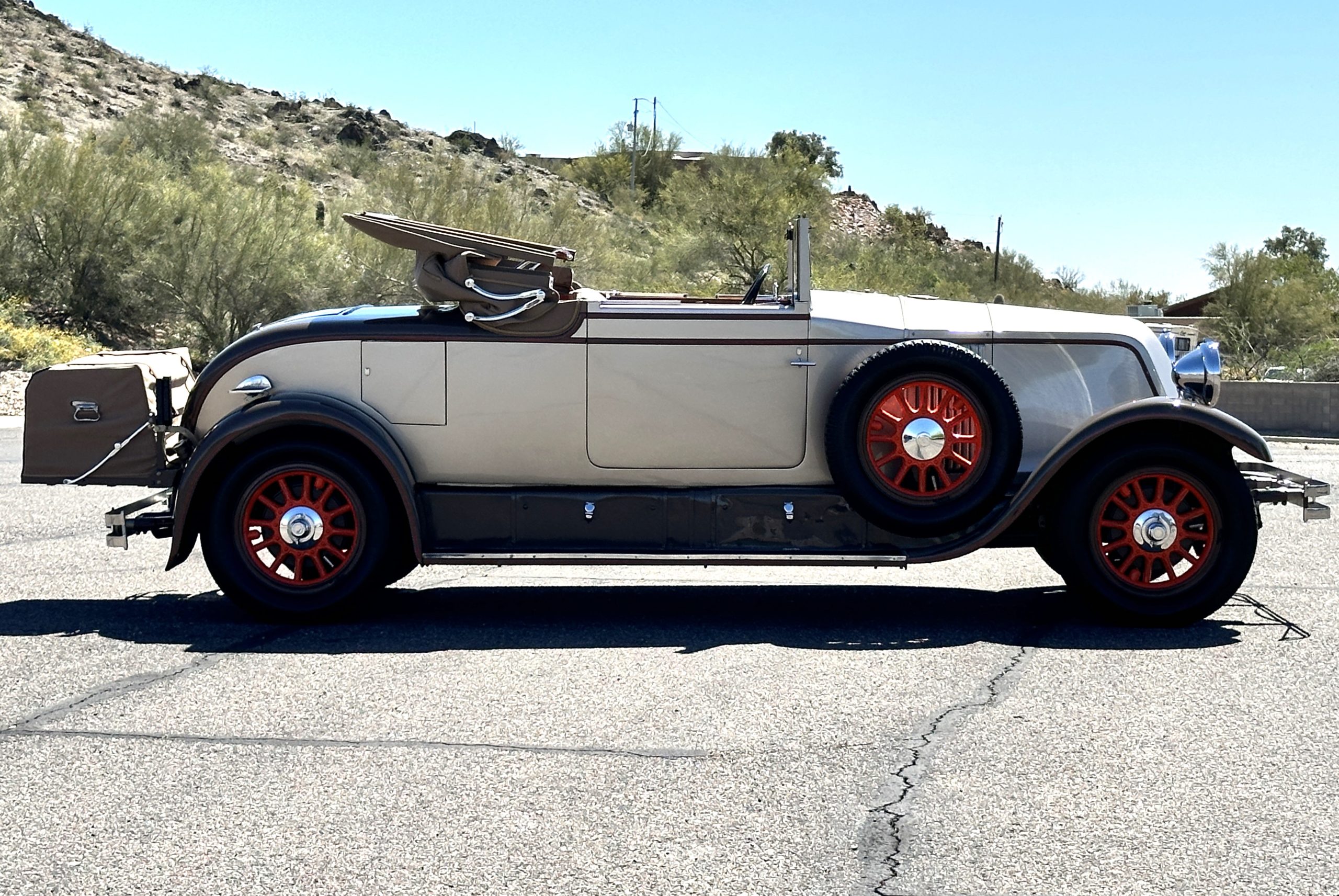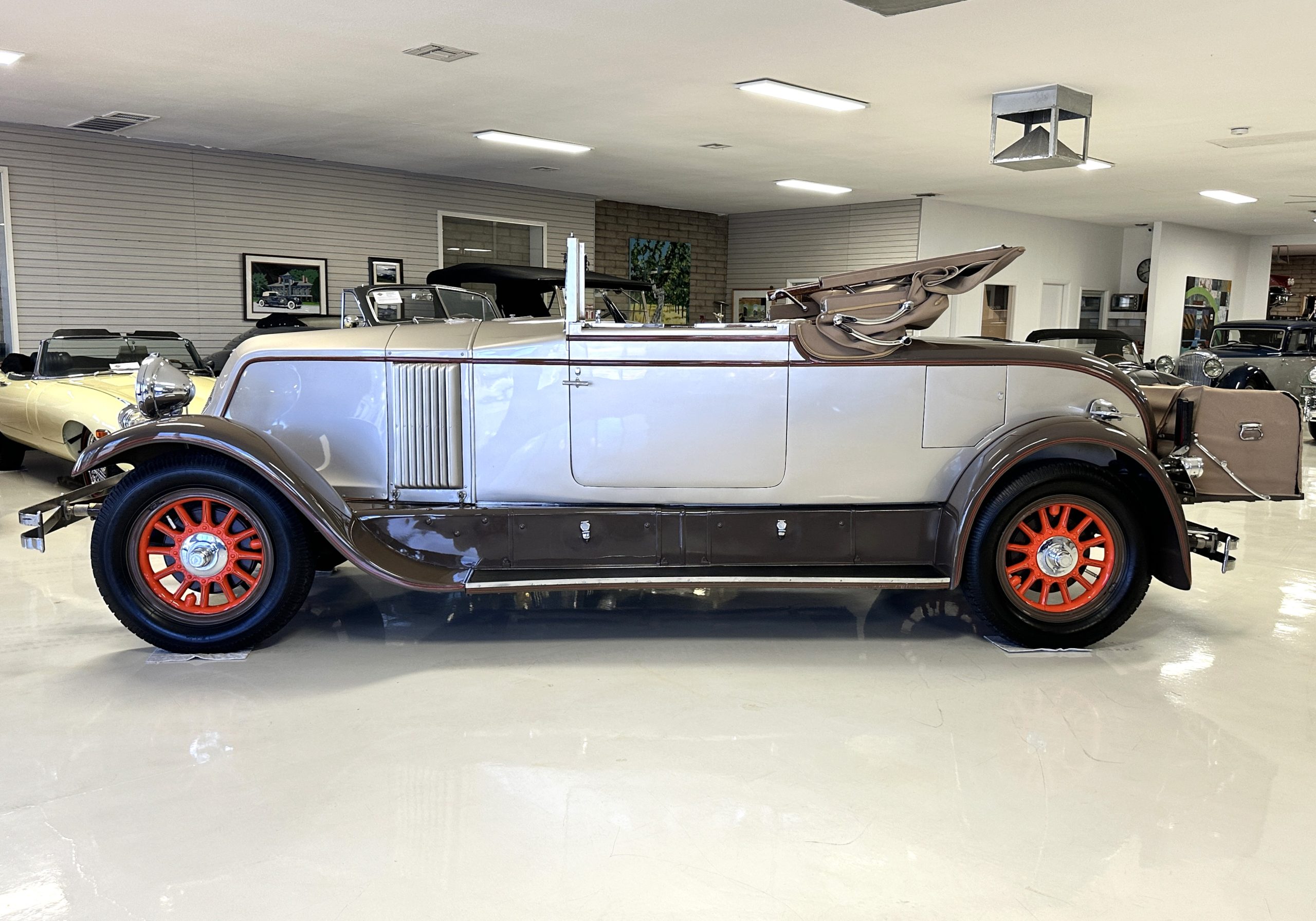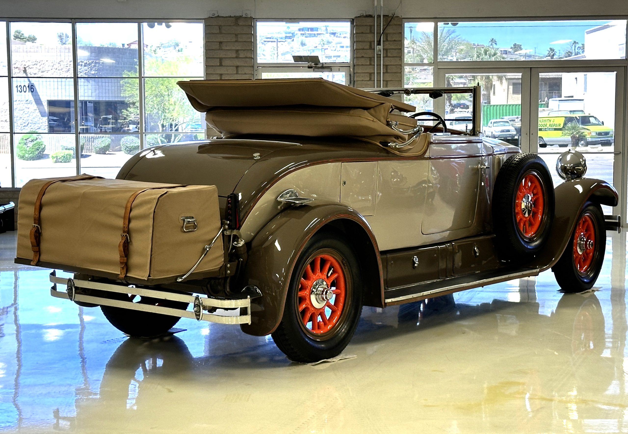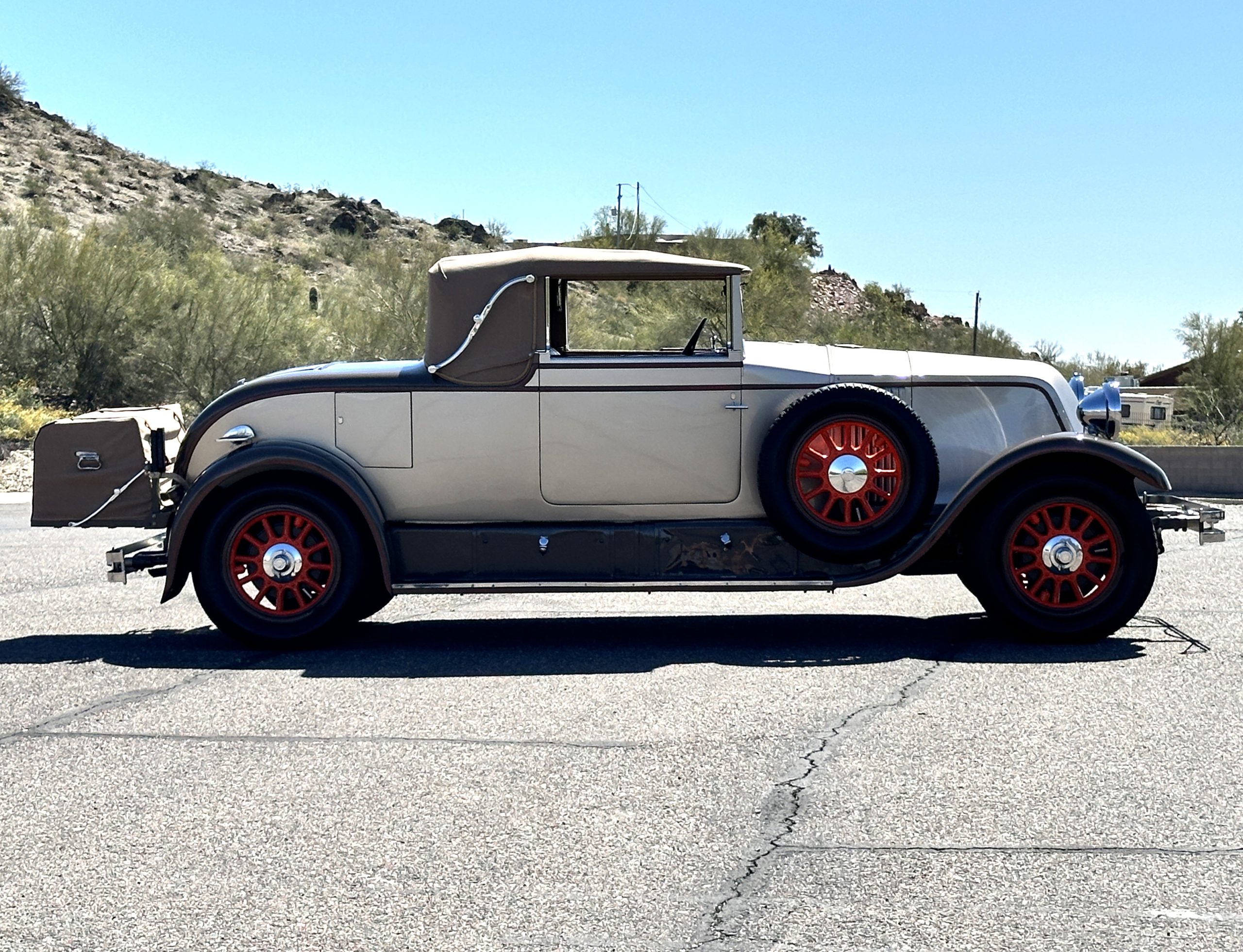 Finished in champagne and brown with orange accents, the car is powered by a 3,181cc L-head inline-six that features a single updraft carburetor, distributor and coil ignition, and a radiator mounted rearward of the engine. Additional features include a four-speed manual transmission, mechanically actuated four-wheel drum brakes with servo assistance, hydraulic shock absorbers, orange-painted wood-spoke wheels, JM bumper shocks, a beige convertible top, tan leather upholstery over three-place seating and a rumble seat, and a rear-mounted luggage trunk with fitted luggage.