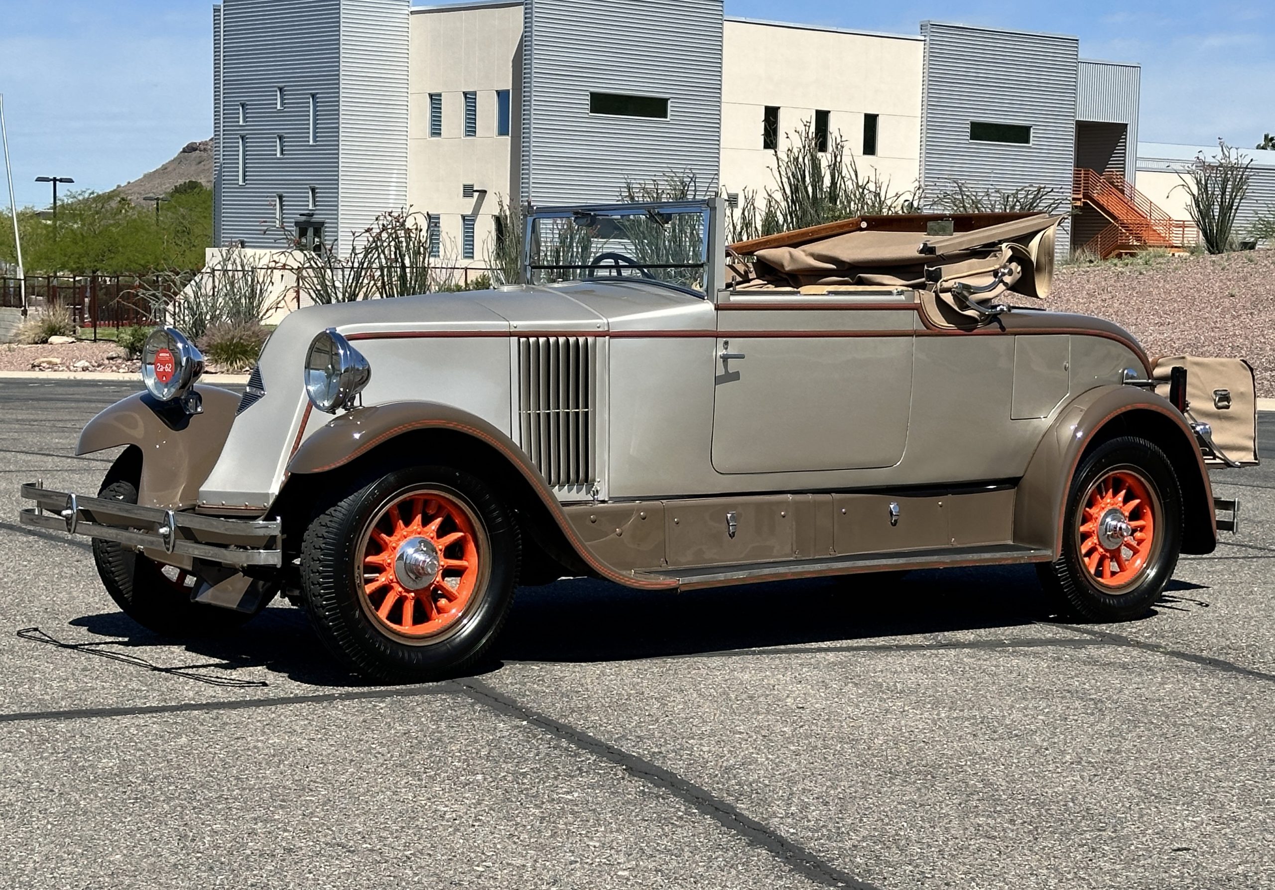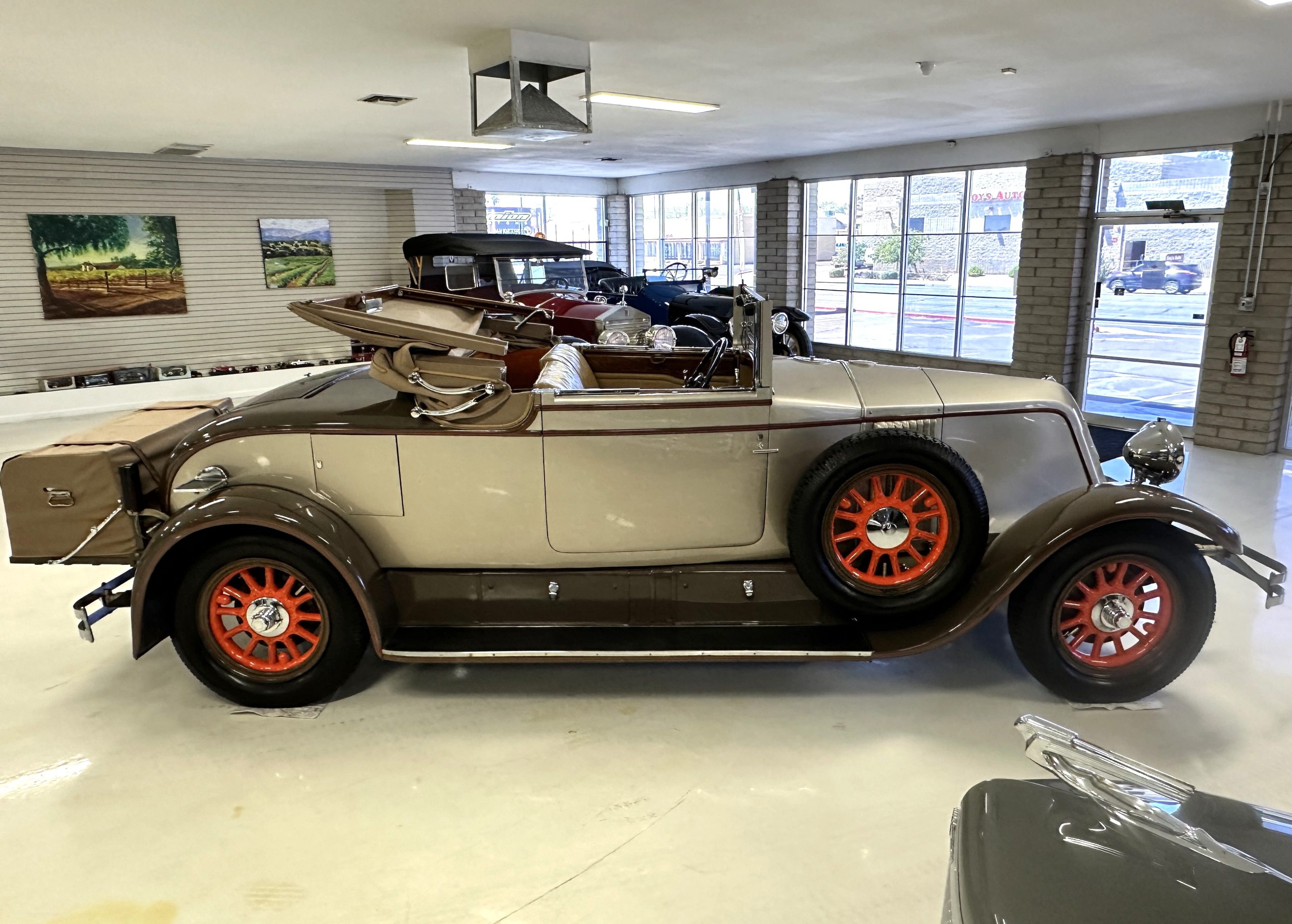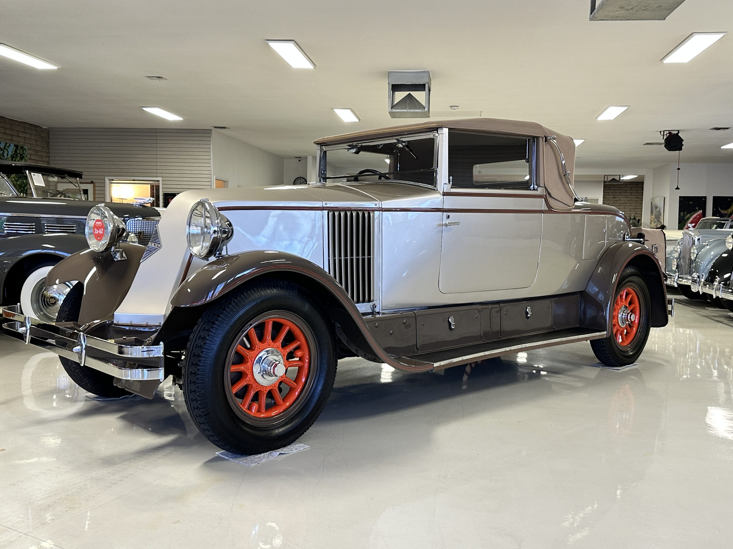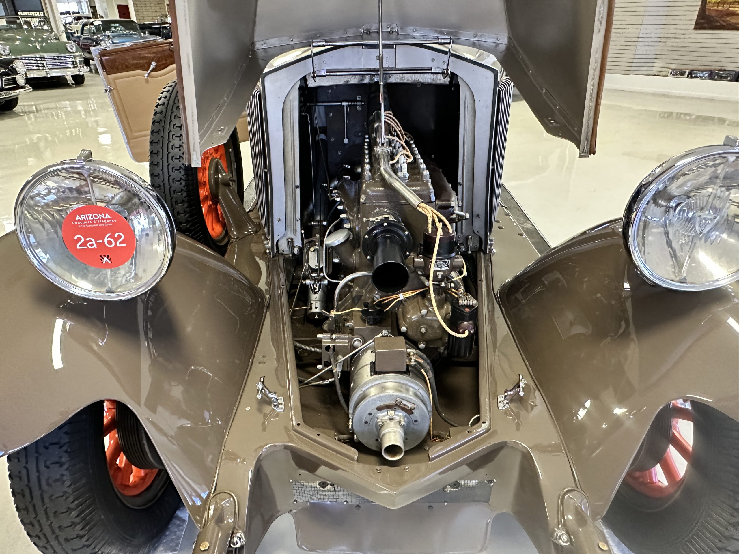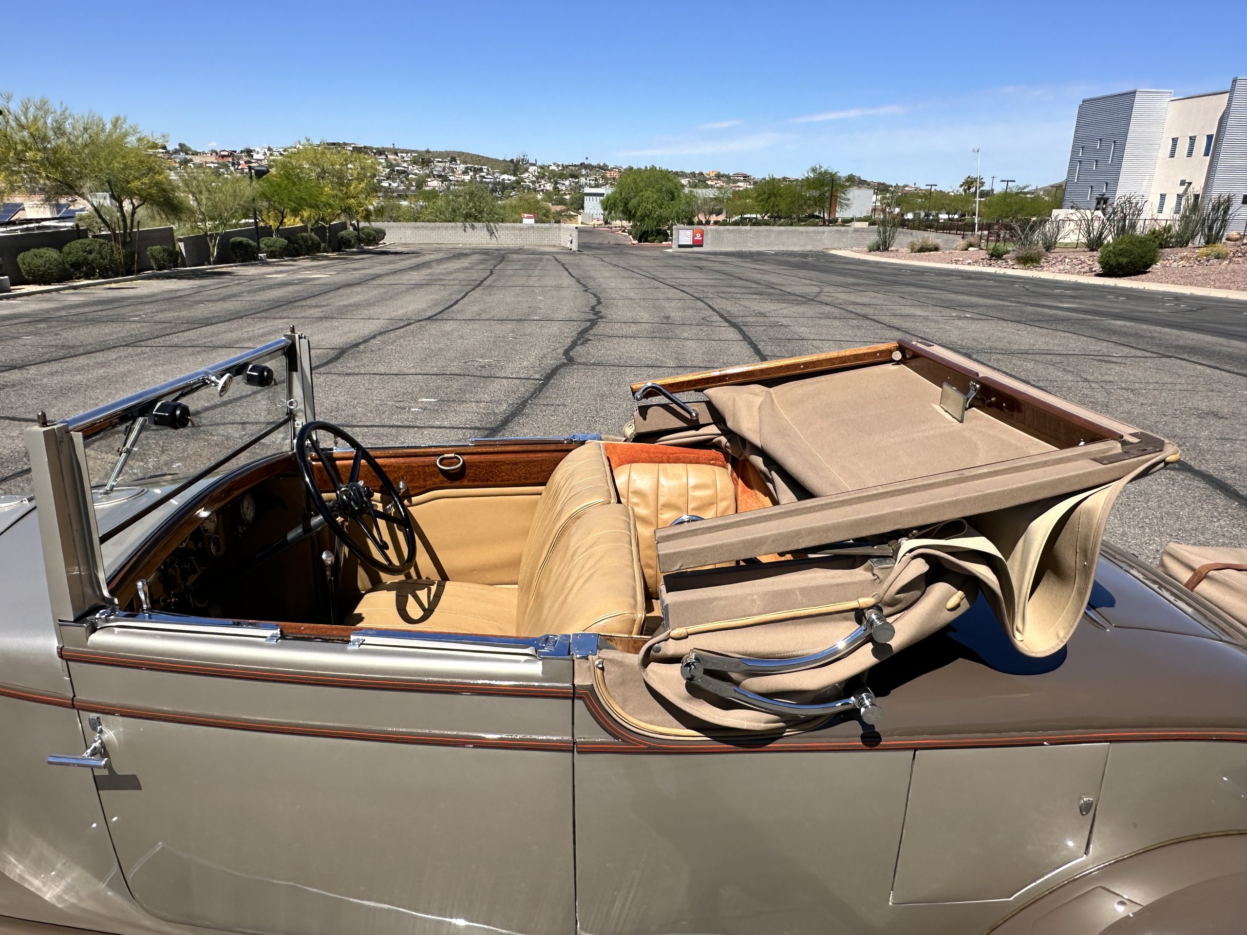 Finished in champagne and brown with orange accents, the car is powered by a 3,181cc L-head inline-six that features a single updraft carburetor, distributor and coil ignition, and a radiator mounted rearward of the engine. Additional features include a four-speed manual transmission, mechanically actuated four-wheel drum brakes with servo assistance, hydraulic shock absorbers, orange-painted wood-spoke wheels, JM bumper shocks, a beige convertible top, tan leather upholstery over three-place seating and a rumble seat, and a rear-mounted luggage trunk with fitted luggage.