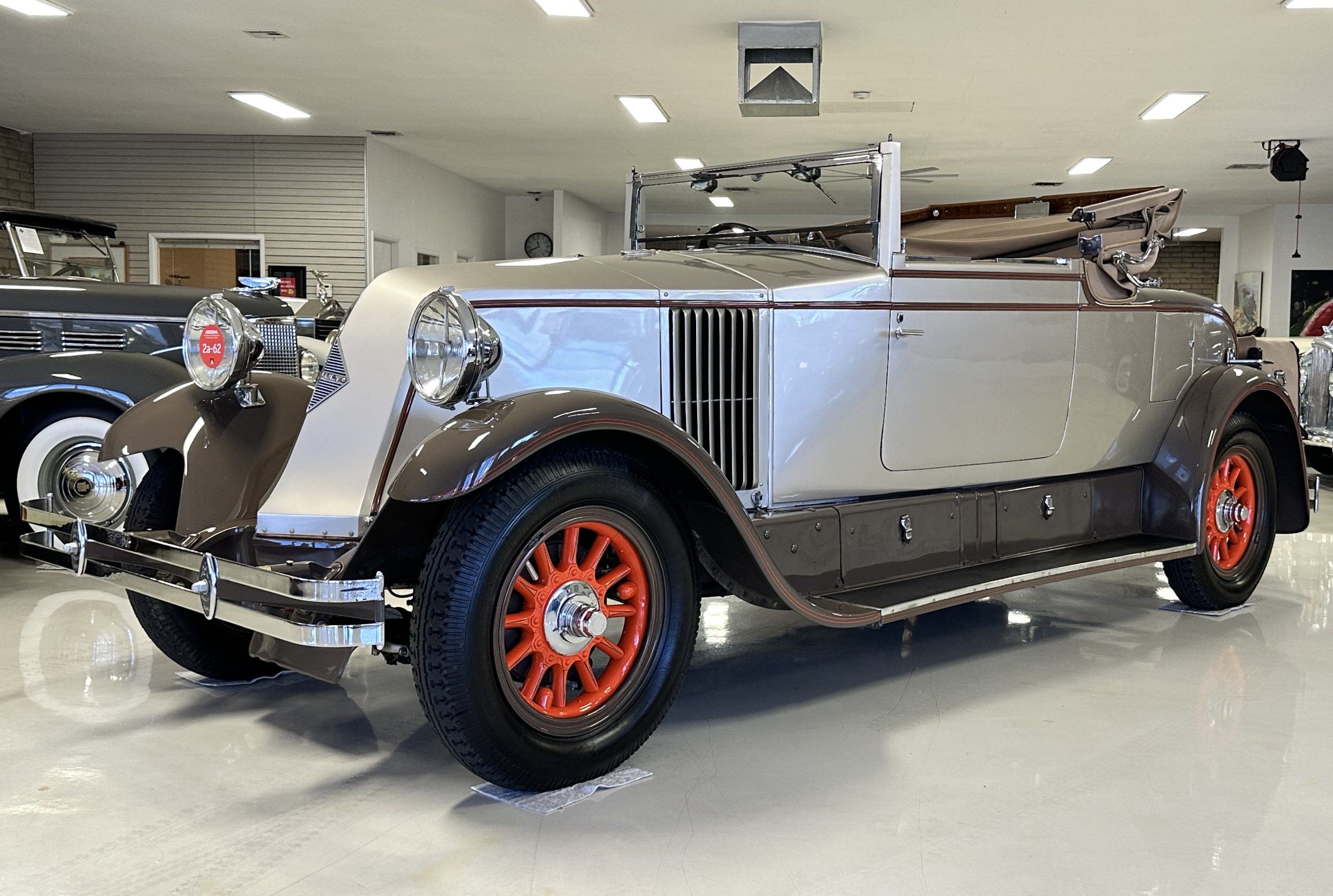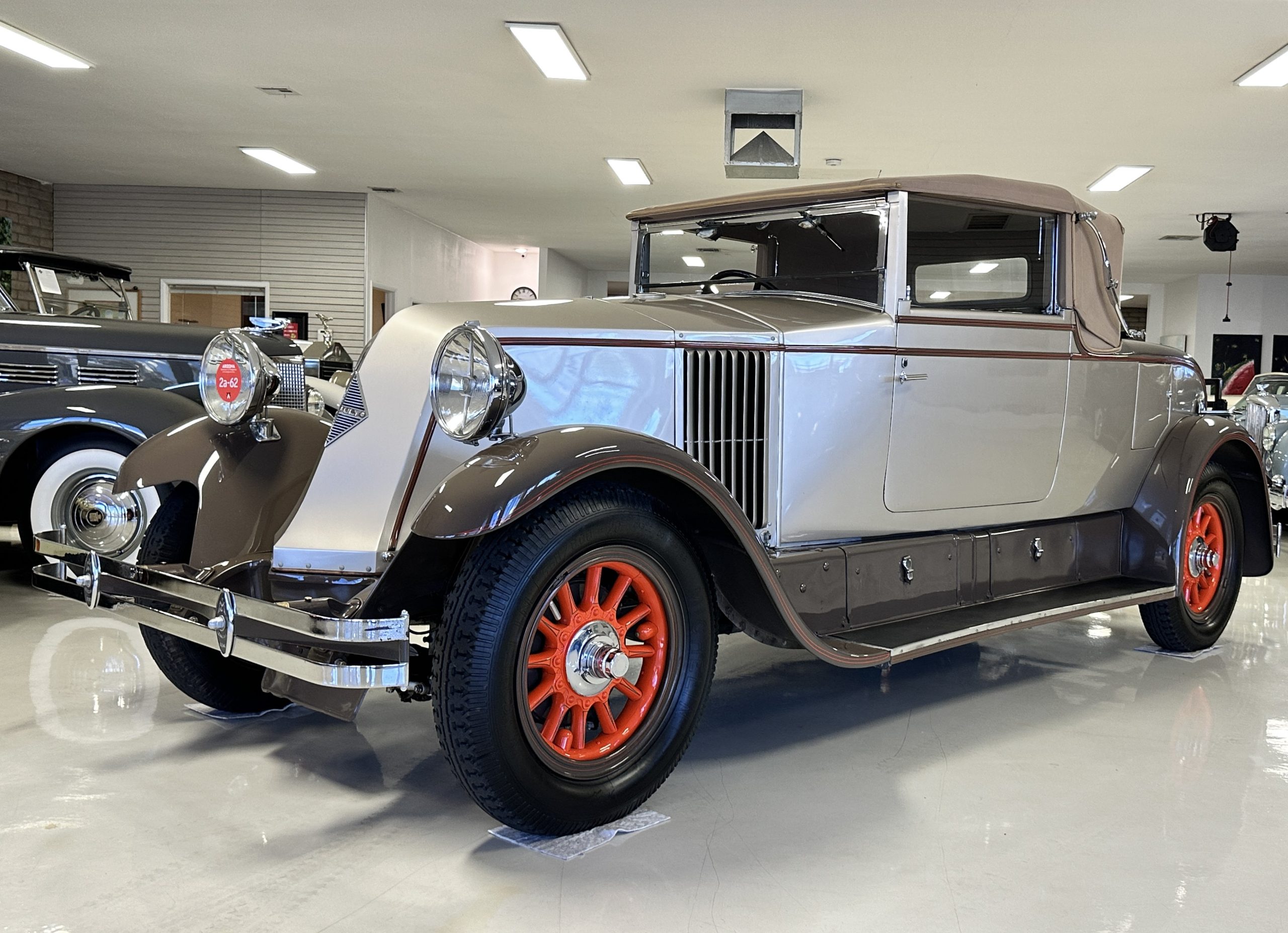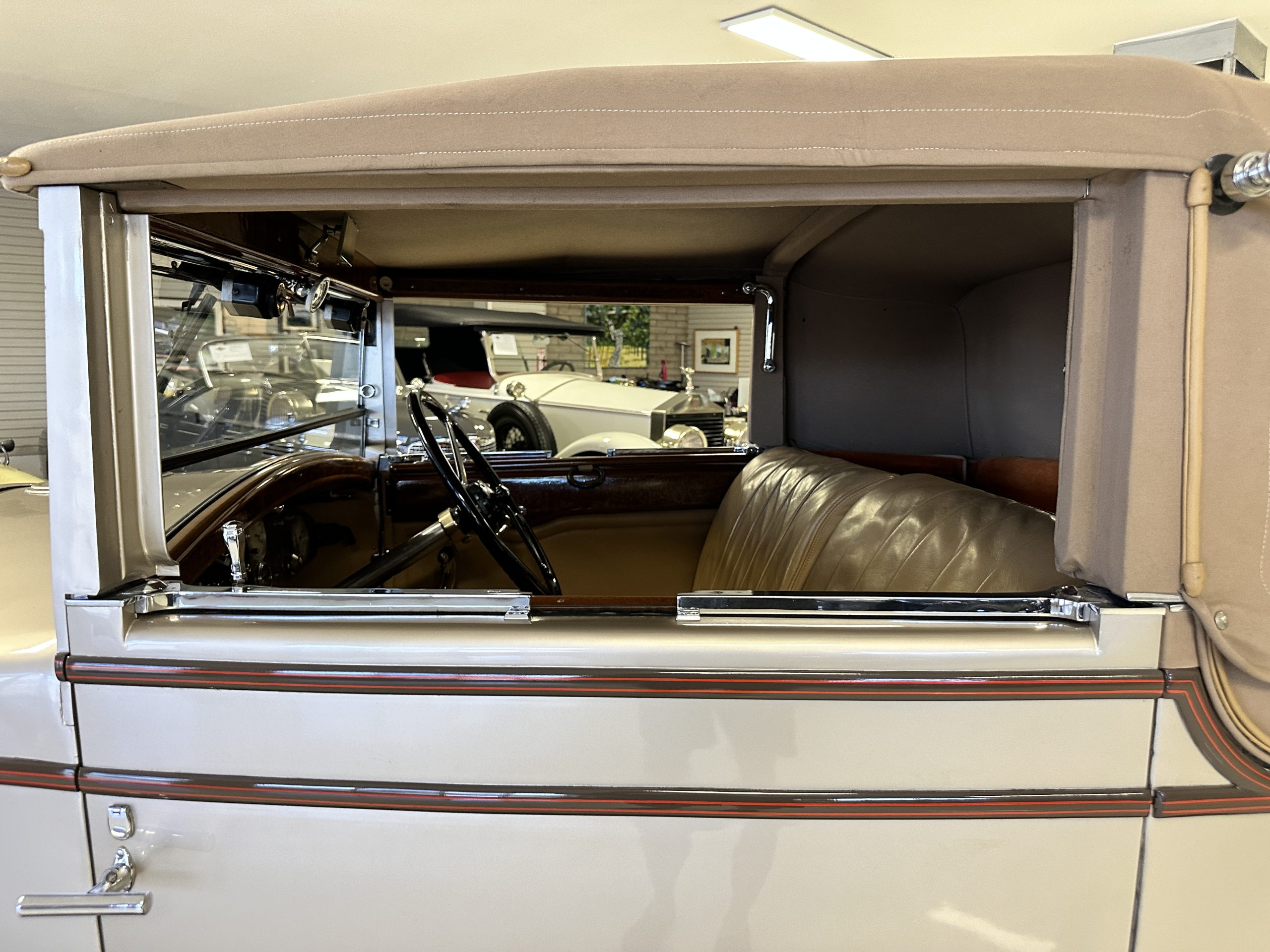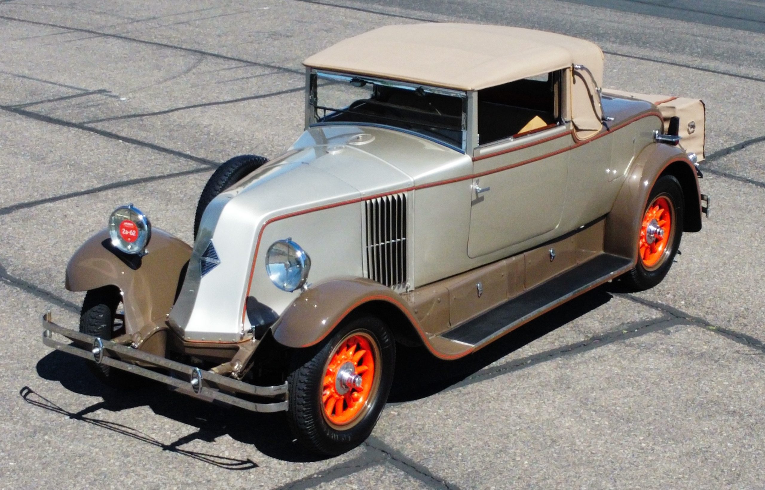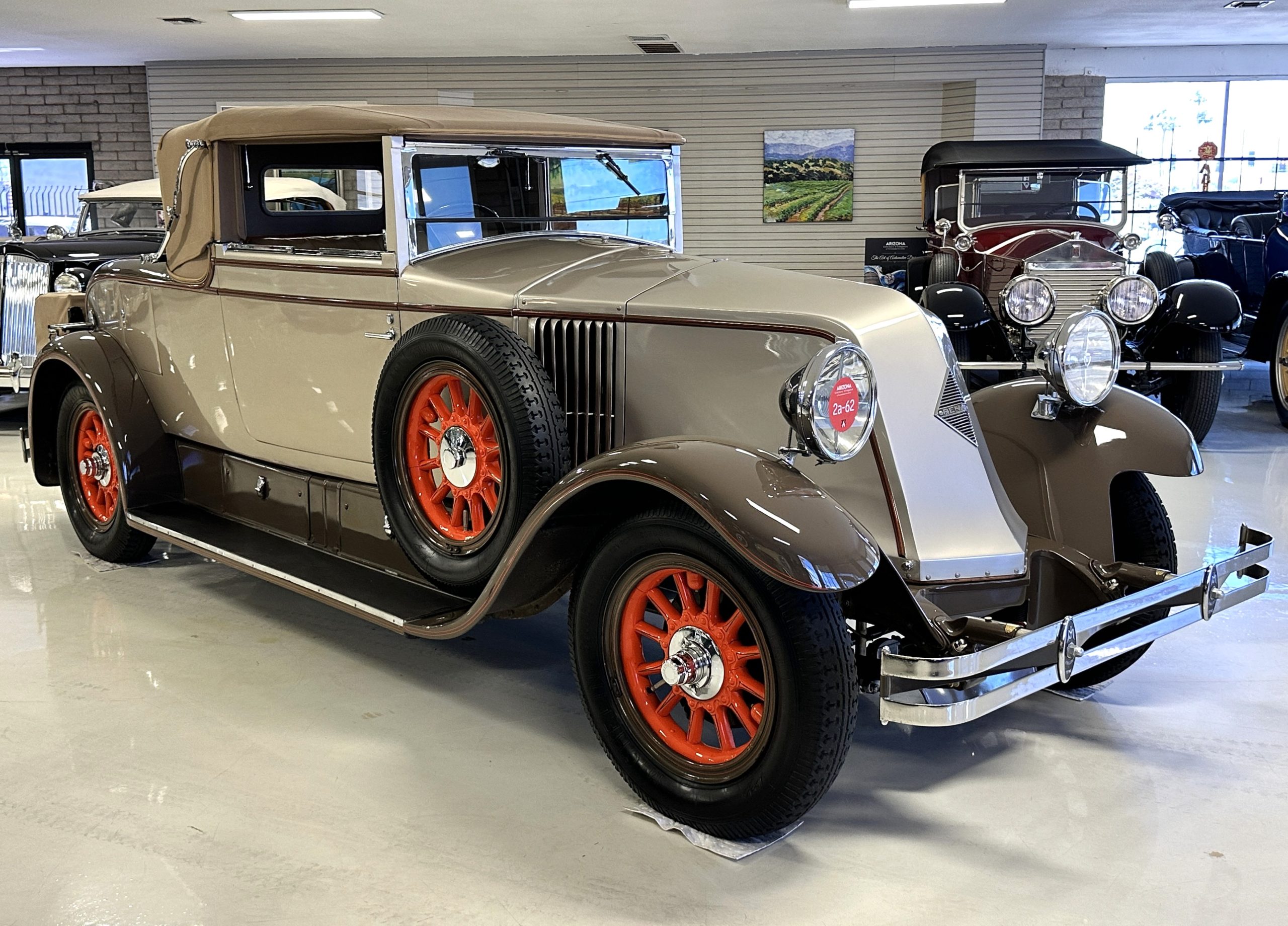 Finished in champagne and brown with orange accents, the car is powered by a 3,181cc L-head inline-six that features a single updraft carburetor, distributor and coil ignition, and a radiator mounted rearward of the engine. Additional features include a four-speed manual transmission, mechanically actuated four-wheel drum brakes with servo assistance, hydraulic shock absorbers, orange-painted wood-spoke wheels, JM bumper shocks, a beige convertible top, tan leather upholstery over three-place seating and a rumble seat, and a rear-mounted luggage trunk with fitted luggage.