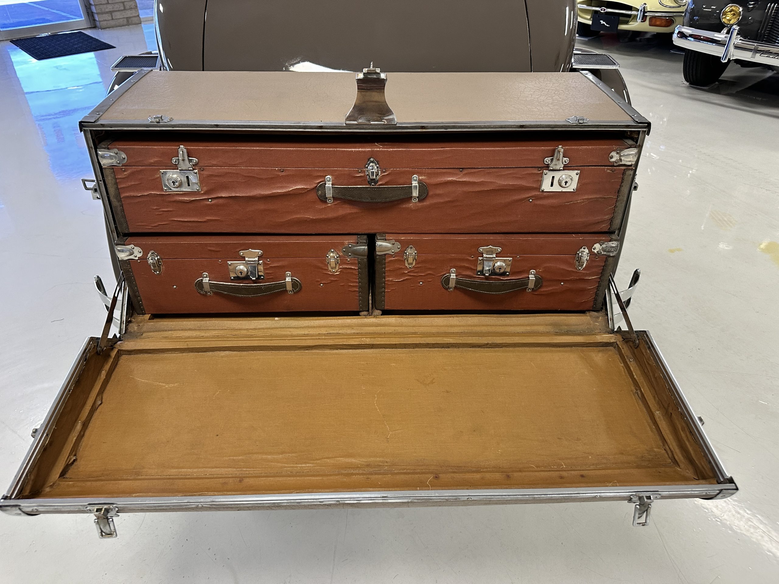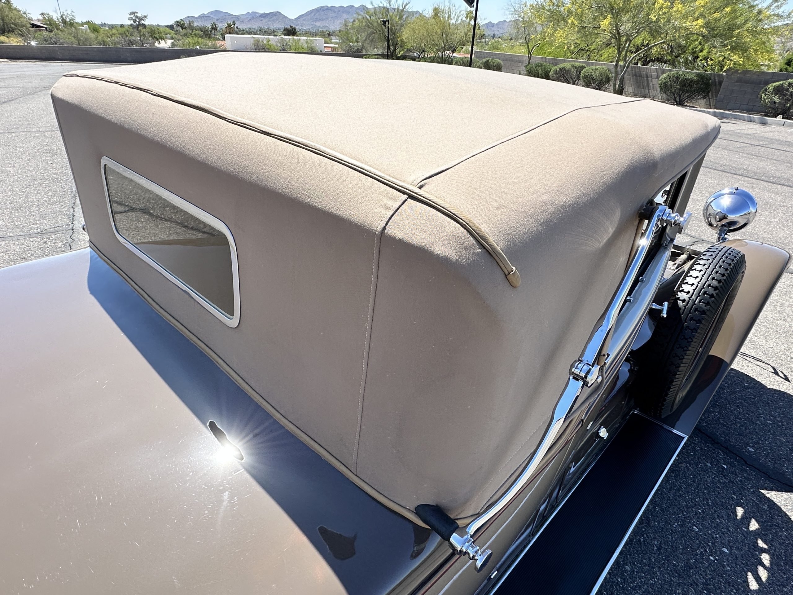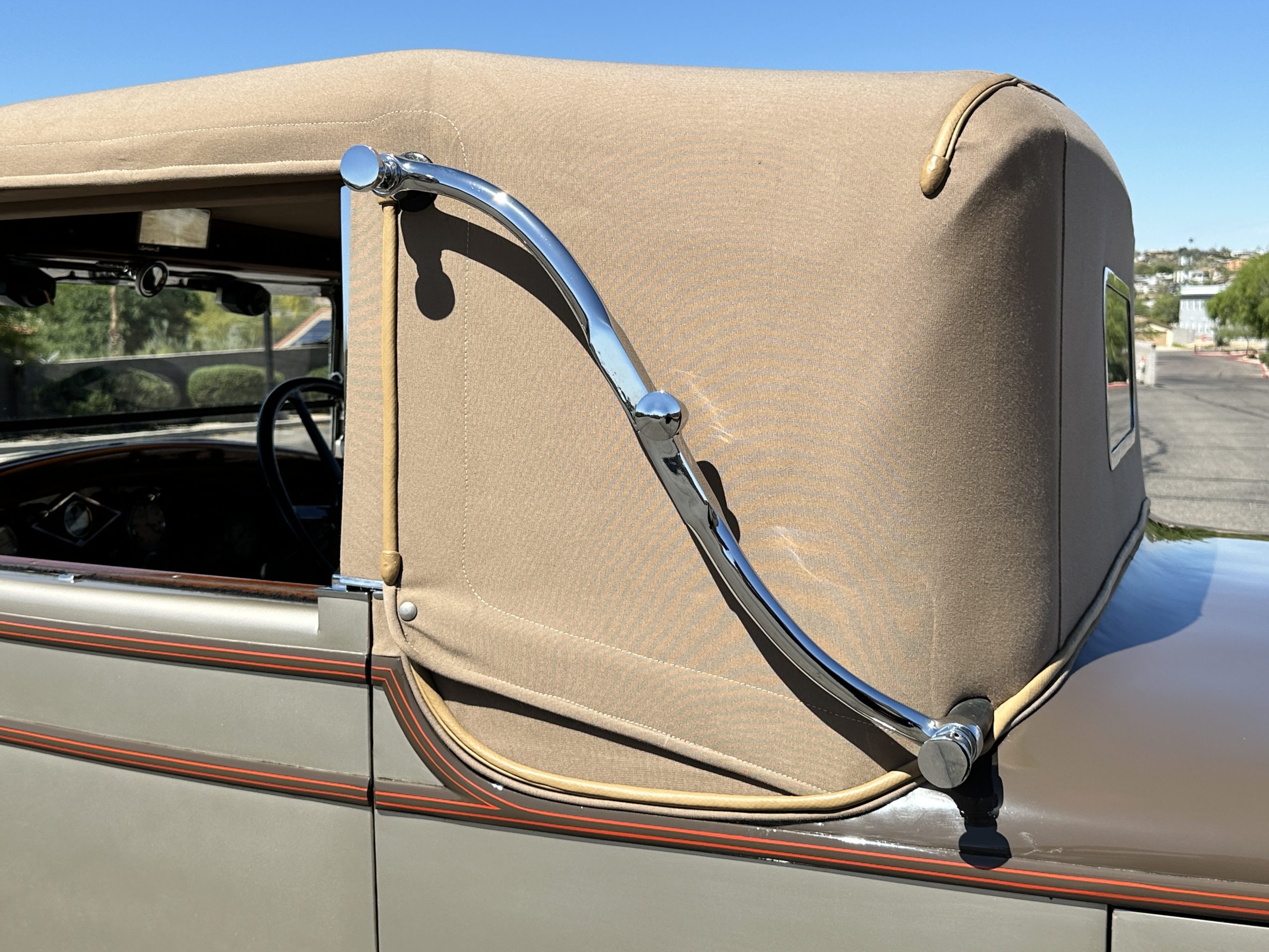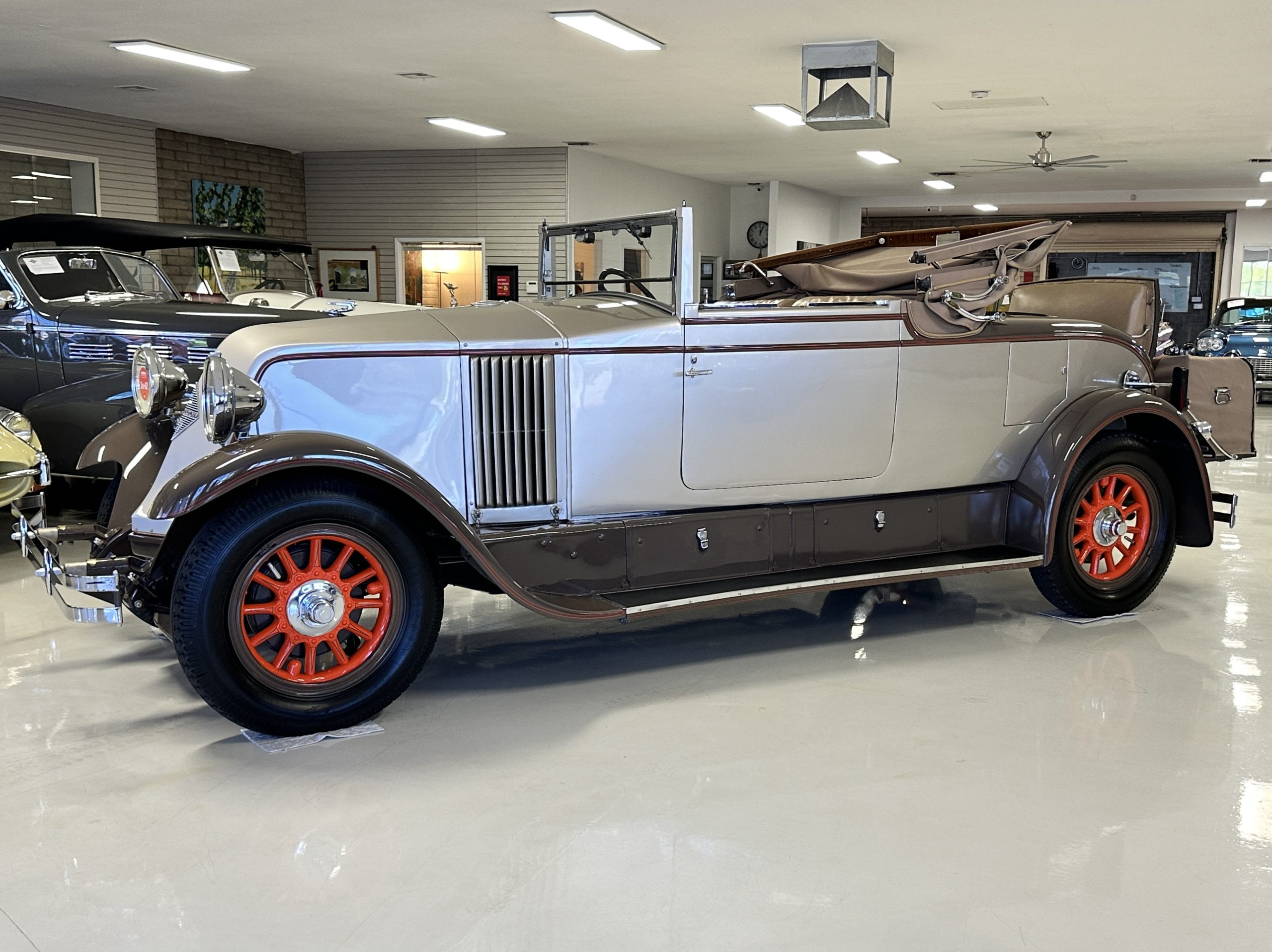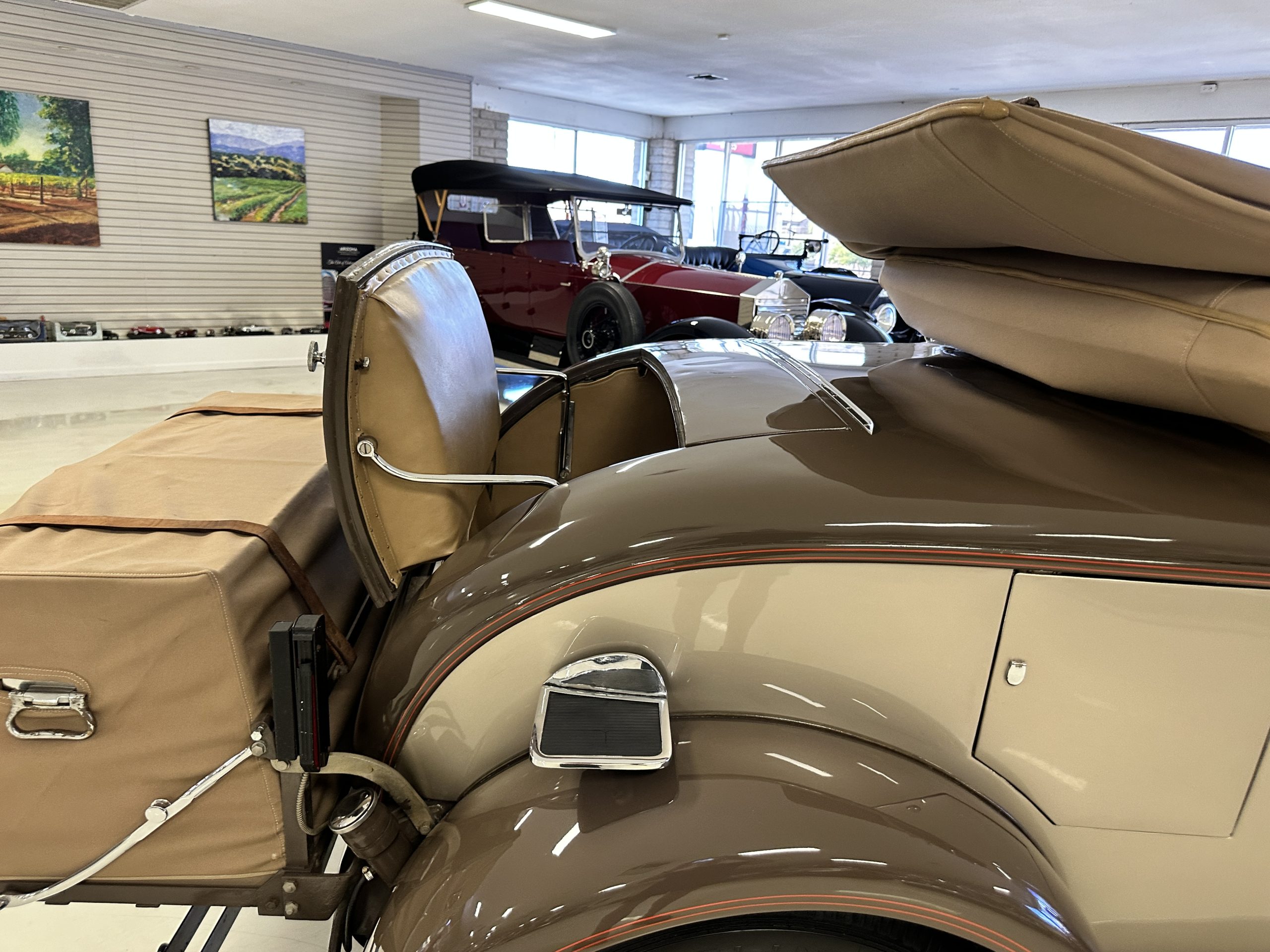 Finished in champagne and brown with orange accents, the car is powered by a 3,181cc L-head inline-six that features a single updraft carburetor, distributor and coil ignition, and a radiator mounted rearward of the engine. Additional features include a four-speed manual transmission, mechanically actuated four-wheel drum brakes with servo assistance, hydraulic shock absorbers, orange-painted wood-spoke wheels, JM bumper shocks, a beige convertible top, tan leather upholstery over three-place seating and a rumble seat, and a rear-mounted luggage trunk with fitted luggage.