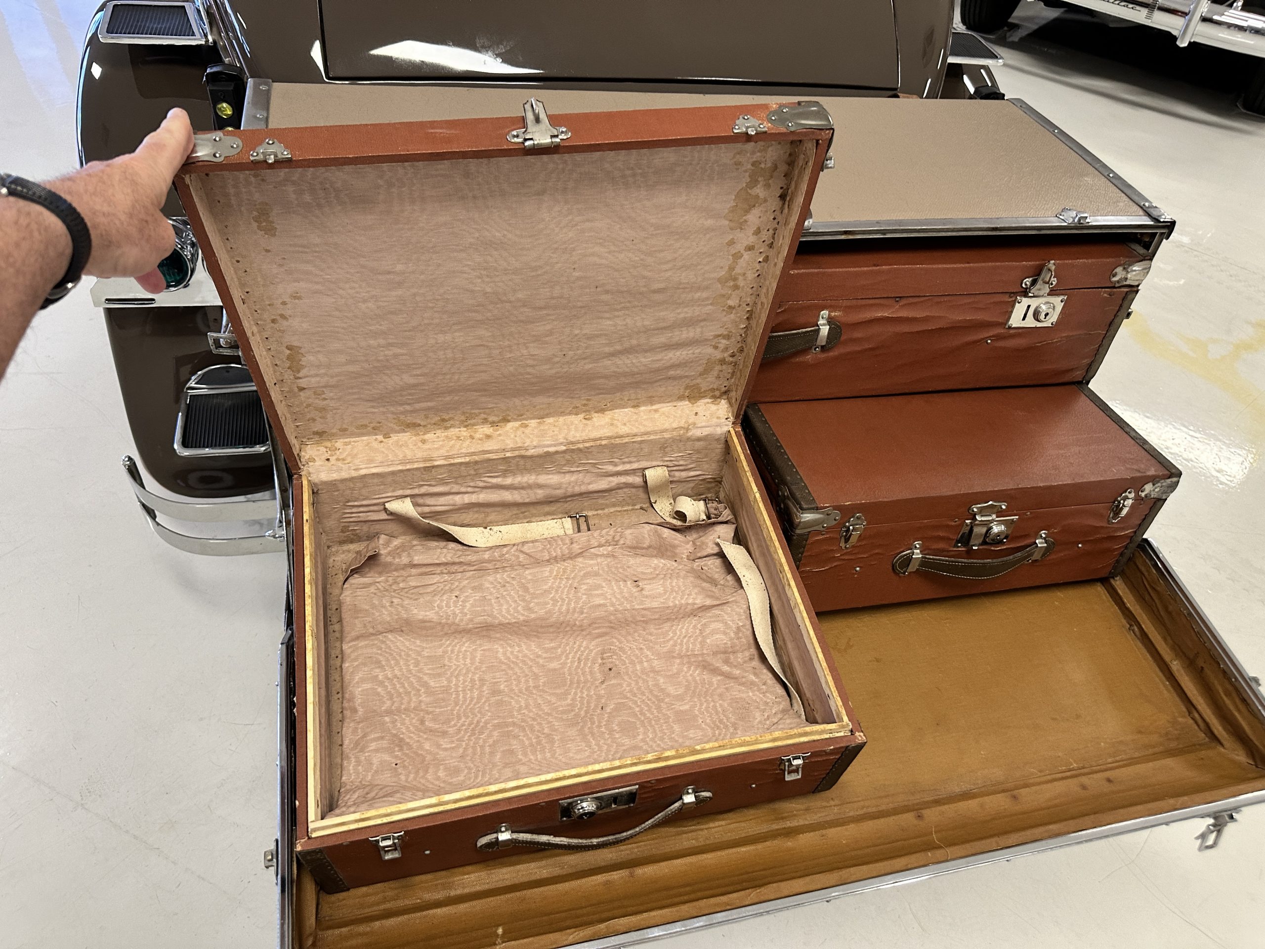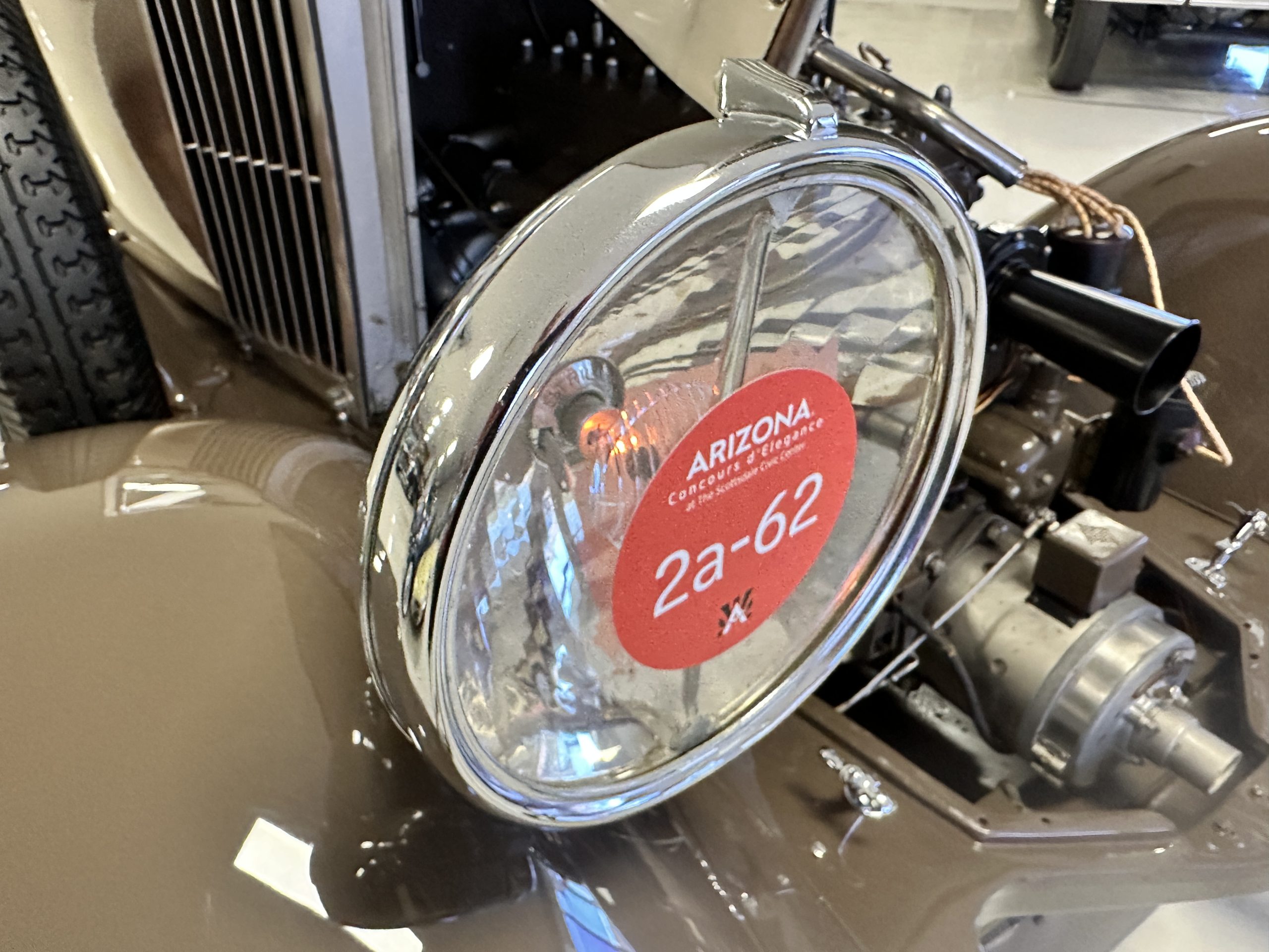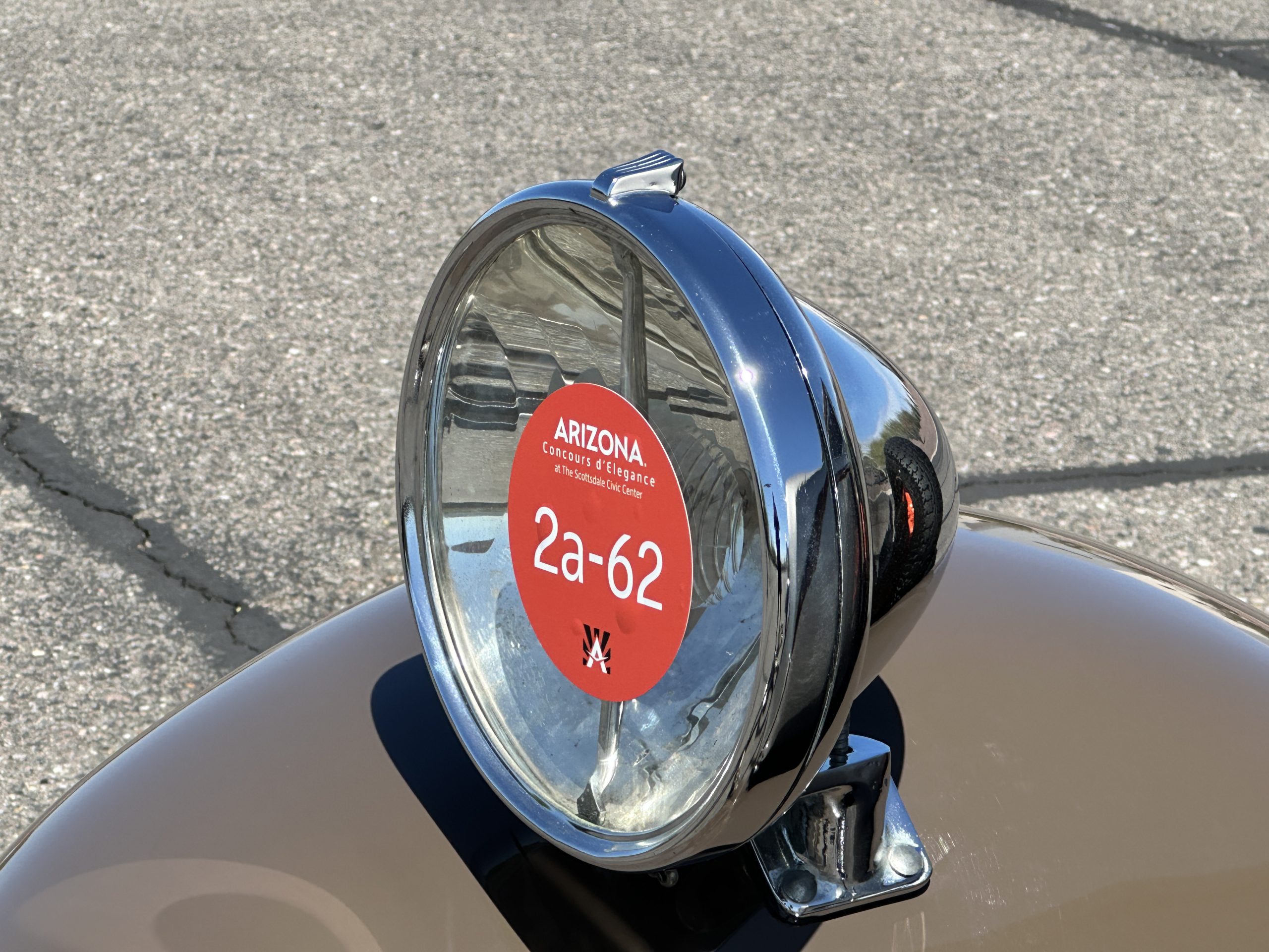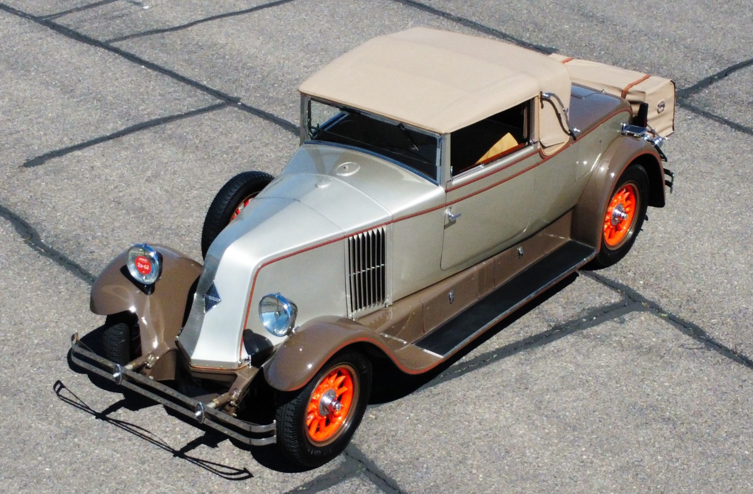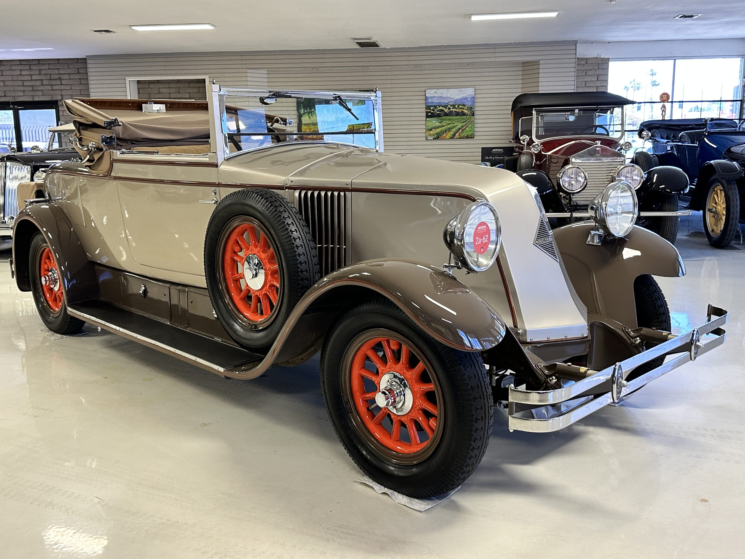 Finished in champagne and brown with orange accents, the car is powered by a 3,181cc L-head inline-six that features a single updraft carburetor, distributor and coil ignition, and a radiator mounted rearward of the engine. Additional features include a four-speed manual transmission, mechanically actuated four-wheel drum brakes with servo assistance, hydraulic shock absorbers, orange-painted wood-spoke wheels, JM bumper shocks, a beige convertible top, tan leather upholstery over three-place seating and a rumble seat, and a rear-mounted luggage trunk with fitted luggage.
