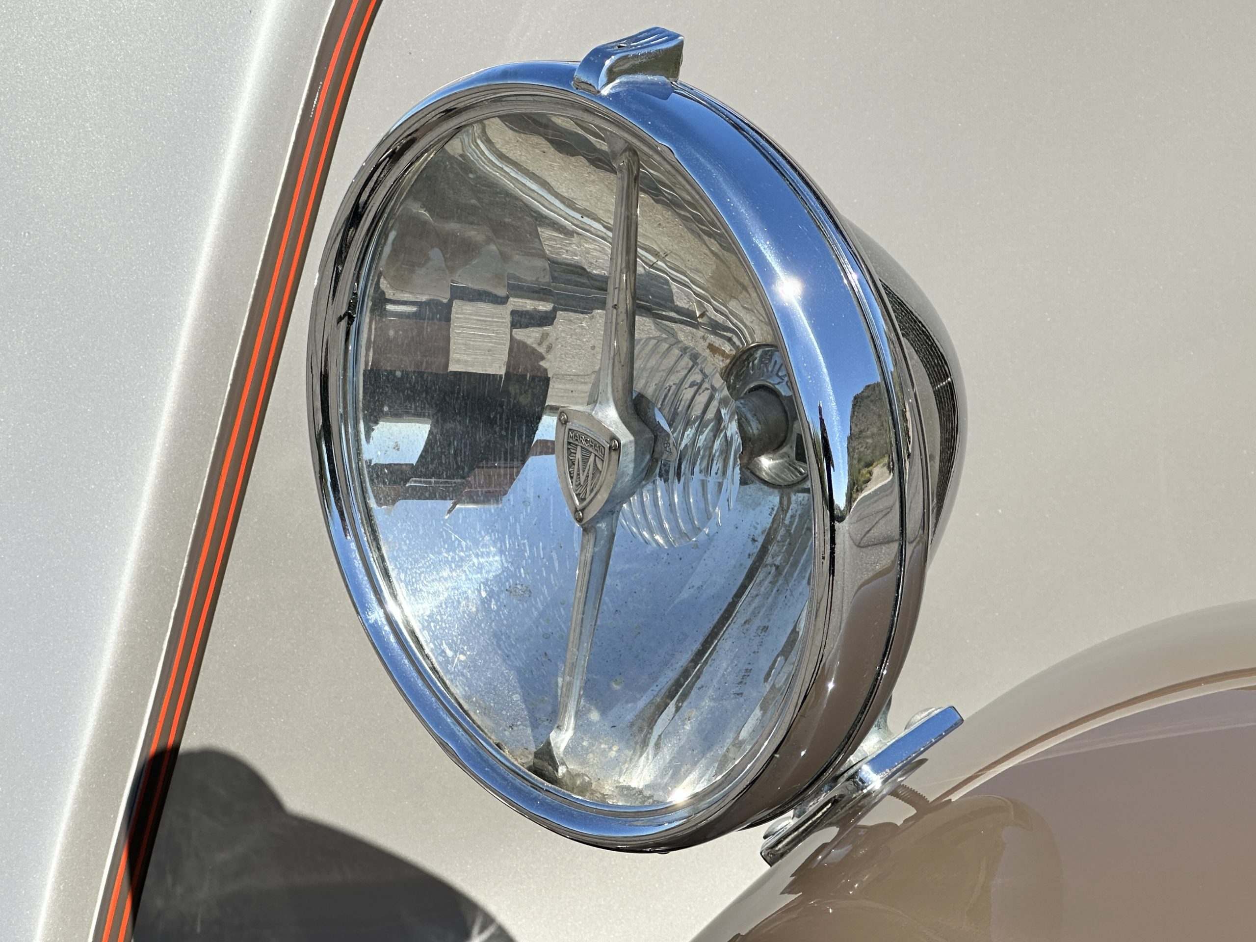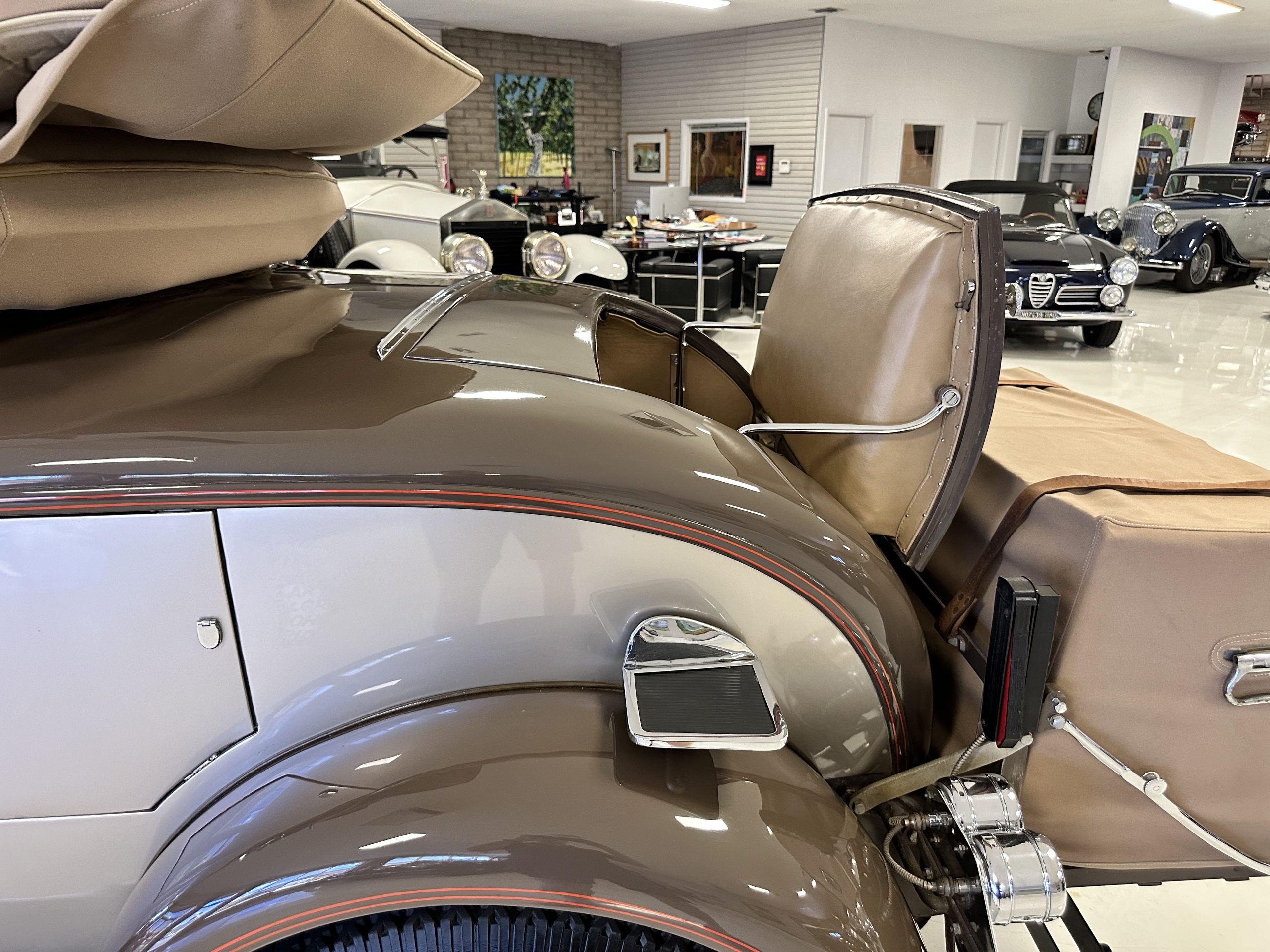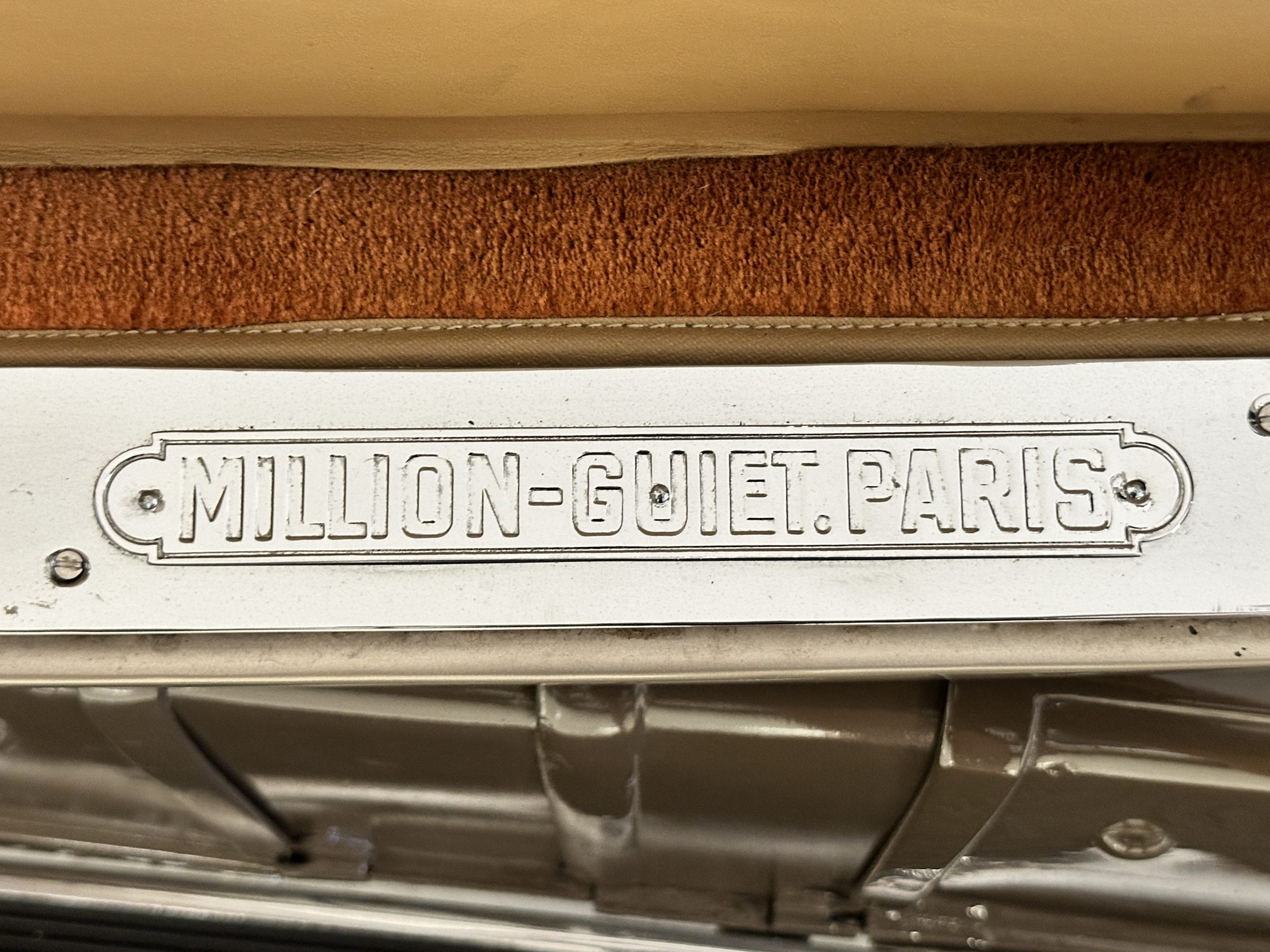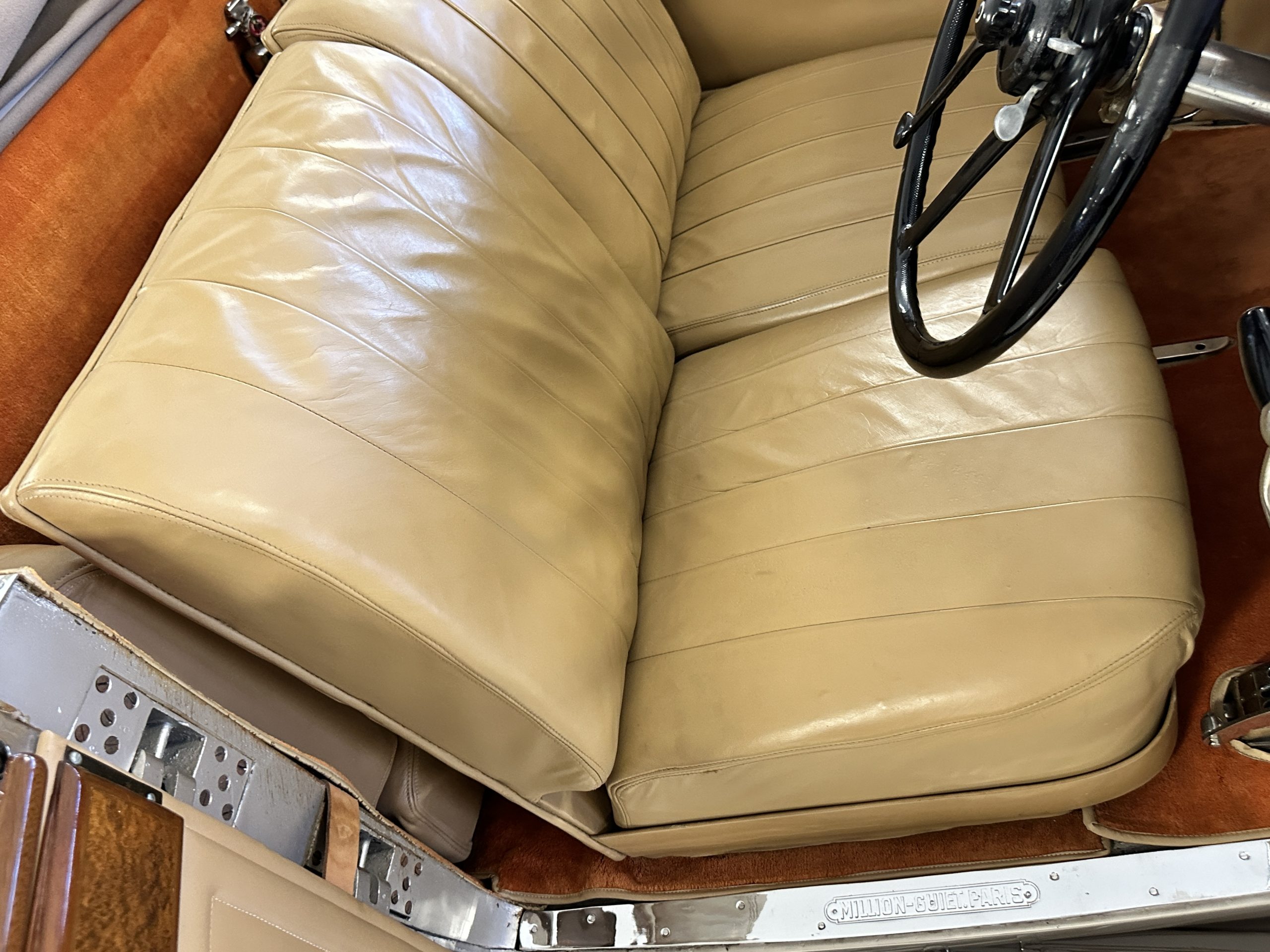 This example’s Million-Guiet two-door open coachwork was separated from the frame for repairs during the refurbishment performed between 1989 and 1990. The car was repainted during the project in its current color scheme of beige and brown with orange pinstripes and wheels, replacing the original two-tone green combination. Paint repair has been performed in 2022. Features include a sloping nose profile ahead of a louvered radiator shroud, front and rear bumpers mounted on JM Pare-Choc shock absorbers, Marchal headlights, a tilt-out windshield, rear-hinged doors, trafficators, a beige convertible top, and a fold-down luggage rack hosting a trunk with fitted luggage under a beige canvas cover.