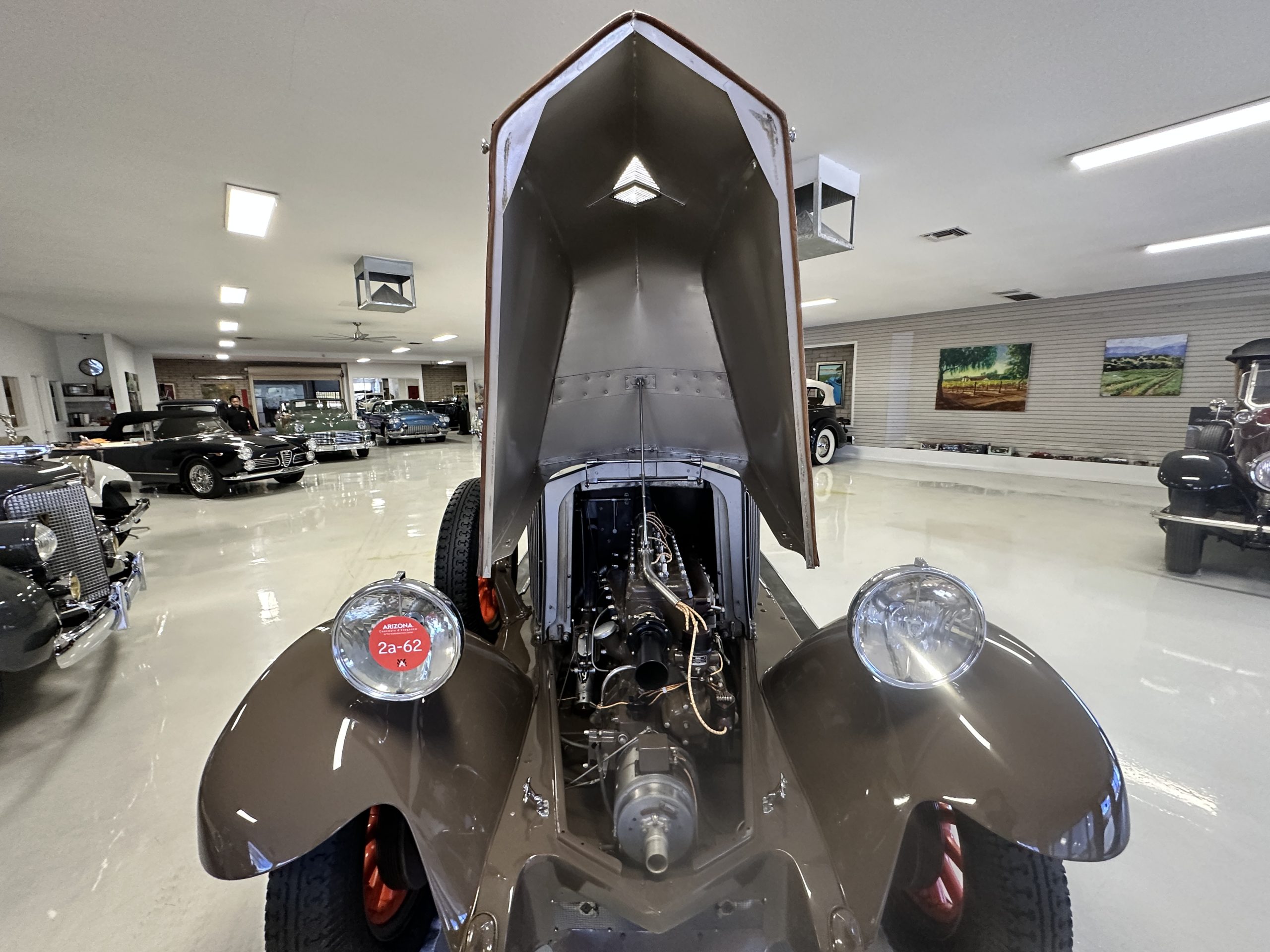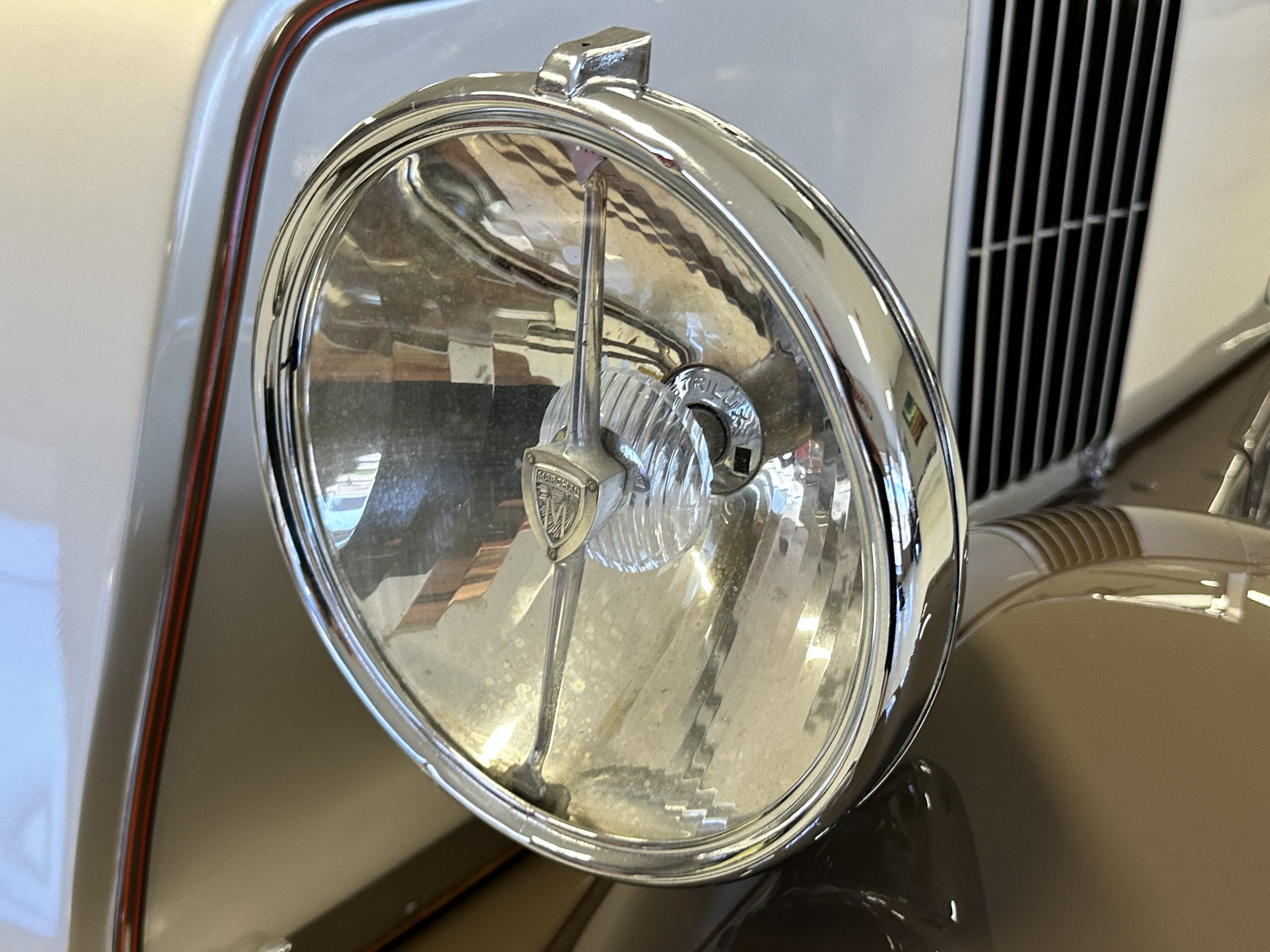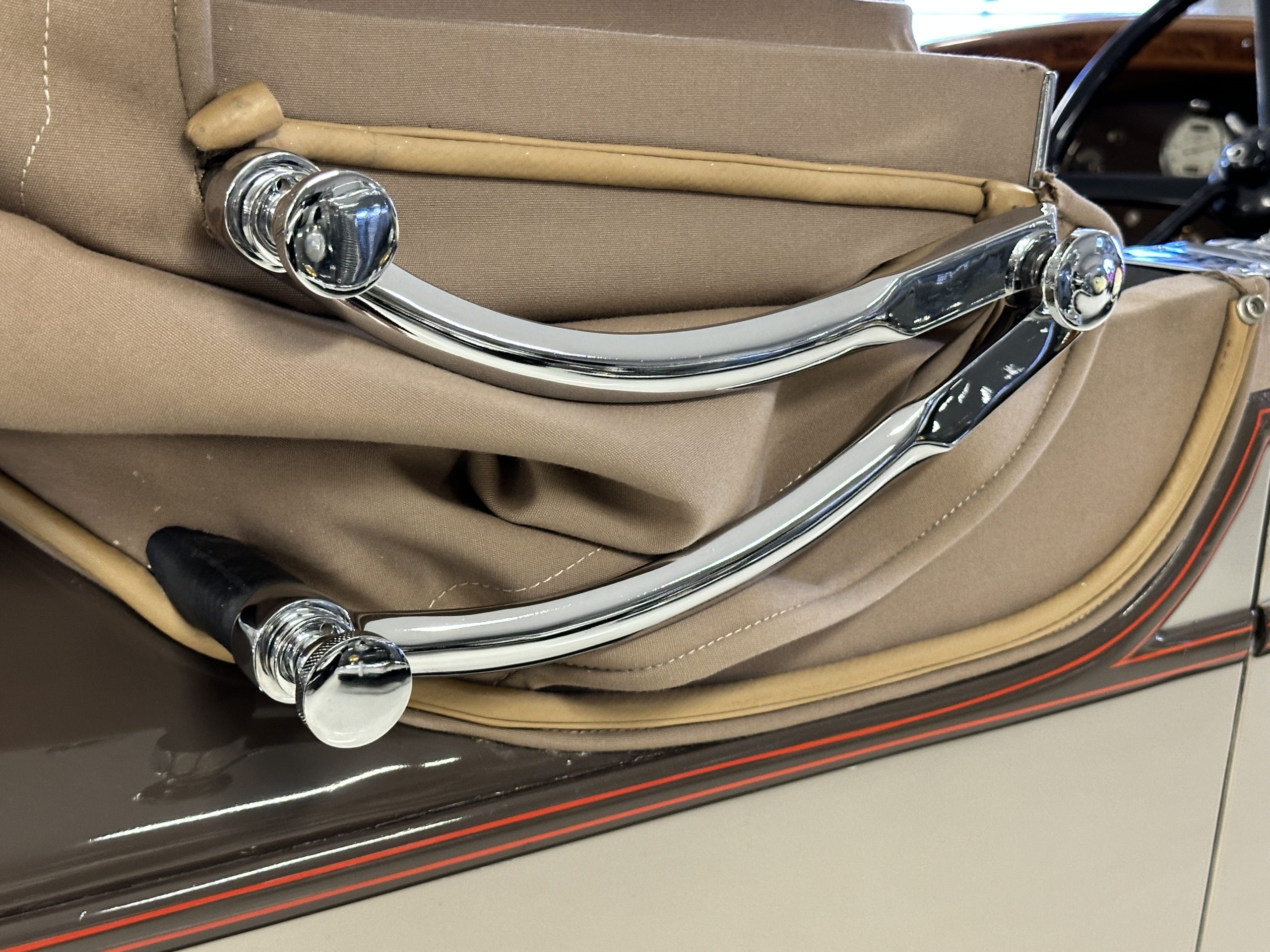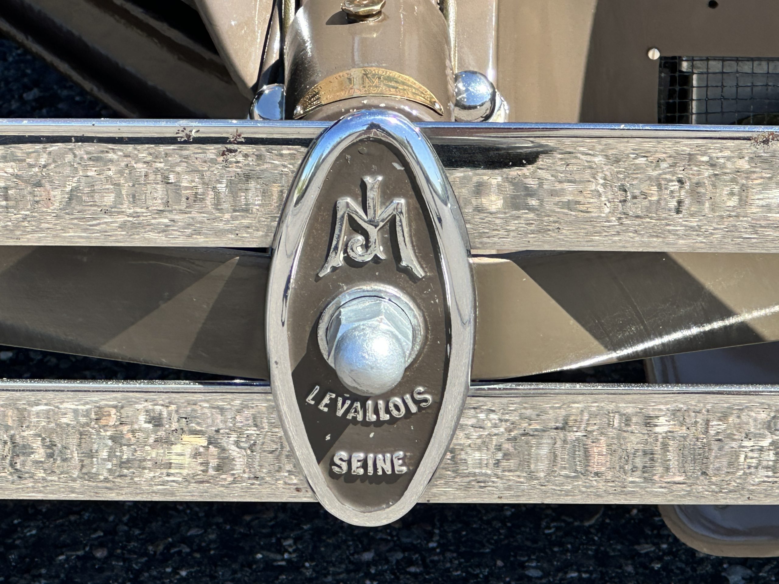 This example’s Million-Guiet two-door open coachwork was separated from the frame for repairs during the refurbishment performed between 1989 and 1990. The car was repainted during the project in its current color scheme of beige and brown with orange pinstripes and wheels, replacing the original two-tone green combination. Paint repair has been performed in 2022. Features include a sloping nose profile ahead of a louvered radiator shroud, front and rear bumpers mounted on JM Pare-Choc shock absorbers, Marchal headlights, a tilt-out windshield, rear-hinged doors, trafficators, a beige convertible top, and a fold-down luggage rack hosting a trunk with fitted luggage under a beige canvas cover.