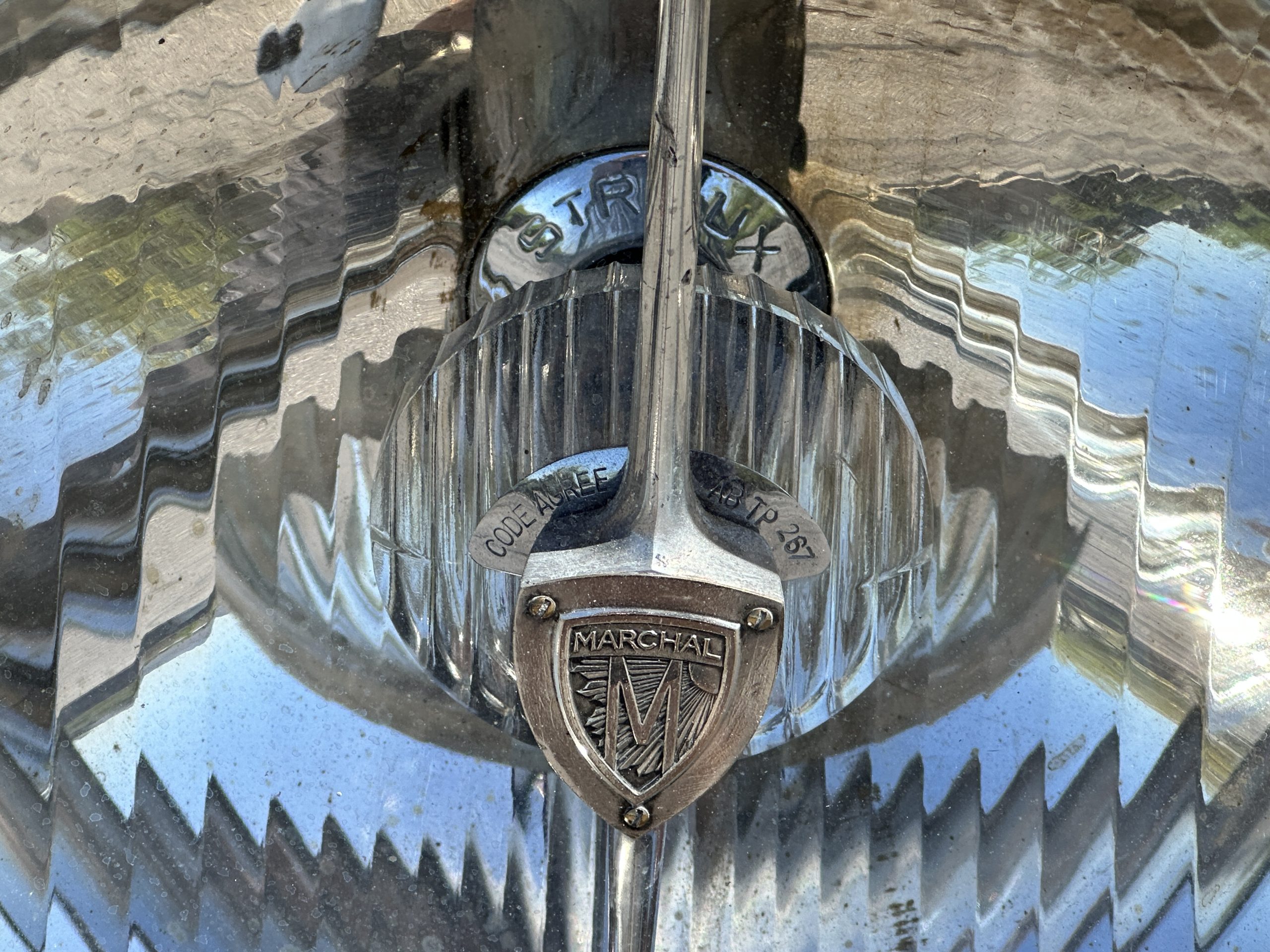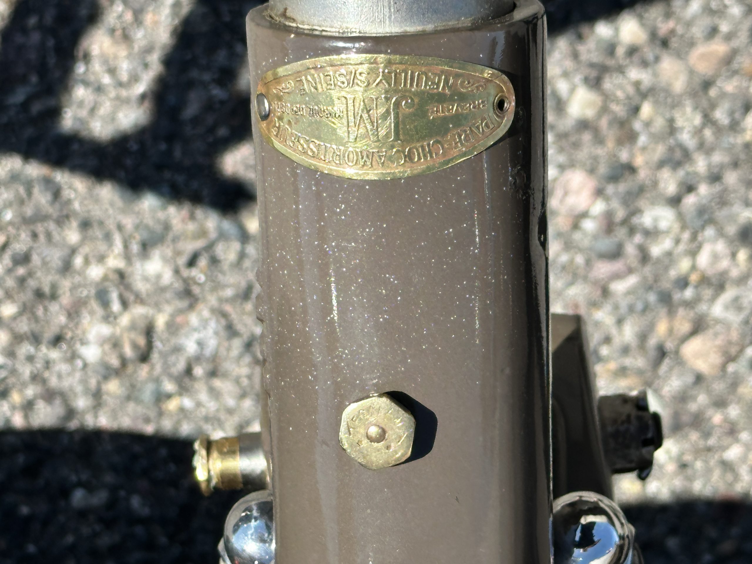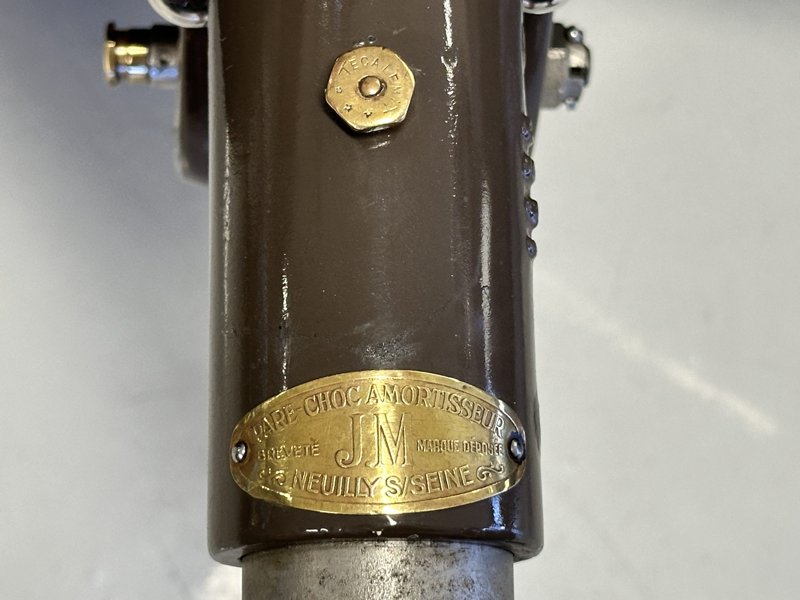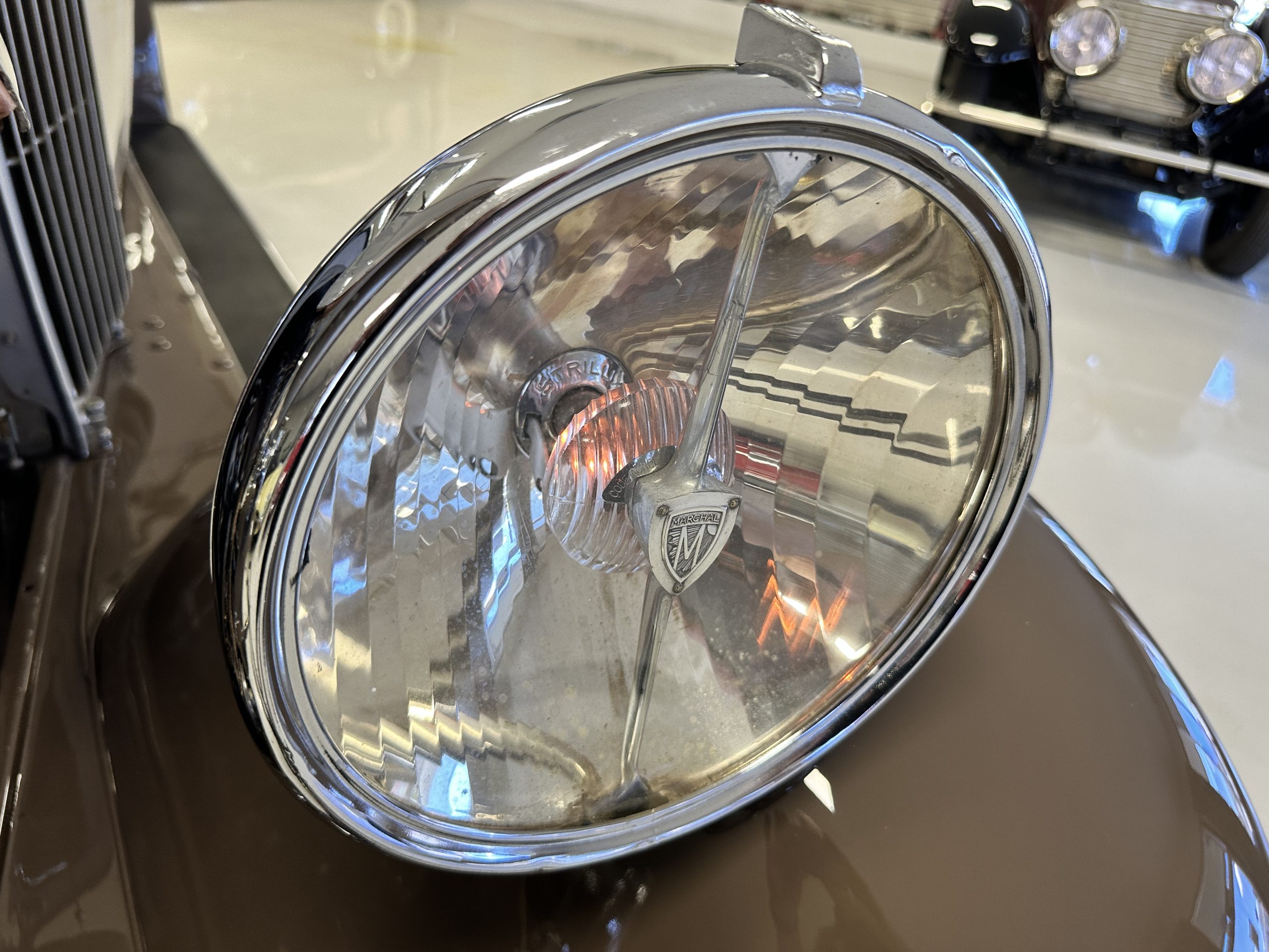 This example’s Million-Guiet two-door open coachwork was separated from the frame for repairs during the refurbishment performed between 1989 and 1990. The car was repainted during the project in its current color scheme of beige and brown with orange pinstripes and wheels, replacing the original two-tone green combination. Paint repair has been performed in 2022. Features include a sloping nose profile ahead of a louvered radiator shroud, front and rear bumpers mounted on JM Pare-Choc shock absorbers, Marchal headlights, a tilt-out windshield, rear-hinged doors, trafficators, a beige convertible top, and a fold-down luggage rack hosting a trunk with fitted luggage under a beige canvas cover.