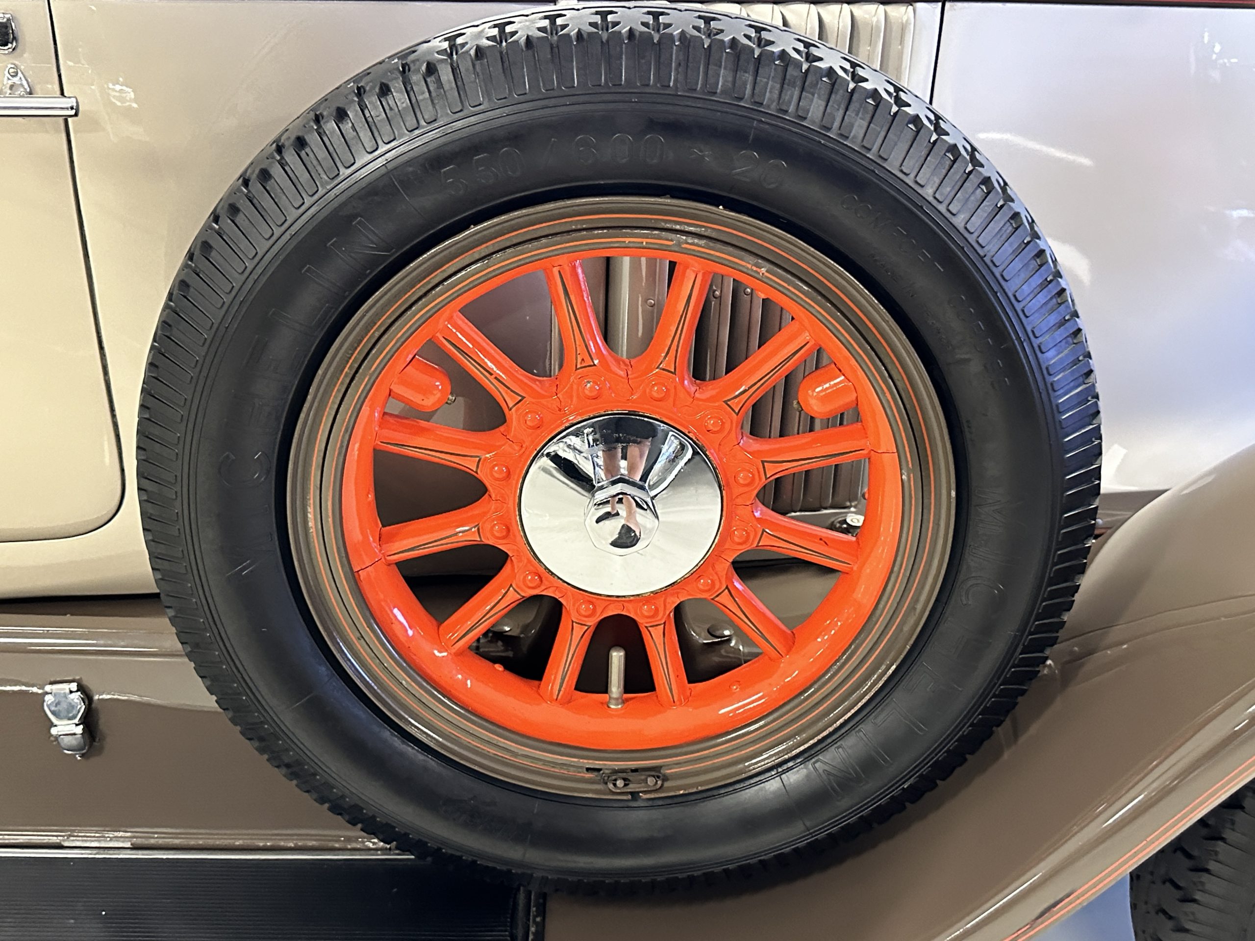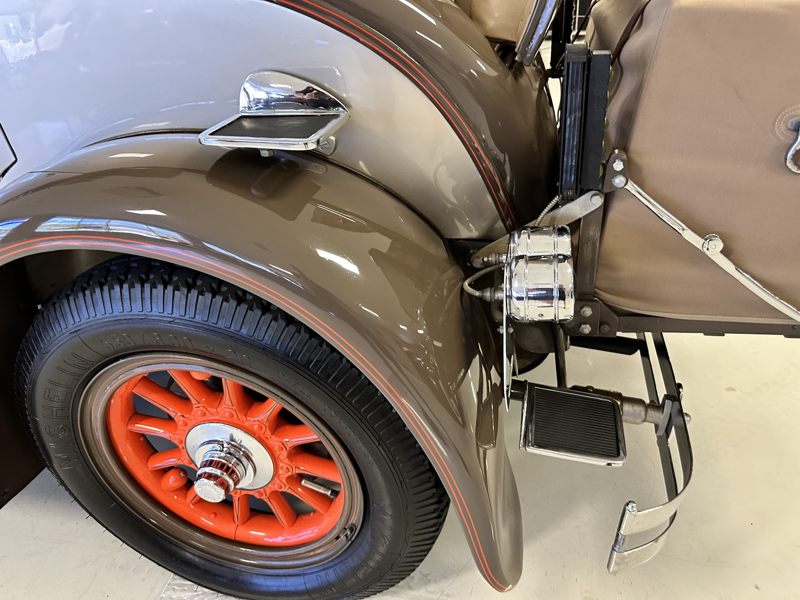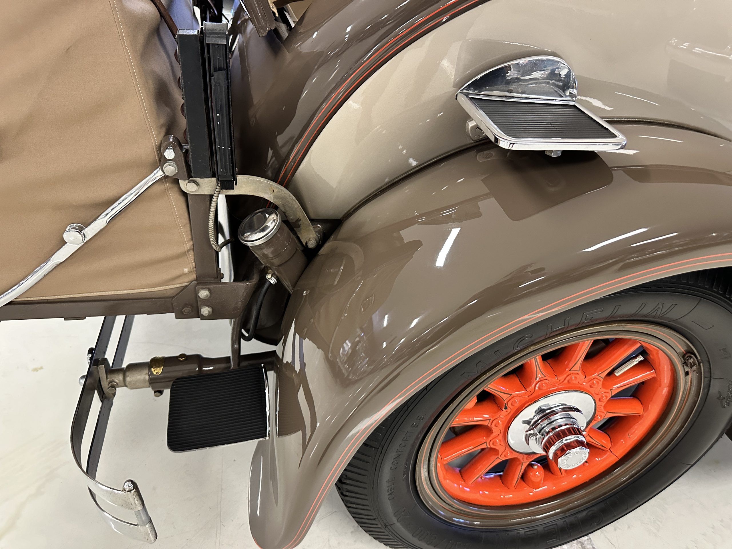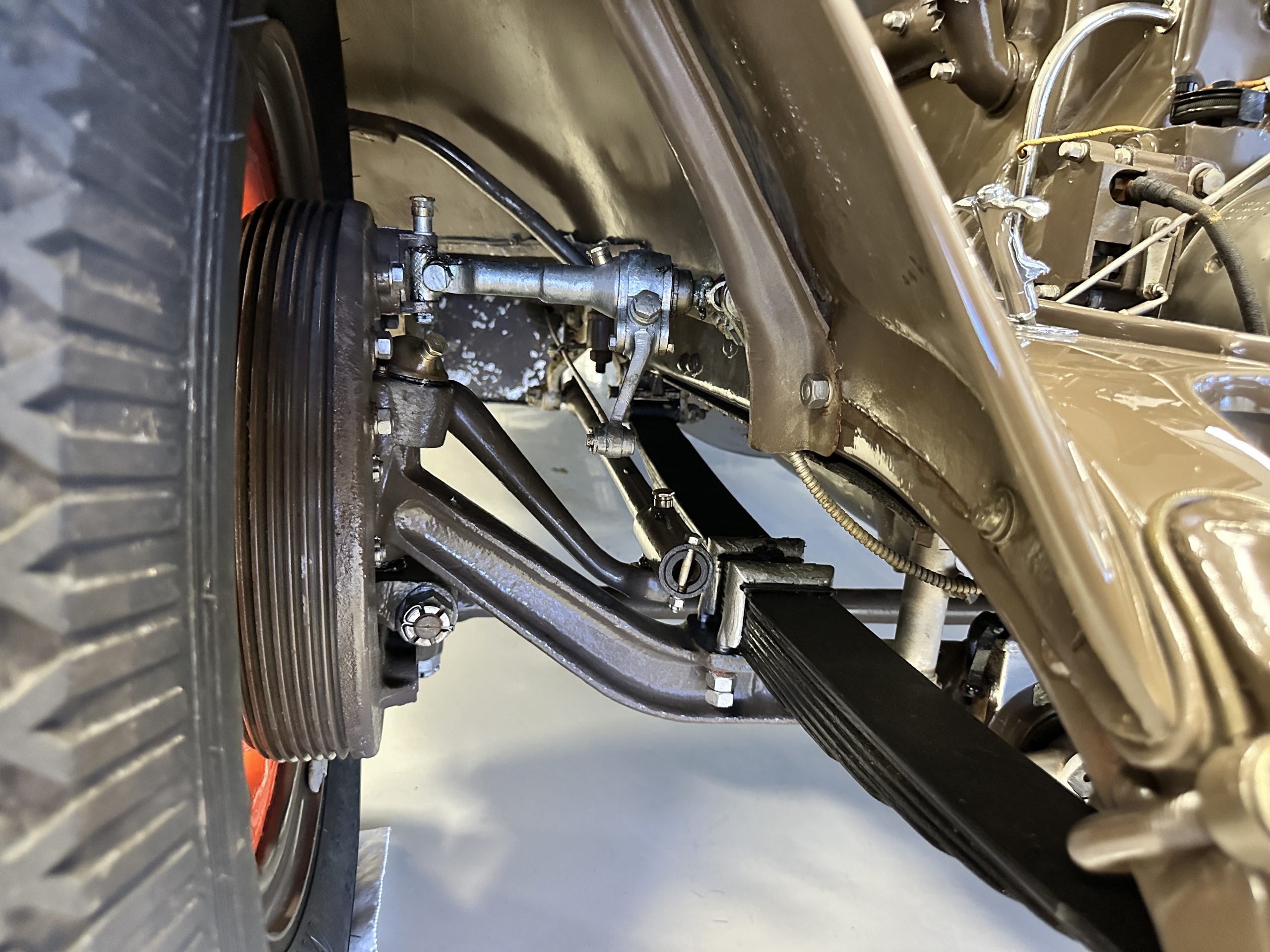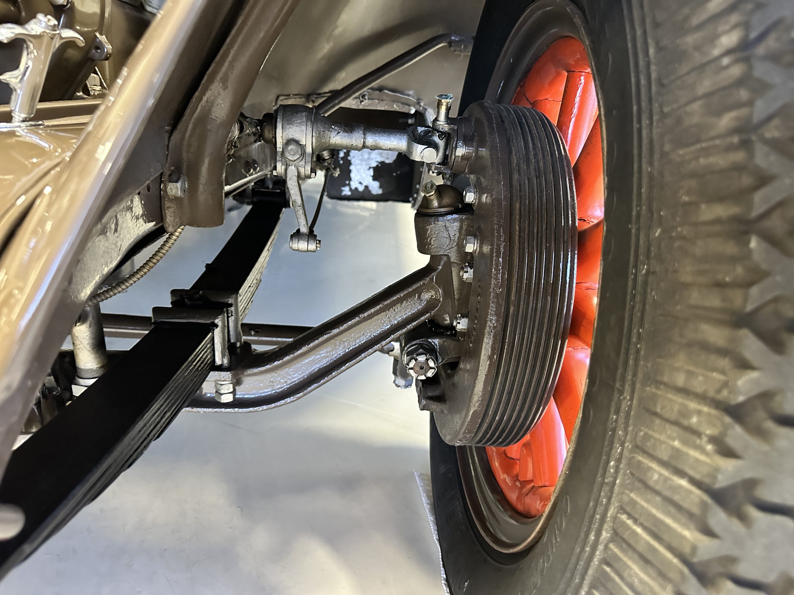 Orange-painted artillery wheels feature nickel plated lock rings and are wrapped in 5.00/6.00×20 Michelin Confort Cord SS tires, as is a side-mount spare. Mechanical actuation of four-wheel drum brakes incorporates a mechanical servo that provides assistance in accordance with the intensity of driver input. The brakes were adjusted in January 2024.
