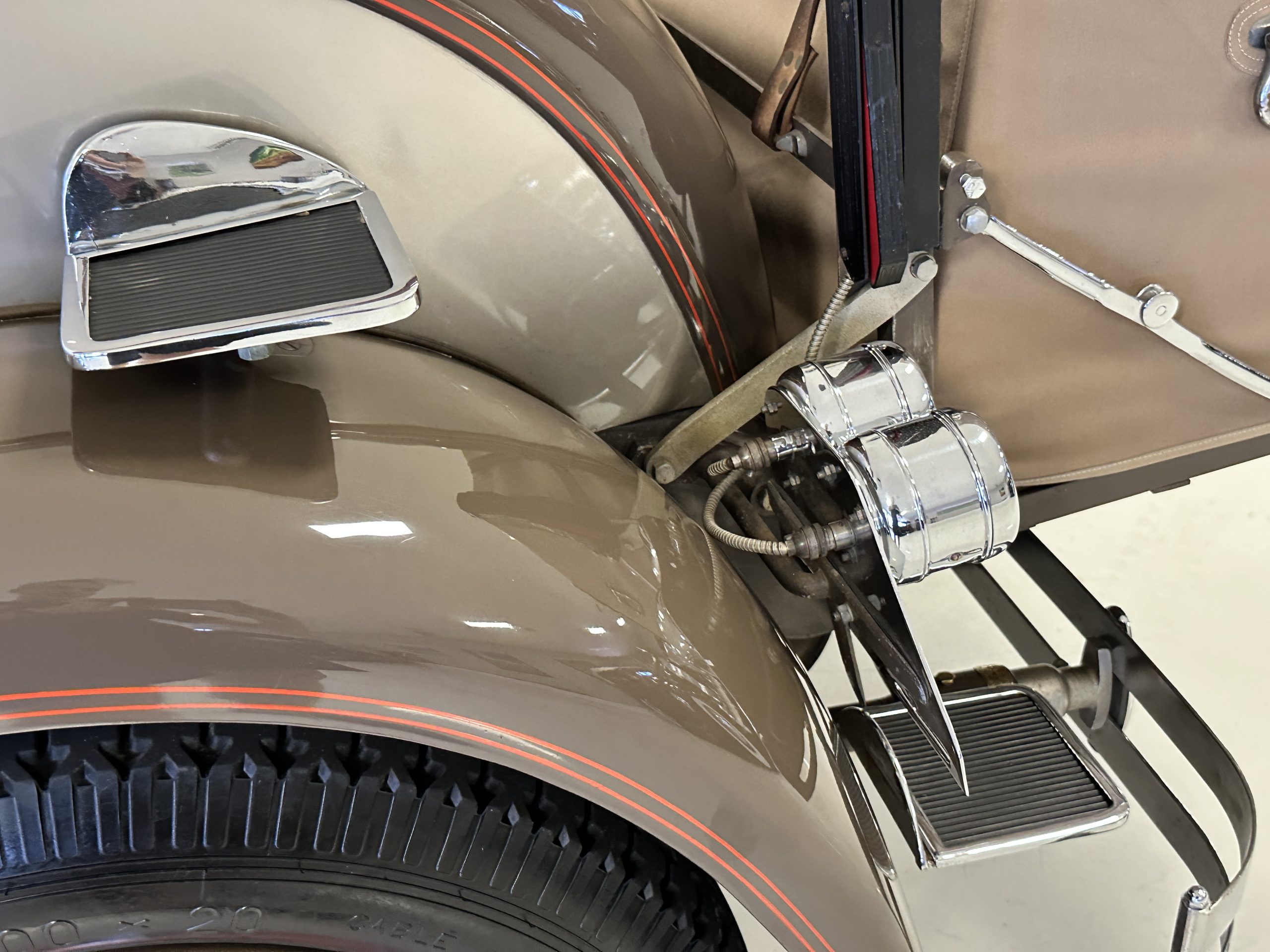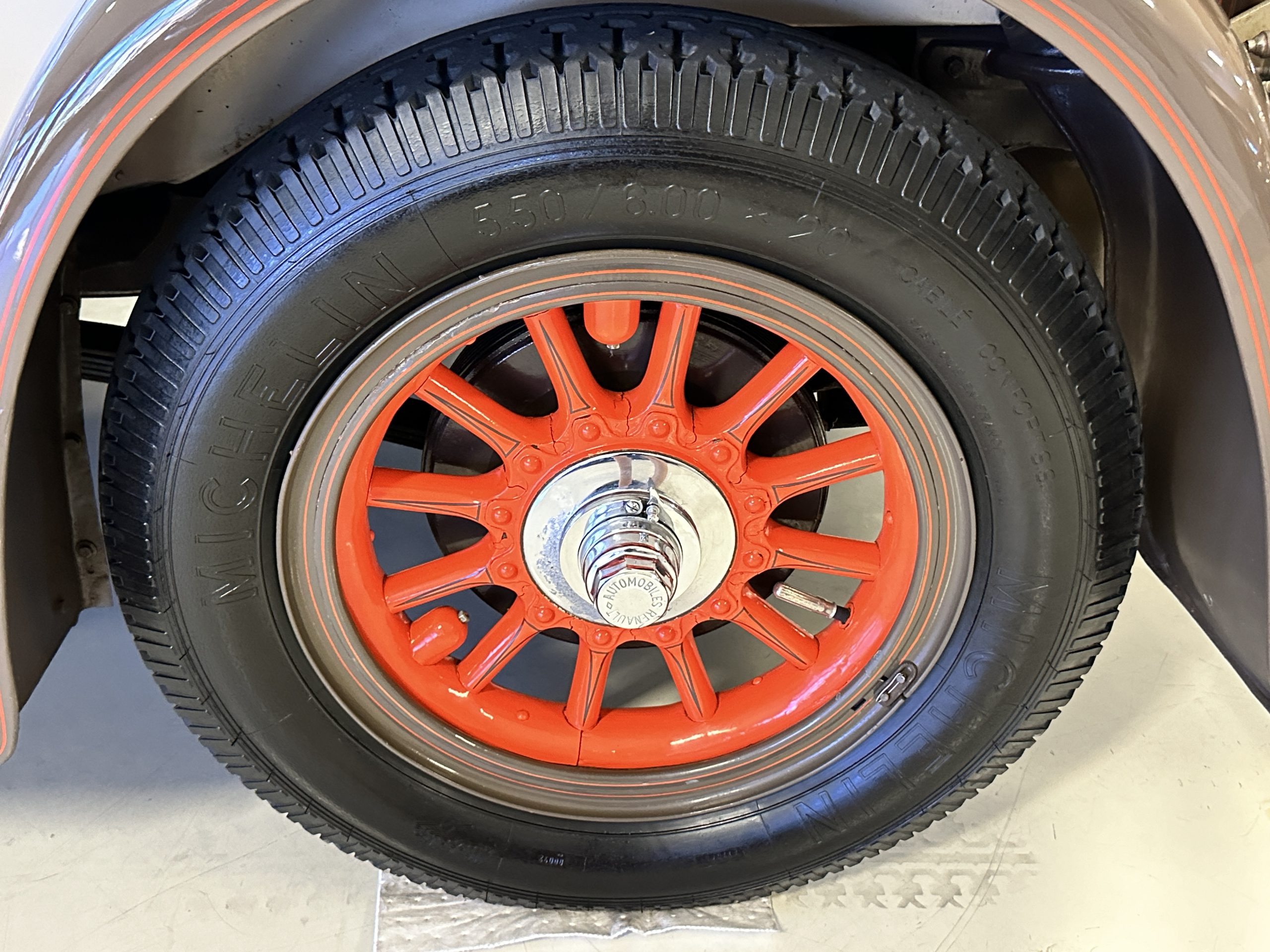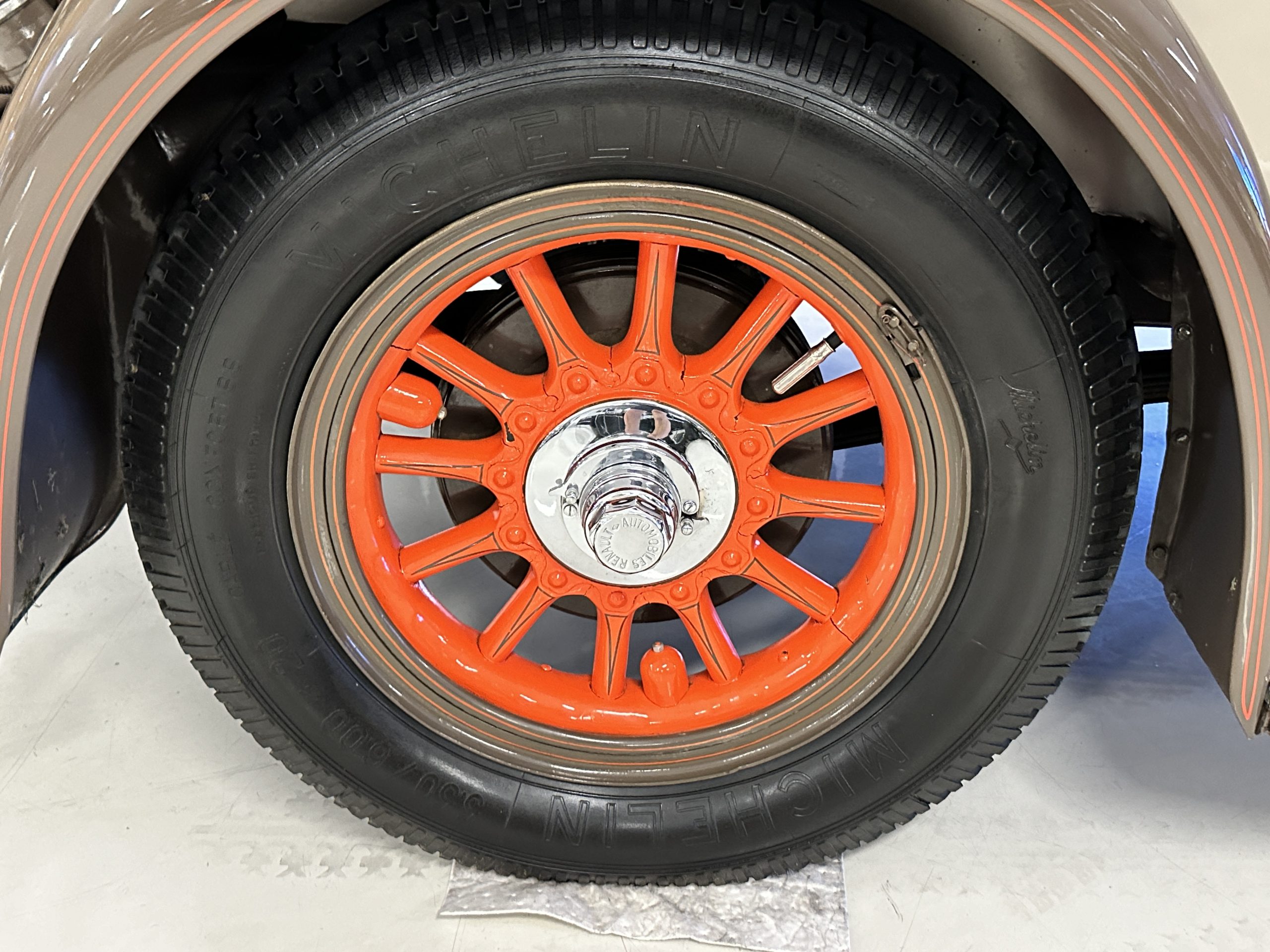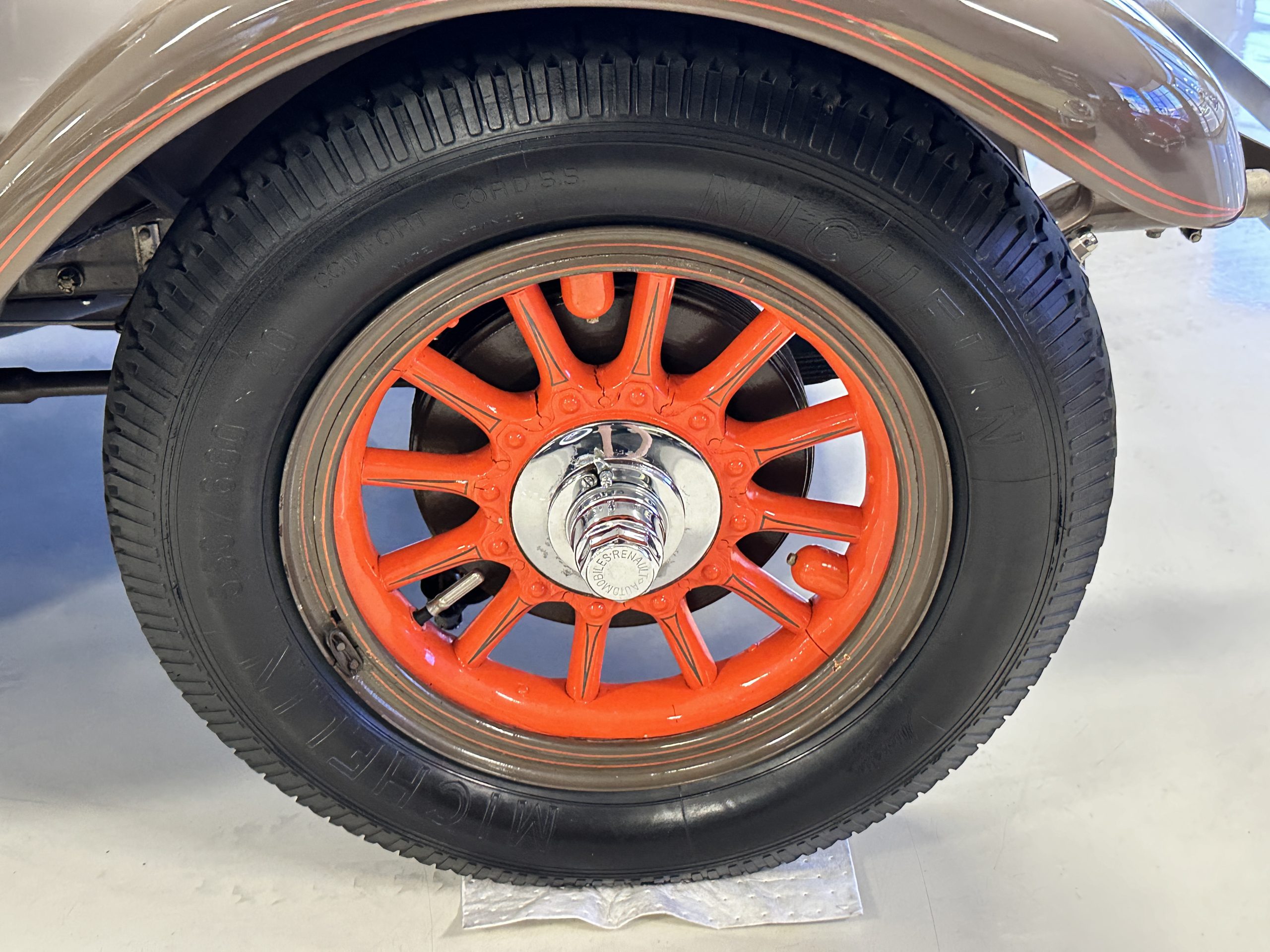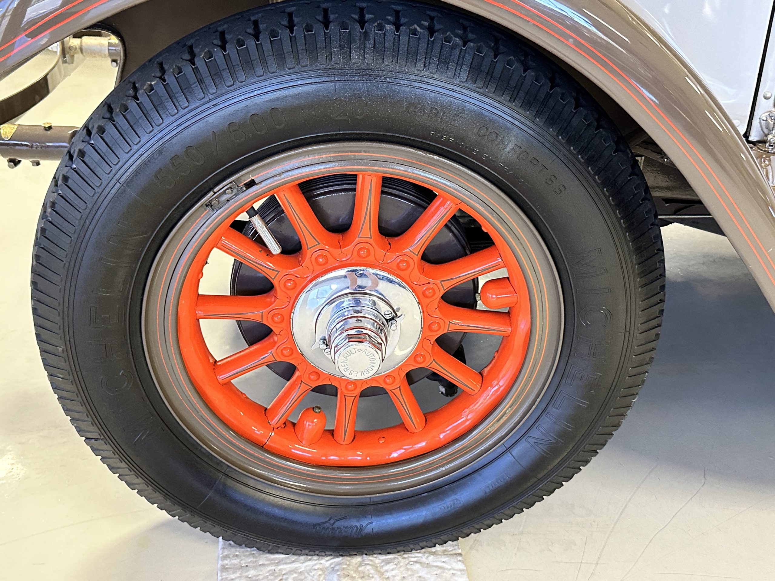 Orange-painted artillery wheels feature nickel plated lock rings and are wrapped in 5.00/6.00×20 Michelin Confort Cord SS tires, as is a side-mount spare. Mechanical actuation of four-wheel drum brakes incorporates a mechanical servo that provides assistance in accordance with the intensity of driver input. The brakes were adjusted in January 2024.