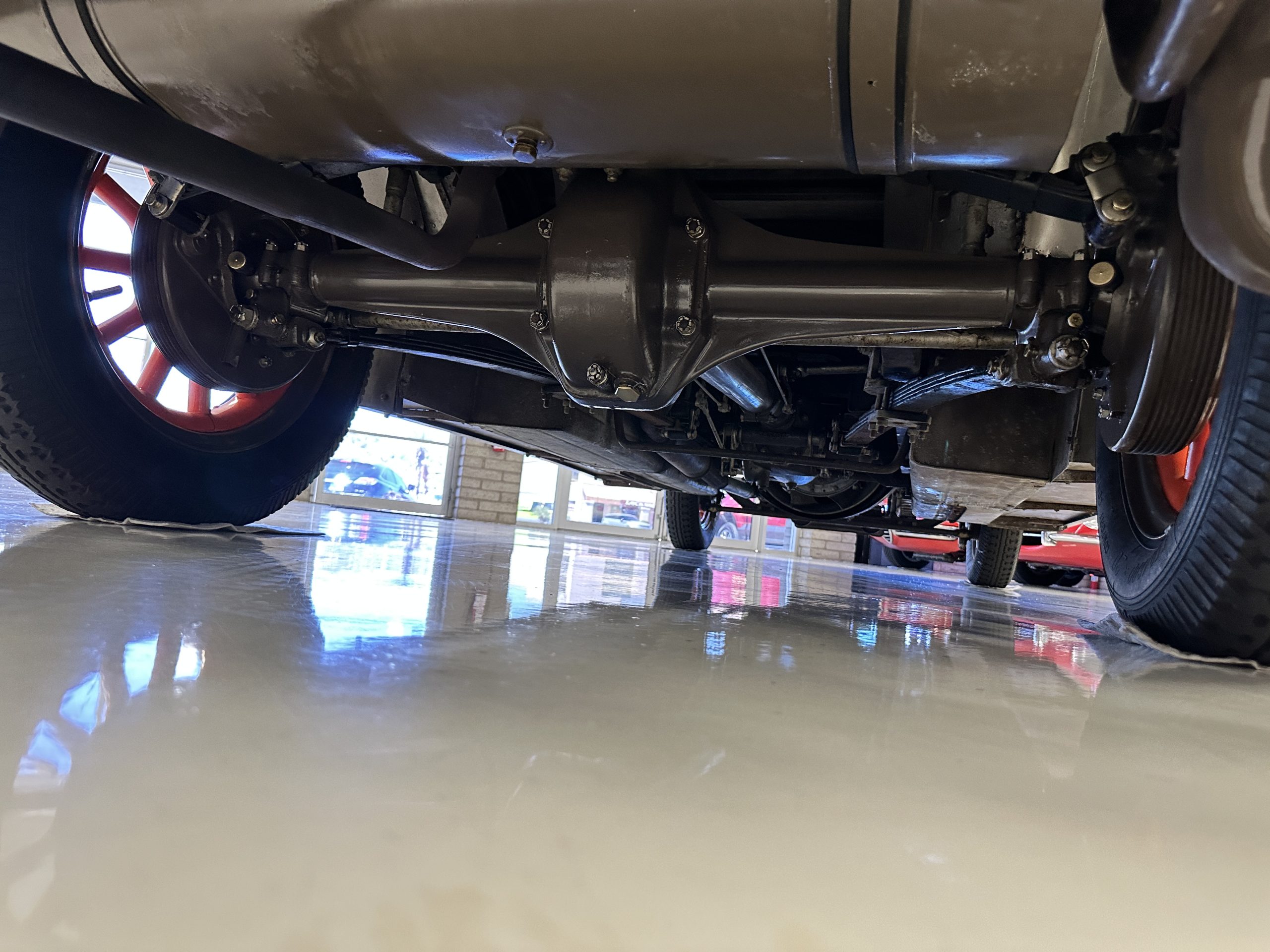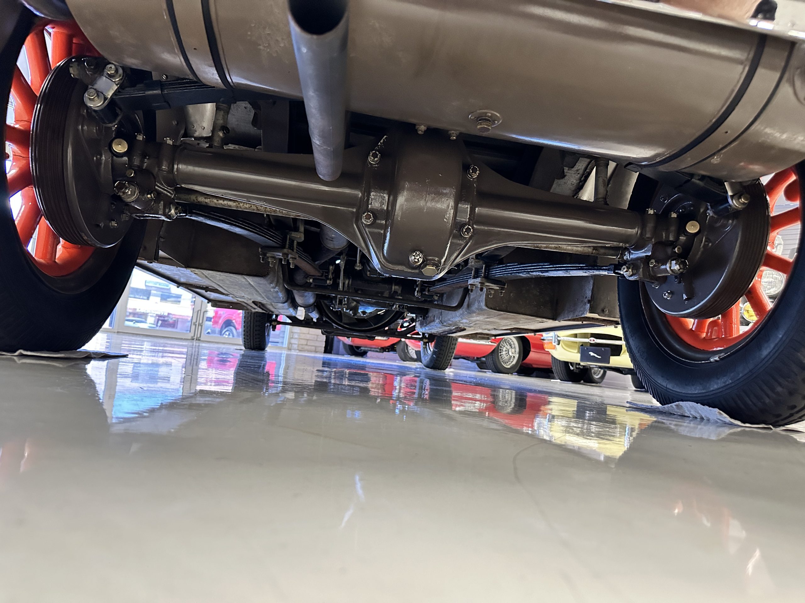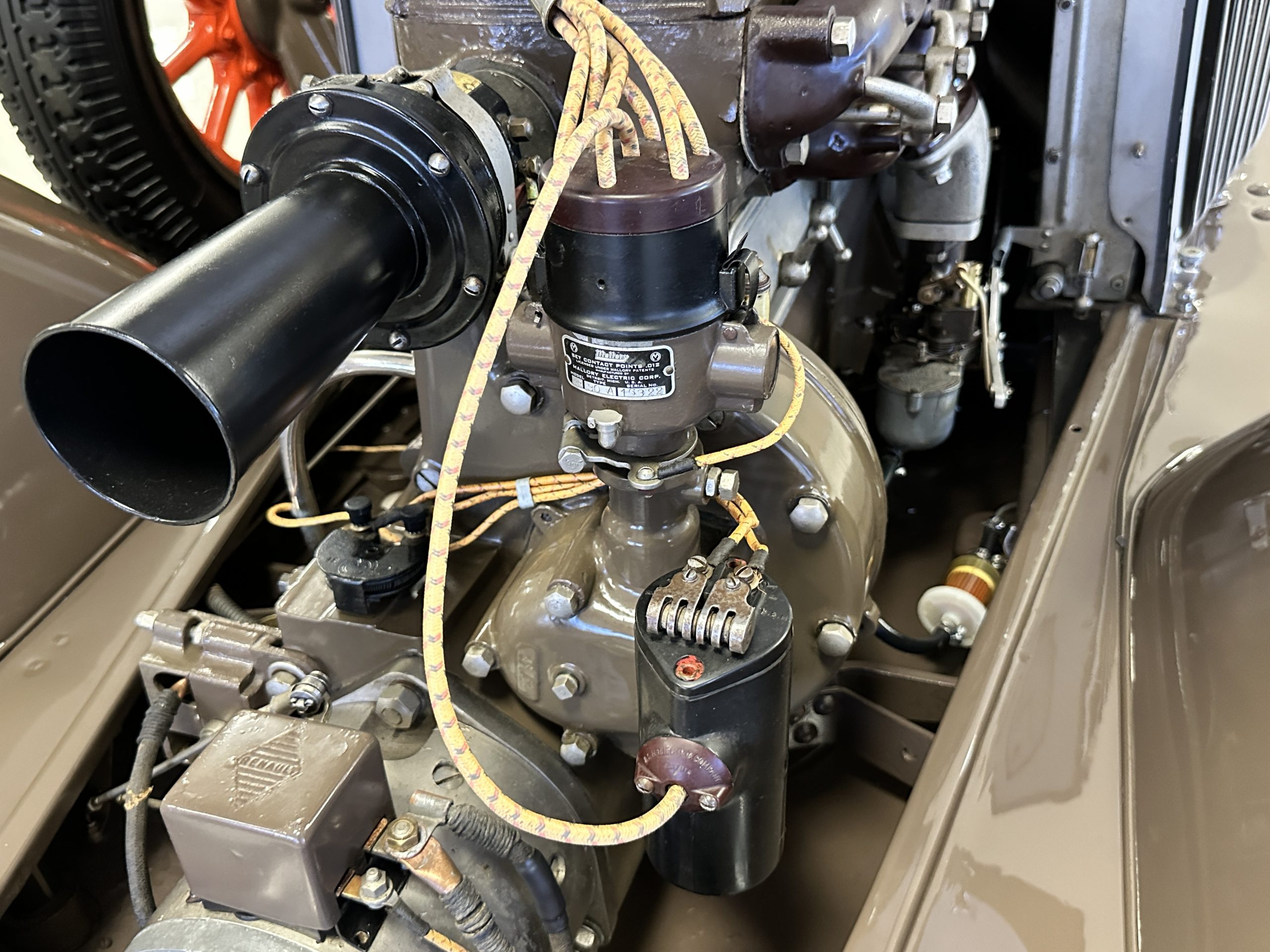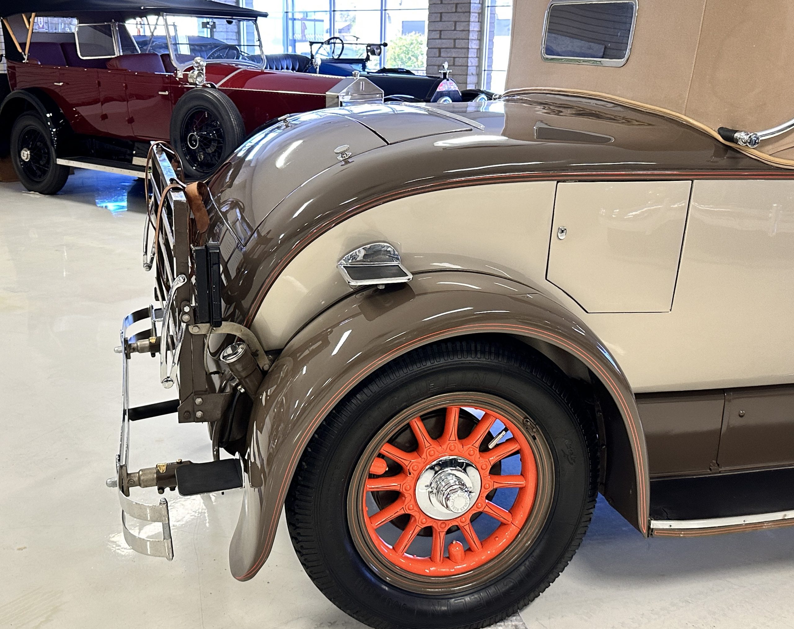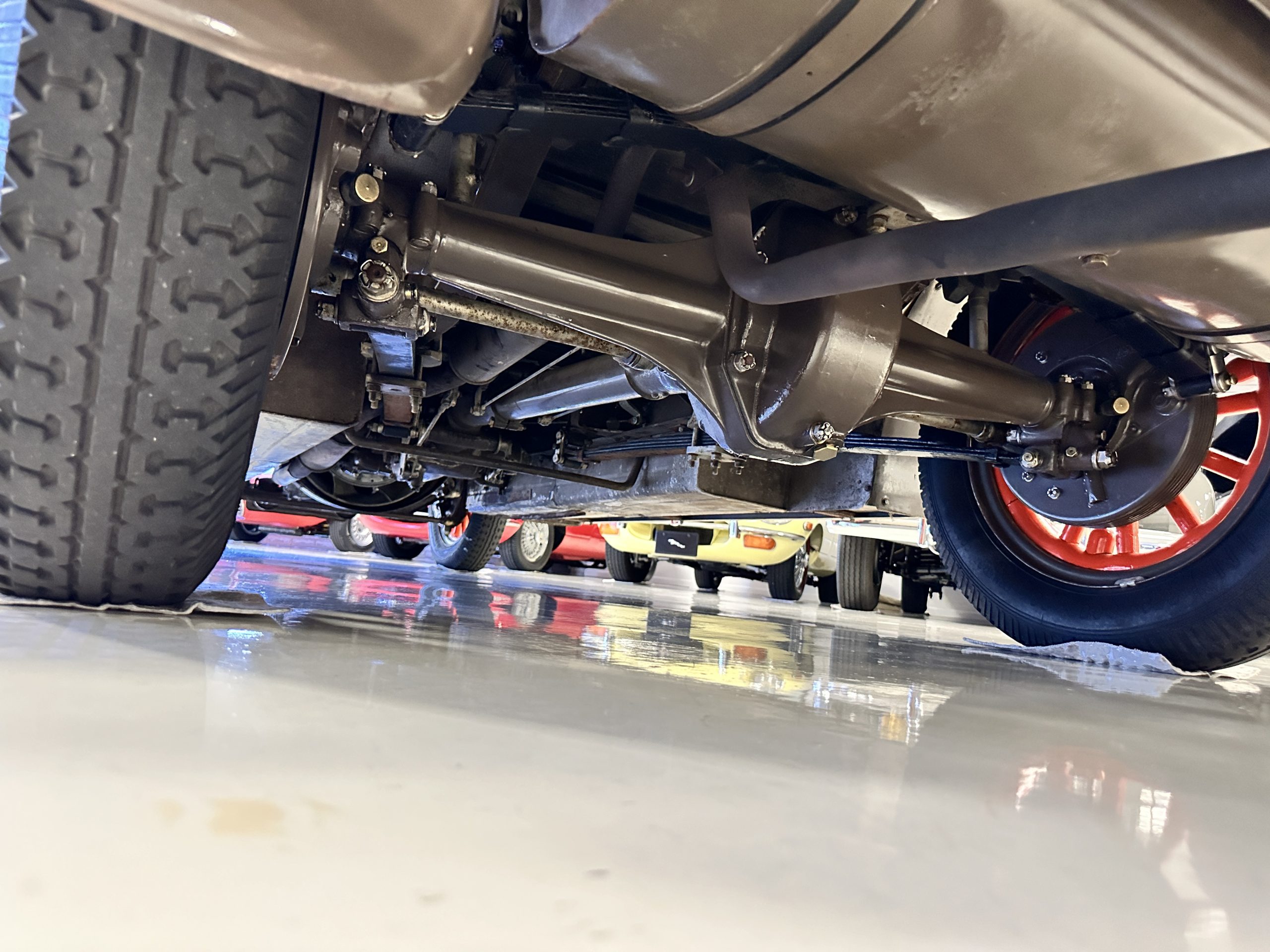 Orange-painted artillery wheels feature nickel plated lock rings and are wrapped in 5.00/6.00×20 Michelin Confort Cord SS tires, as is a side-mount spare. Mechanical actuation of four-wheel drum brakes incorporates a mechanical servo that provides assistance in accordance with the intensity of driver input. The brakes were adjusted in January 2024.