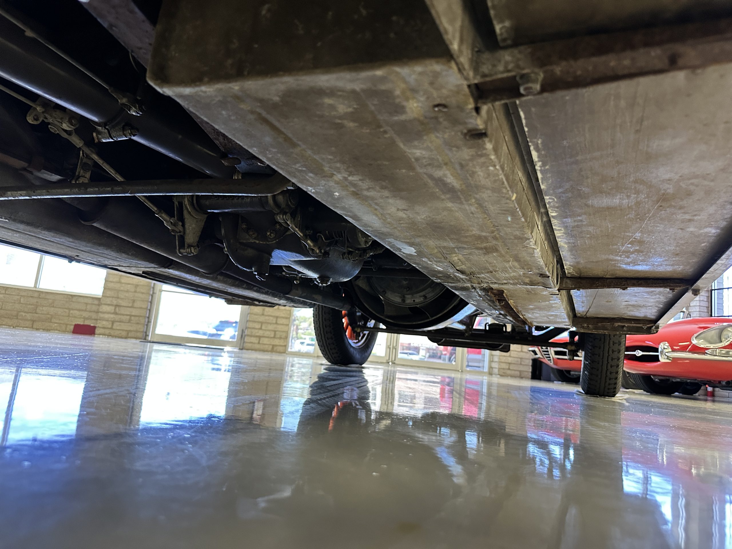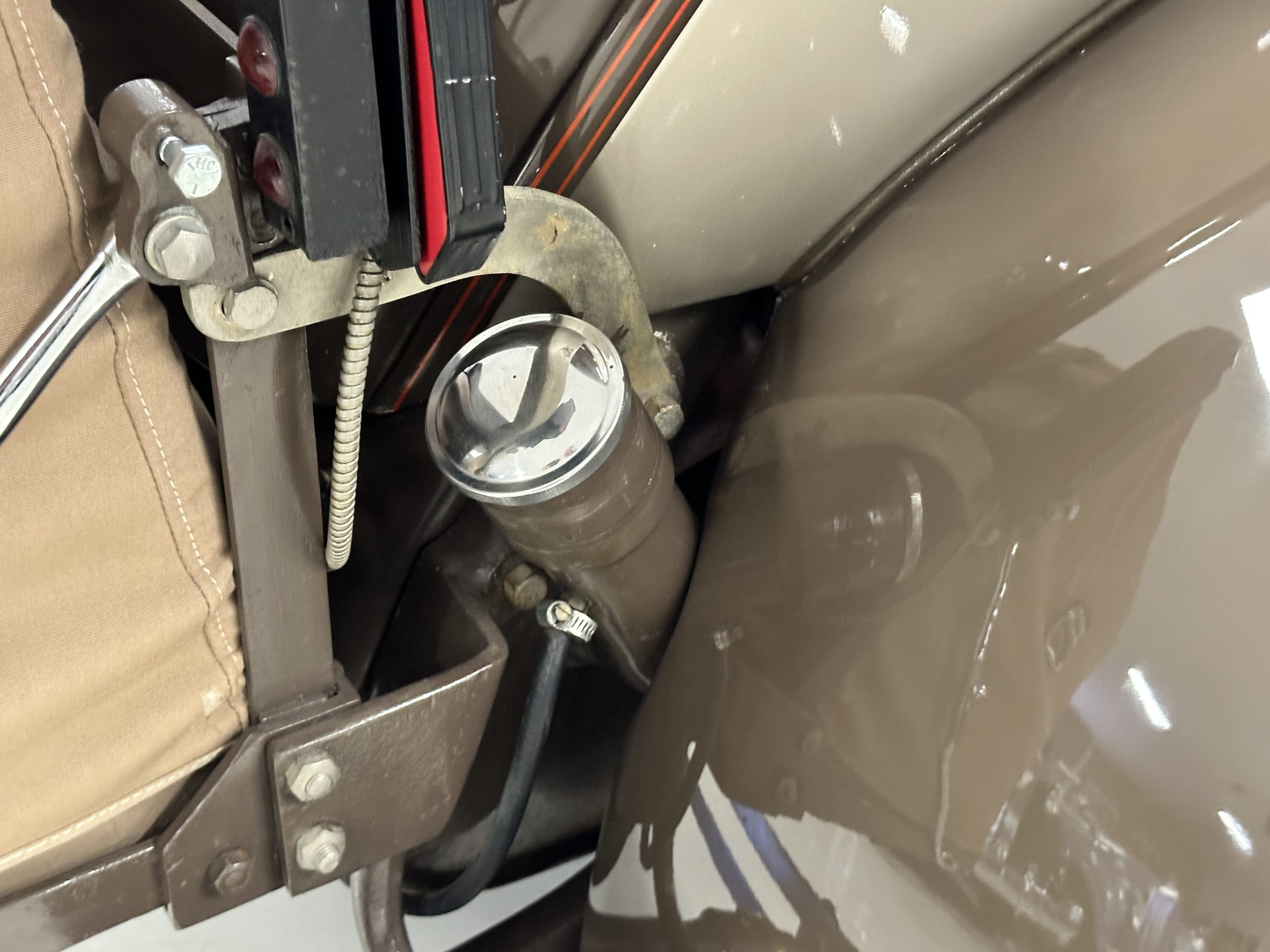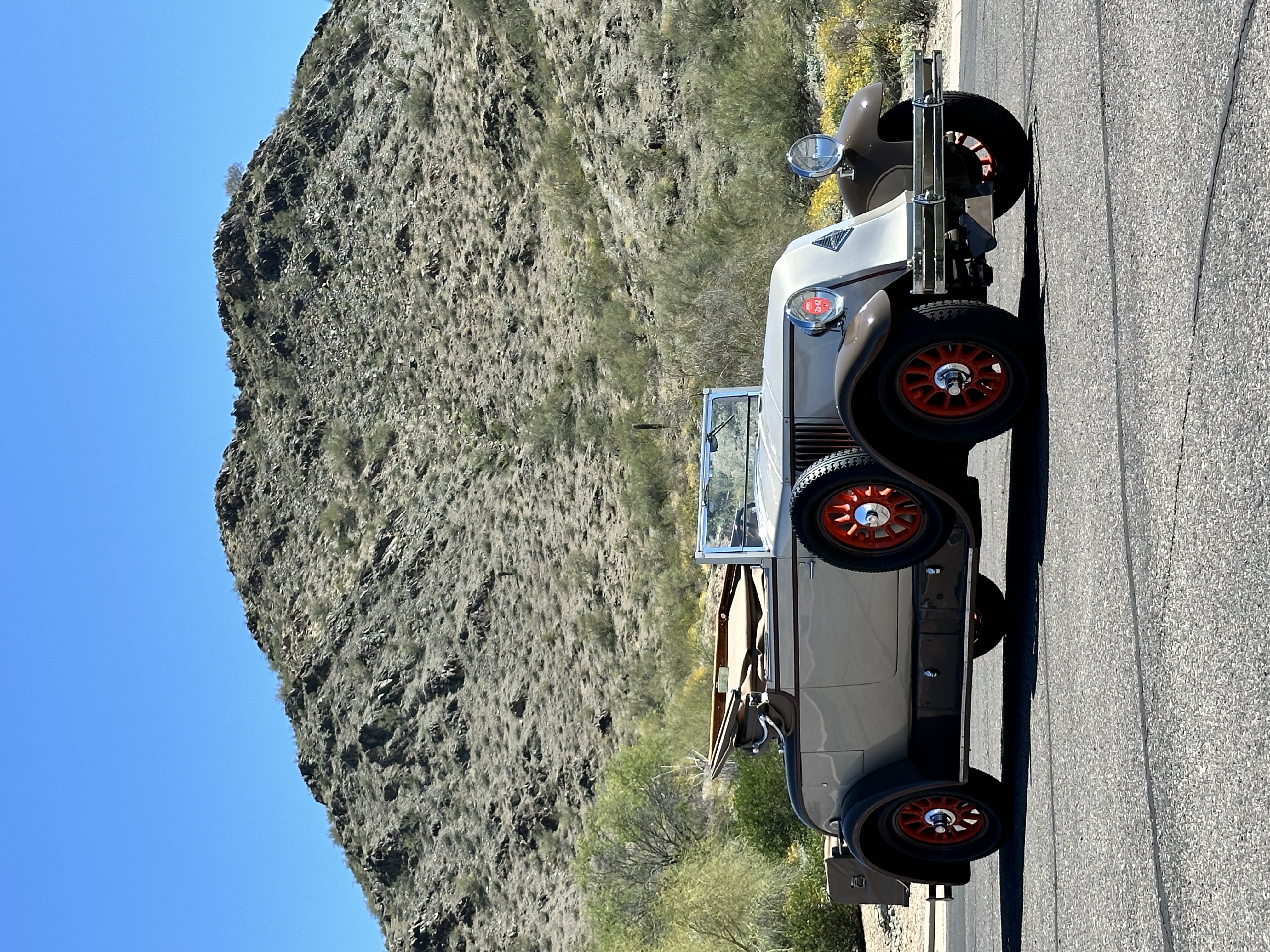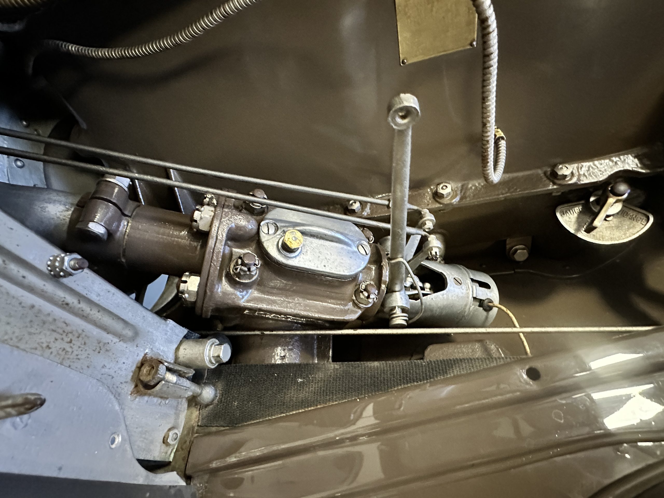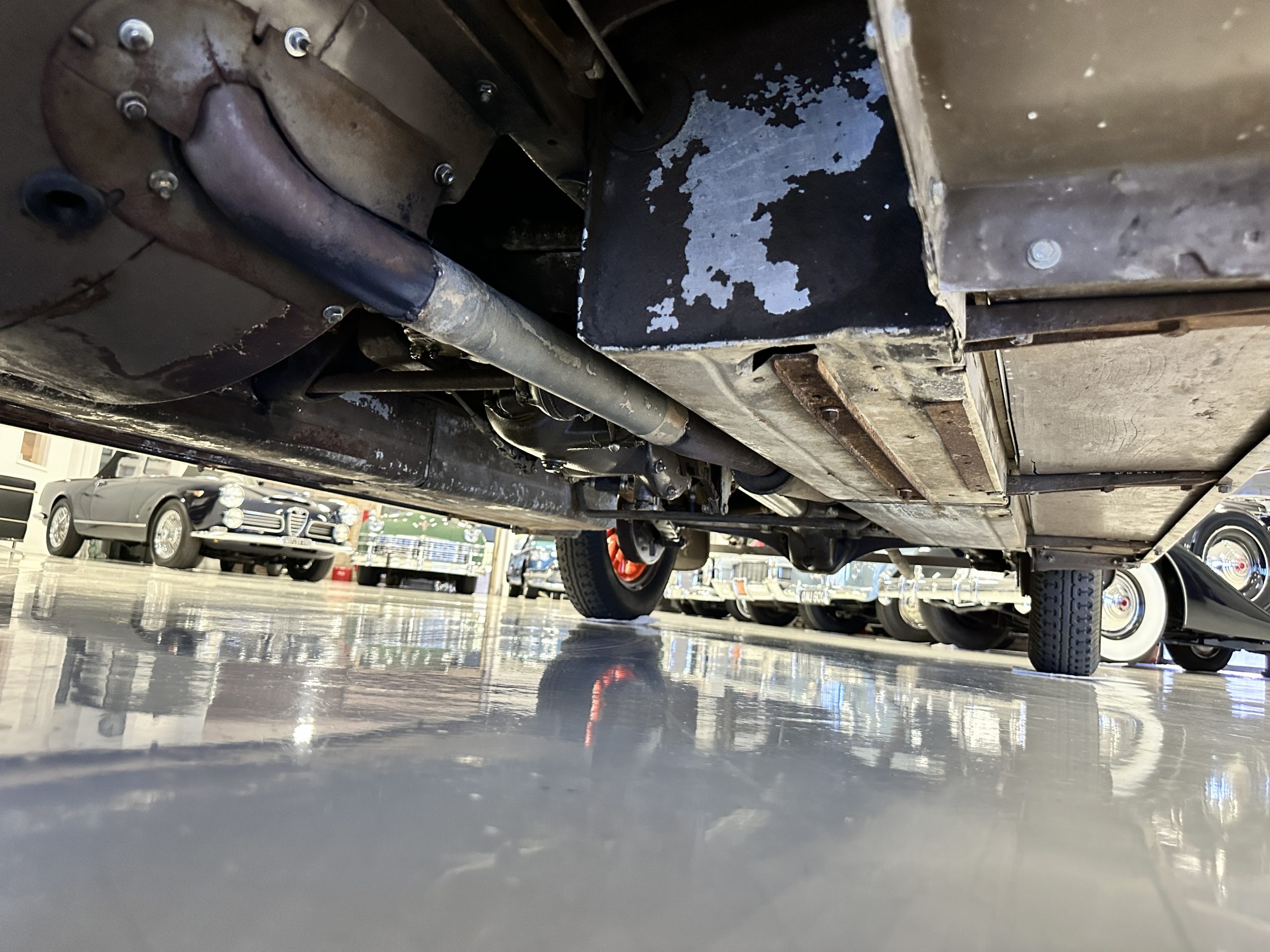 Orange-painted artillery wheels feature nickel plated lock rings and are wrapped in 5.00/6.00×20 Michelin Confort Cord SS tires, as is a side-mount spare. Mechanical actuation of four-wheel drum brakes incorporates a mechanical servo that provides assistance in accordance with the intensity of driver input. The brakes were adjusted in January 2024.