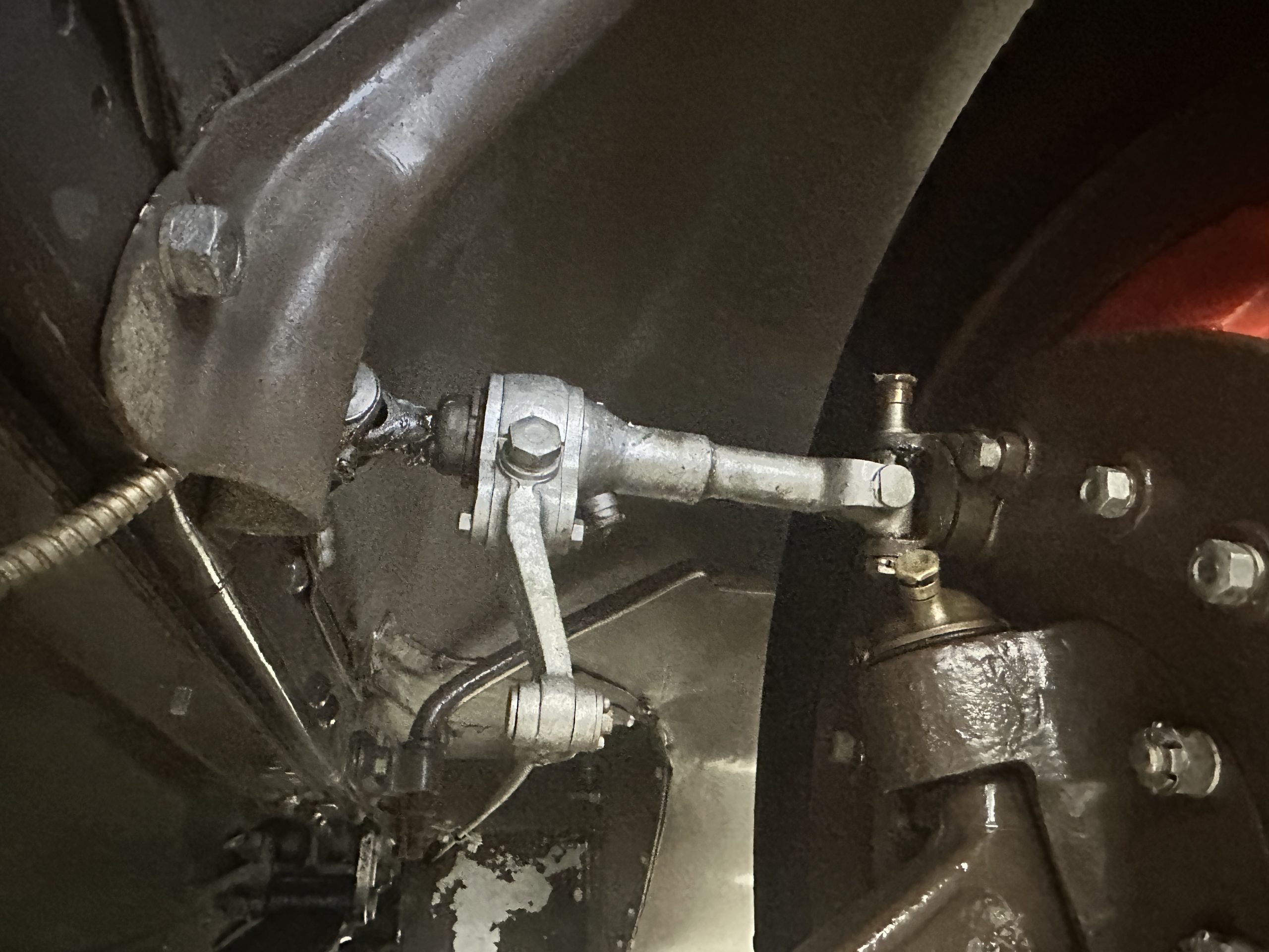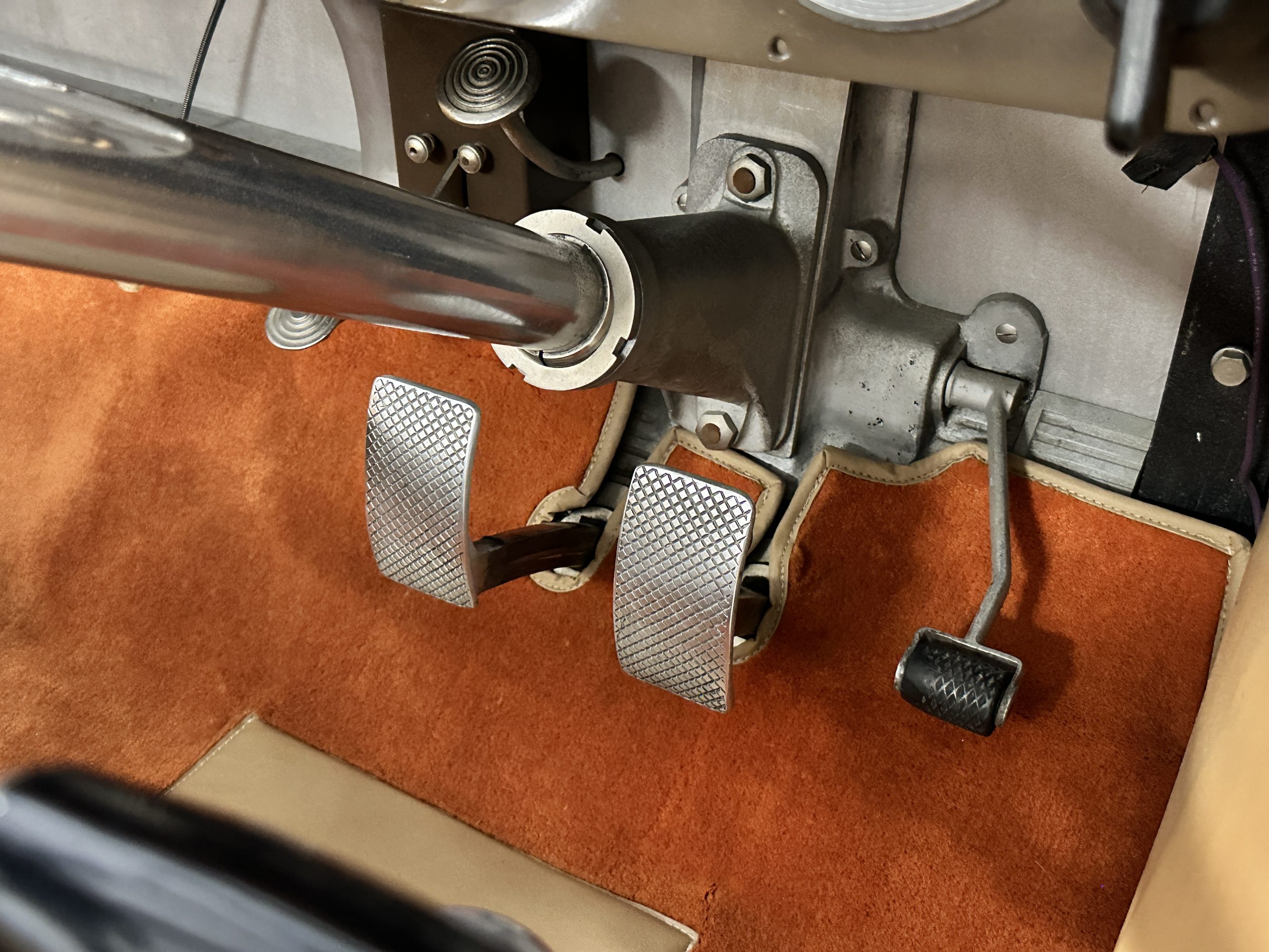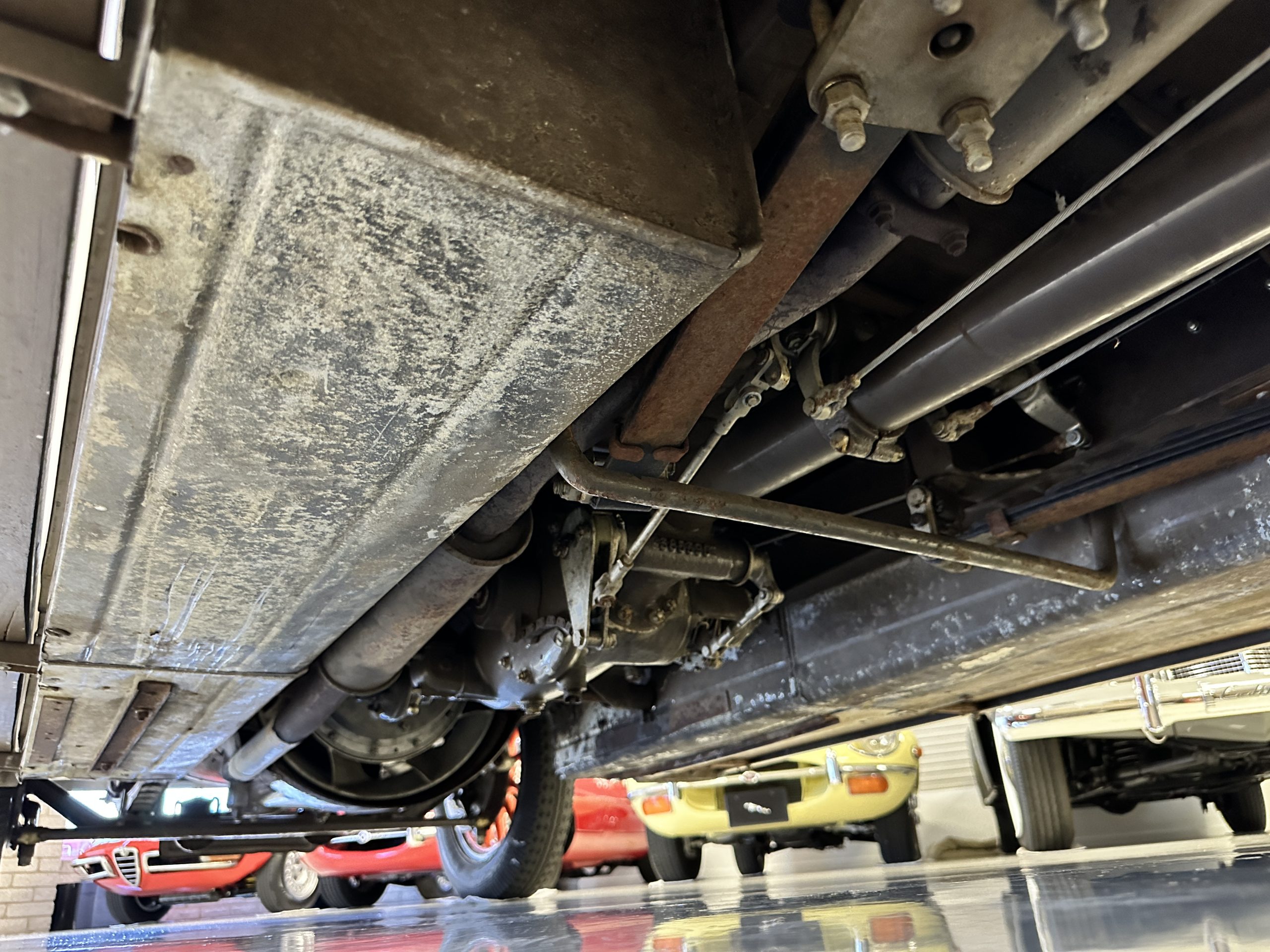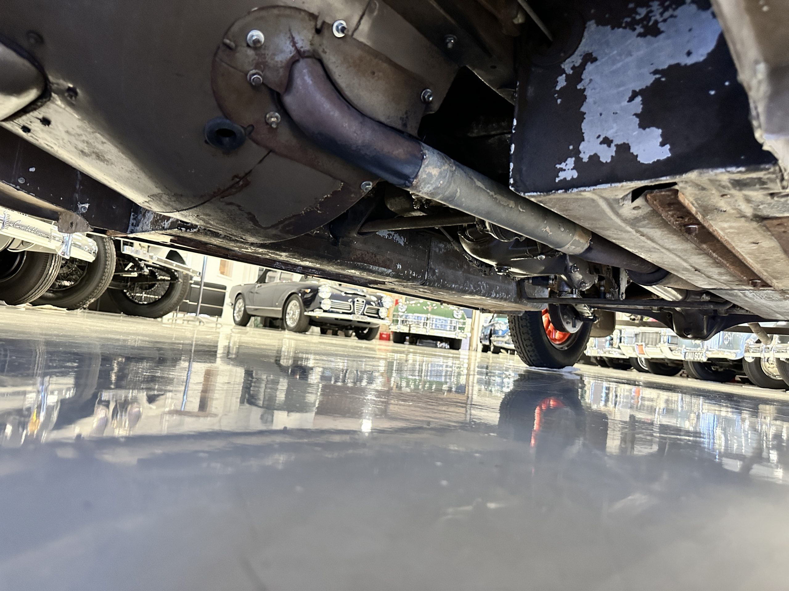 Orange-painted artillery wheels feature nickel plated lock rings and are wrapped in 5.00/6.00×20 Michelin Confort Cord SS tires, as is a side-mount spare. Mechanical actuation of four-wheel drum brakes incorporates a mechanical servo that provides assistance in accordance with the intensity of driver input. The brakes were adjusted in January 2024.