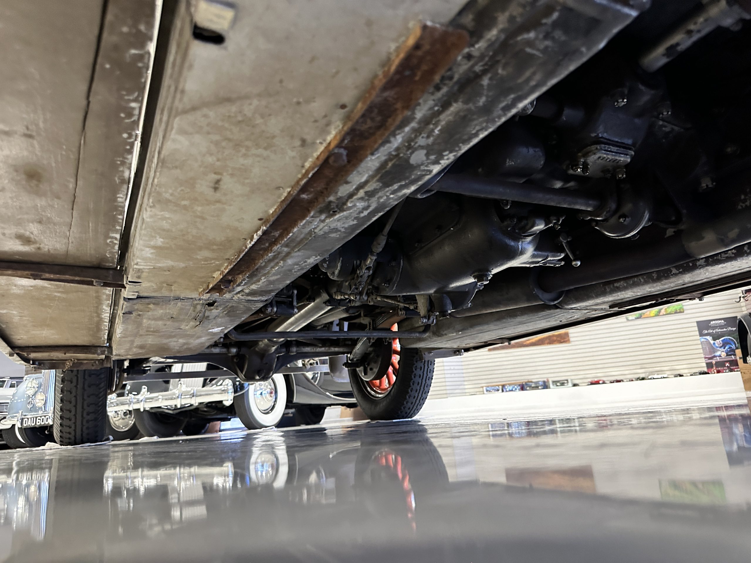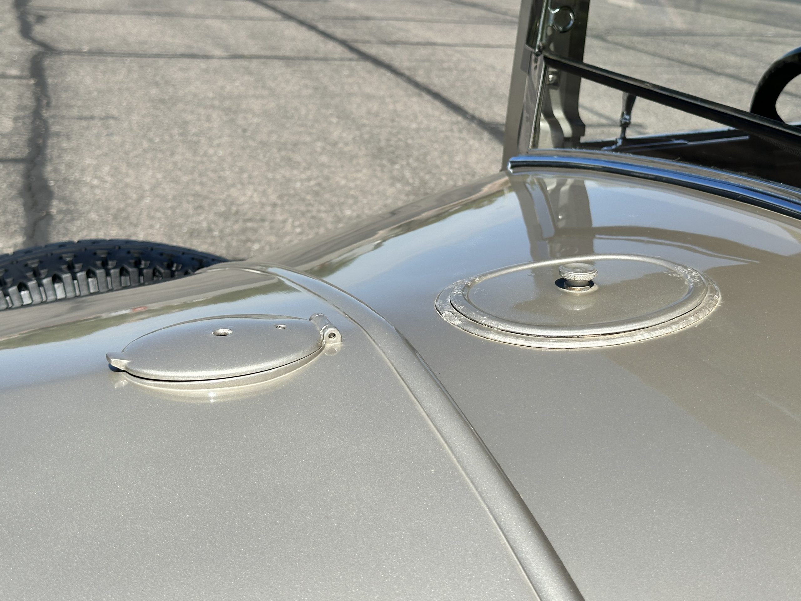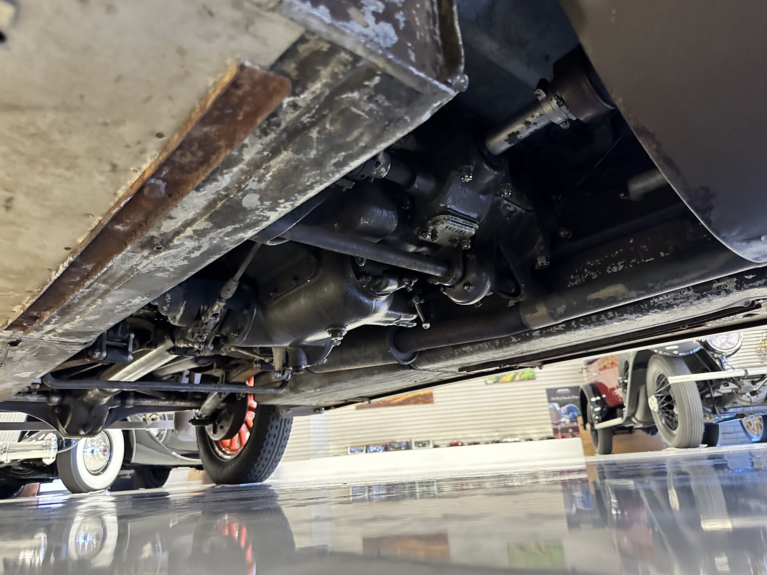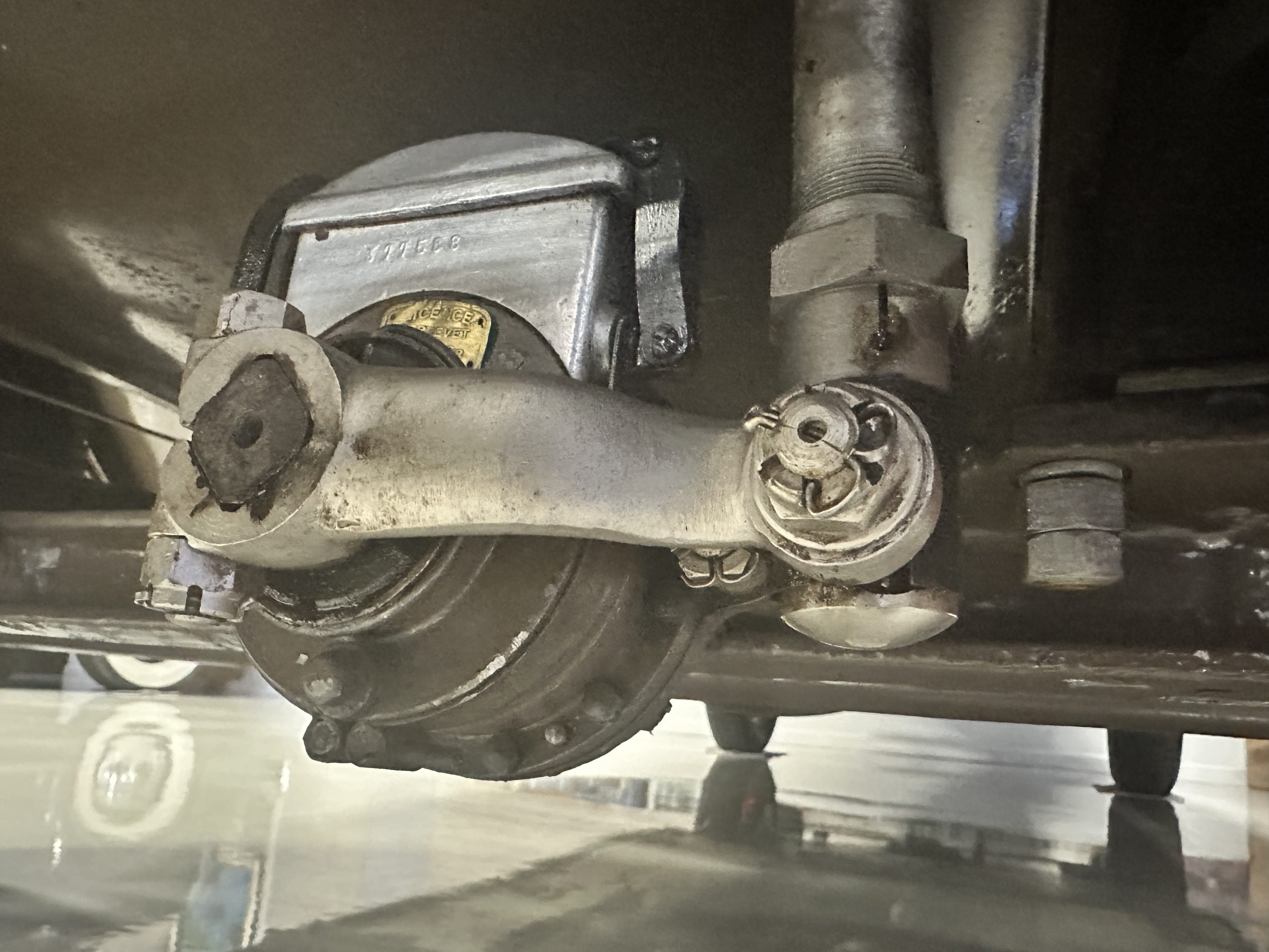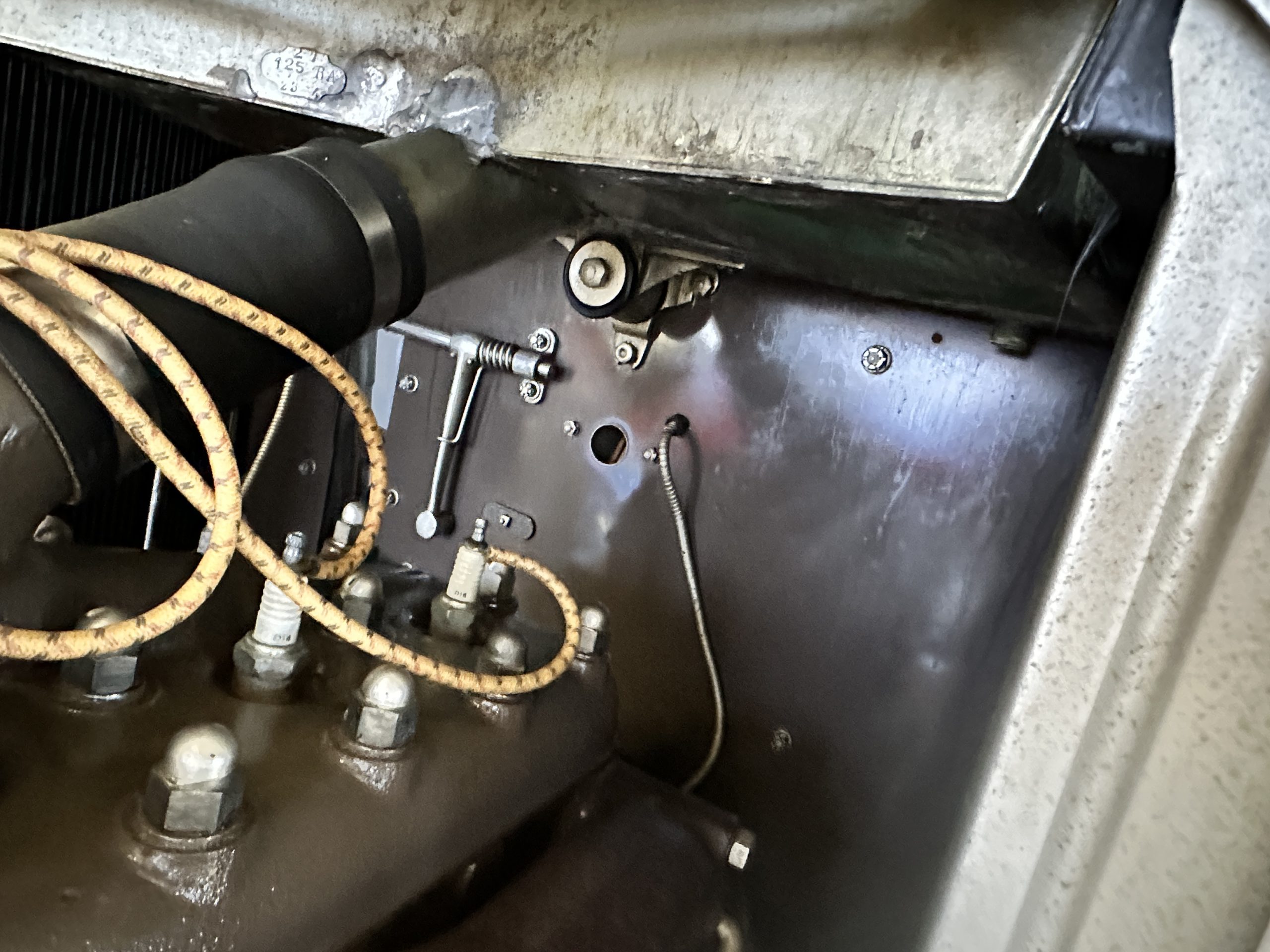 Orange-painted artillery wheels feature nickel plated lock rings and are wrapped in 5.00/6.00×20 Michelin Confort Cord SS tires, as is a side-mount spare. Mechanical actuation of four-wheel drum brakes incorporates a mechanical servo that provides assistance in accordance with the intensity of driver input. The brakes were adjusted in January 2024.