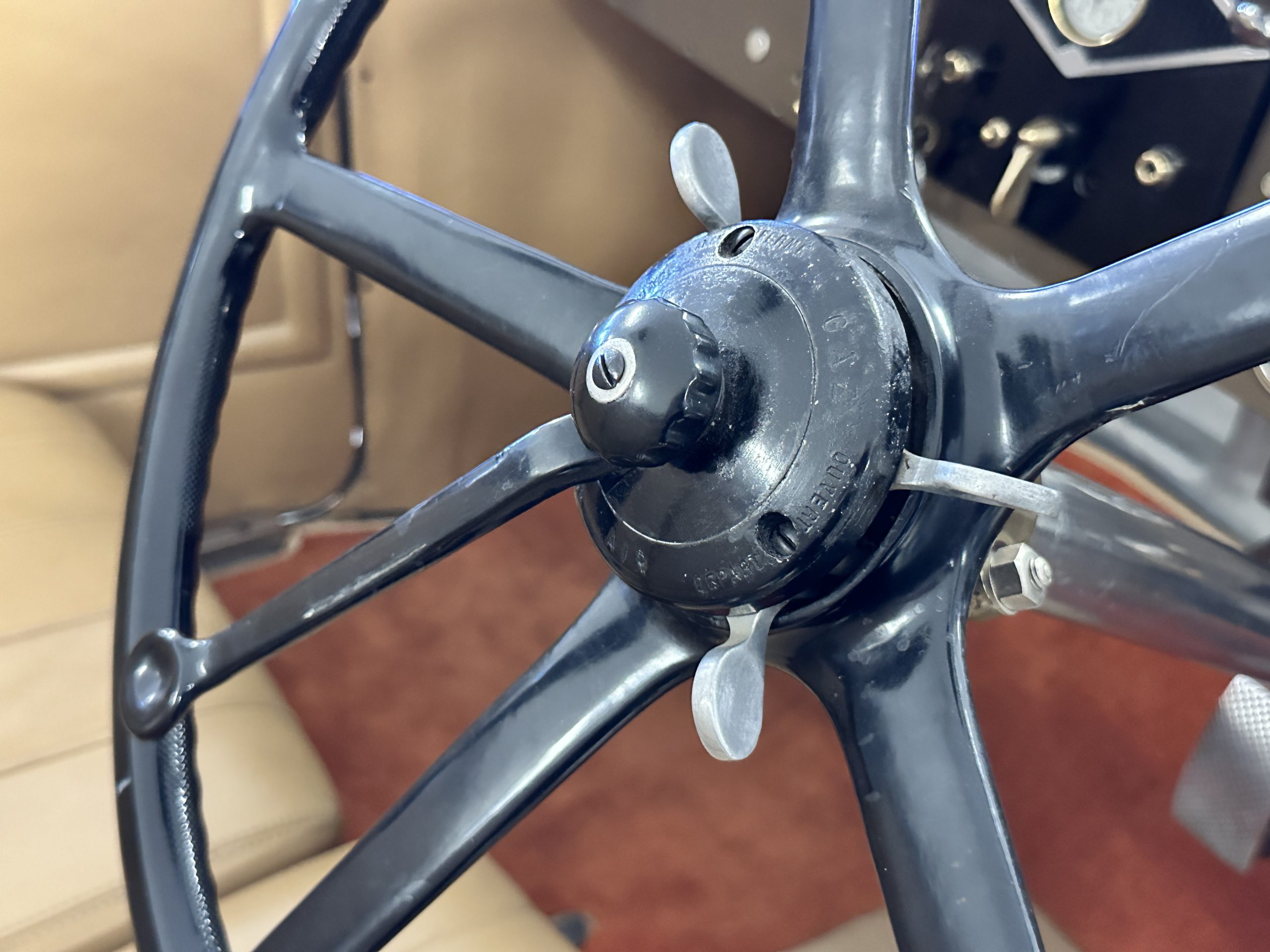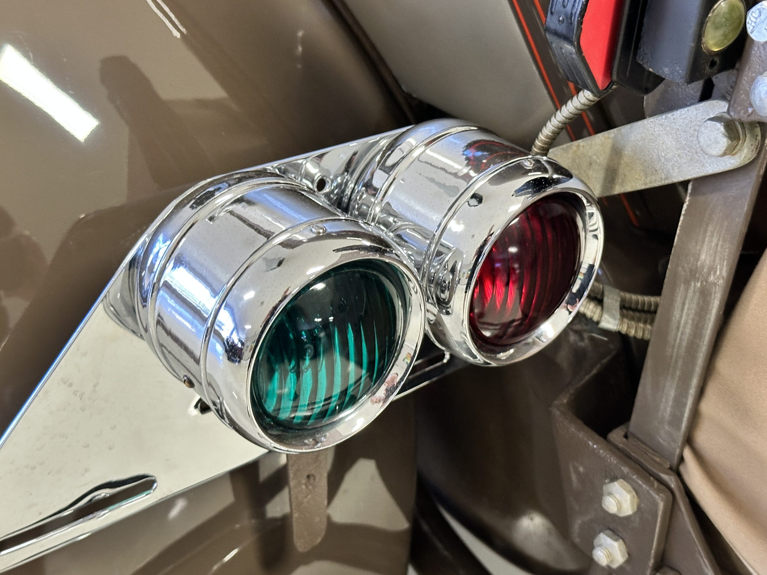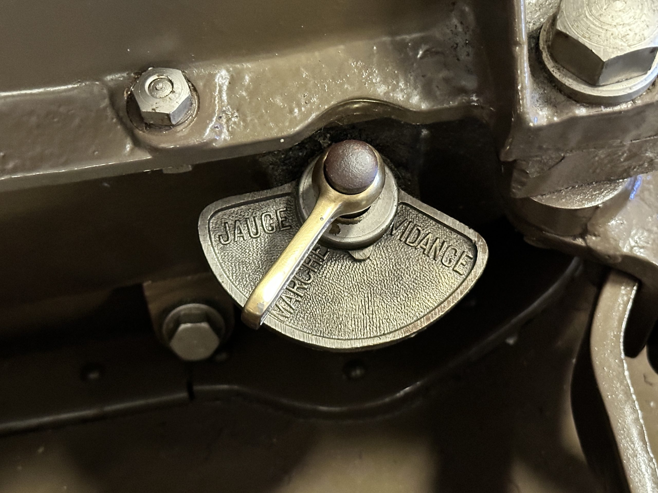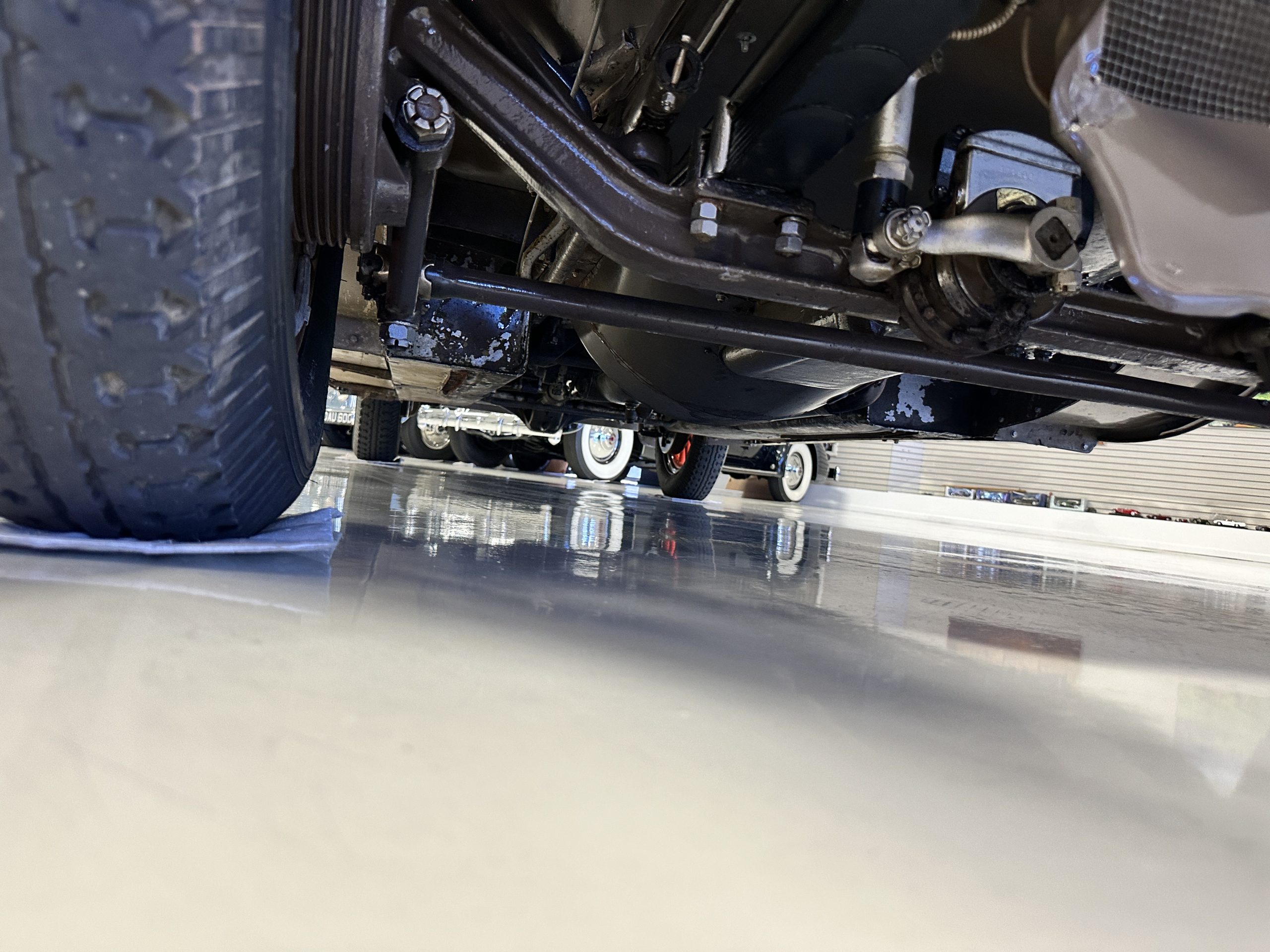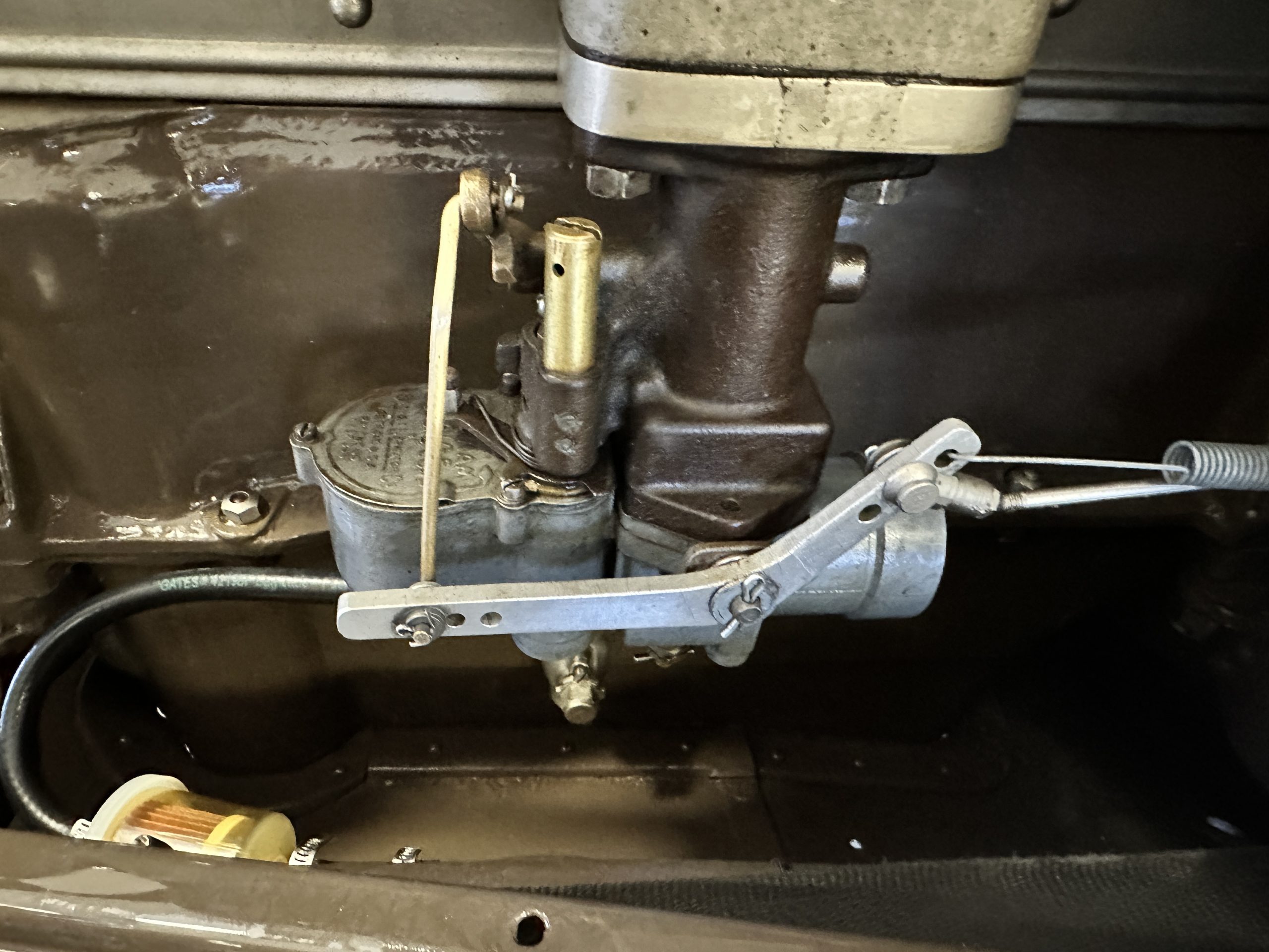 Orange-painted artillery wheels feature nickel plated lock rings and are wrapped in 5.00/6.00×20 Michelin Confort Cord SS tires, as is a side-mount spare. Mechanical actuation of four-wheel drum brakes incorporates a mechanical servo that provides assistance in accordance with the intensity of driver input. The brakes were adjusted in January 2024.