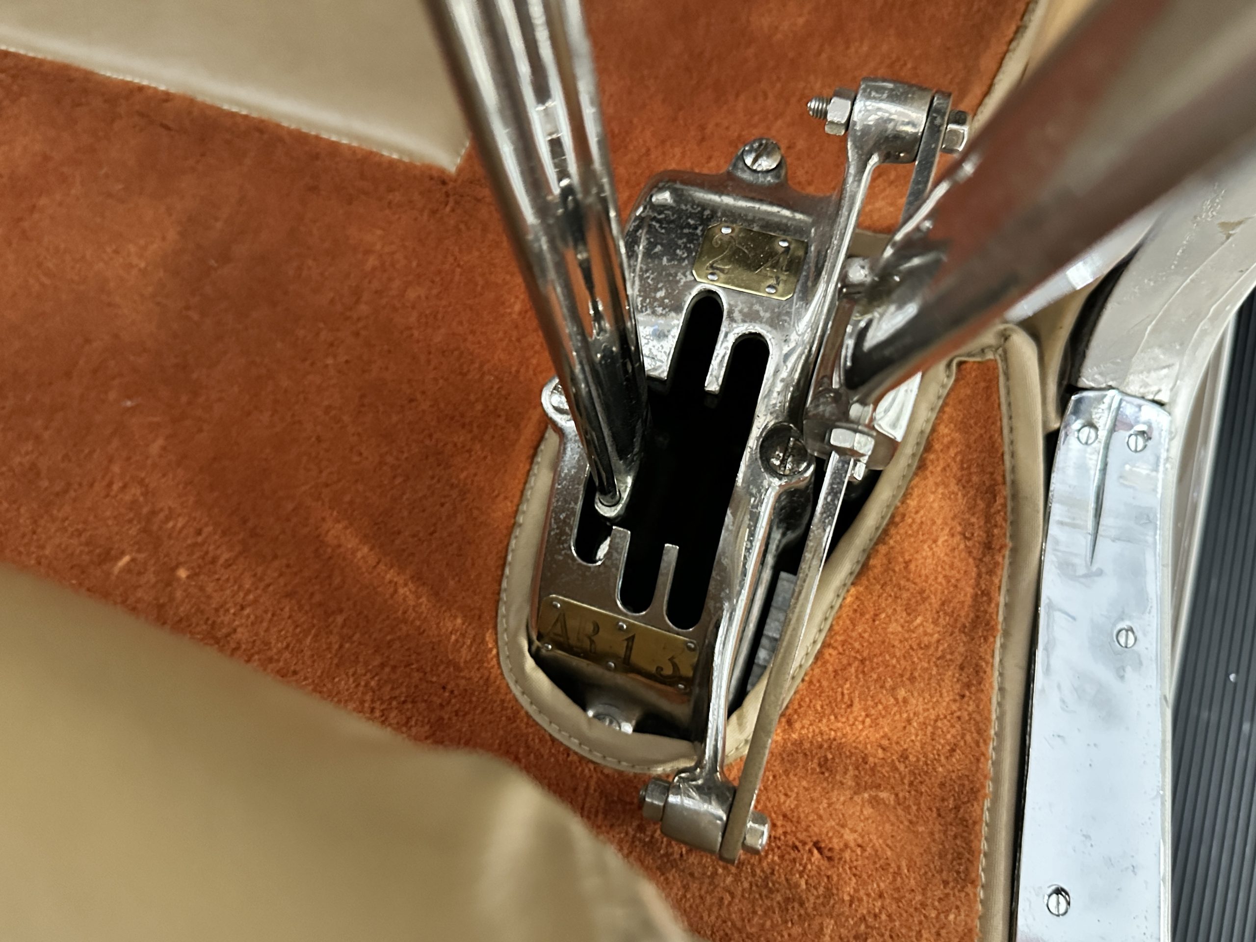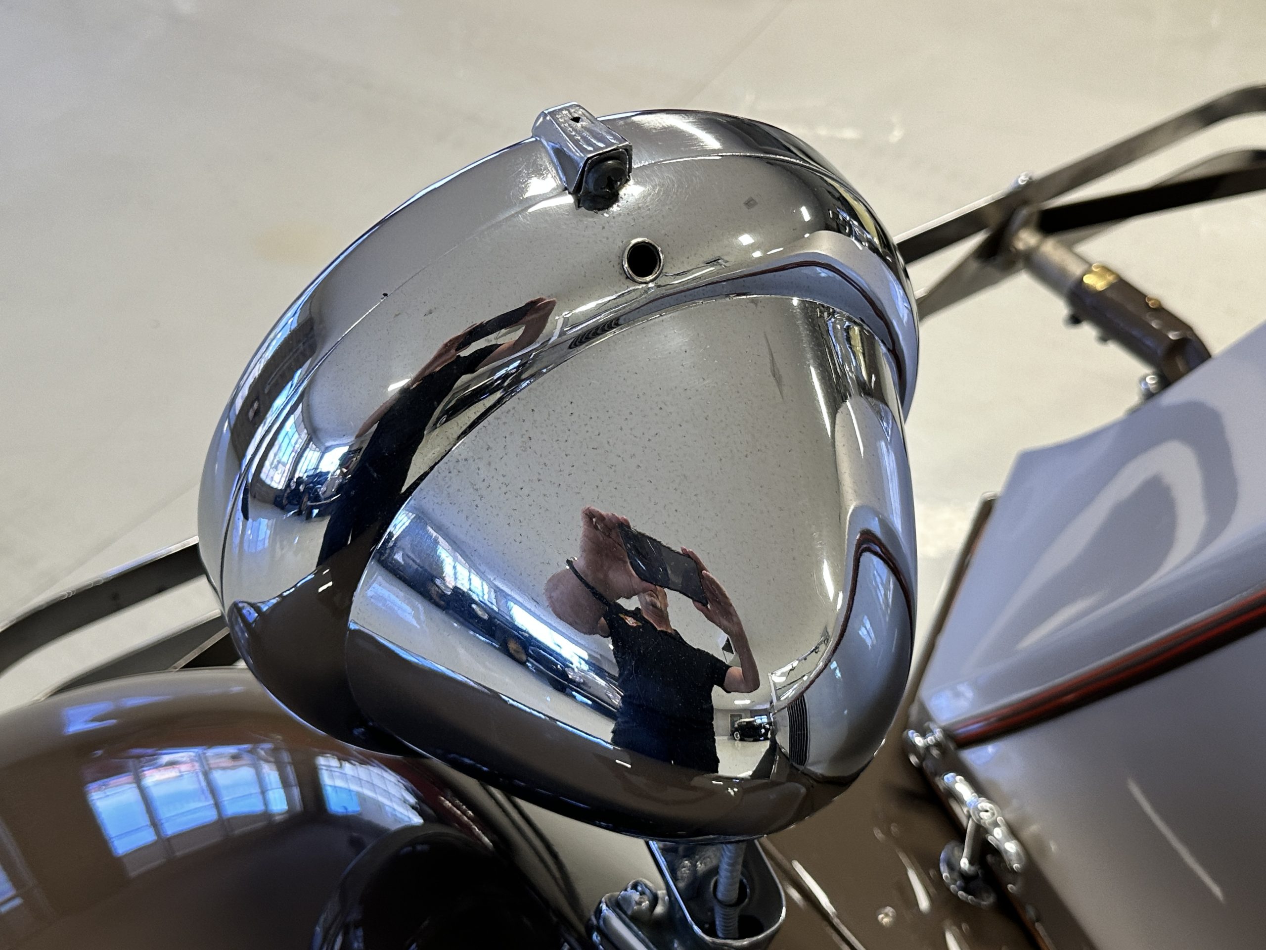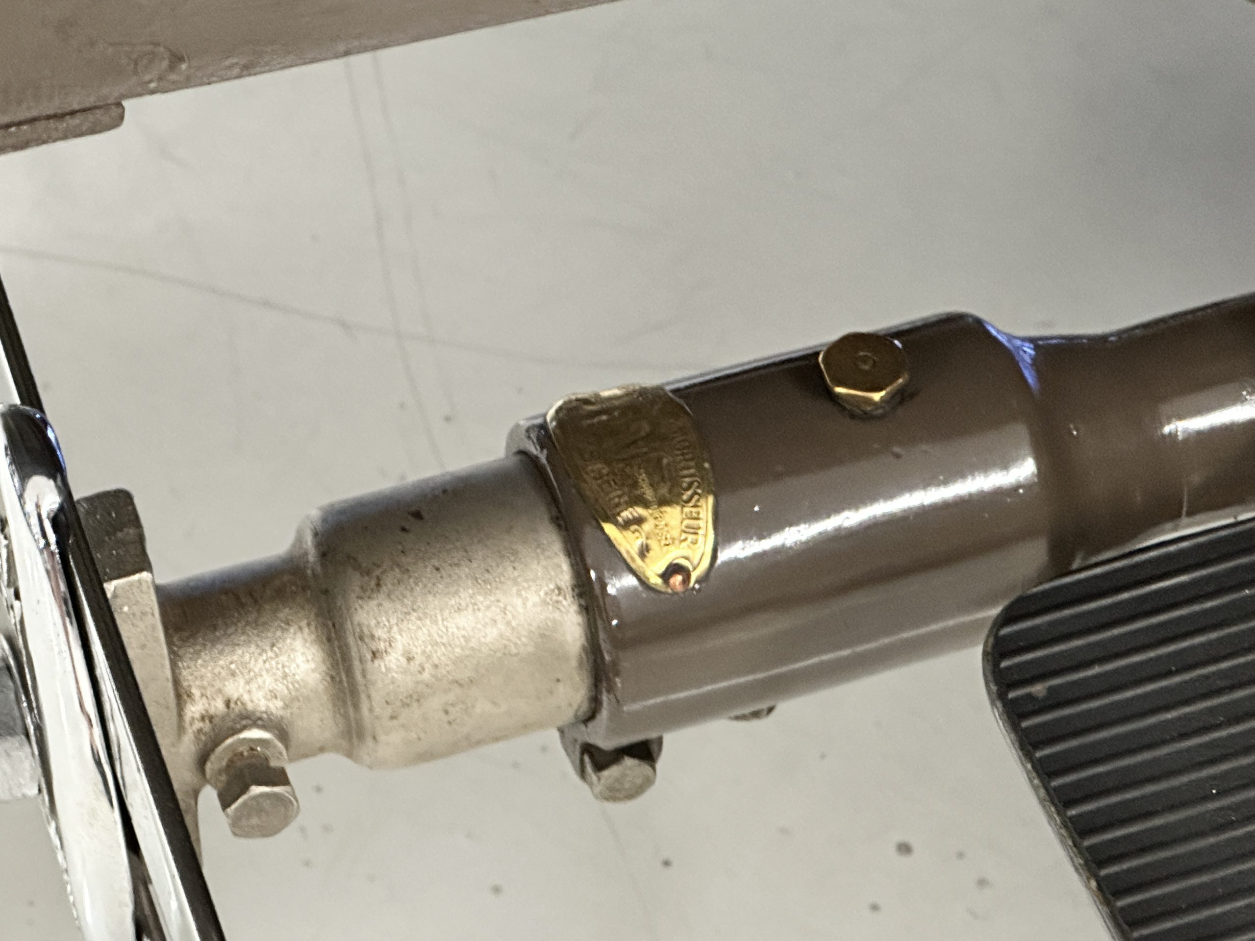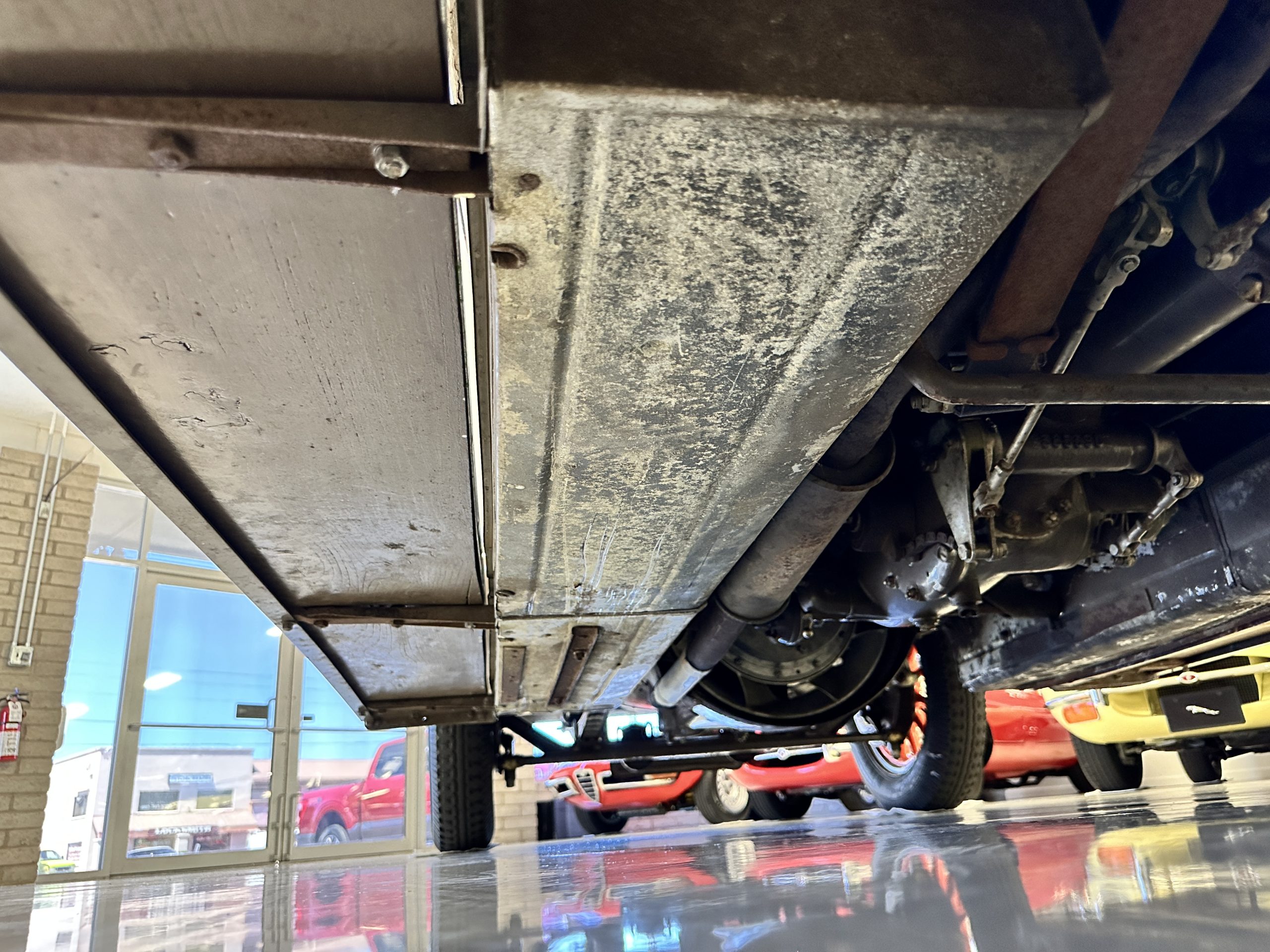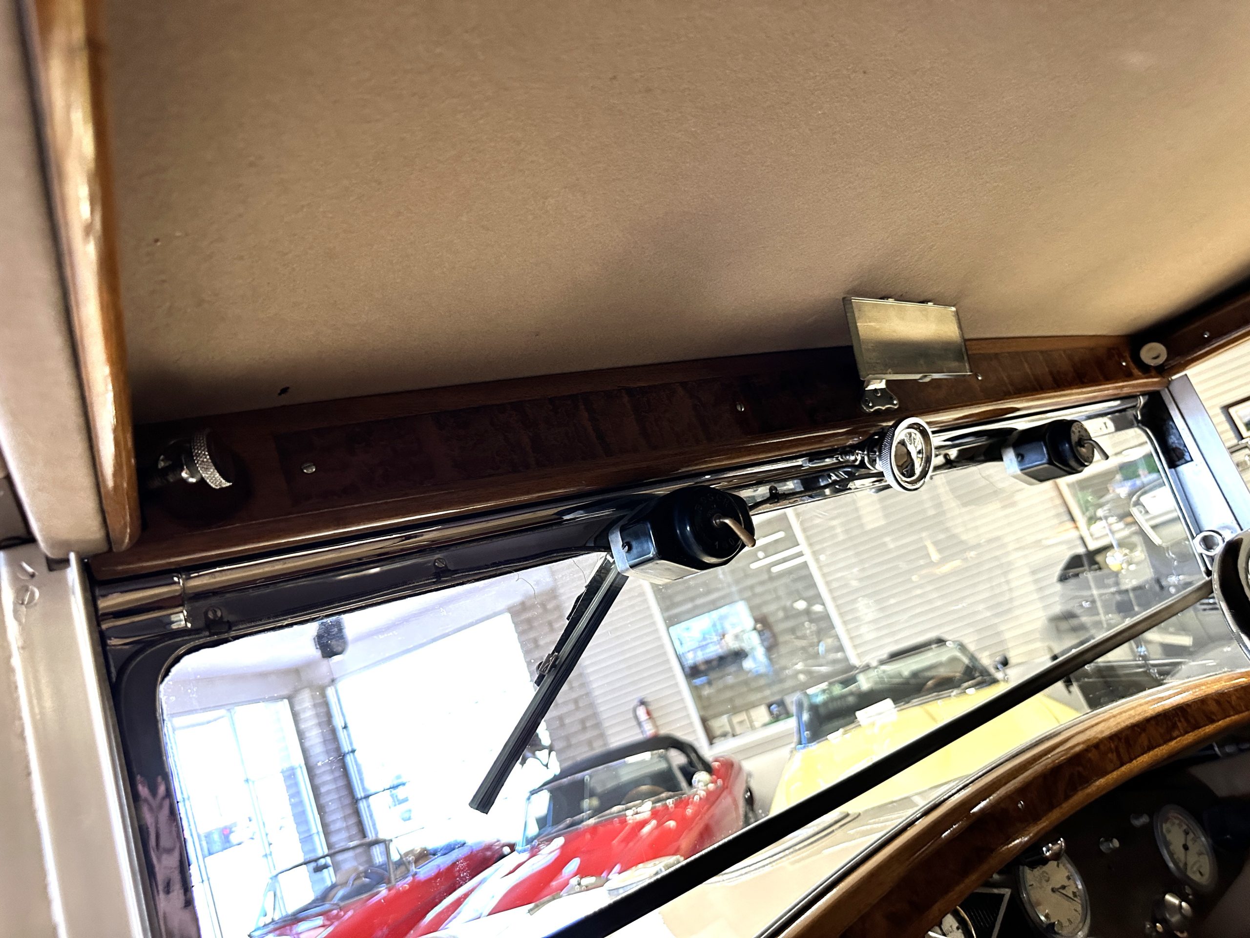 Orange-painted artillery wheels feature nickel plated lock rings and are wrapped in 5.00/6.00×20 Michelin Confort Cord SS tires, as is a side-mount spare. Mechanical actuation of four-wheel drum brakes incorporates a mechanical servo that provides assistance in accordance with the intensity of driver input. The brakes were adjusted in January 2024.