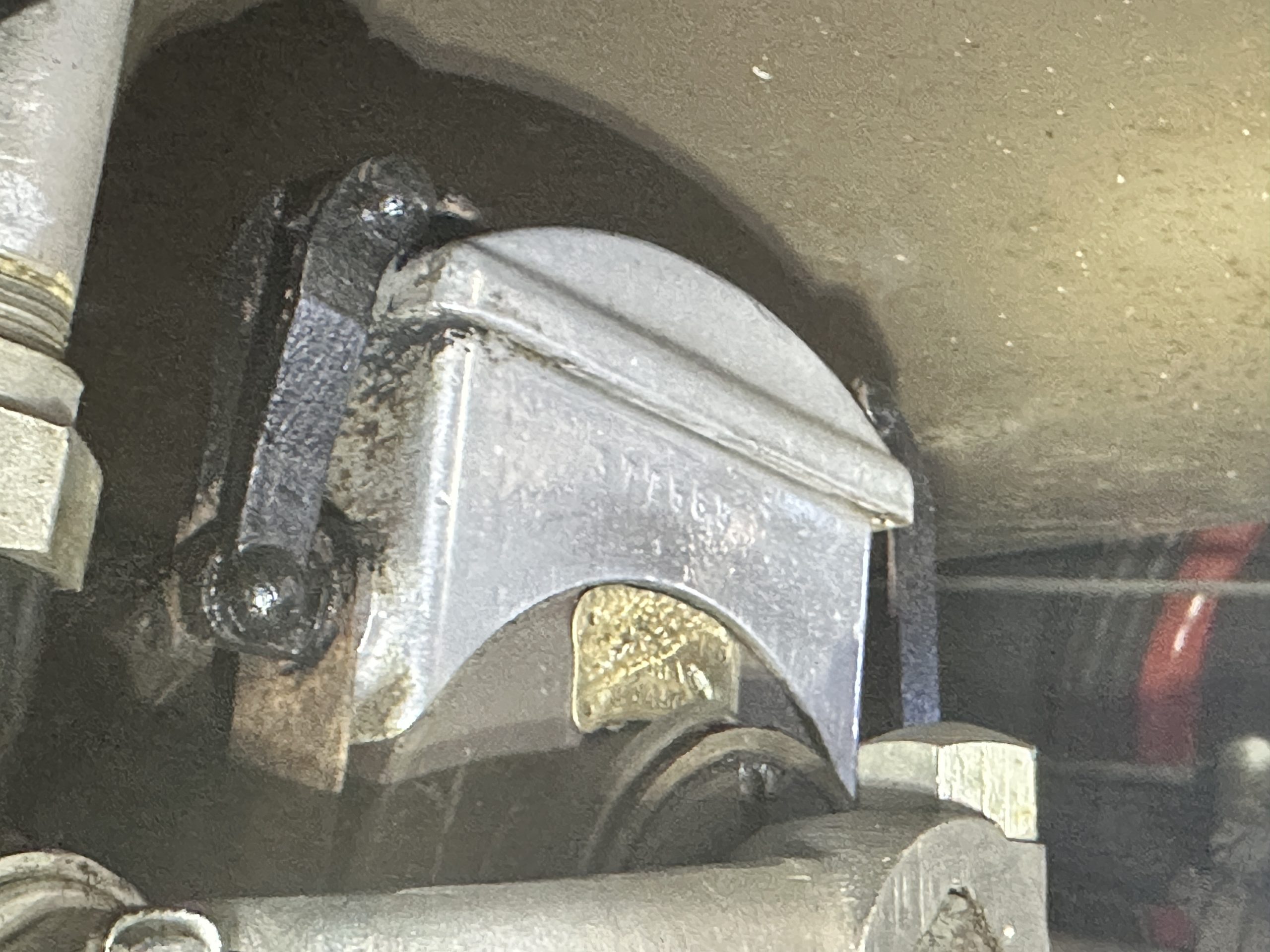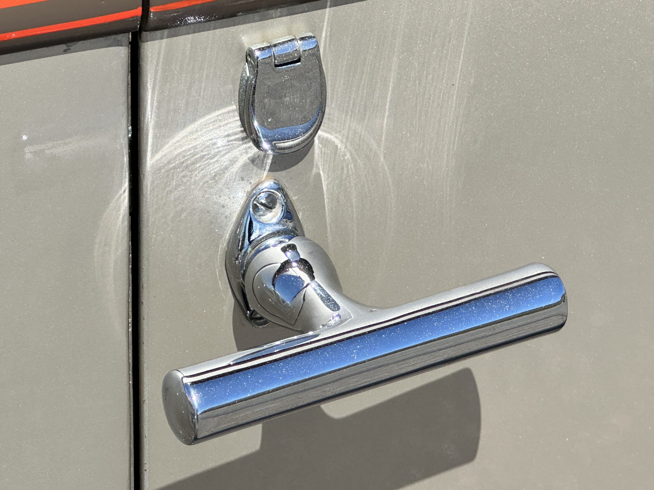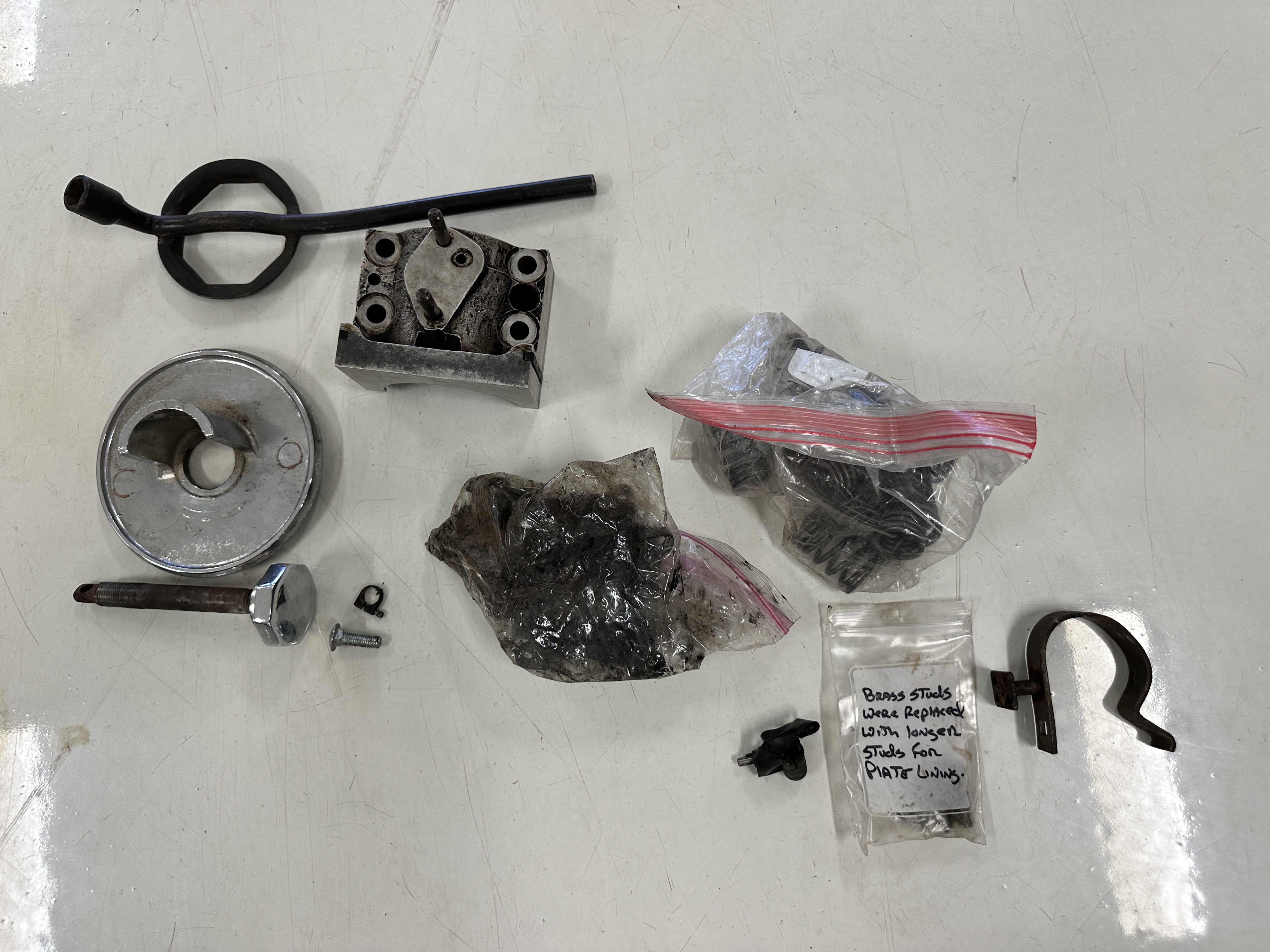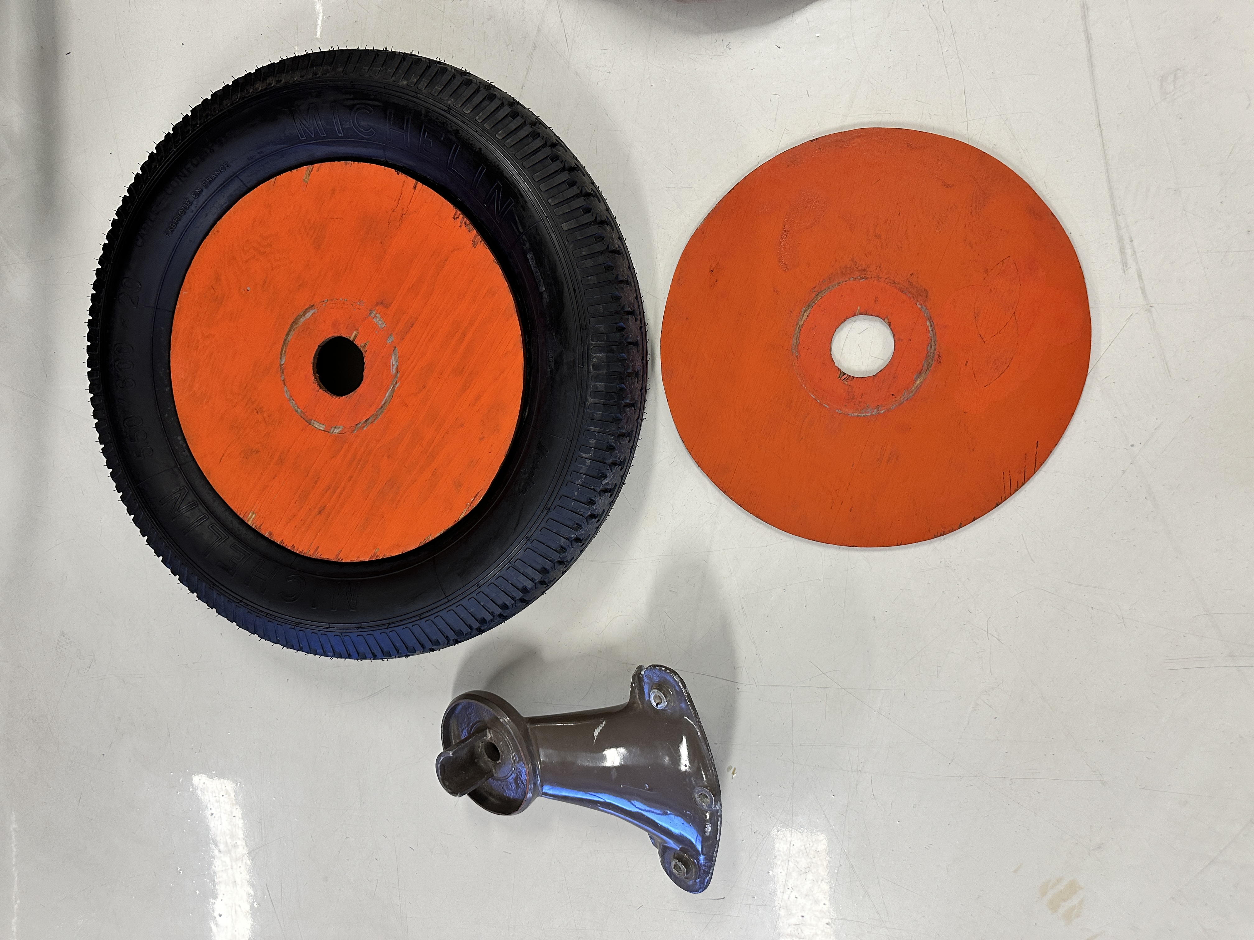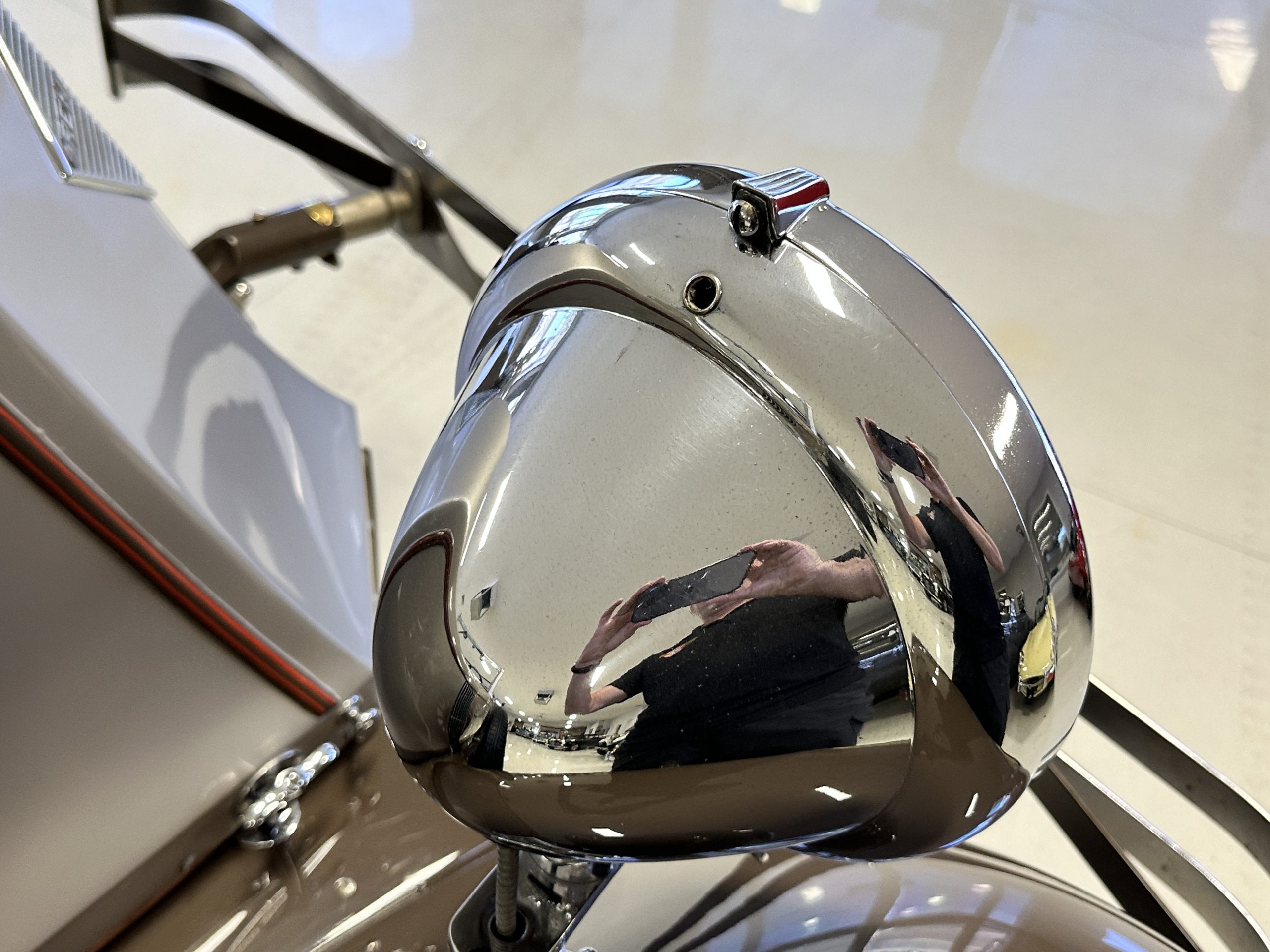 Orange-painted artillery wheels feature nickel plated lock rings and are wrapped in 5.00/6.00×20 Michelin Confort Cord SS tires, as is a side-mount spare. Mechanical actuation of four-wheel drum brakes incorporates a mechanical servo that provides assistance in accordance with the intensity of driver input. The brakes were adjusted in January 2024.