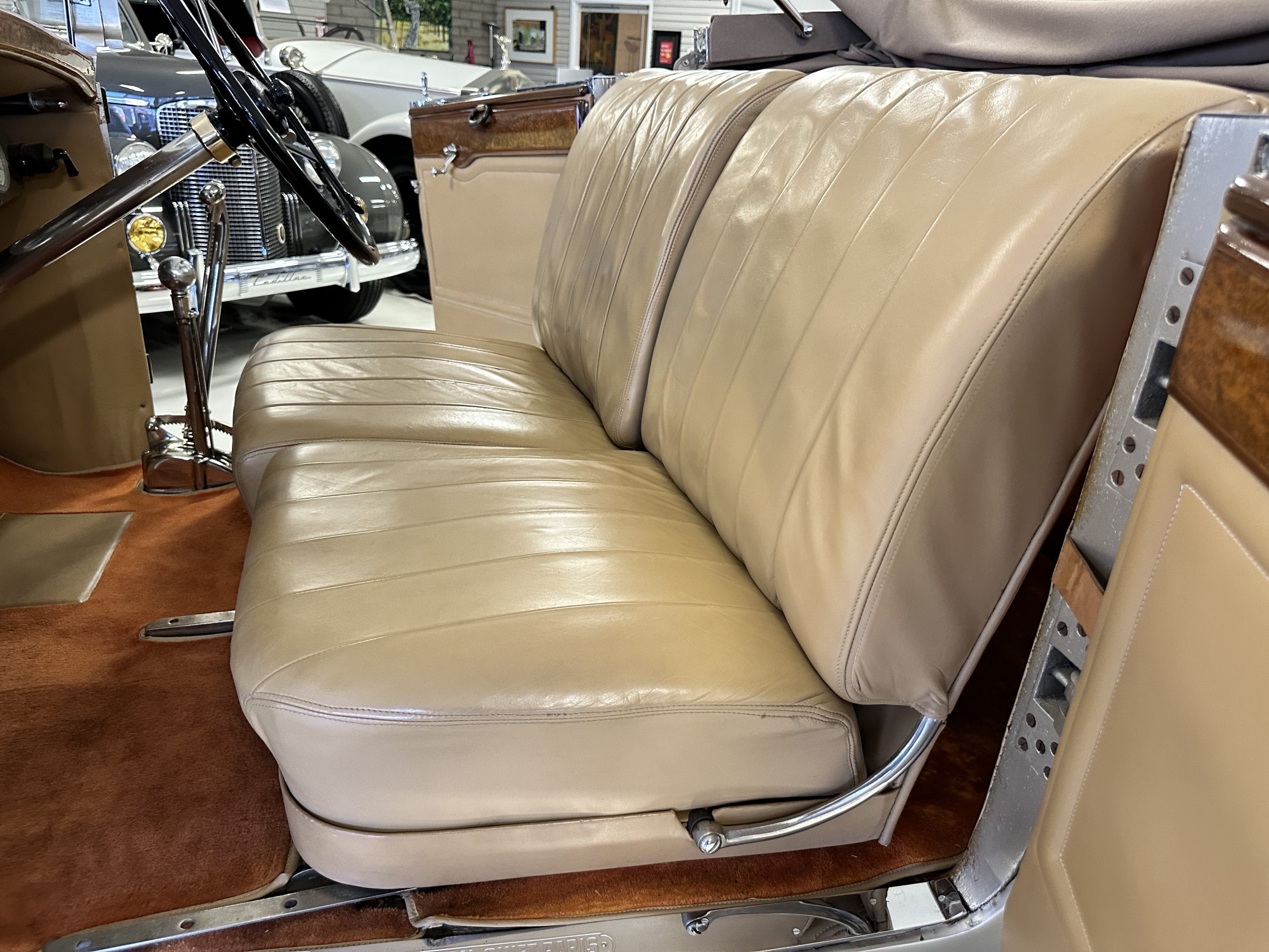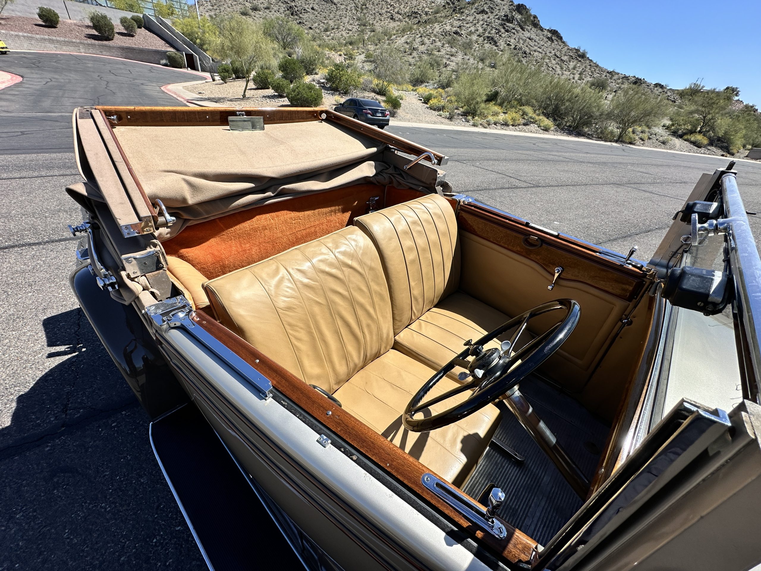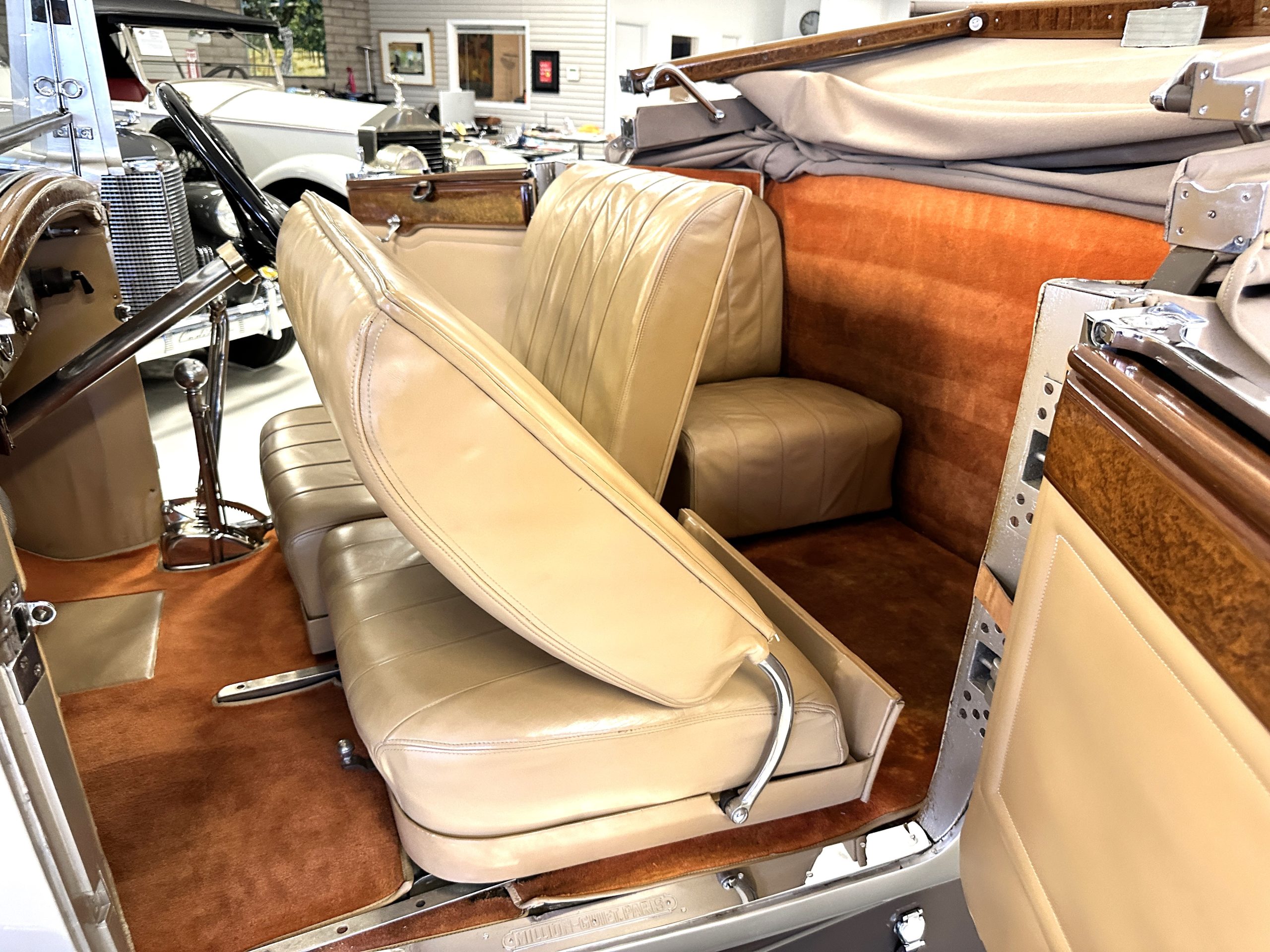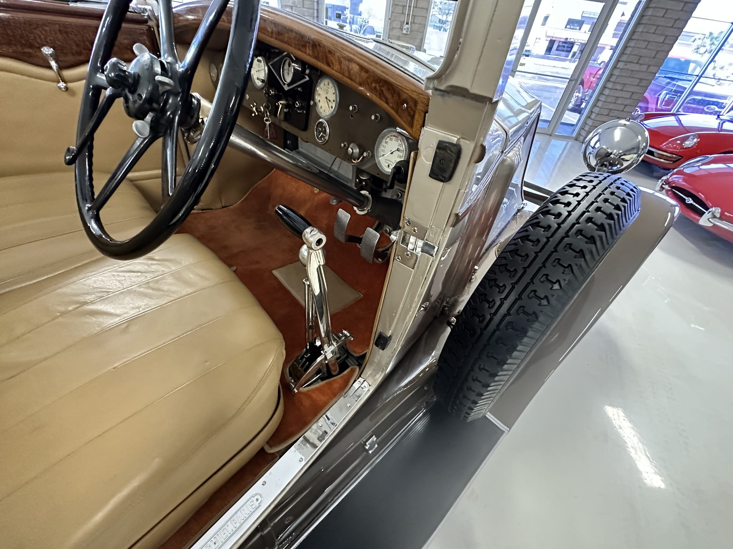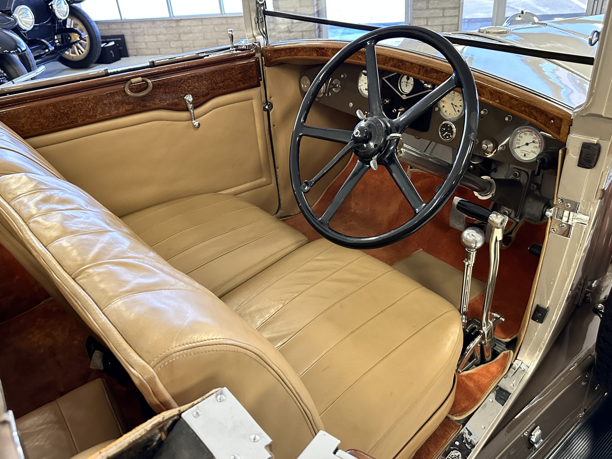 The right-hand-drive cabin houses a pair of bucket seats and a side-facing rear seat trimmed in tan leather while matching upholstery covers the door panels and rumble seat. Gorgeous burl wood surrounds the passenger cabin. Additional features include complimentary orange carpeting, wood door caps, a right-hand gated shifter, roll-up side windows, and a fire extinguisher.