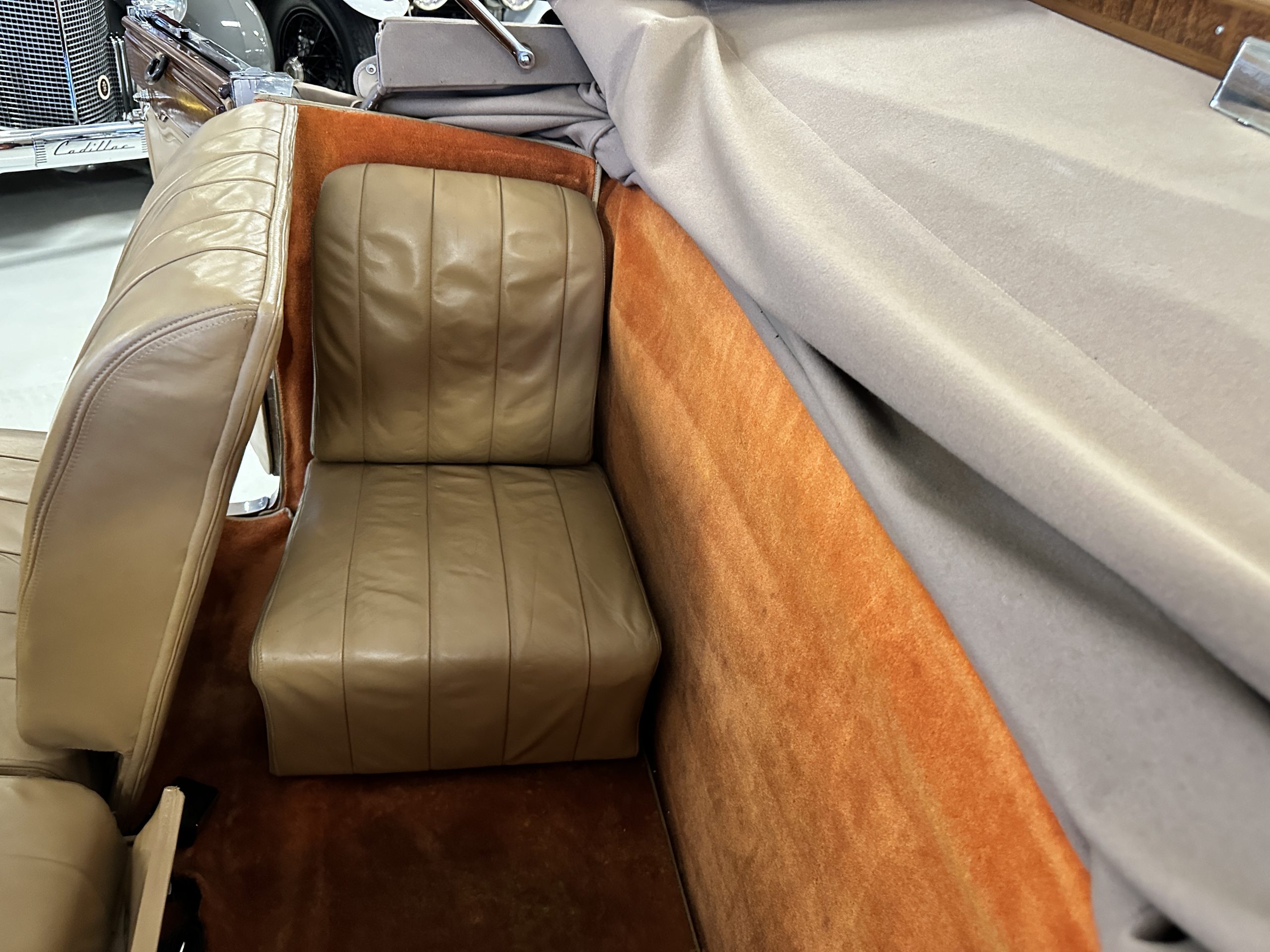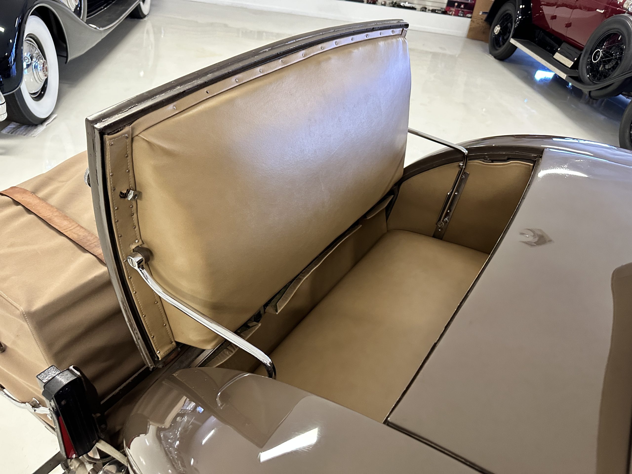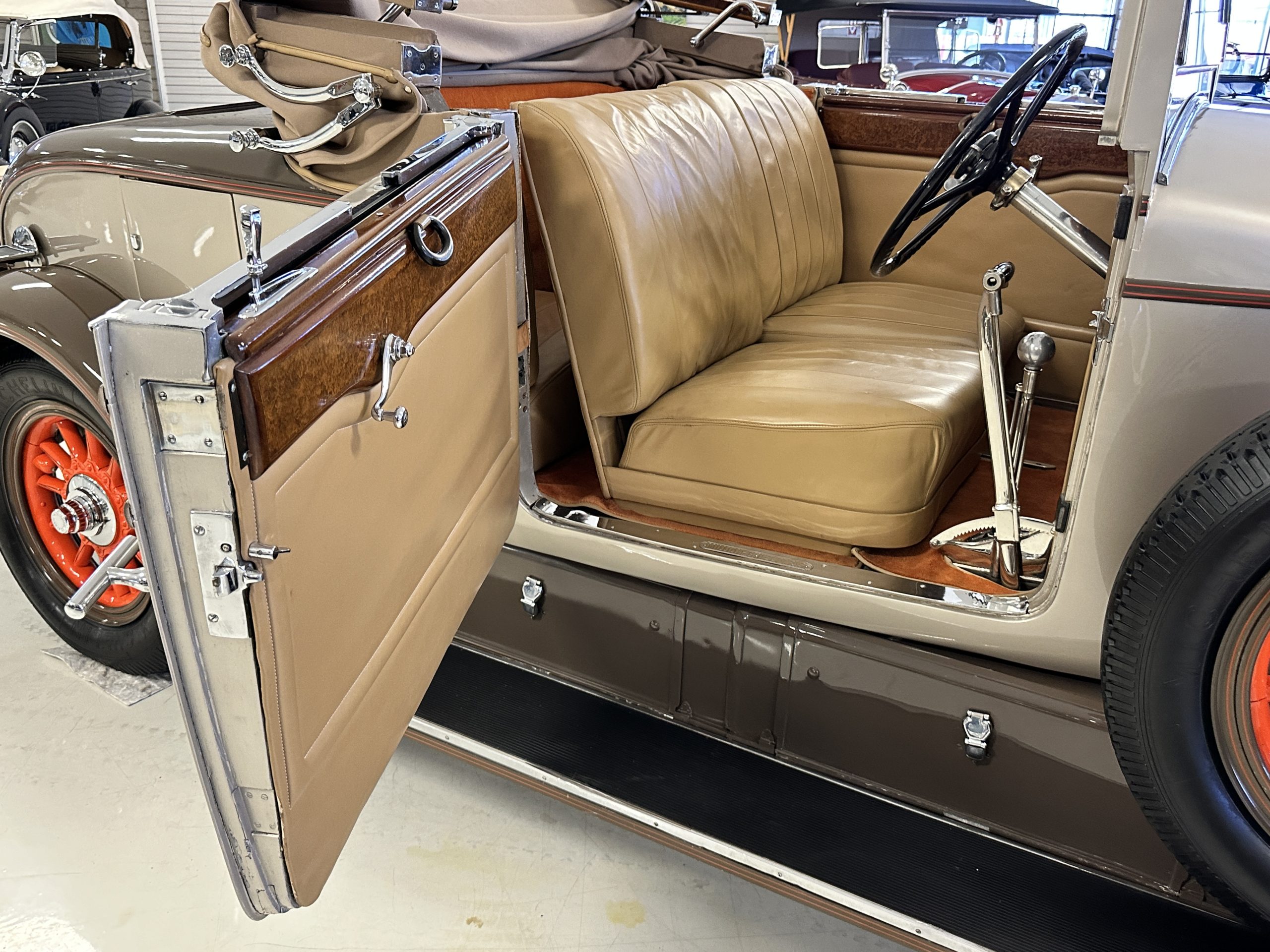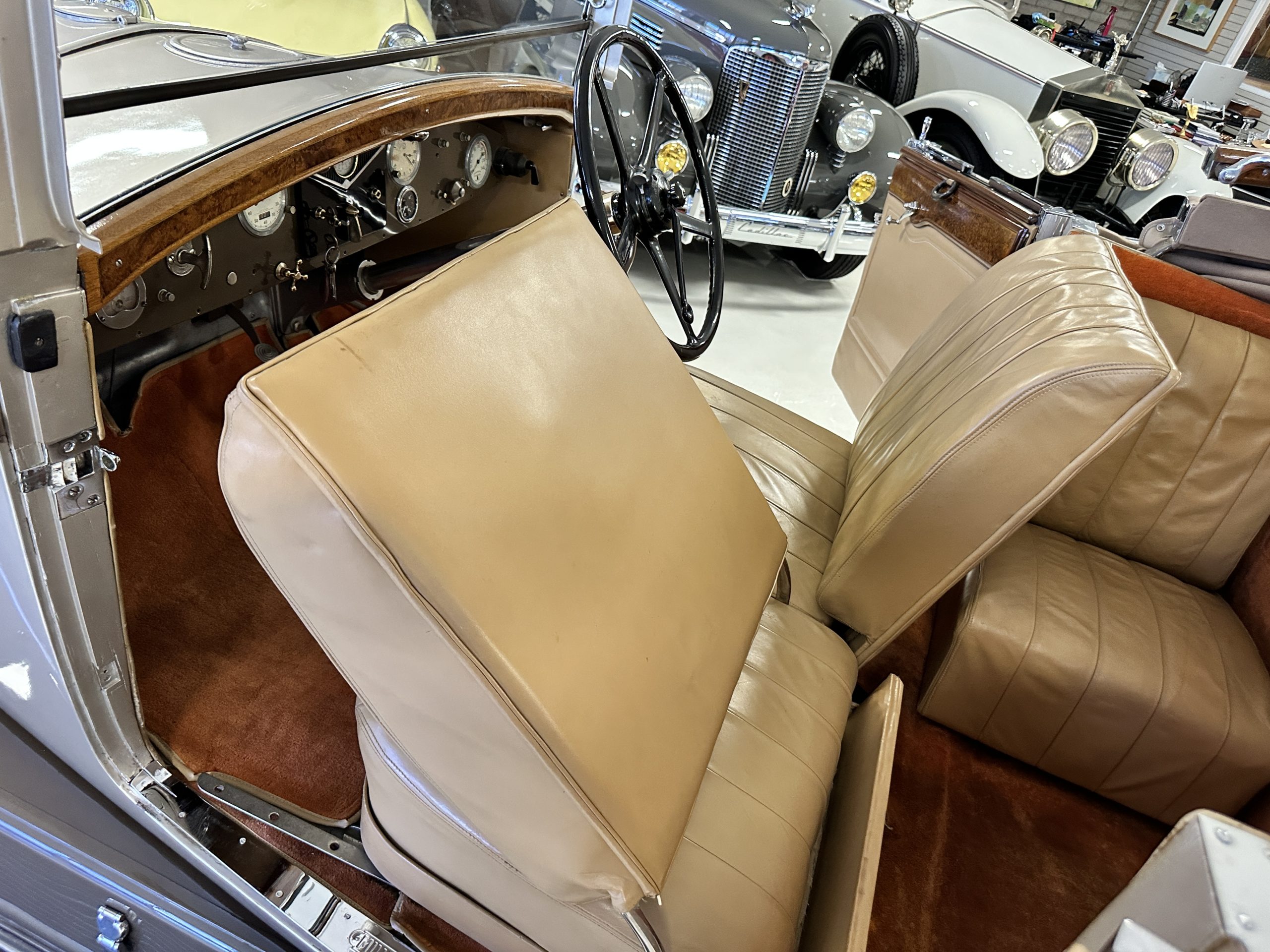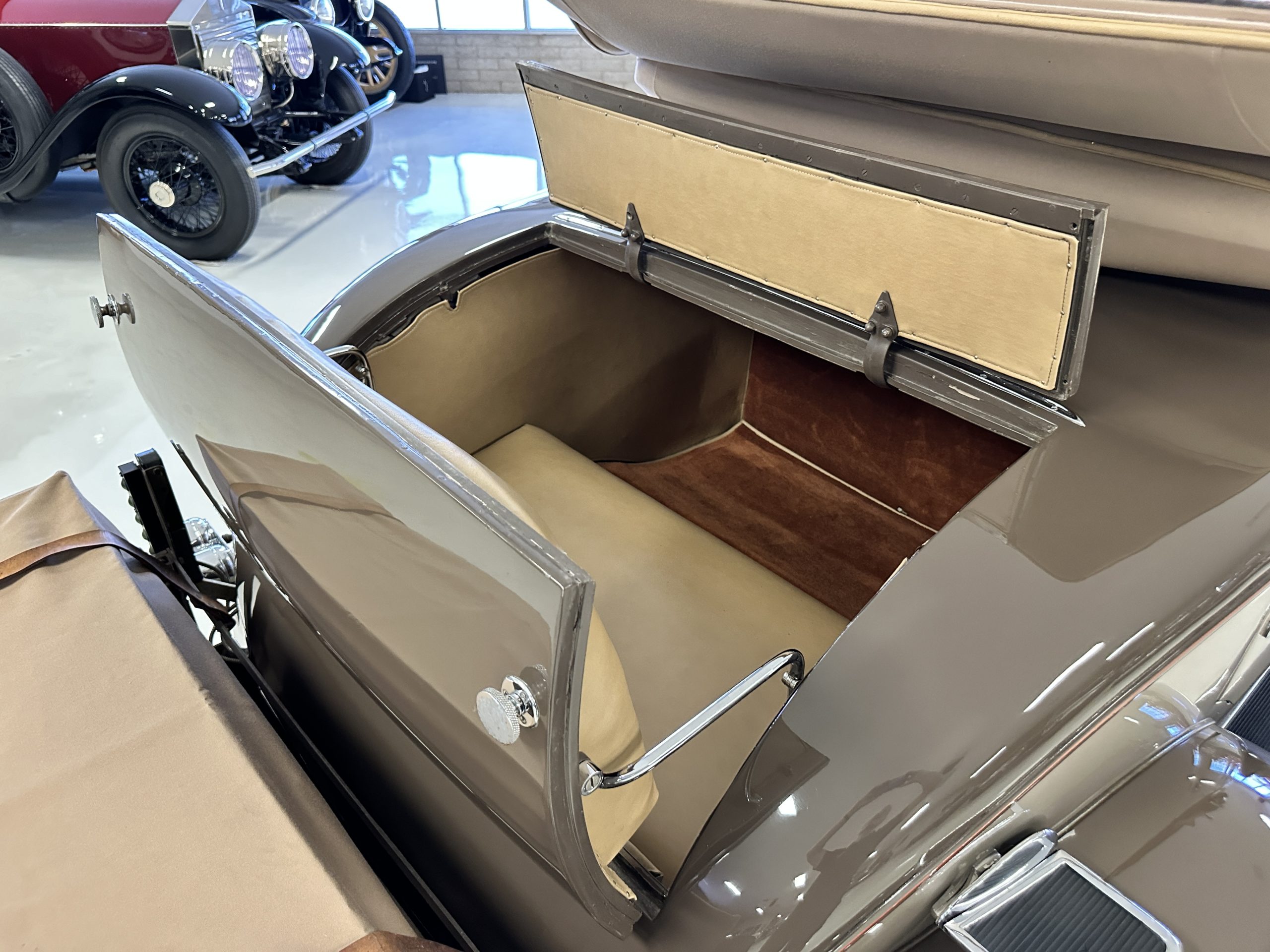 The right-hand-drive cabin houses a pair of bucket seats and a side-facing rear seat trimmed in tan leather while matching upholstery covers the door panels and rumble seat. Gorgeous burl wood surrounds the passenger cabin. Additional features include complimentary orange carpeting, wood door caps, a right-hand gated shifter, roll-up side windows, and a fire extinguisher.