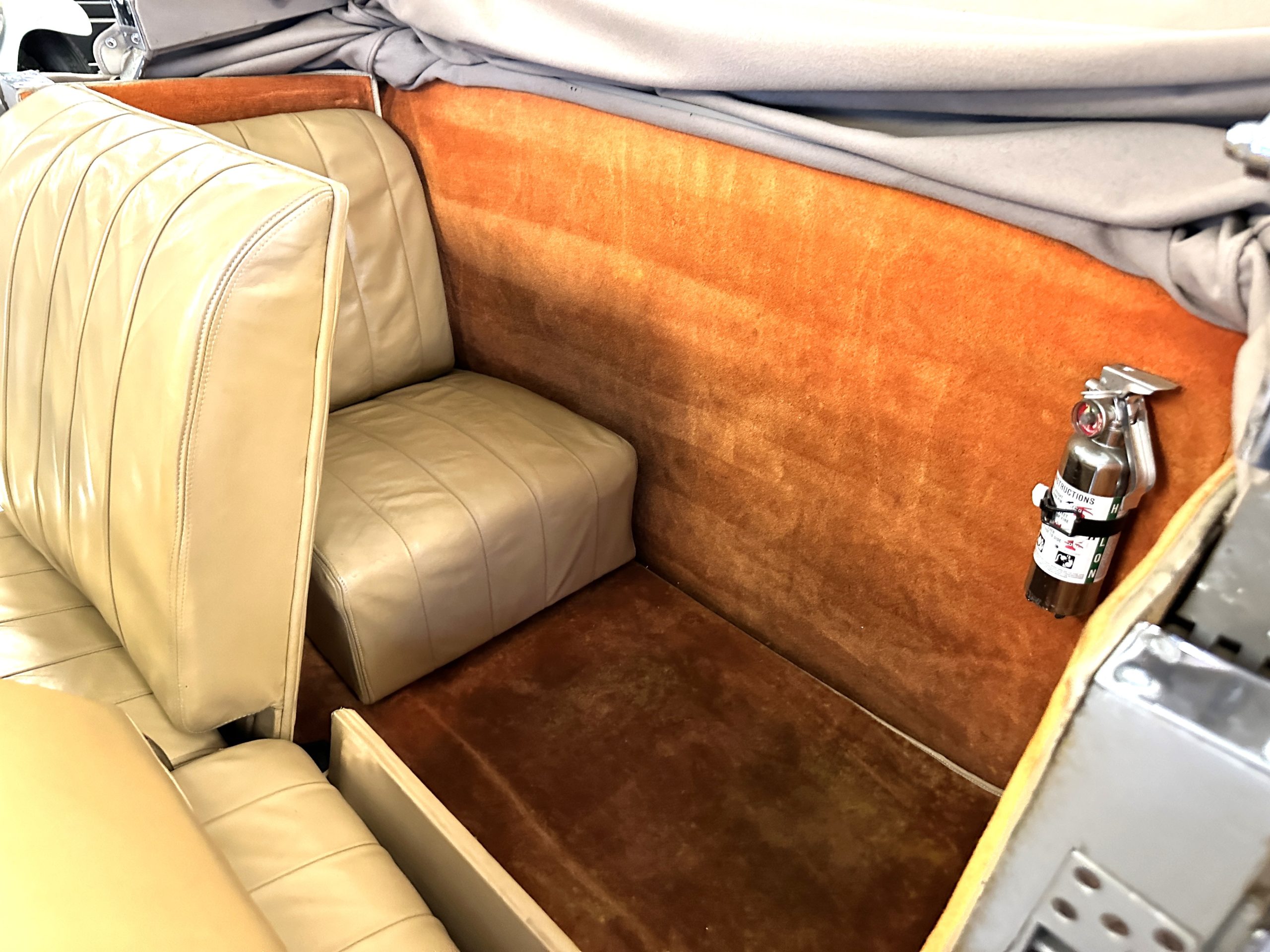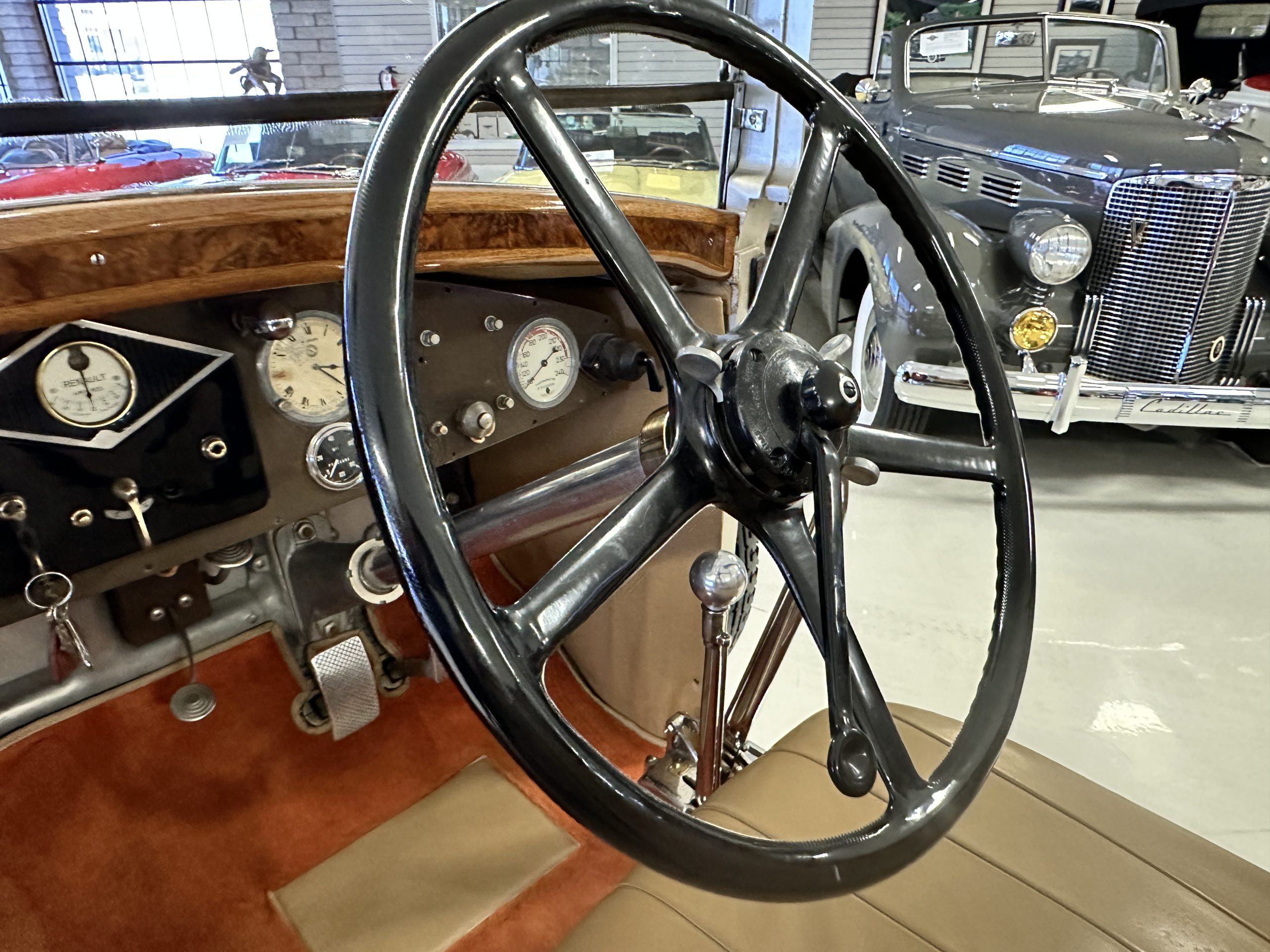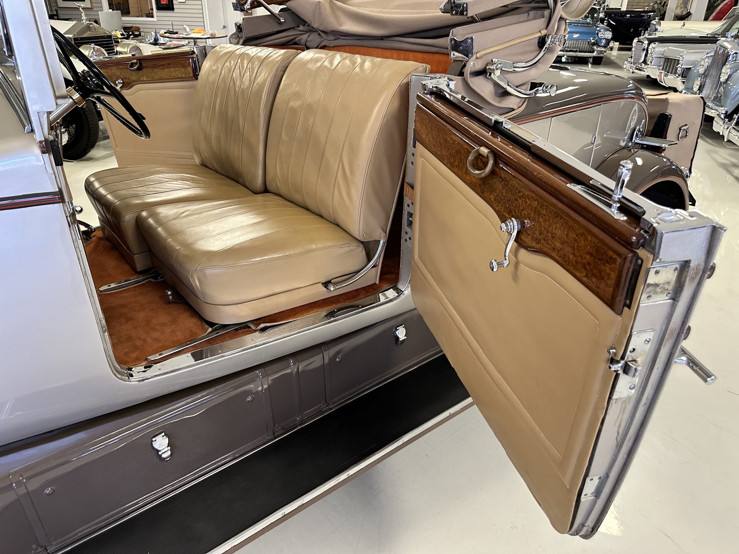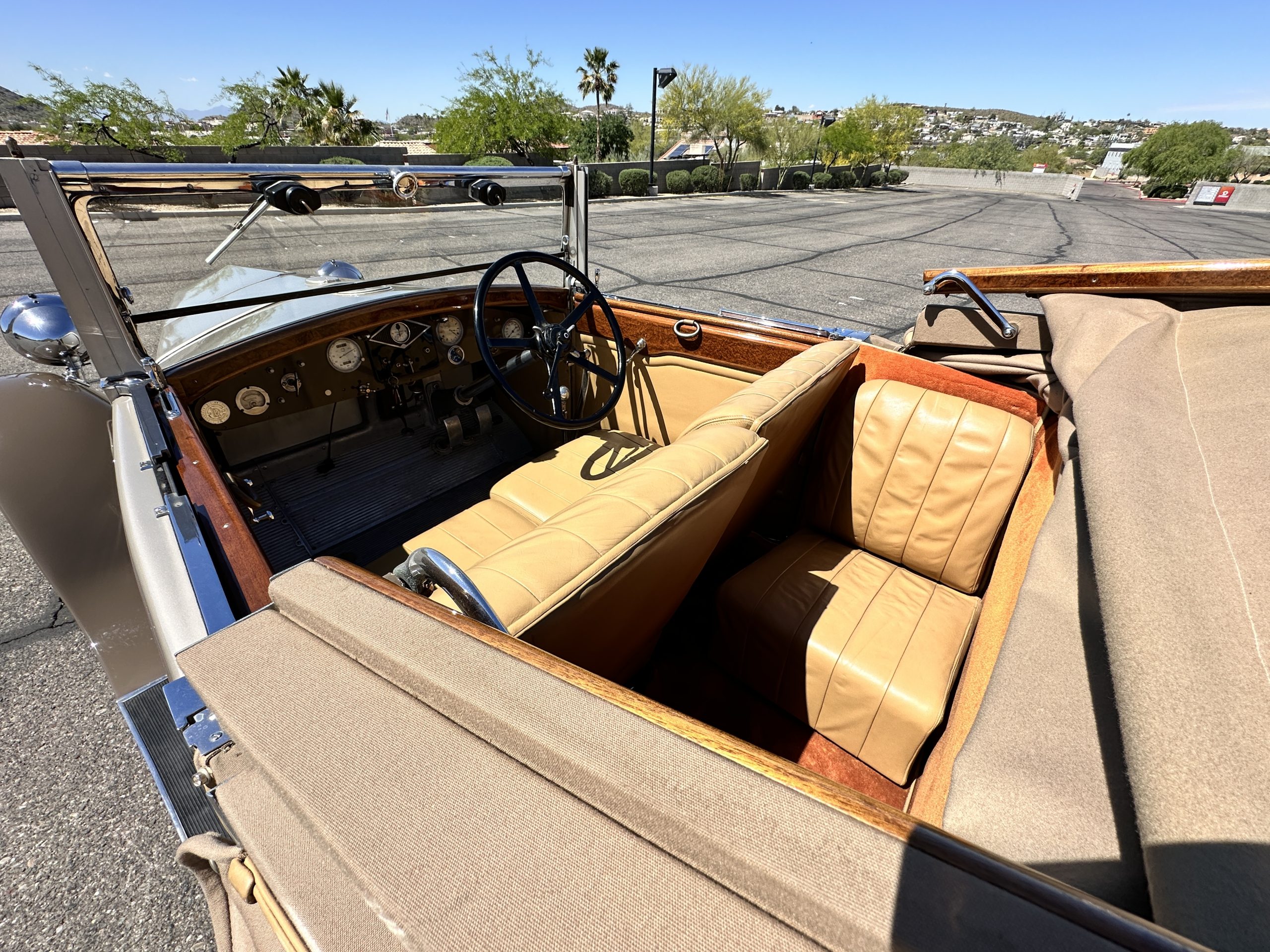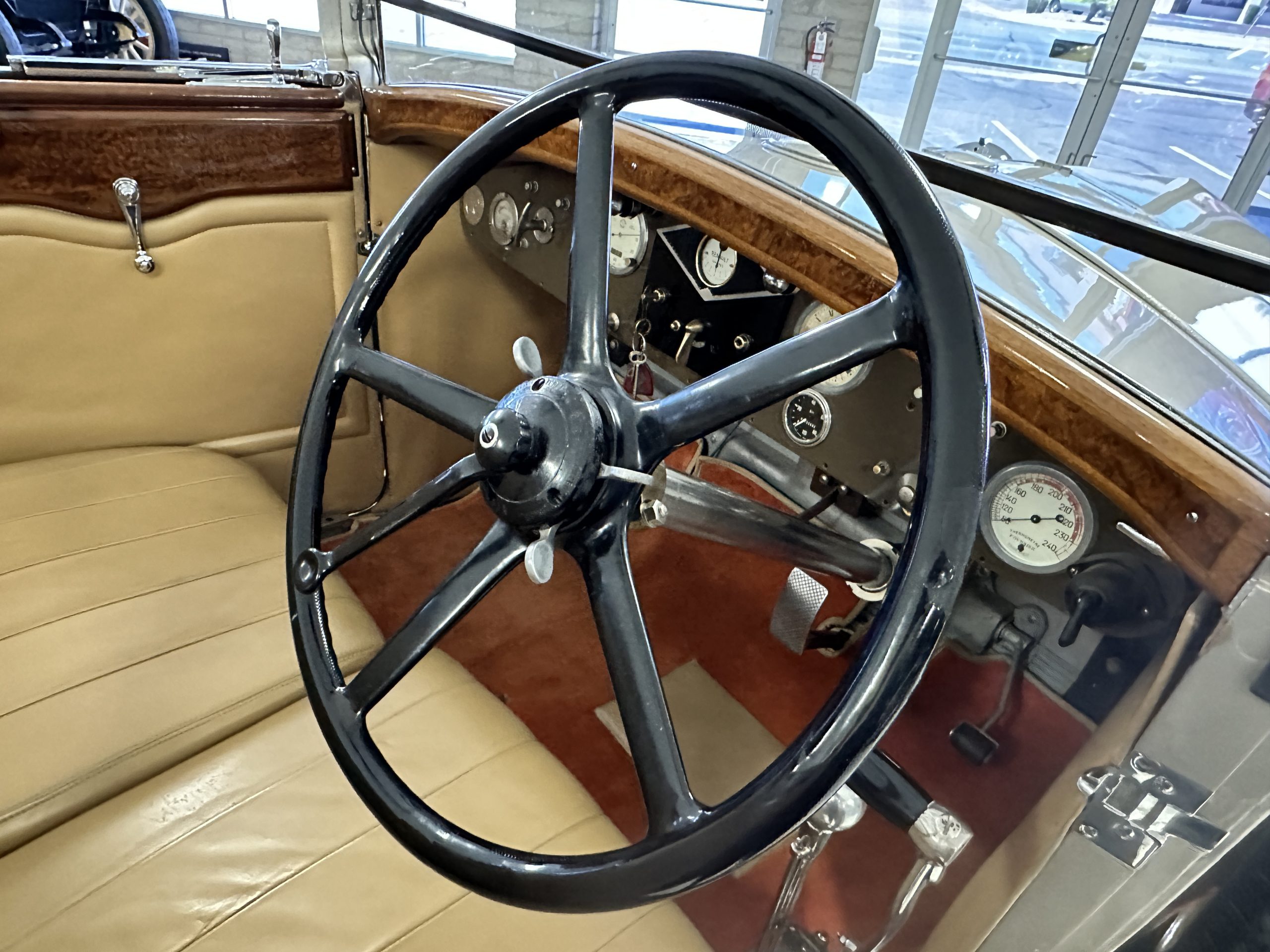The right-hand-drive cabin houses a pair of bucket seats and a side-facing rear seat trimmed in tan leather while matching upholstery covers the door panels and rumble seat. Gorgeous burl wood surrounds the passenger cabin. Additional features include complimentary orange carpeting, wood door caps, a right-hand gated shifter, roll-up side windows, and a fire extinguisher.