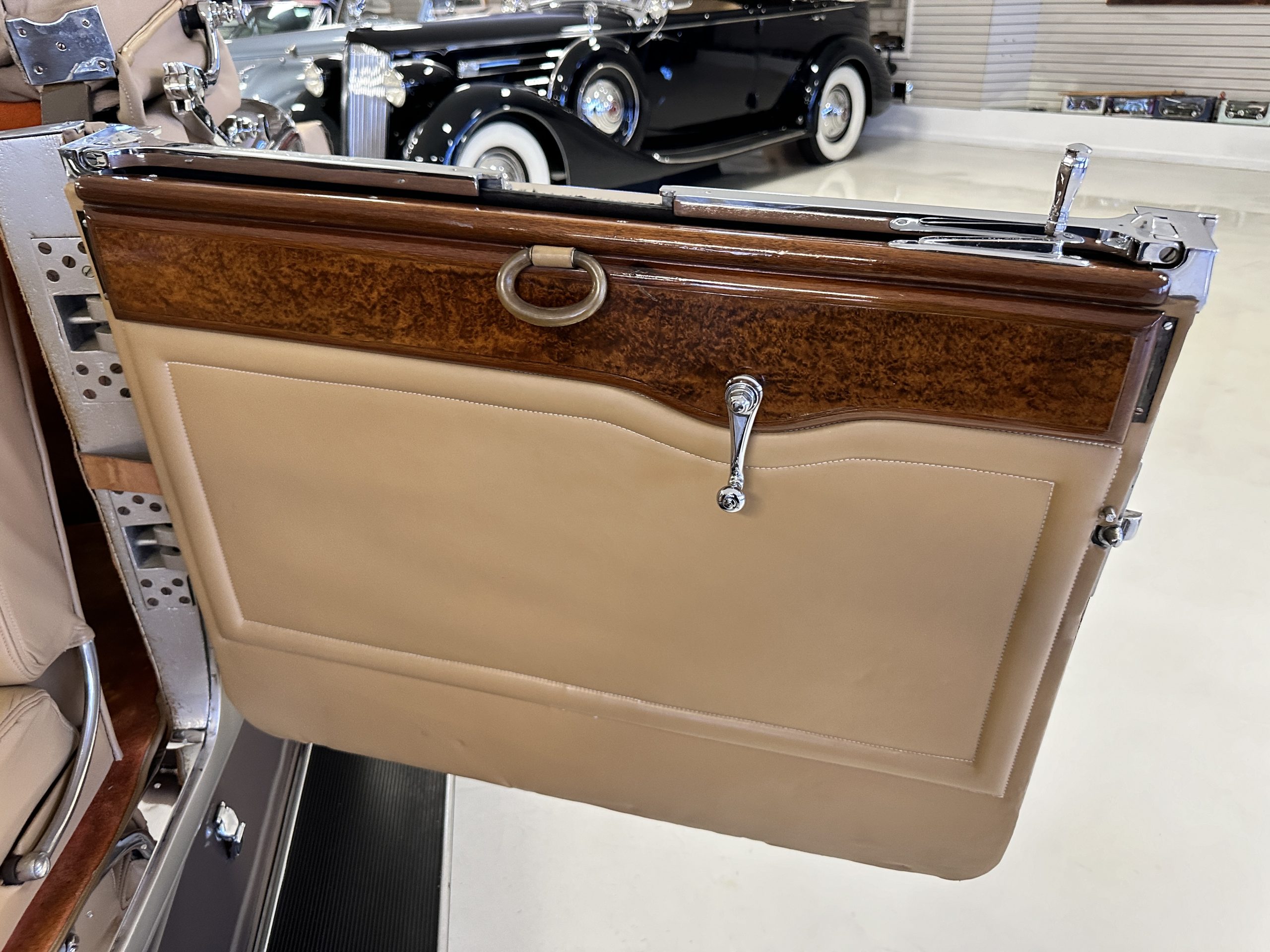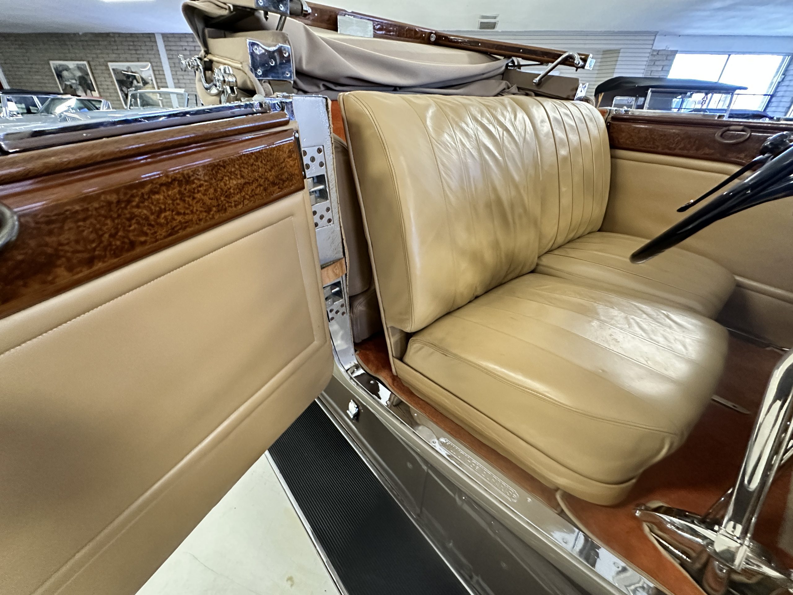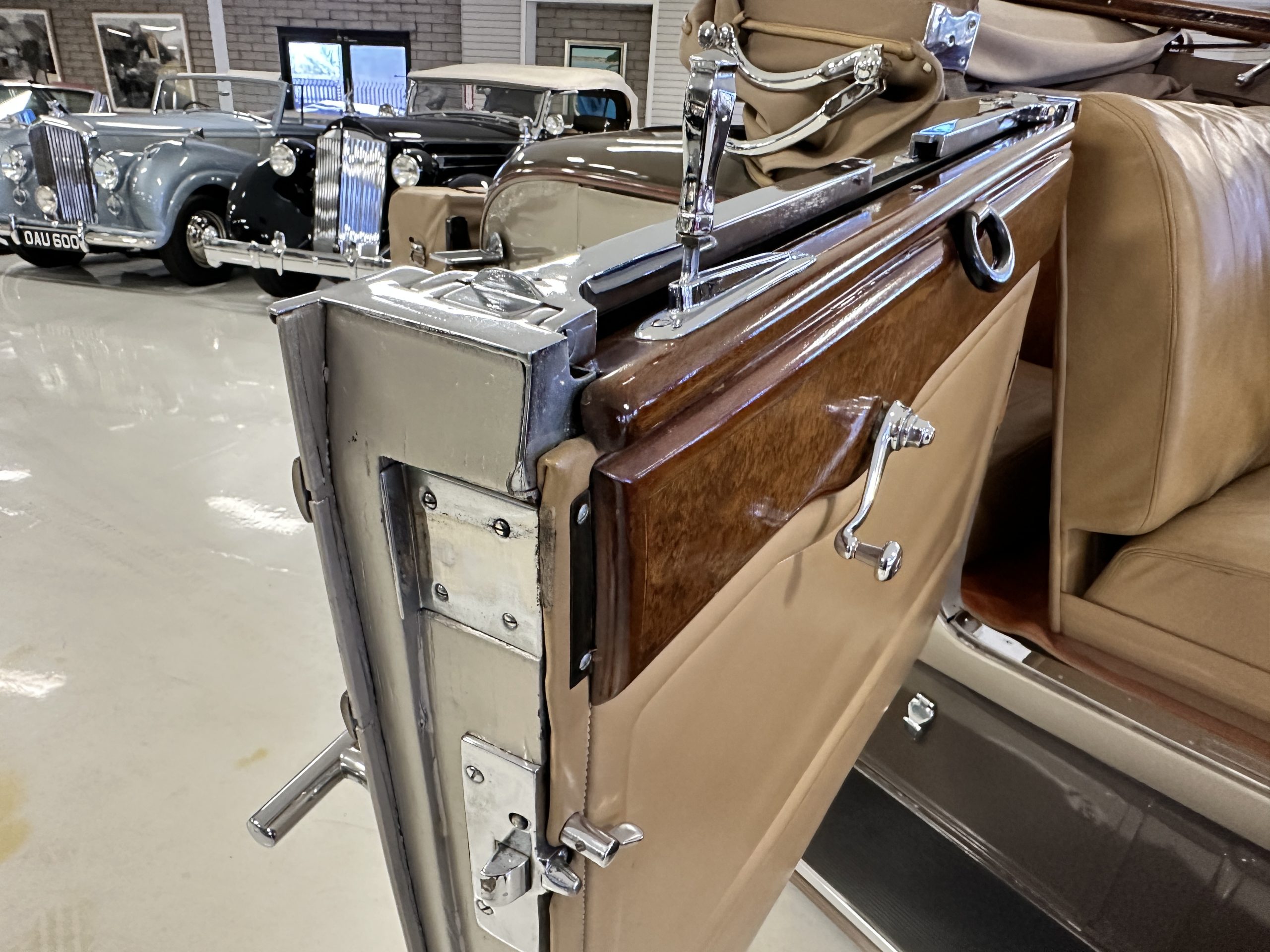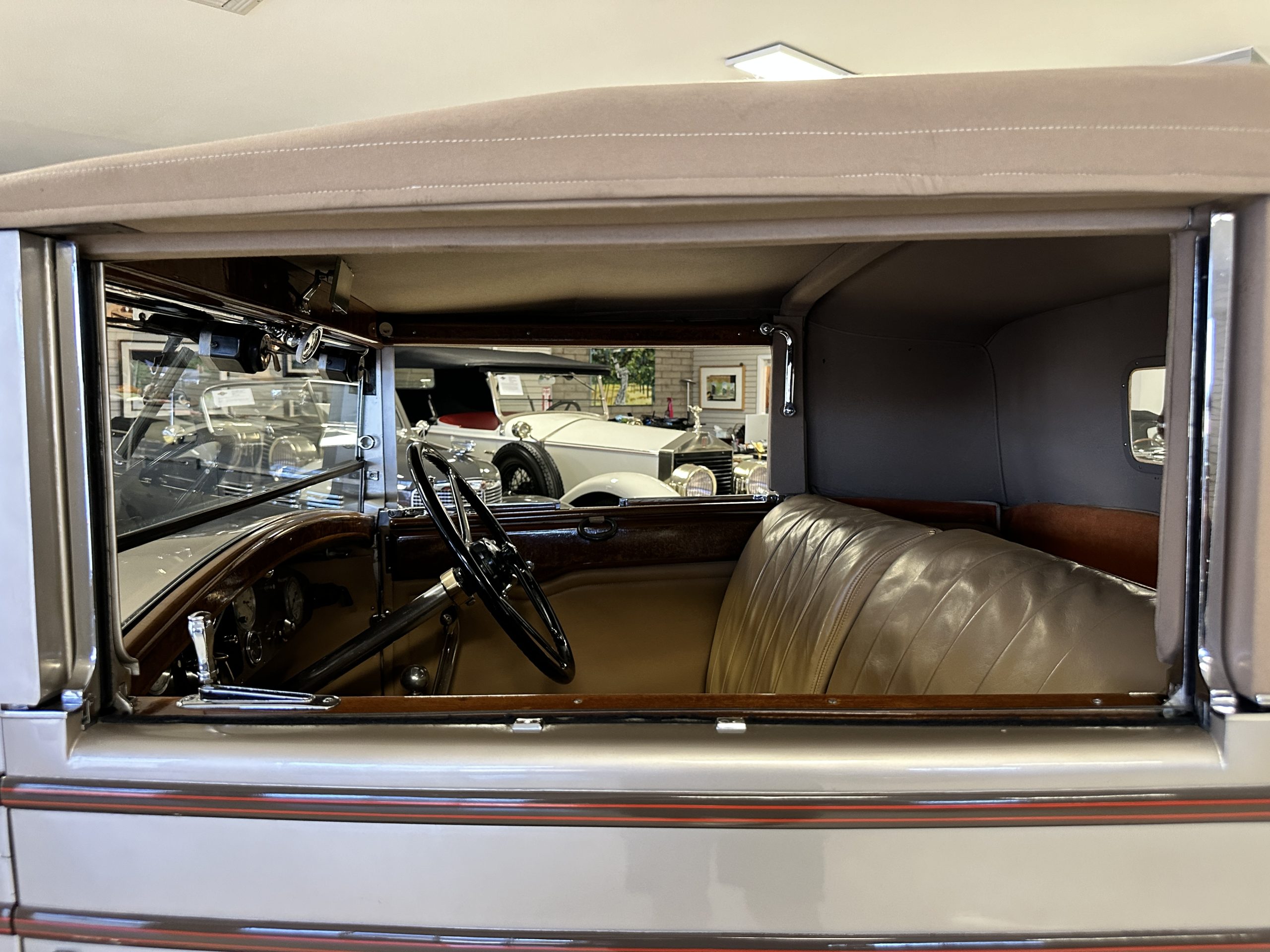 The right-hand-drive cabin houses a pair of bucket seats and a side-facing rear seat trimmed in tan leather while matching upholstery covers the door panels and rumble seat. Gorgeous burl wood surrounds the passenger cabin. Additional features include complimentary orange carpeting, wood door caps, a right-hand gated shifter, roll-up side windows, and a fire extinguisher.