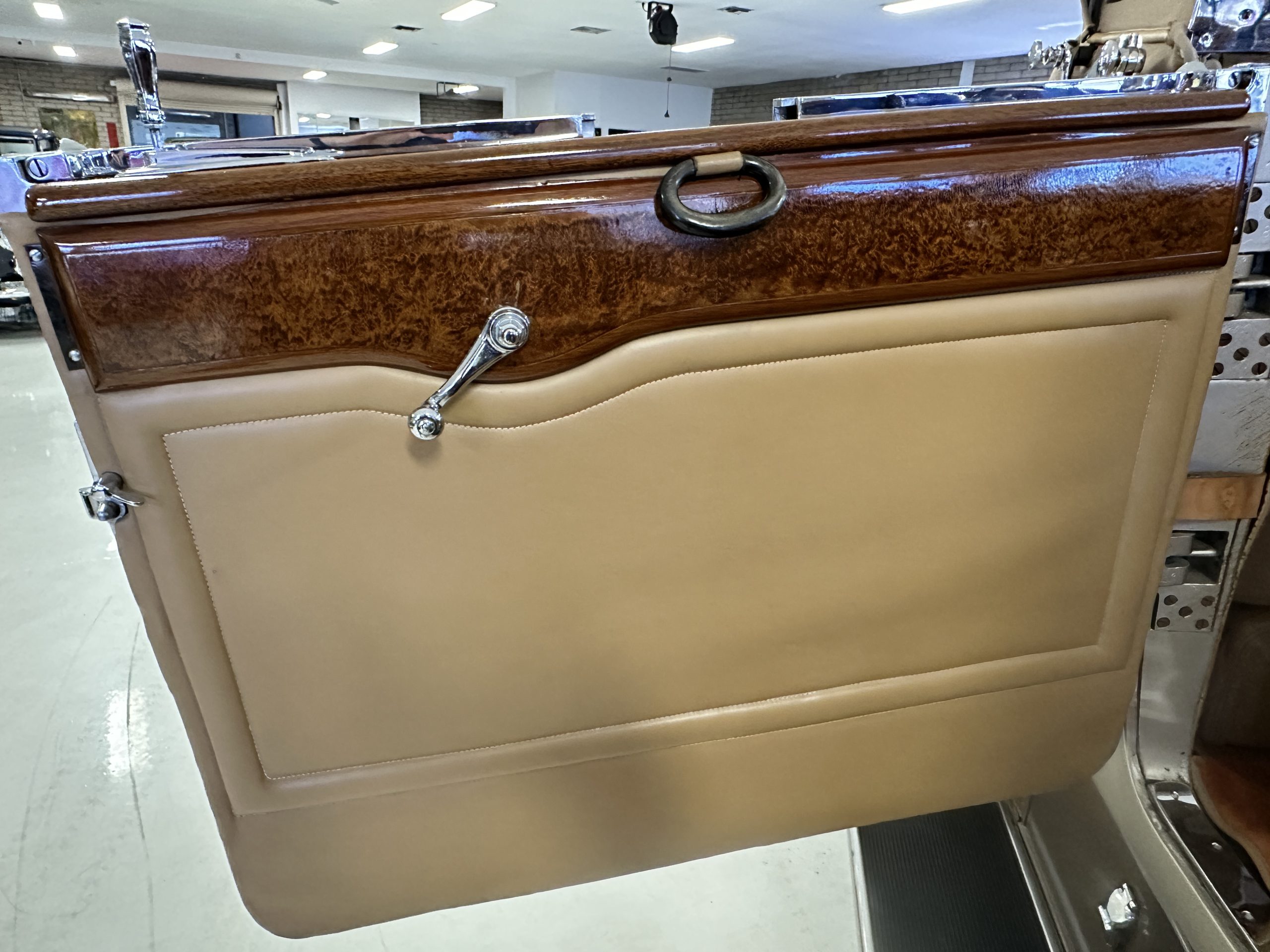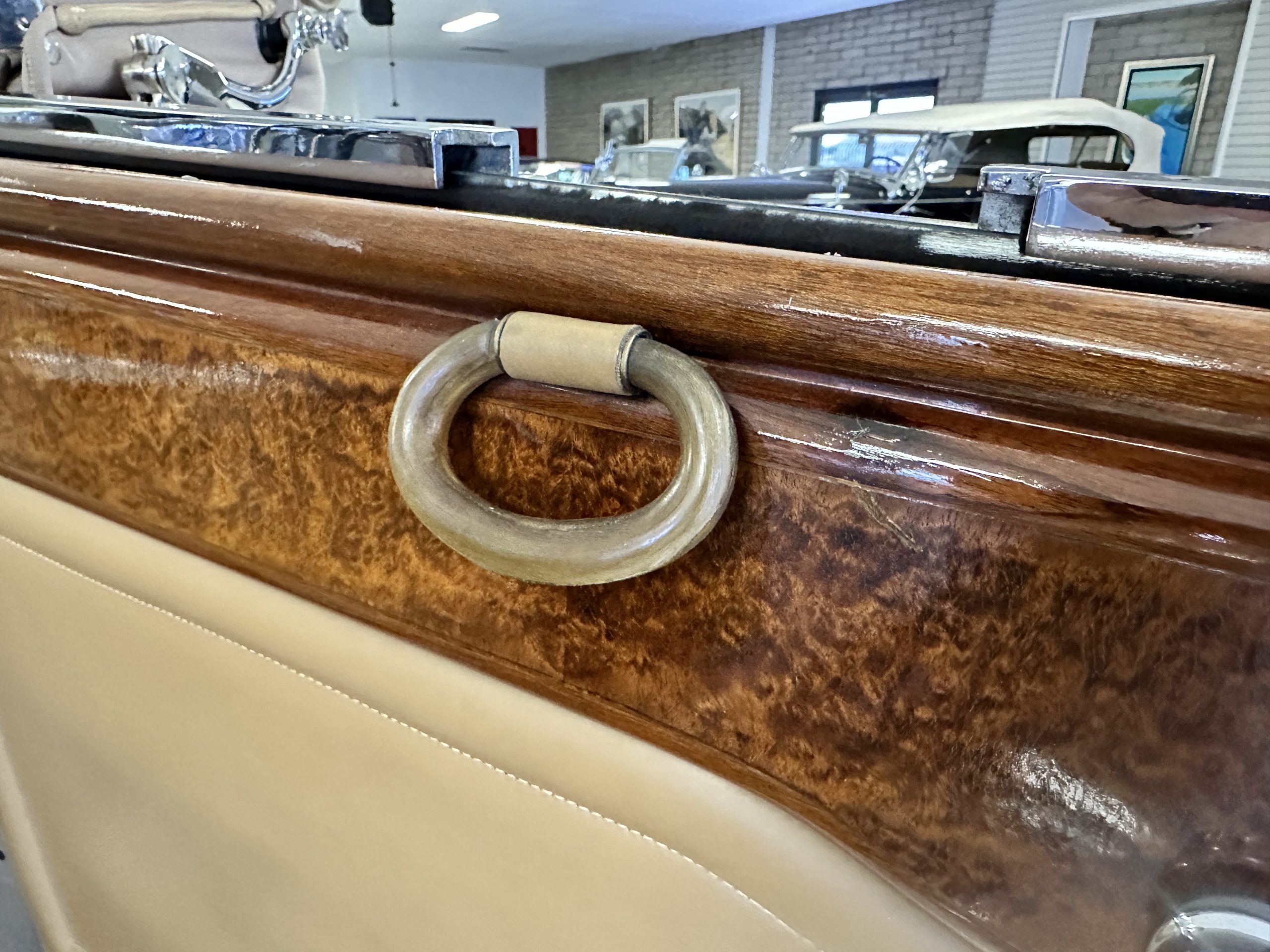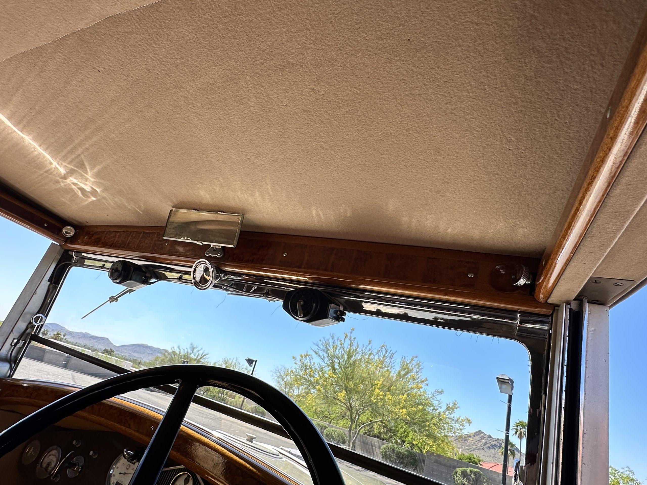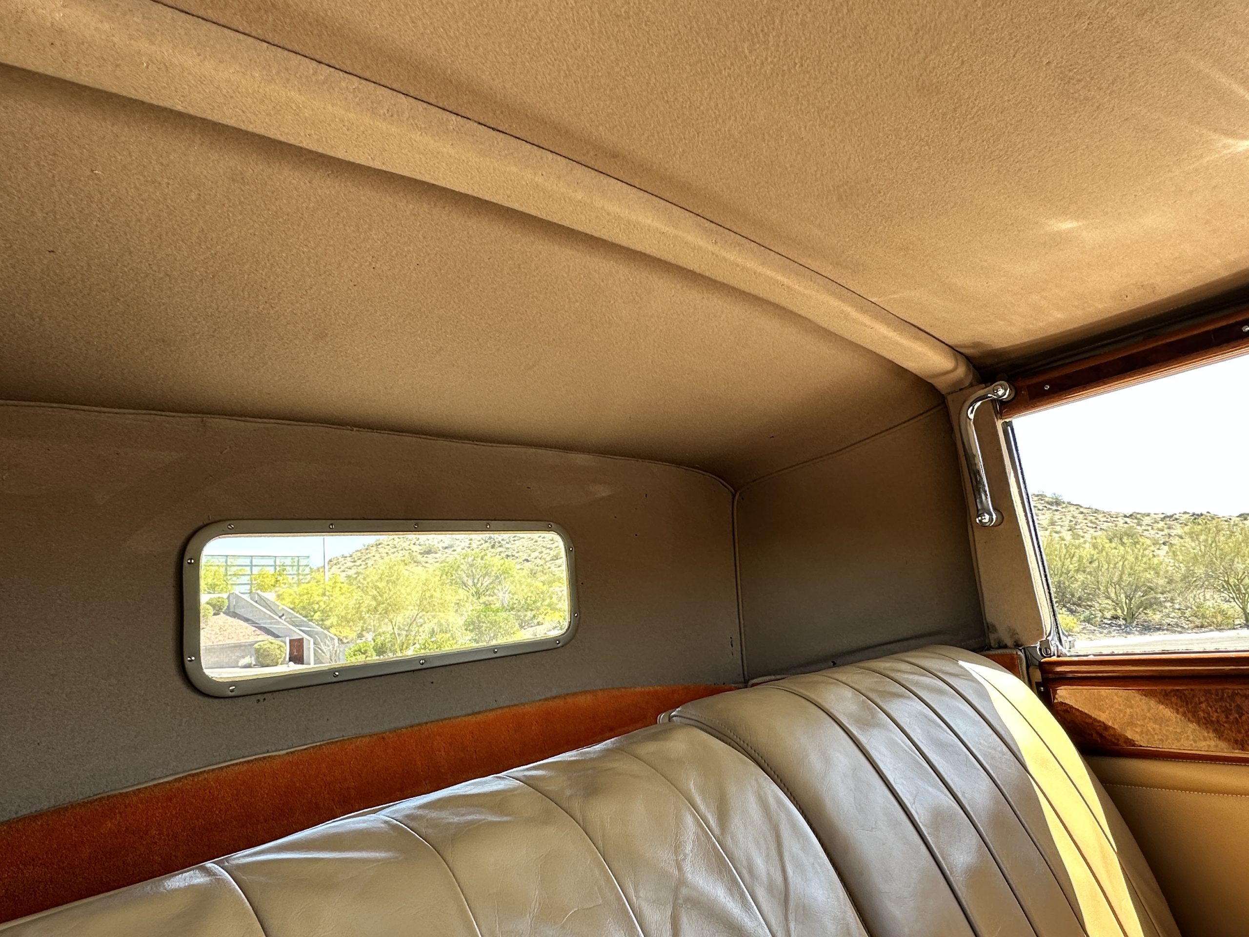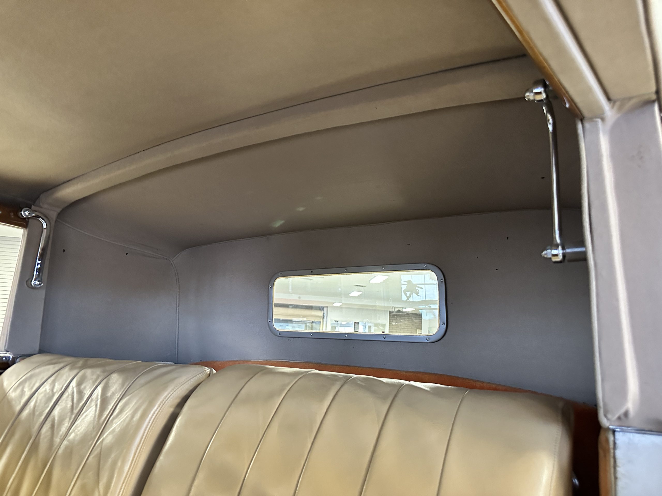 The right-hand-drive cabin houses a pair of bucket seats and a side-facing rear seat trimmed in tan leather while matching upholstery covers the door panels and rumble seat. Gorgeous burl wood surrounds the passenger cabin. Additional features include complimentary orange carpeting, wood door caps, a right-hand gated shifter, roll-up side windows, and a fire extinguisher.