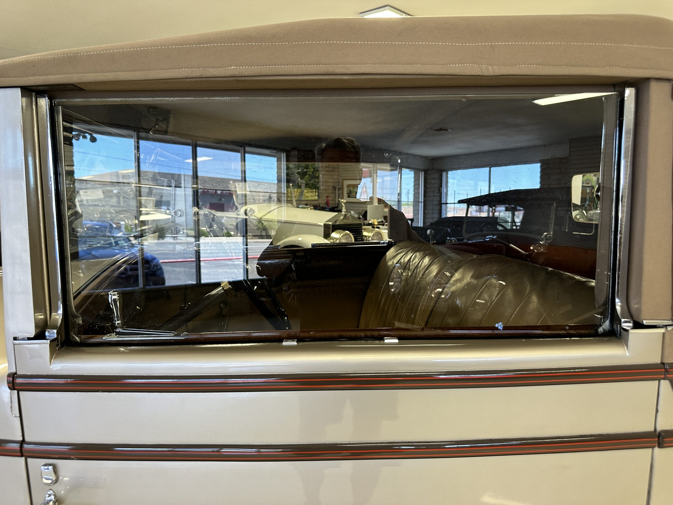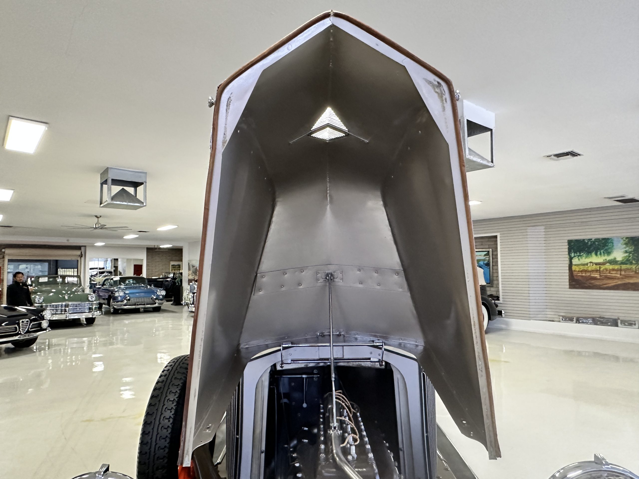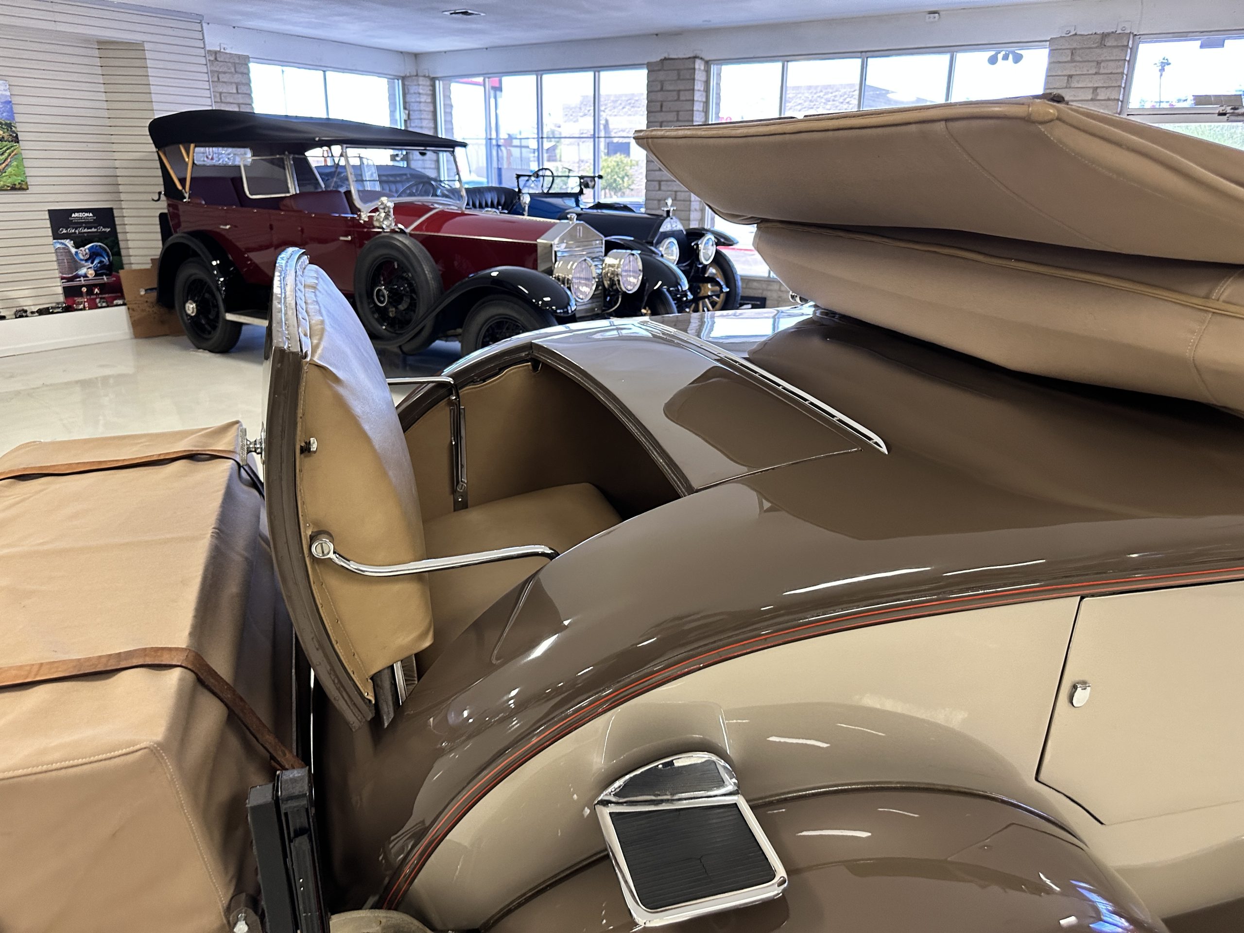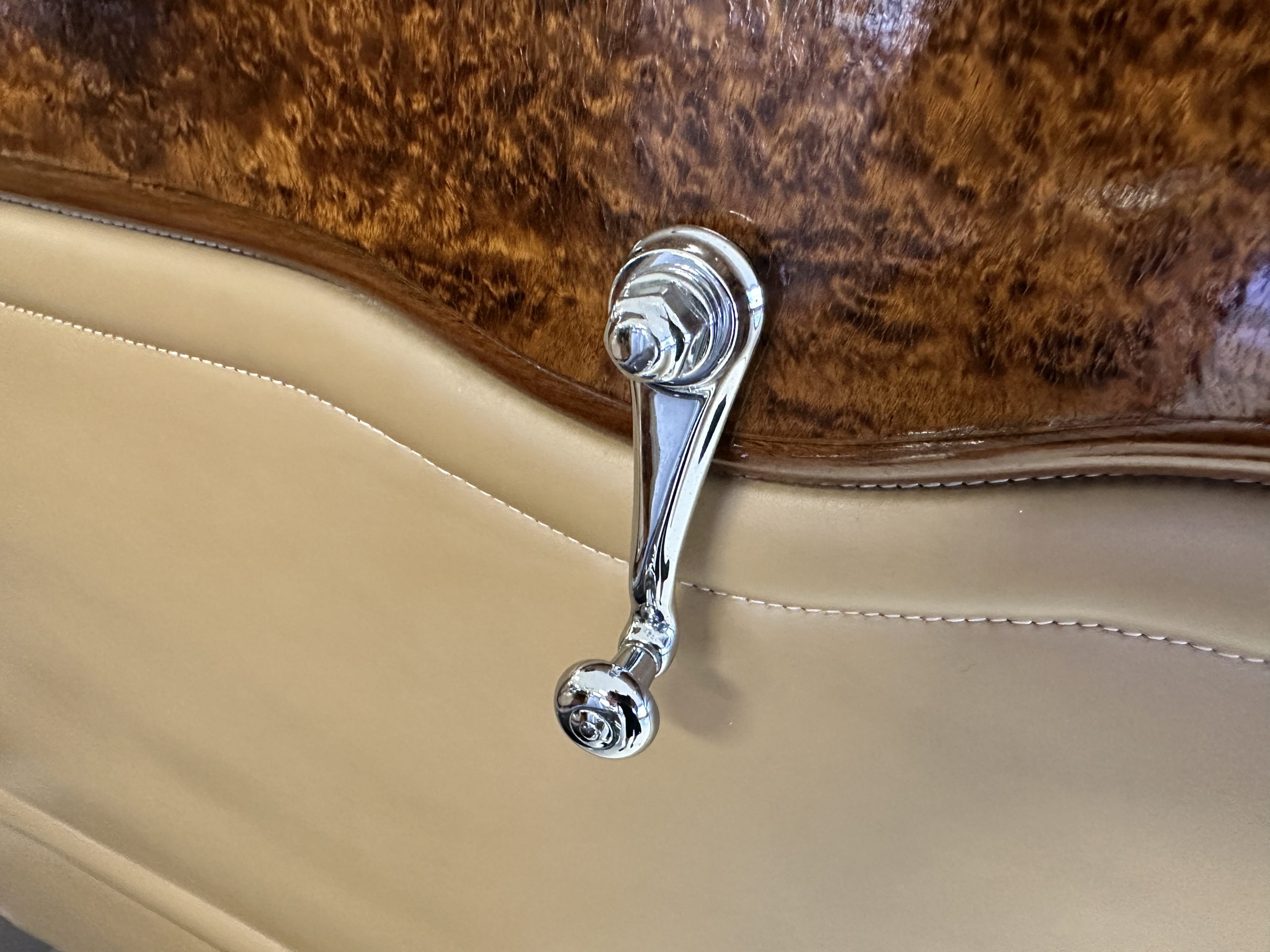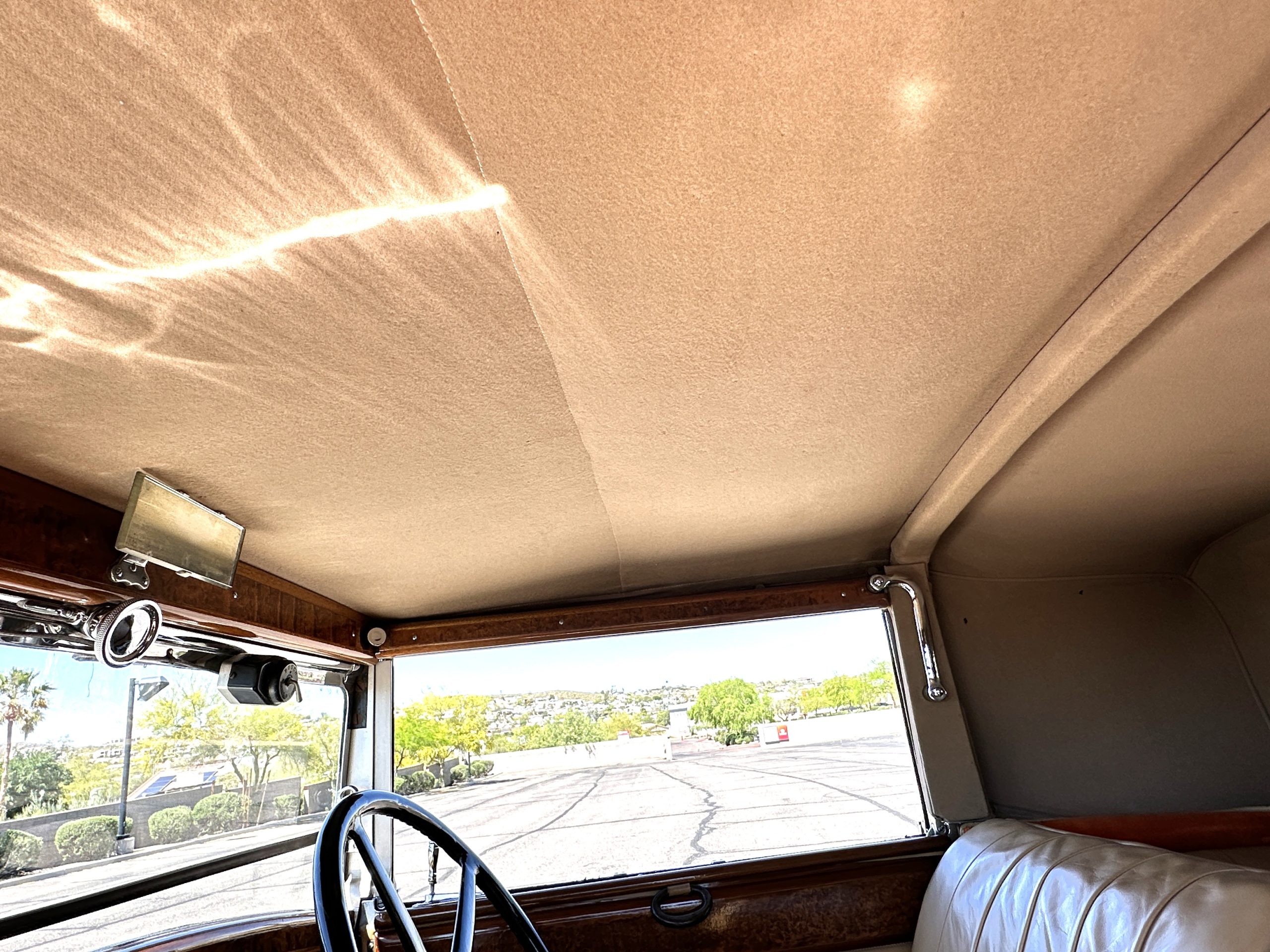 The right-hand-drive cabin houses a pair of bucket seats and a side-facing rear seat trimmed in tan leather while matching upholstery covers the door panels and rumble seat. Gorgeous burl wood surrounds the passenger cabin. Additional features include complimentary orange carpeting, wood door caps, a right-hand gated shifter, roll-up side windows, and a fire extinguisher.