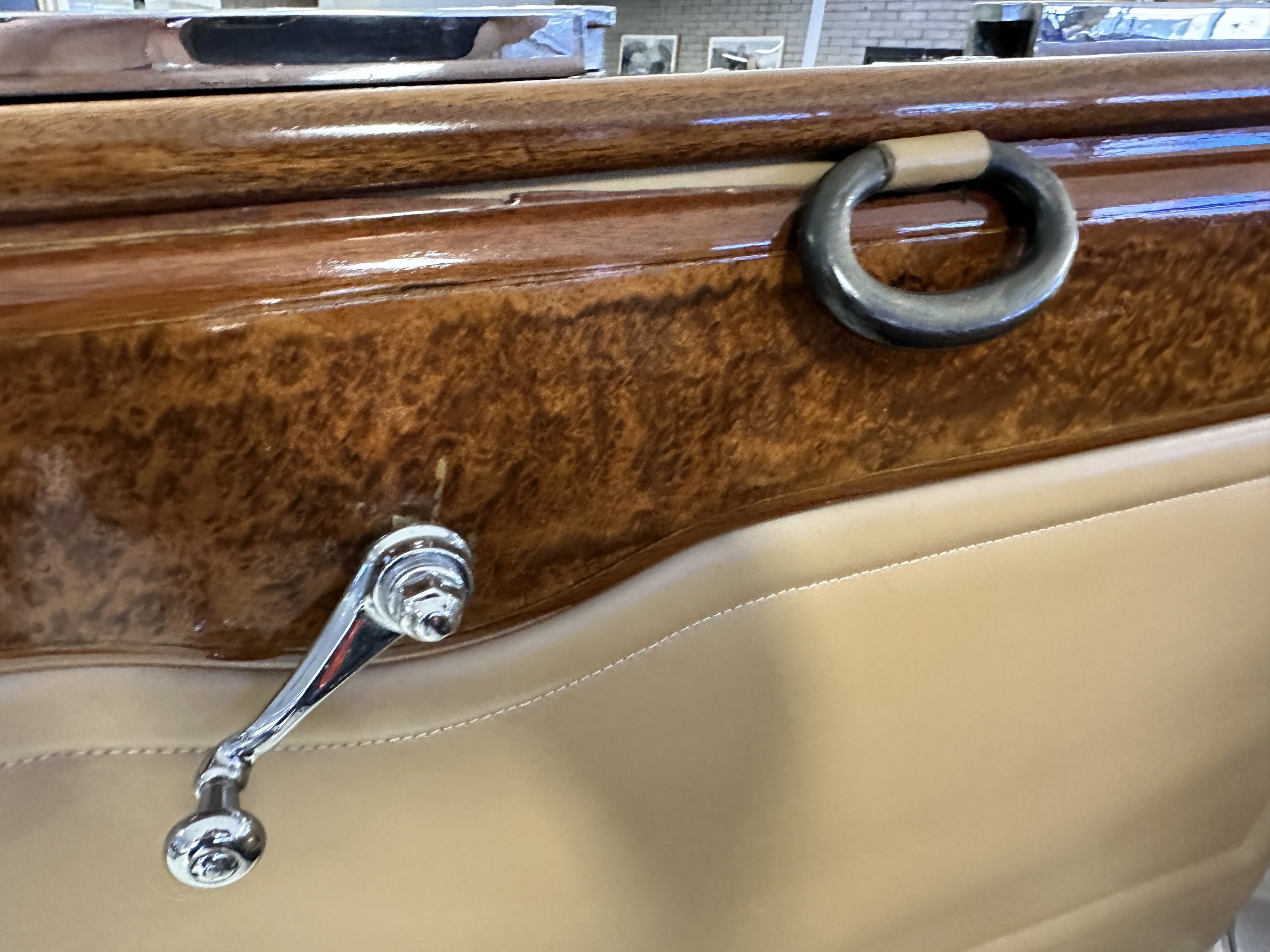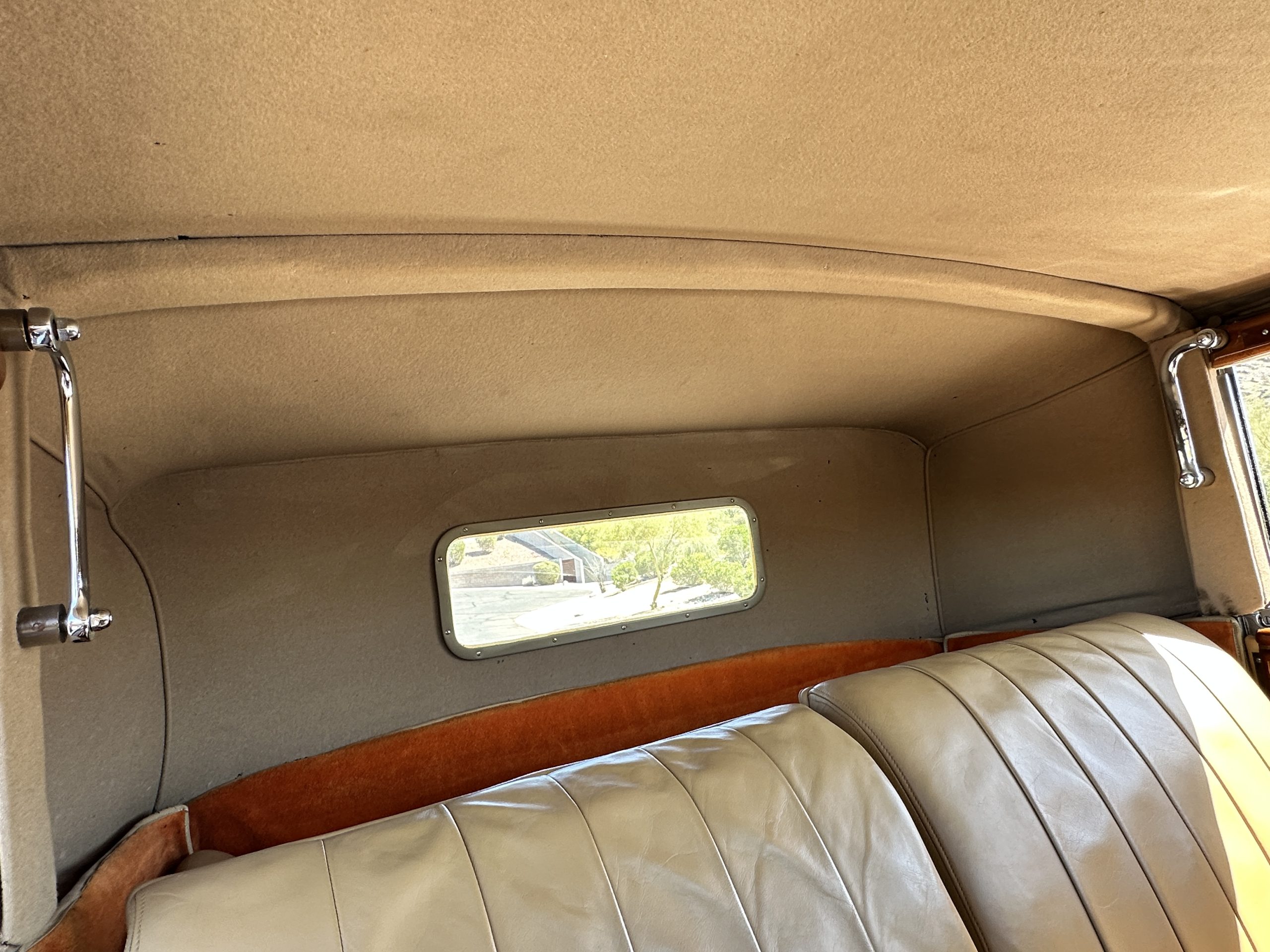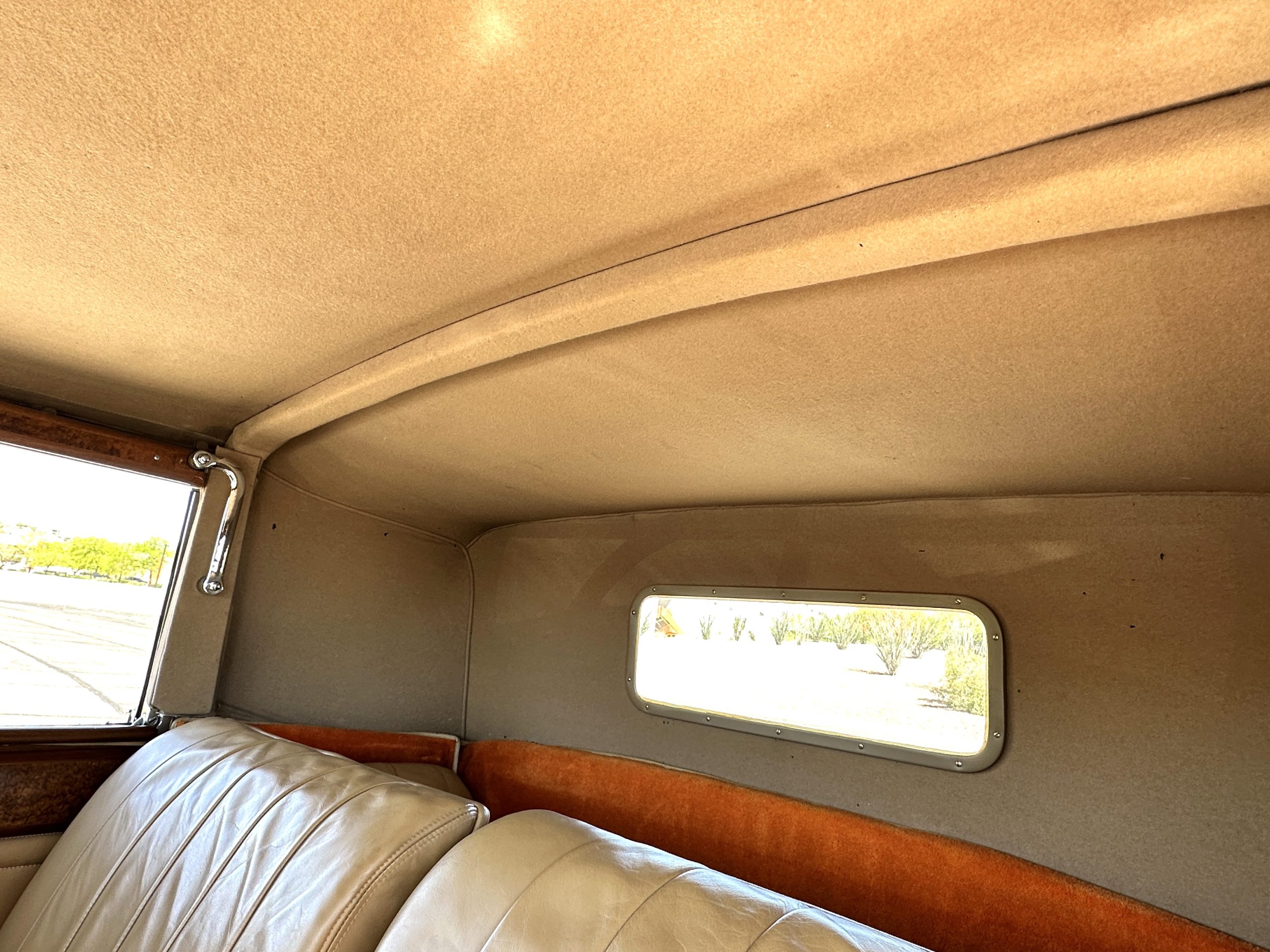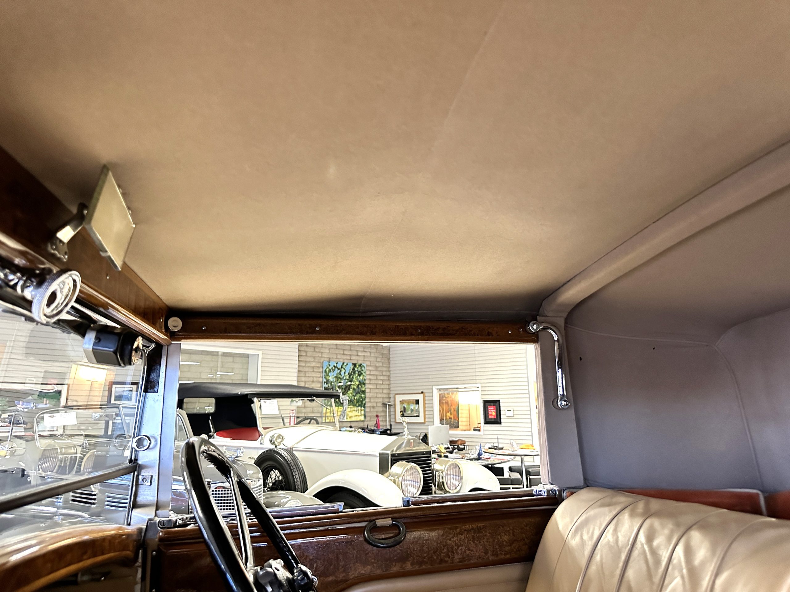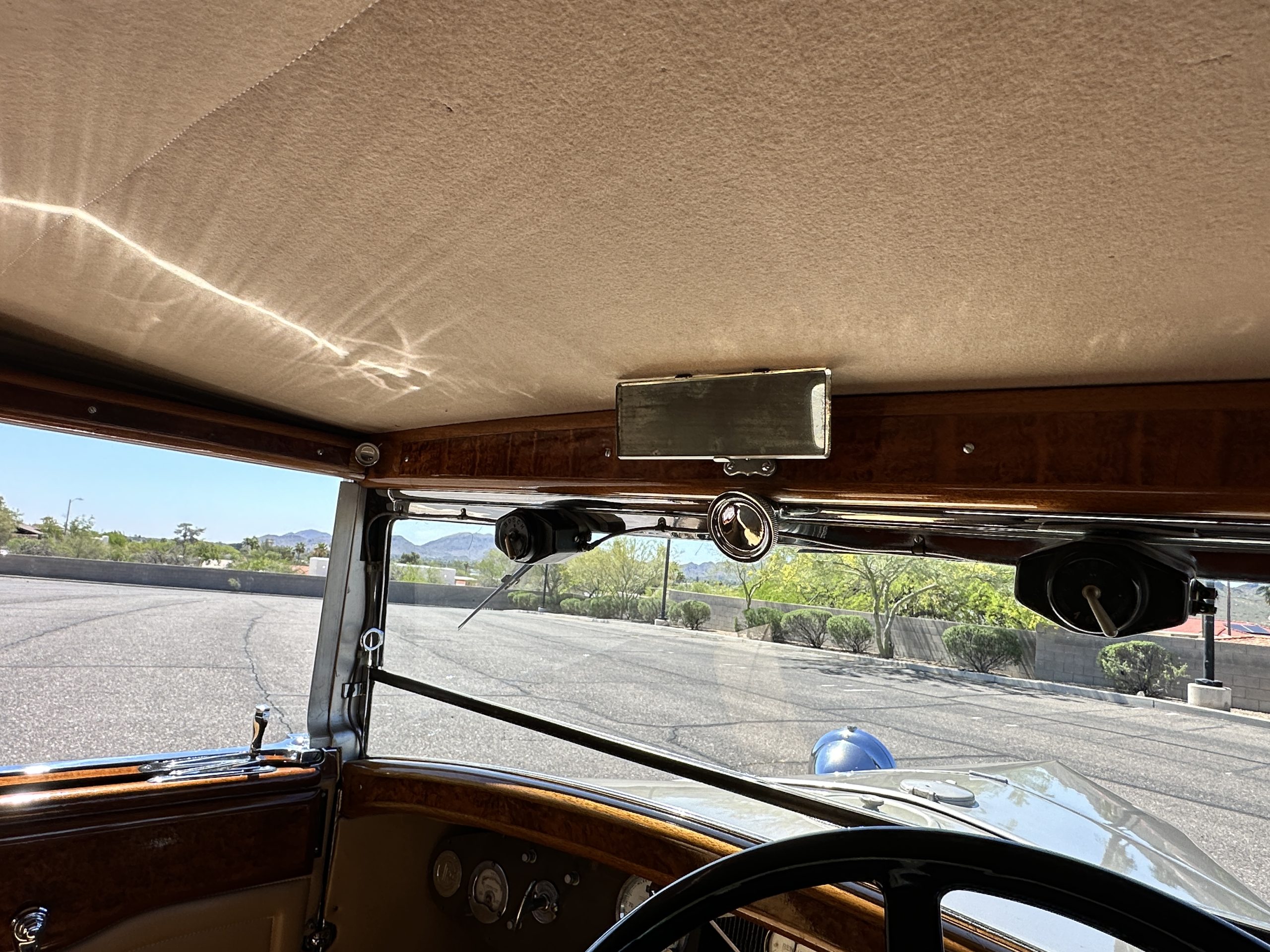 The right-hand-drive cabin houses a pair of bucket seats and a side-facing rear seat trimmed in tan leather while matching upholstery covers the door panels and rumble seat. Gorgeous burl wood surrounds the passenger cabin. Additional features include complimentary orange carpeting, wood door caps, a right-hand gated shifter, roll-up side windows, and a fire extinguisher.