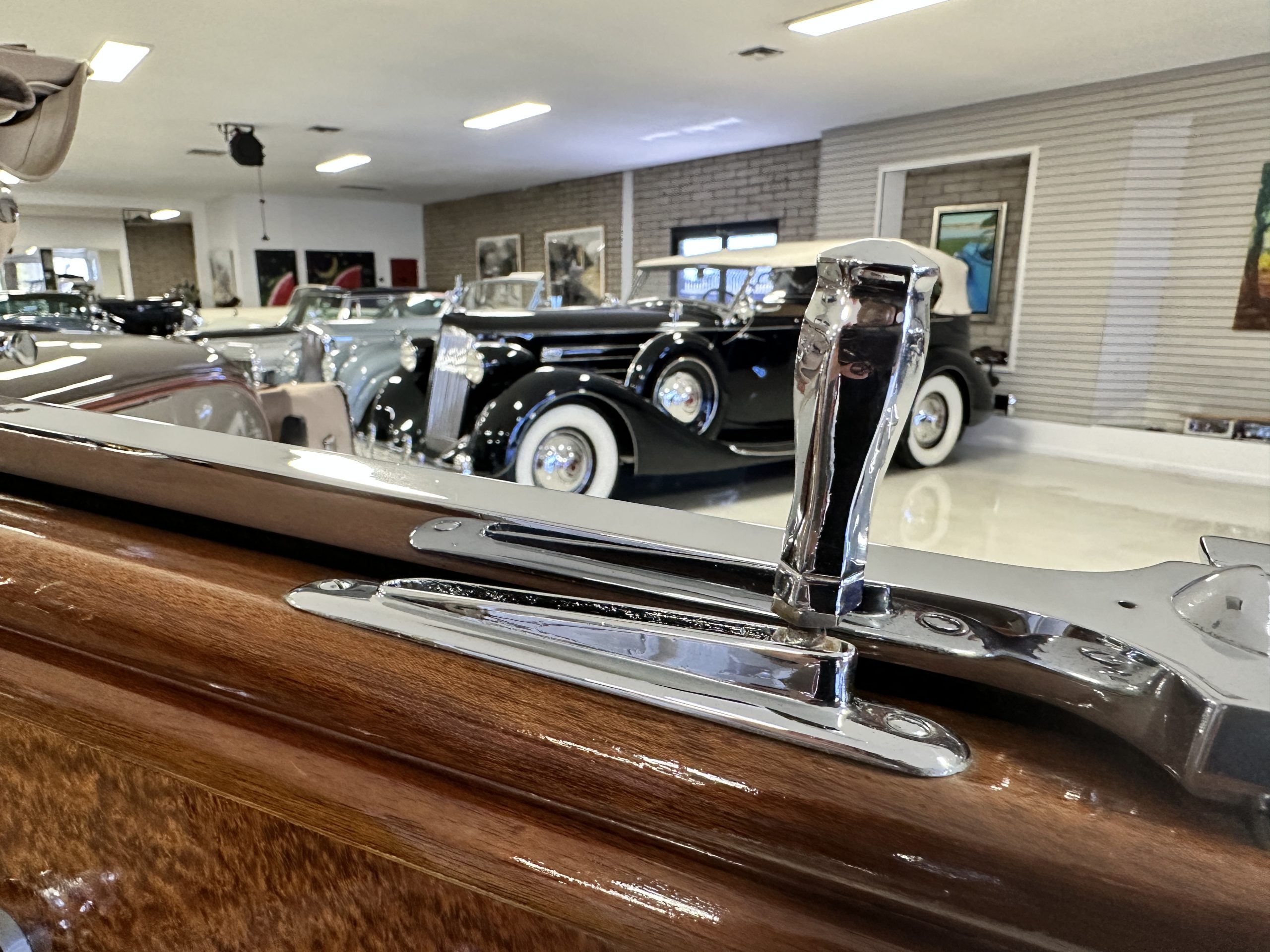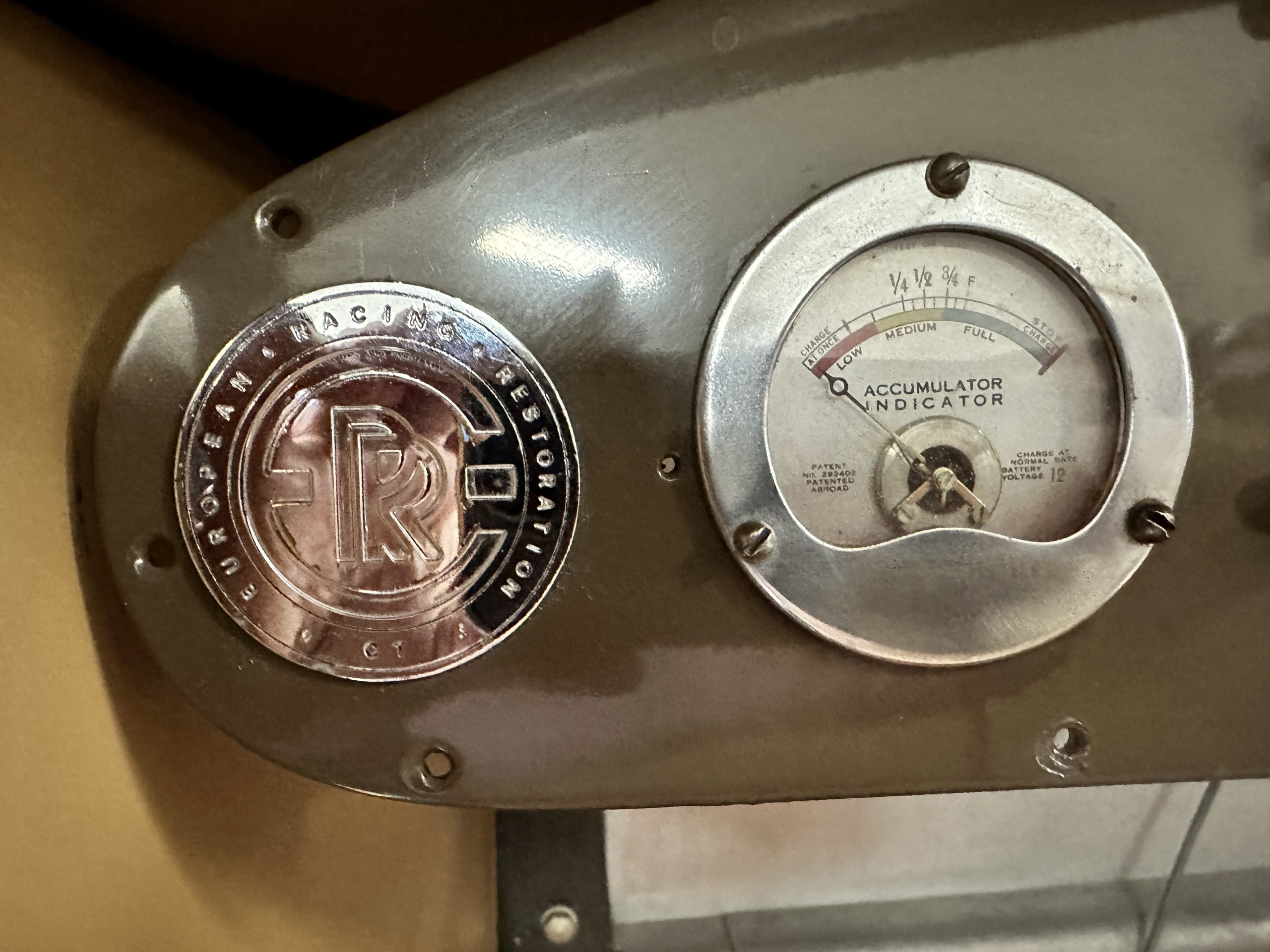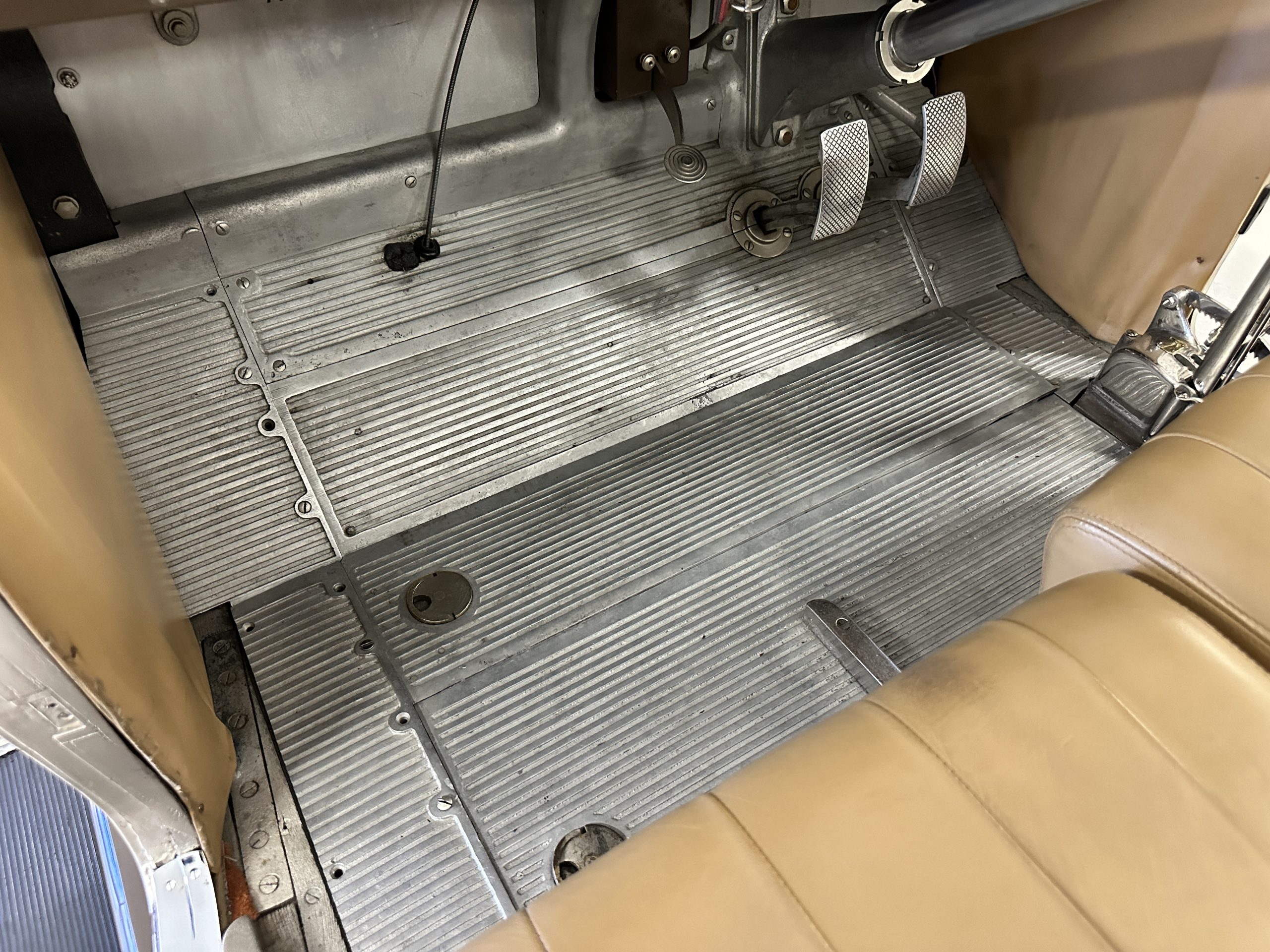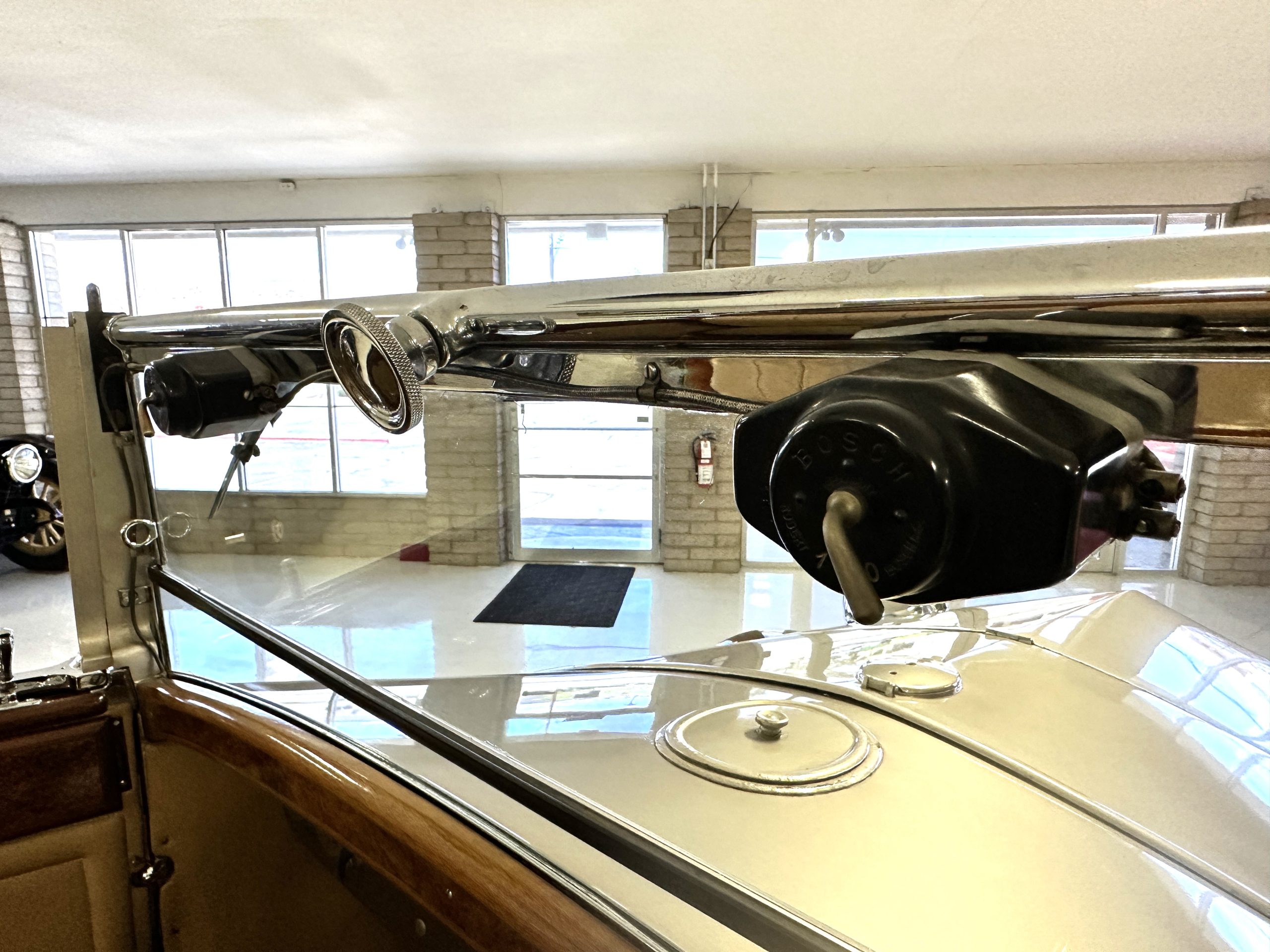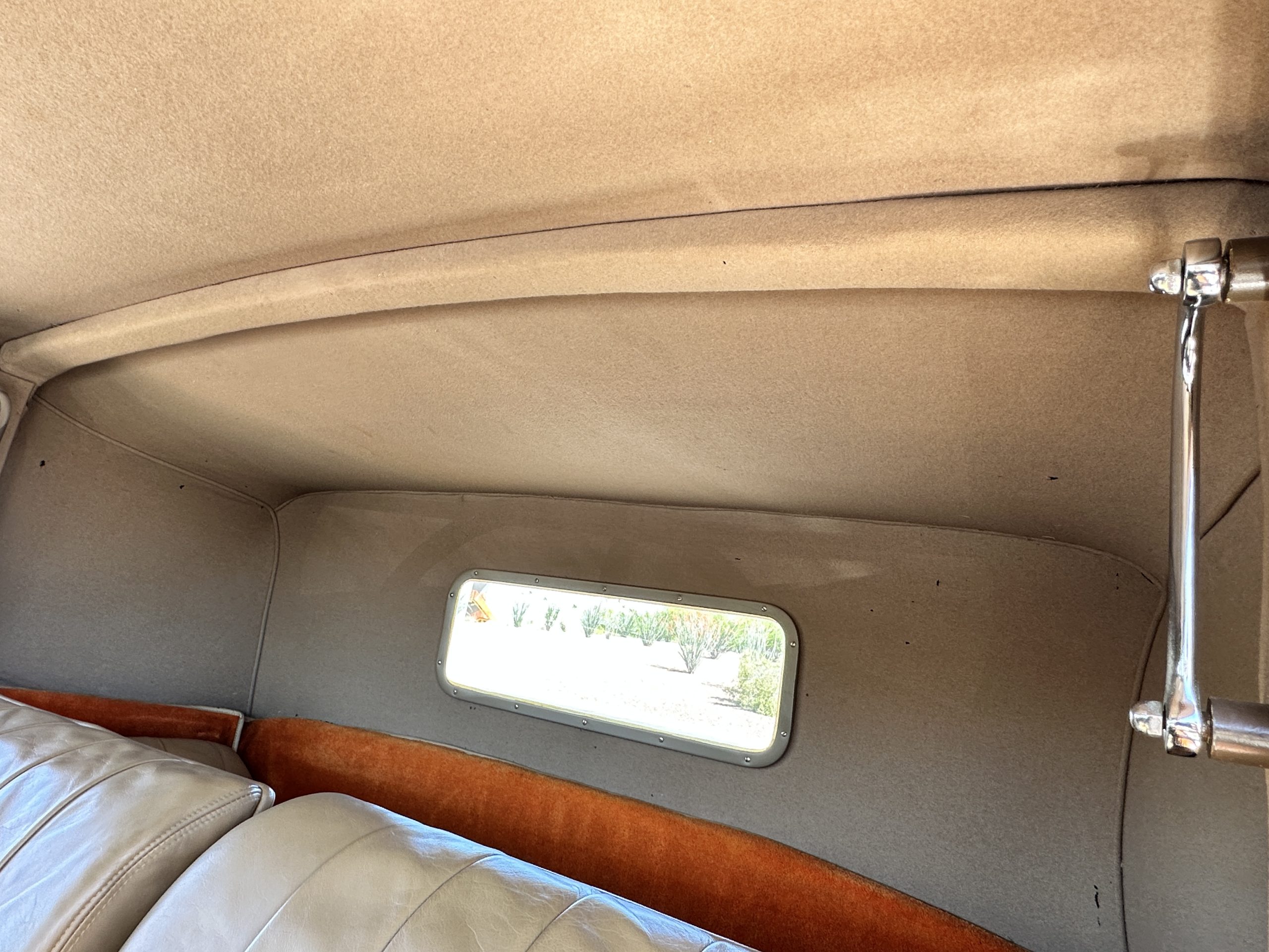 The right-hand-drive cabin houses a pair of bucket seats and a side-facing rear seat trimmed in tan leather while matching upholstery covers the door panels and rumble seat. Gorgeous burl wood surrounds the passenger cabin. Additional features include complimentary orange carpeting, wood door caps, a right-hand gated shifter, roll-up side windows, and a fire extinguisher.