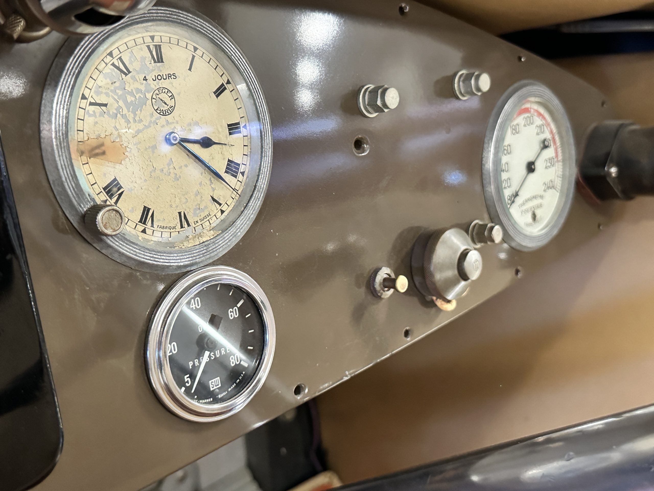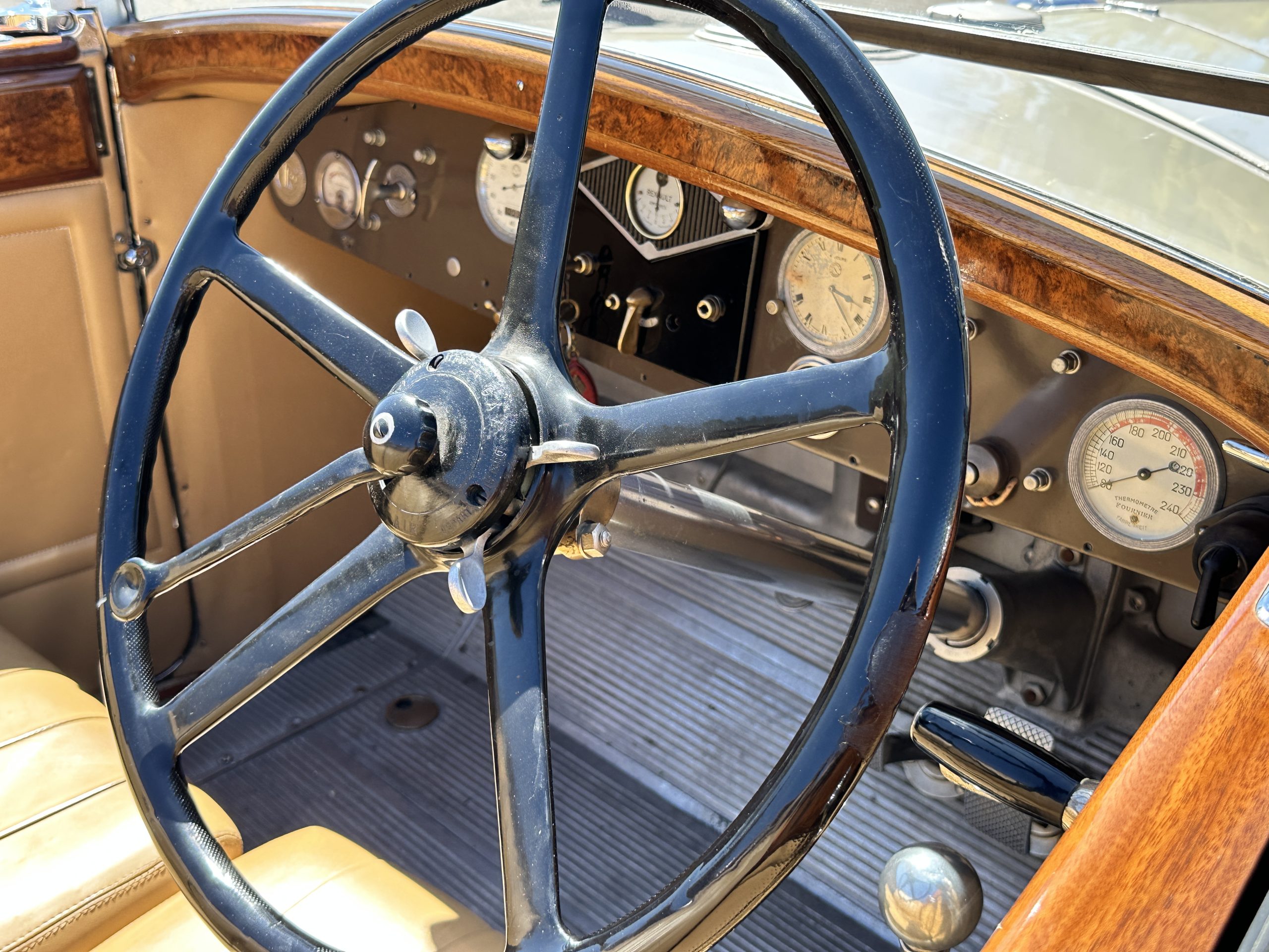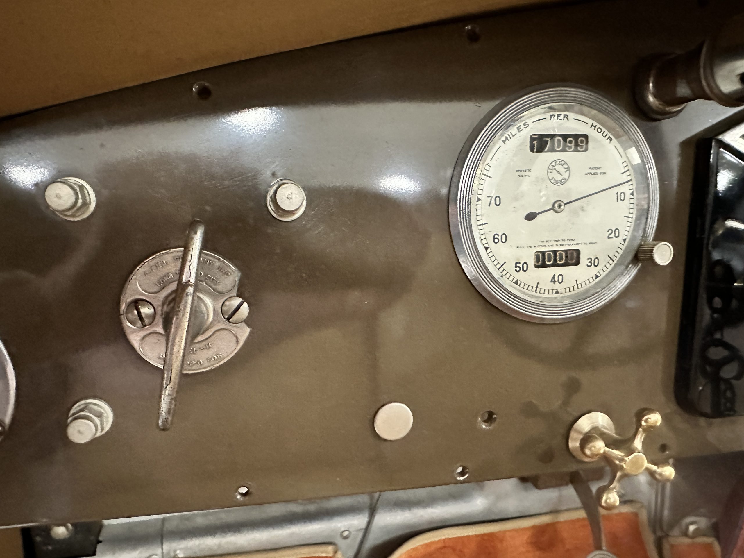 The five-spoke steering wheel sits ahead of a burl wood-topped dash panel housing a Jaeger 75-mph speedometer and clock as well as gauges monitoring coolant temperature, oil pressure, amperage, and voltage. The five-digit odometer shows 17k miles. The speedometer, clock, voltmeter, and temperature gauge do not work.